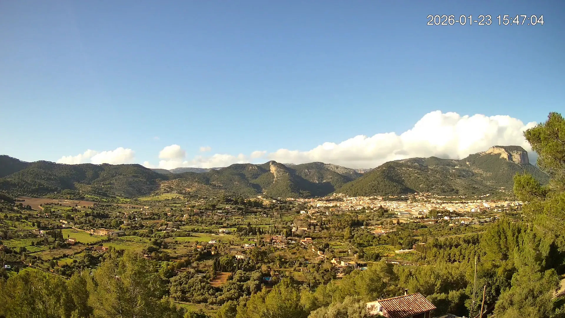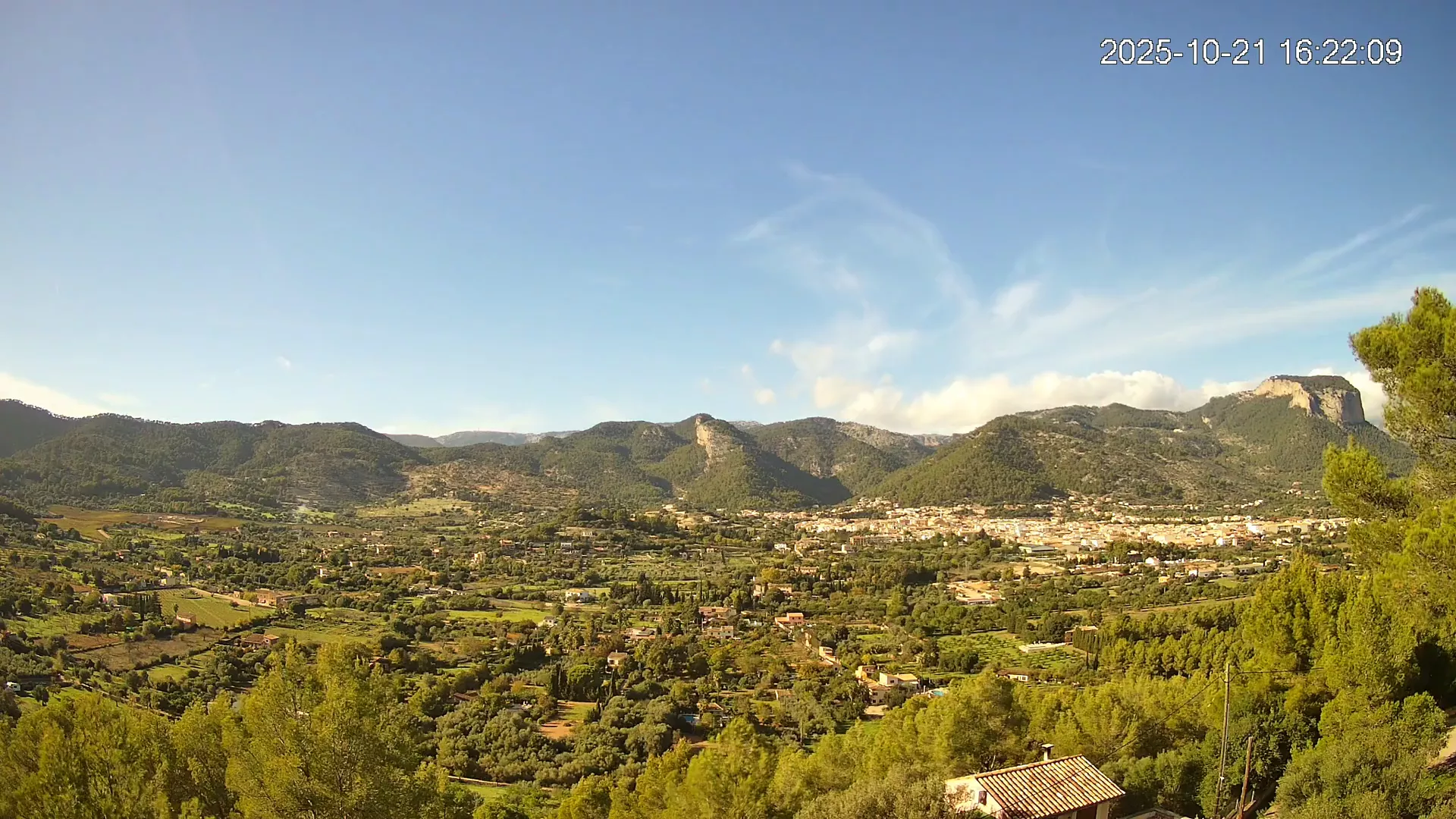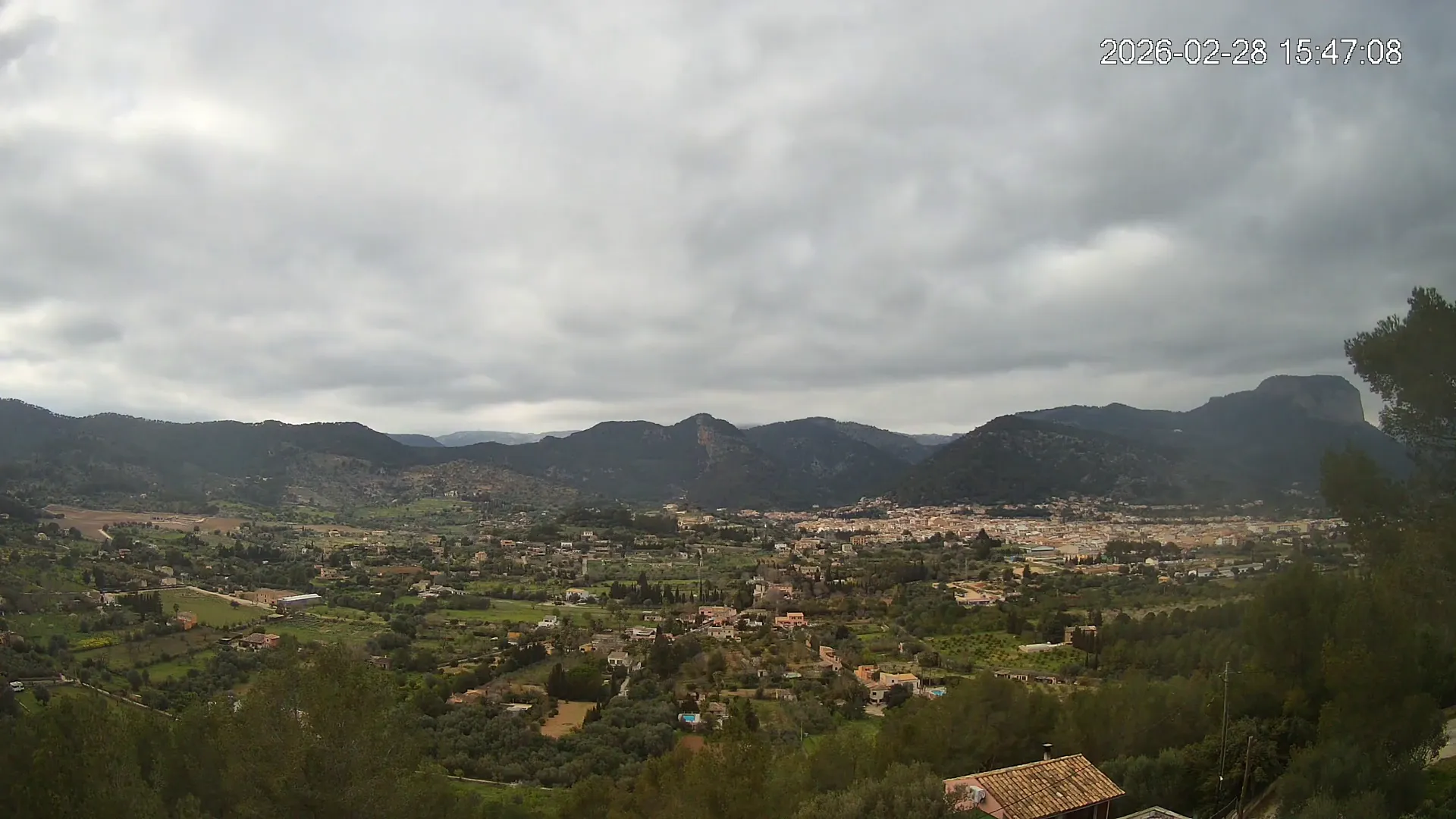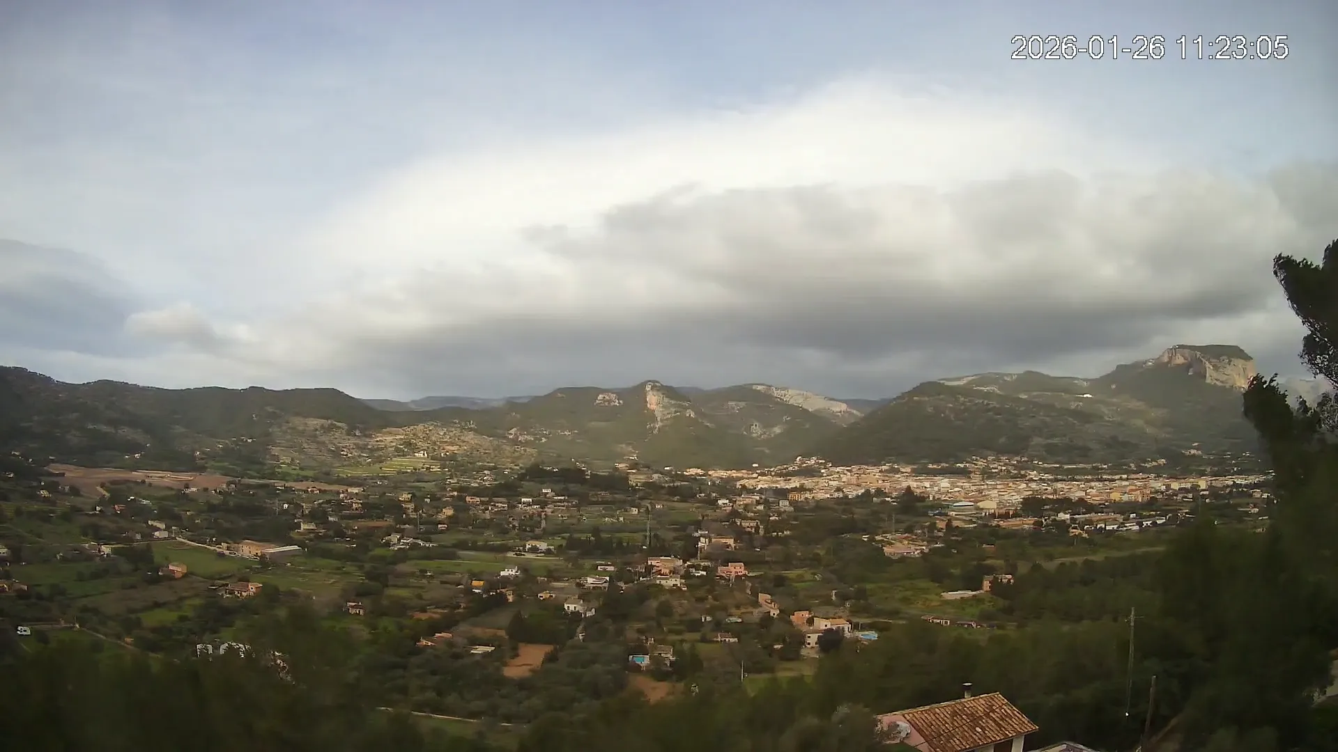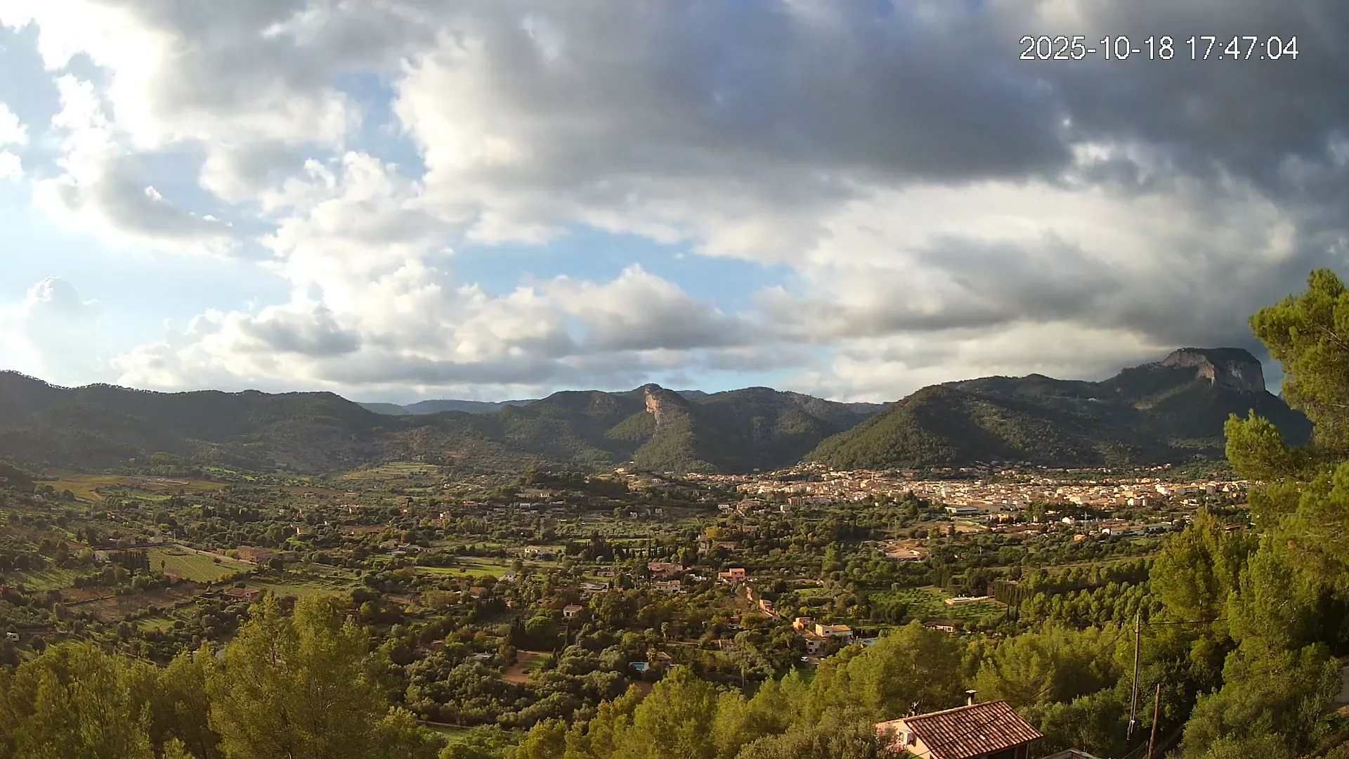 Esta cámara ofrece una hermosa vista del pueblo de Alaró, enclavado en la Serra de Tramuntana. A la derecha se distingue el imponente Castell d’Alaró, en lo alto de la montaña, dominando el paisaje y aportando un toque histórico a esta panorámica del interior de Mallorca.