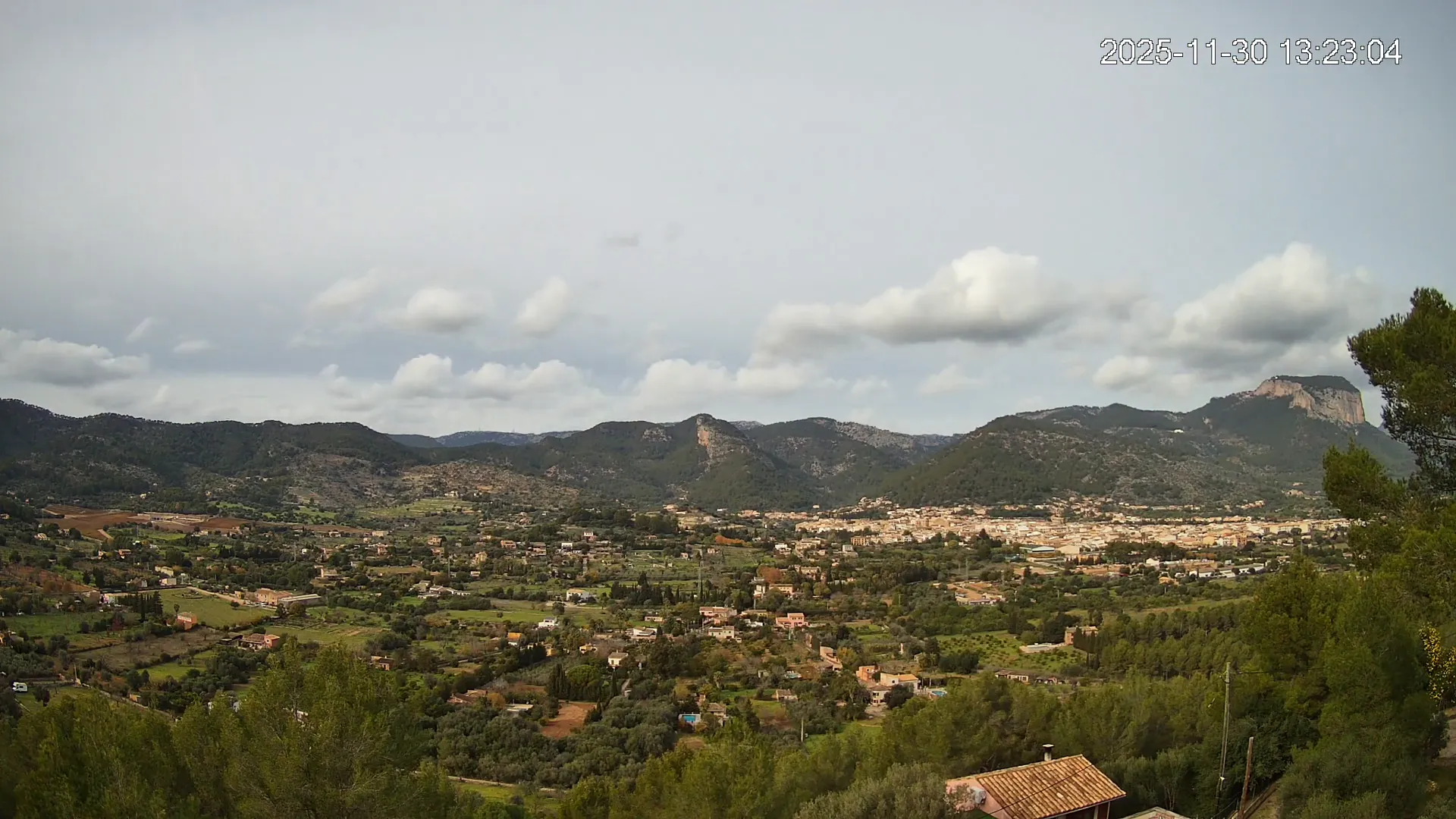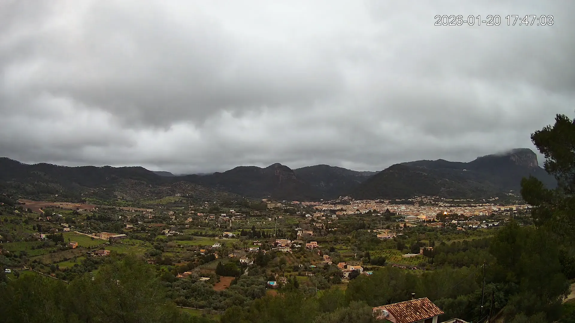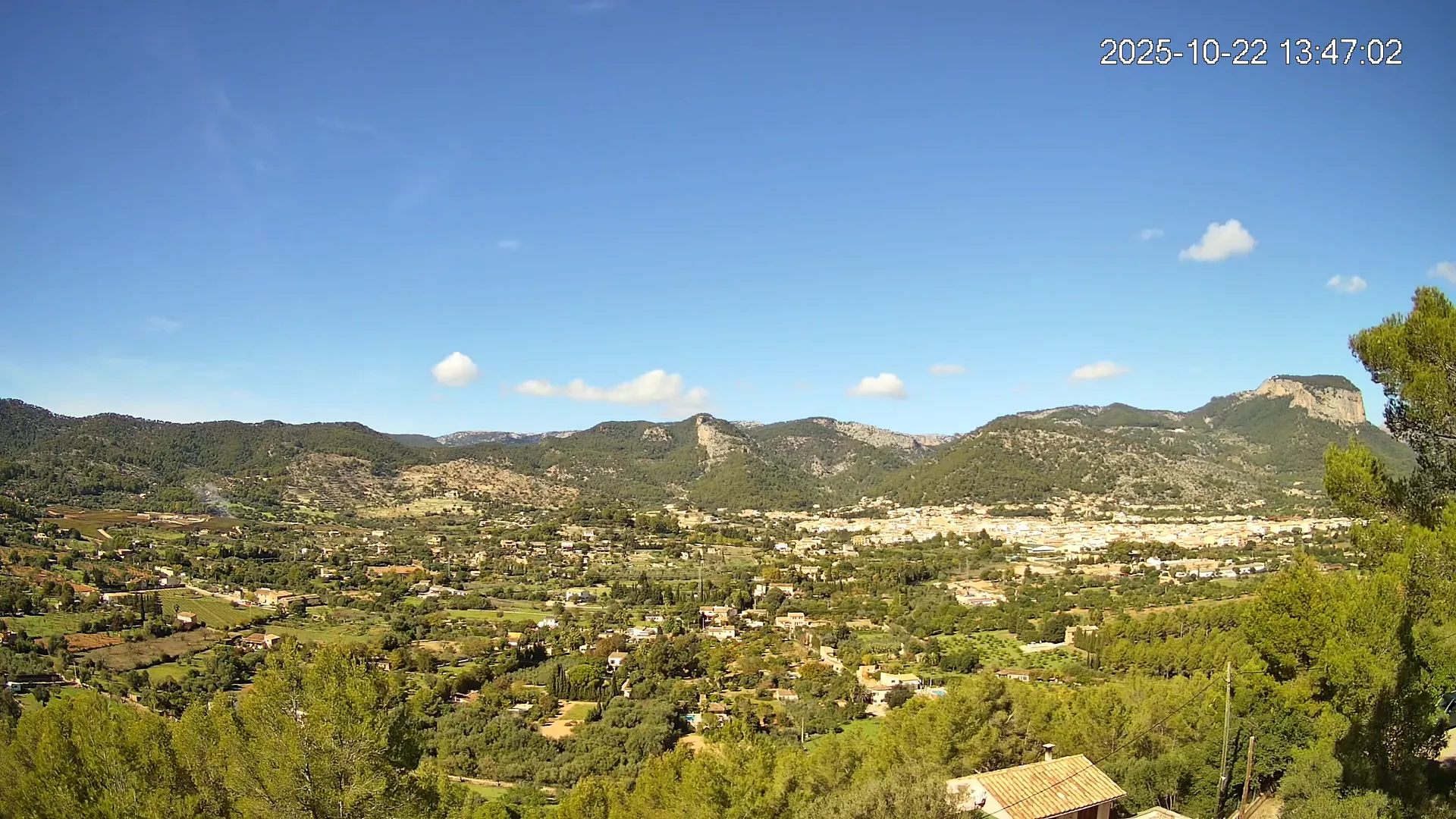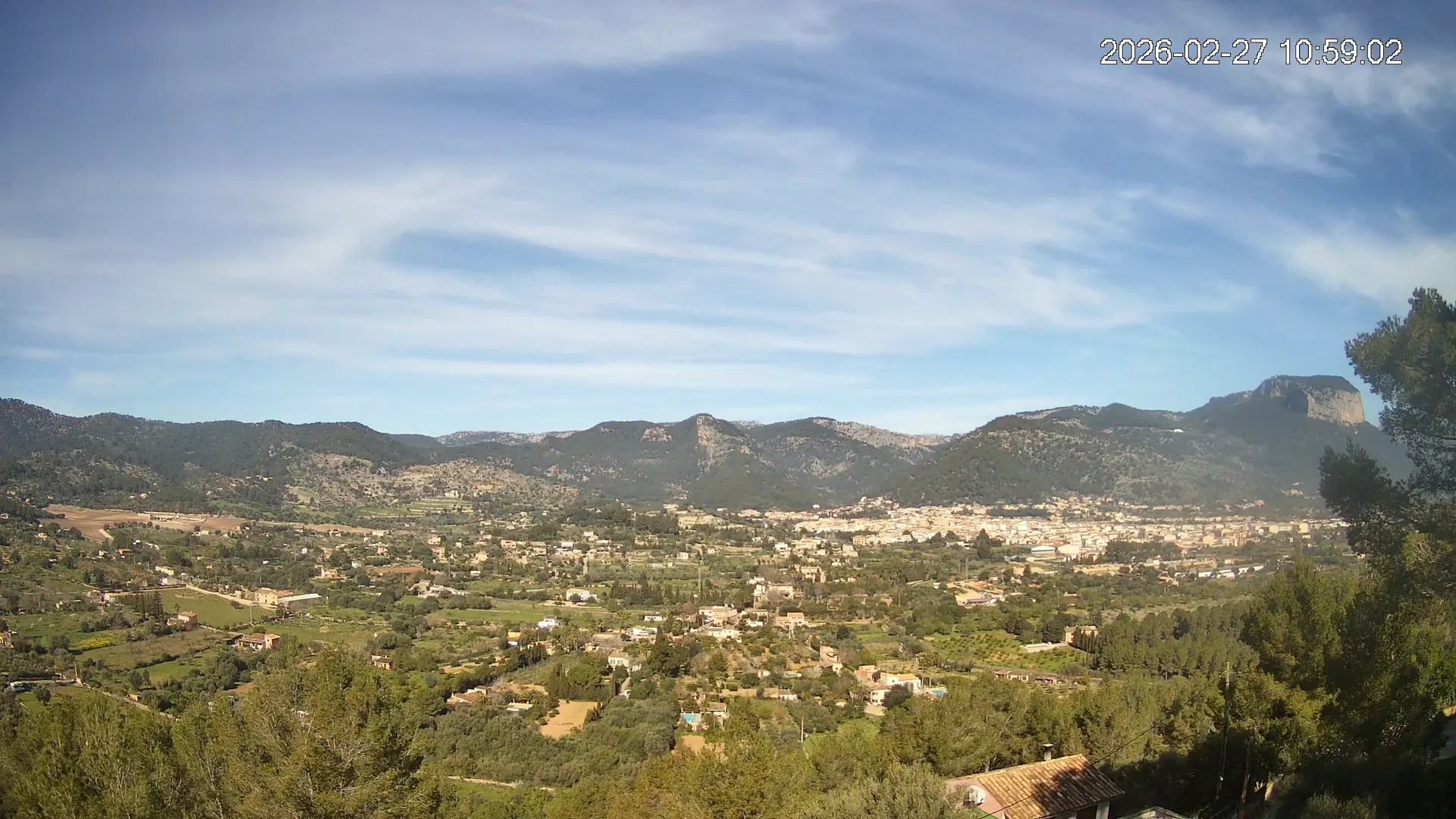 Esta cámara ofrece una hermosa vista del pueblo de Alaró, enclavado en la Serra de Tramuntana. A la derecha se distingue el imponente Castell d’Alaró, en lo alto de la montaña, dominando el paisaje y aportando un toque histórico a esta panorámica del interior de Mallorca.