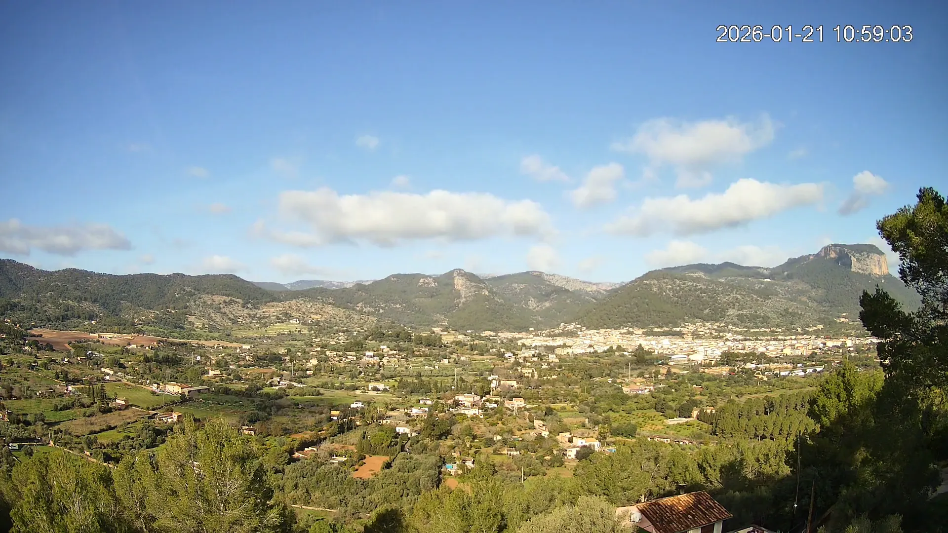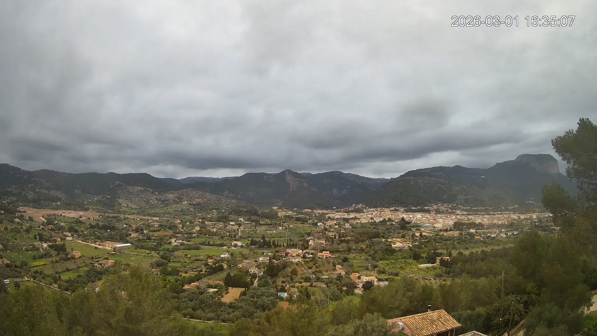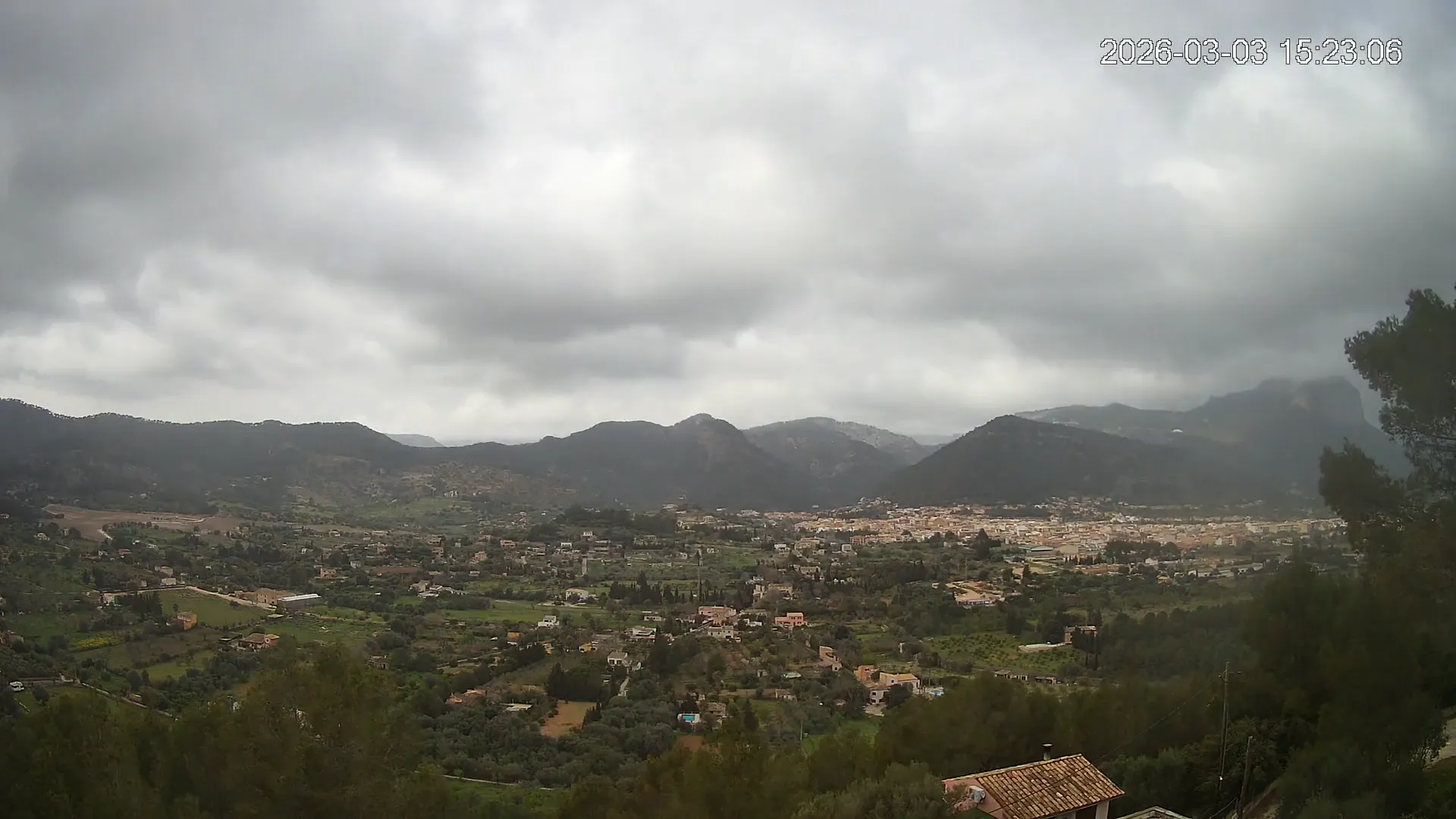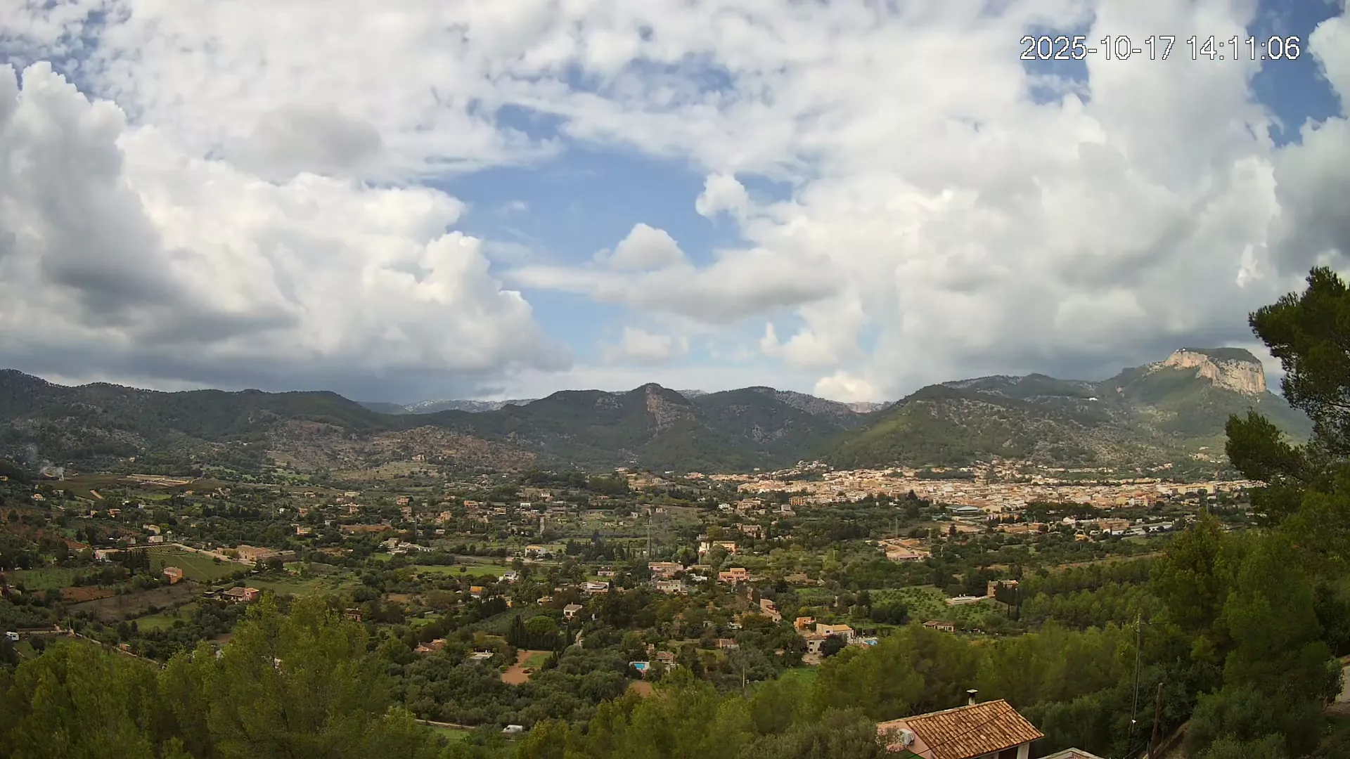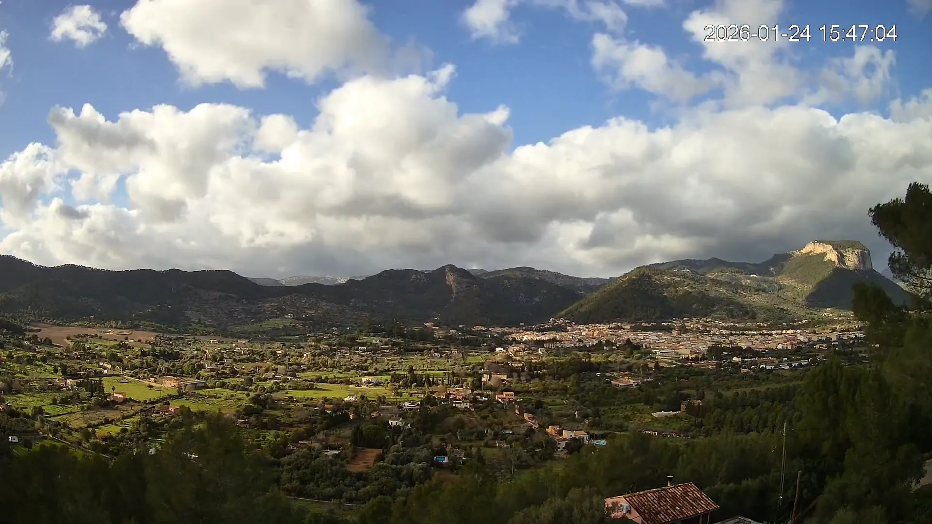 Esta cámara ofrece una hermosa vista del pueblo de Alaró, enclavado en la Serra de Tramuntana. A la derecha se distingue el imponente Castell d’Alaró, en lo alto de la montaña, dominando el paisaje y aportando un toque histórico a esta panorámica del interior de Mallorca.