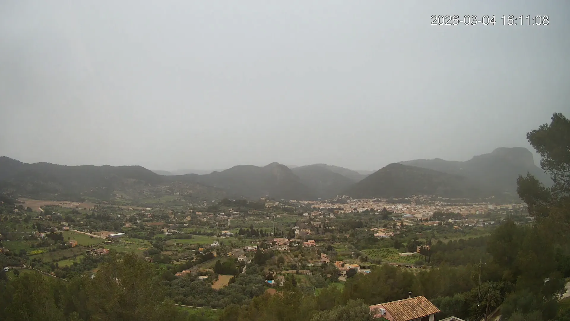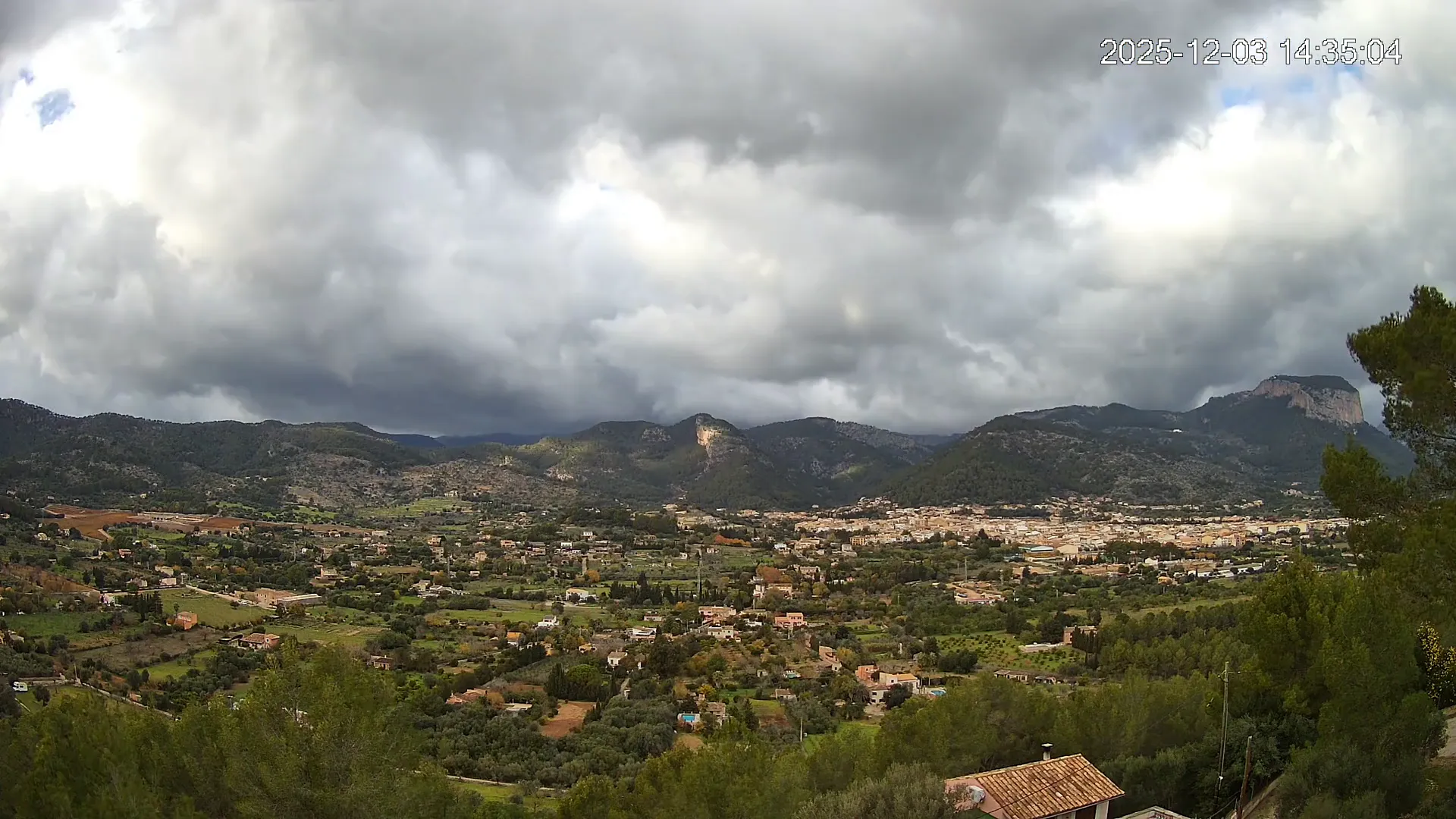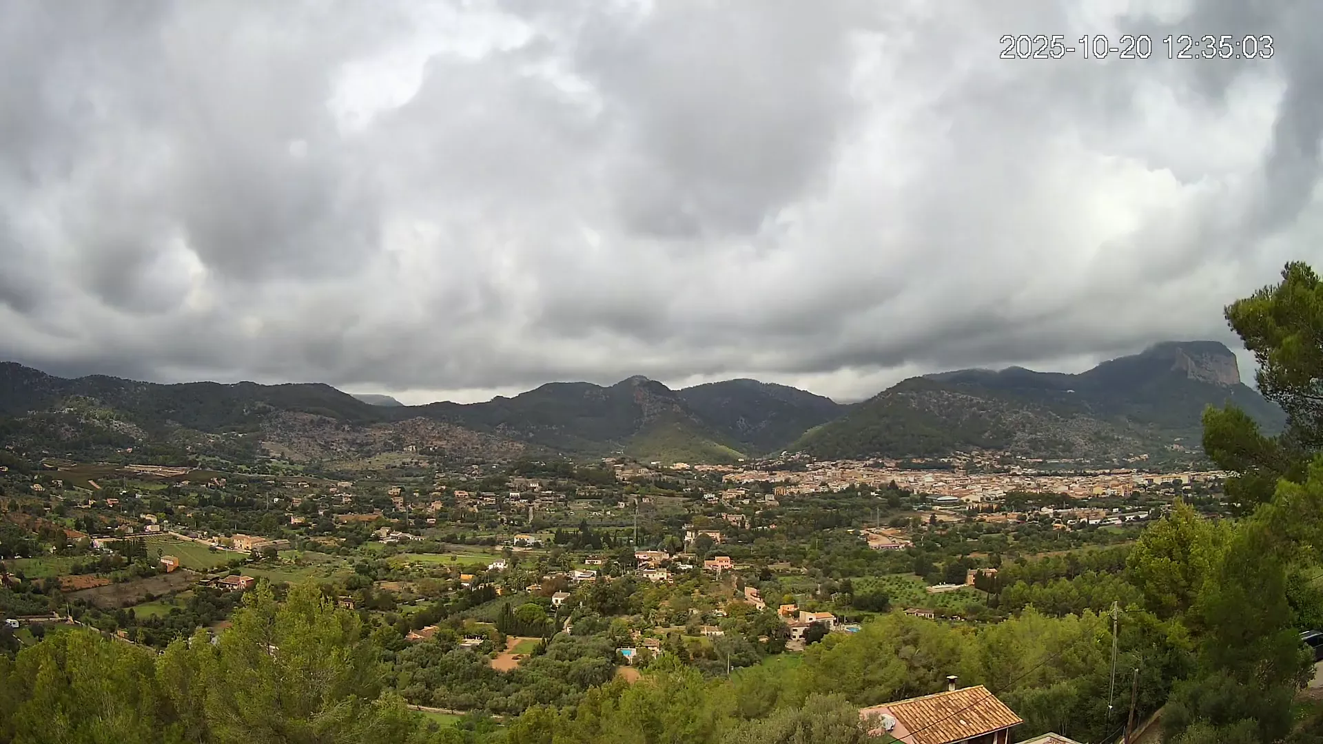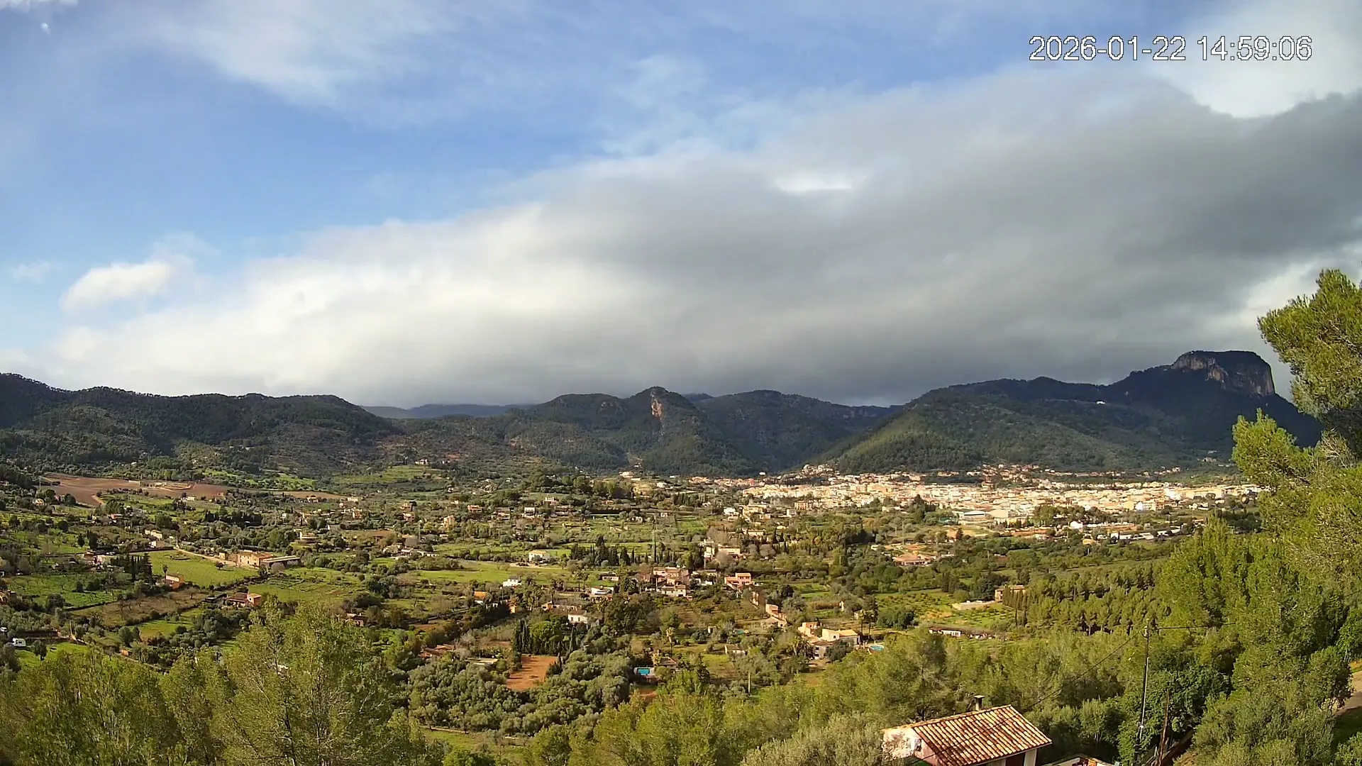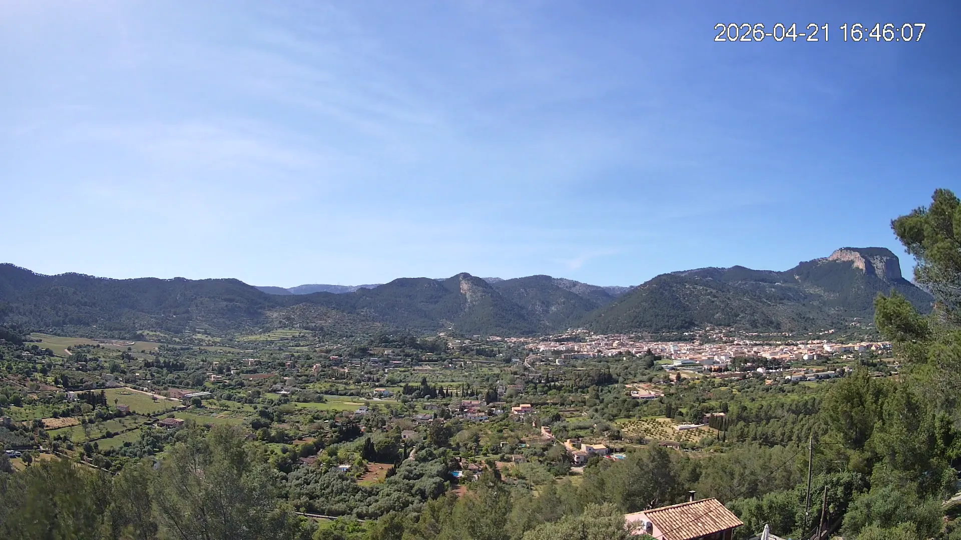 Esta cámara ofrece una hermosa vista del pueblo de Alaró, enclavado en la Serra de Tramuntana. A la derecha se distingue el imponente Castell d’Alaró, en lo alto de la montaña, dominando el paisaje y aportando un toque histórico a esta panorámica del interior de Mallorca.