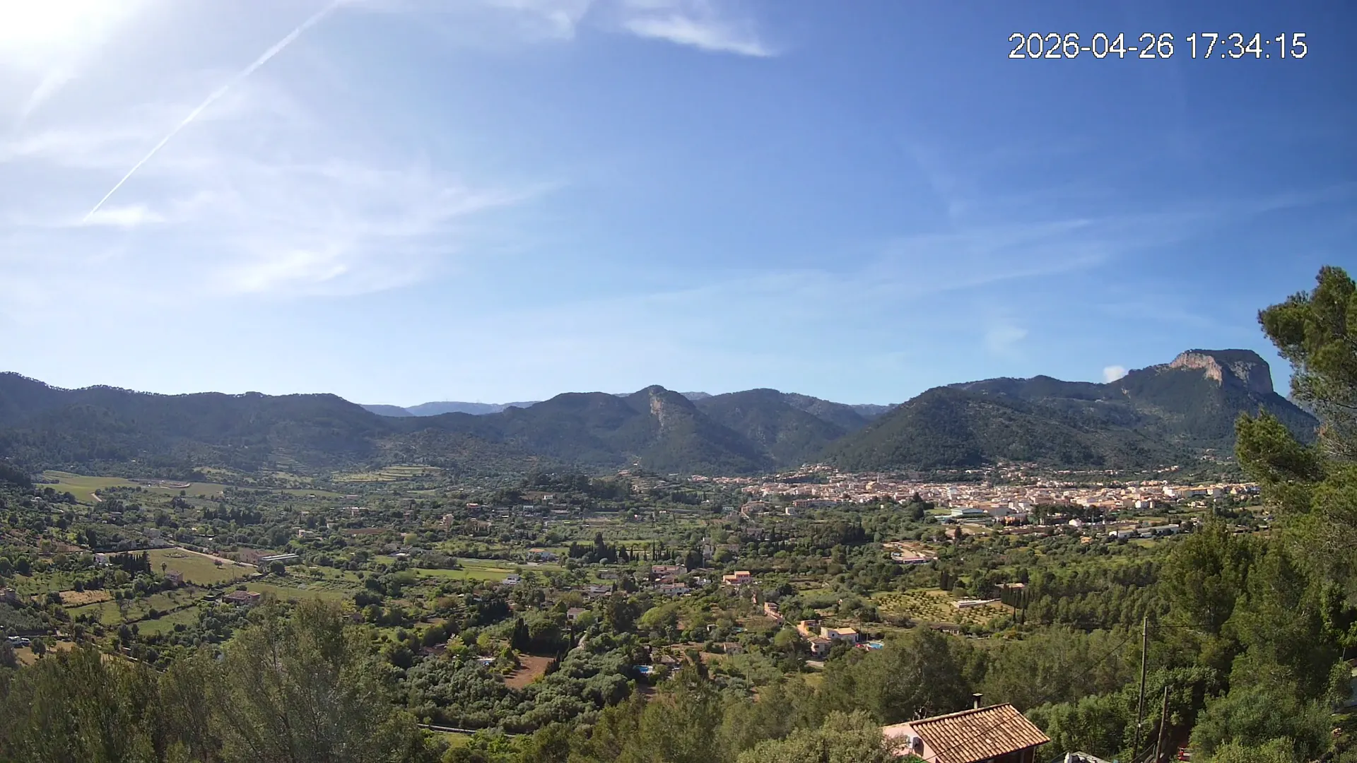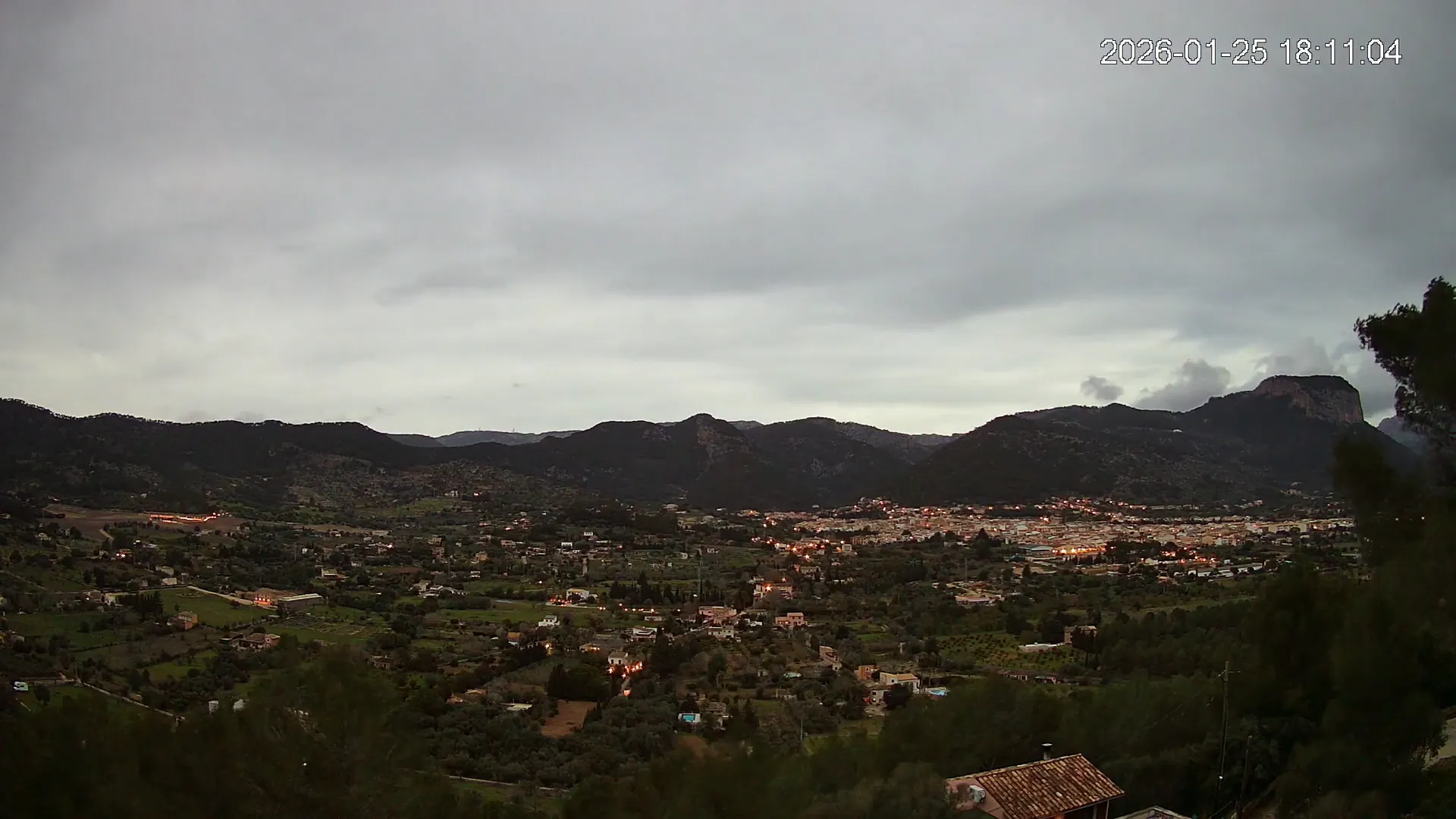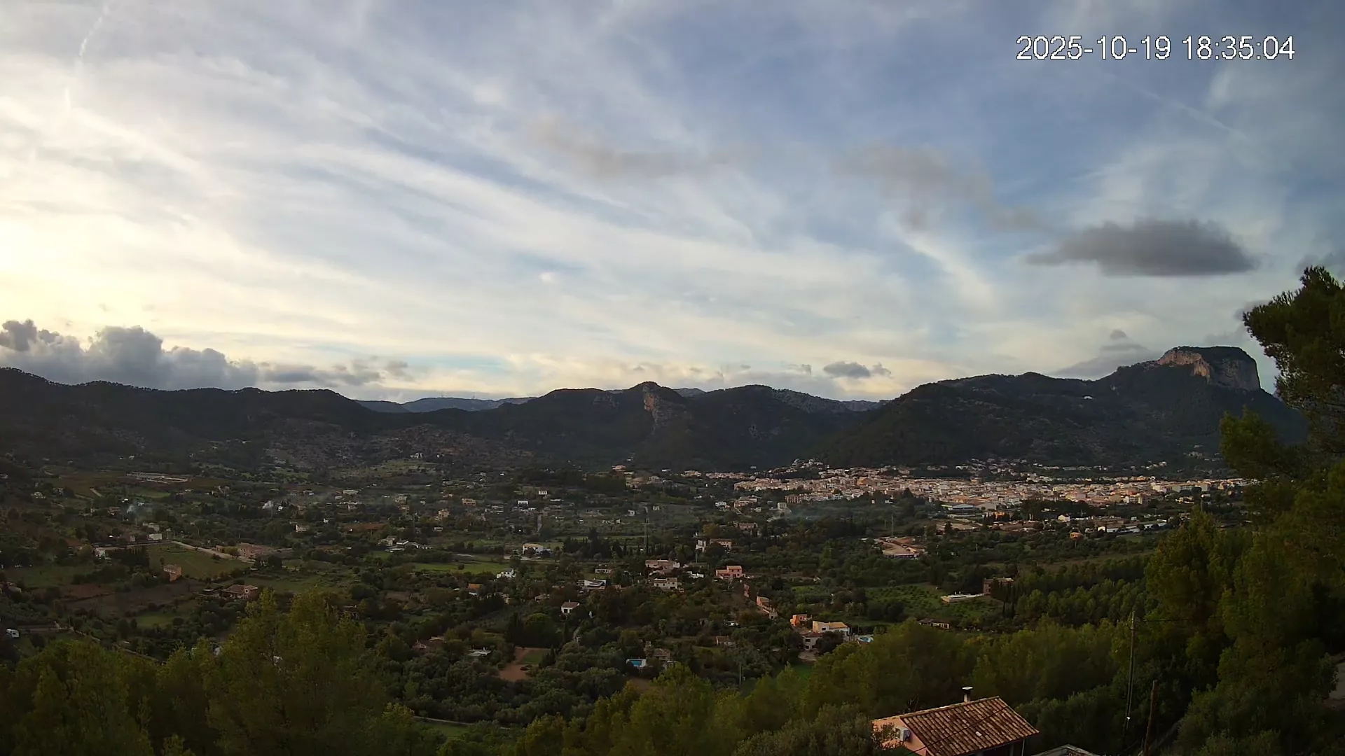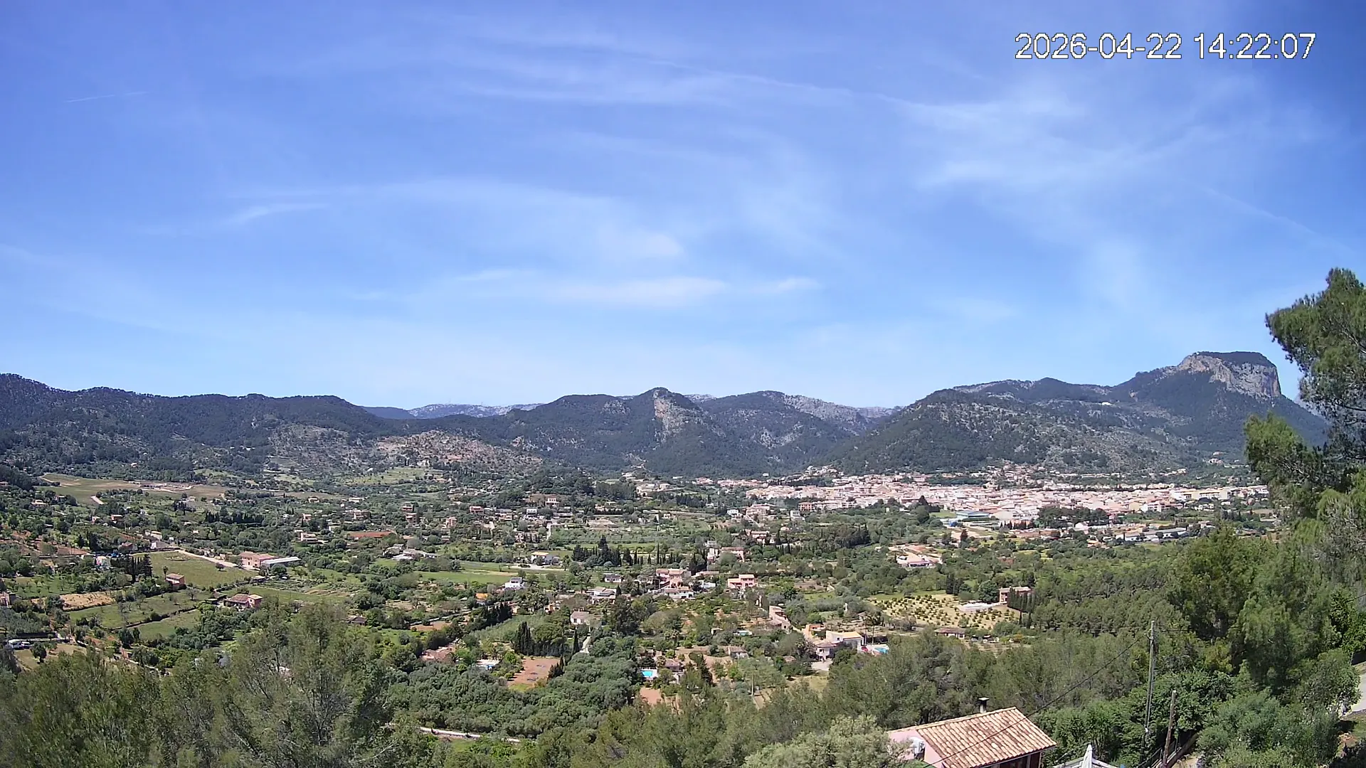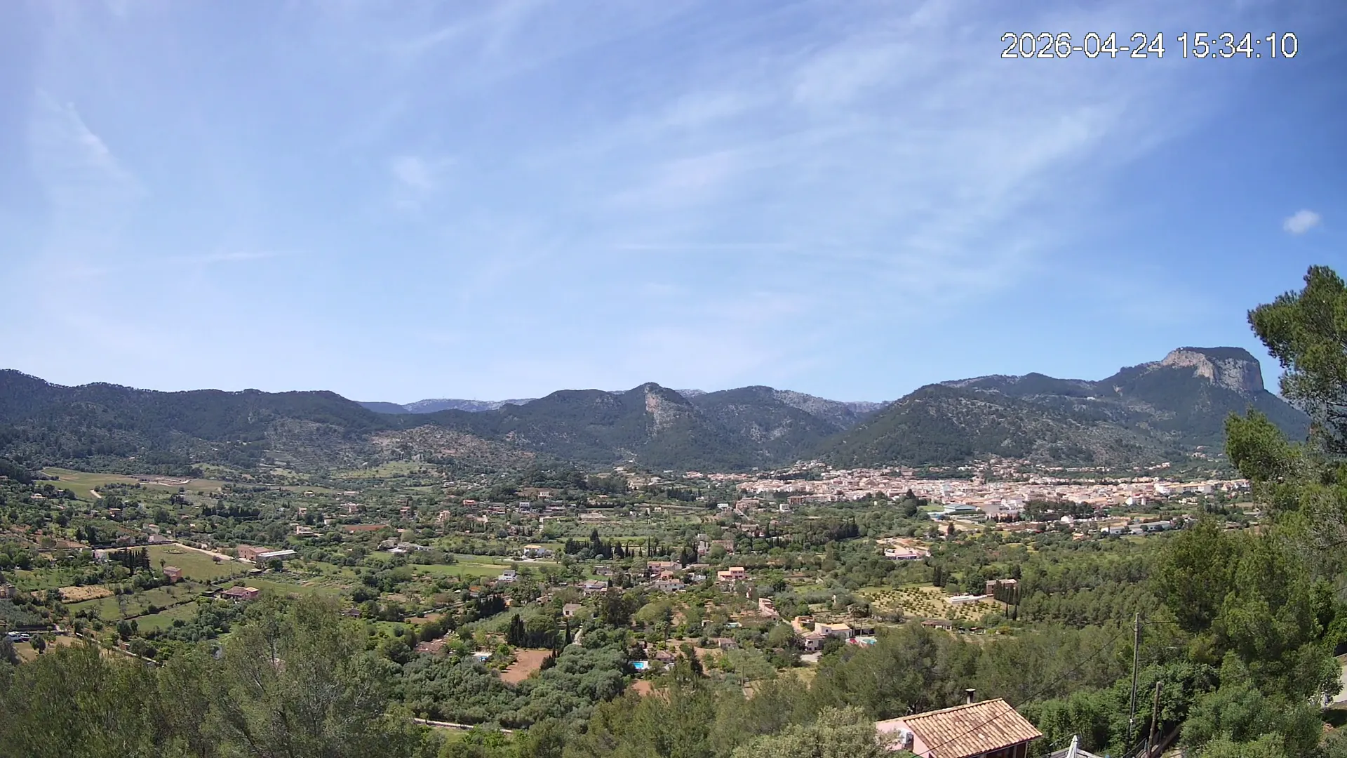 Esta cámara ofrece una hermosa vista del pueblo de Alaró, enclavado en la Serra de Tramuntana. A la derecha se distingue el imponente Castell d’Alaró, en lo alto de la montaña, dominando el paisaje y aportando un toque histórico a esta panorámica del interior de Mallorca.