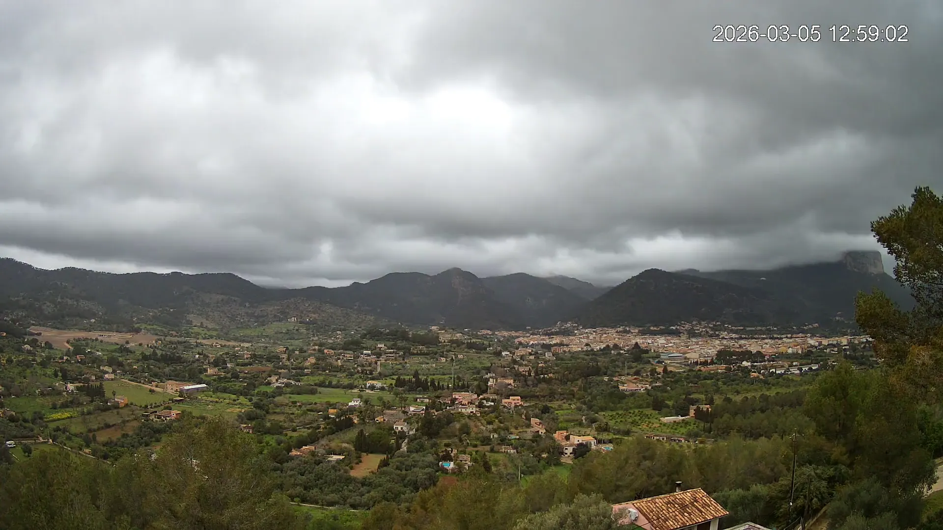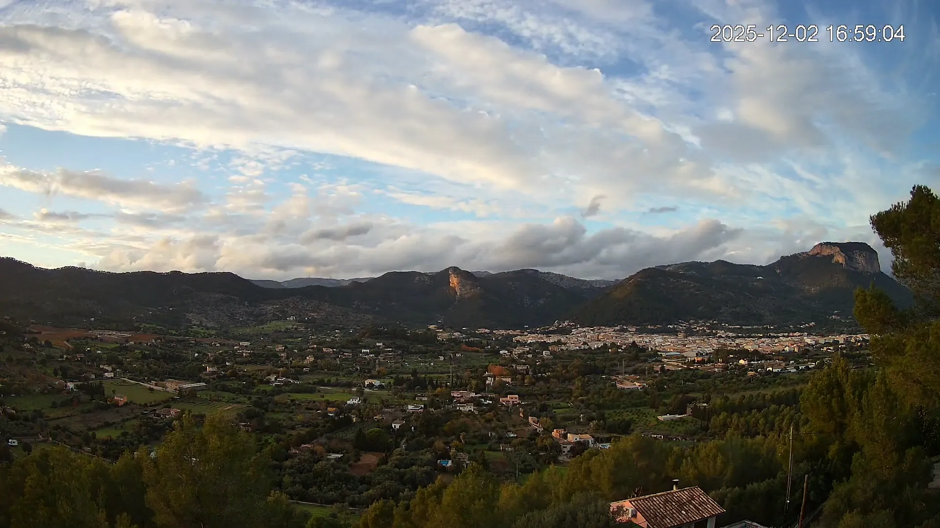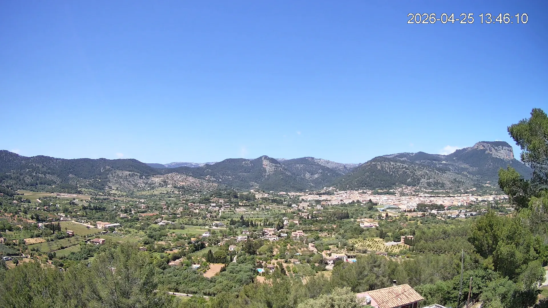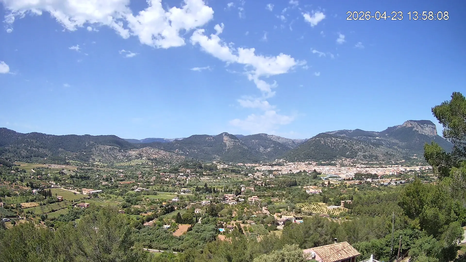 Esta cámara ofrece una hermosa vista del pueblo de Alaró, enclavado en la Serra de Tramuntana. A la derecha se distingue el imponente Castell d’Alaró, en lo alto de la montaña, dominando el paisaje y aportando un toque histórico a esta panorámica del interior de Mallorca.