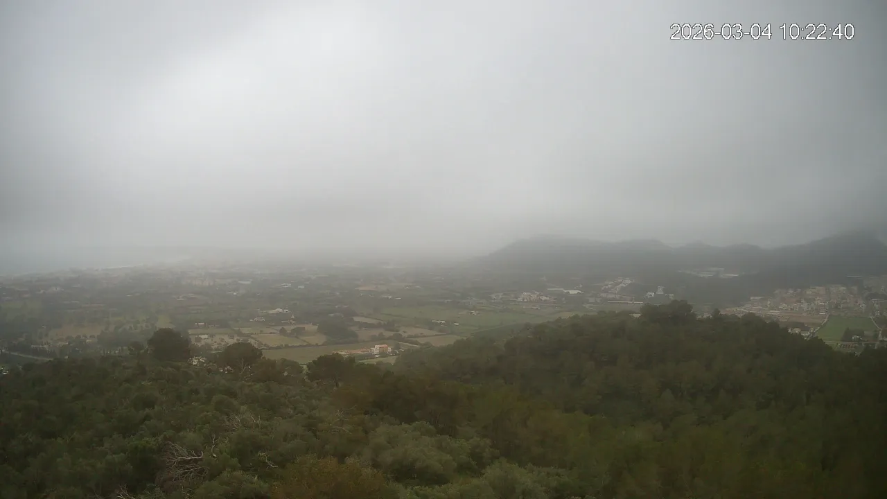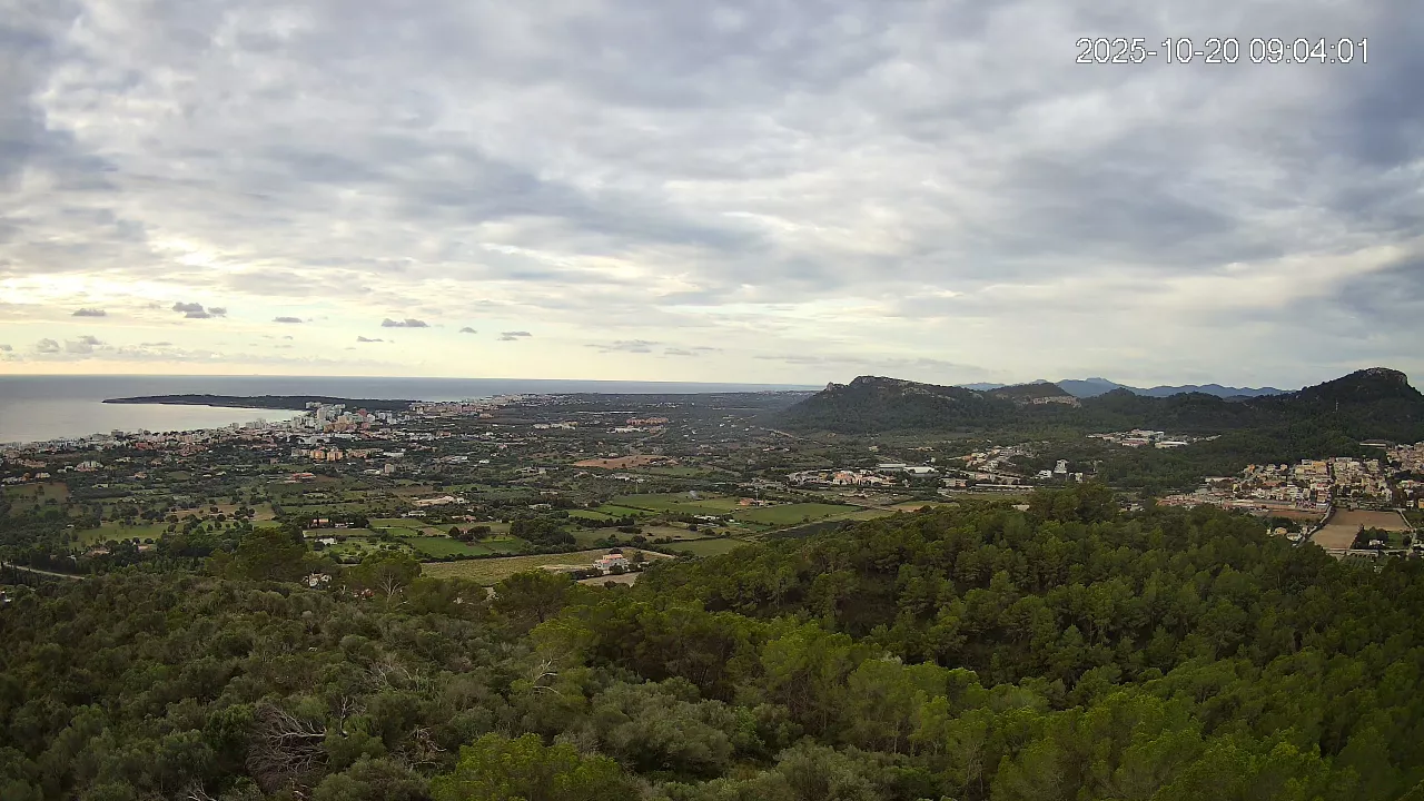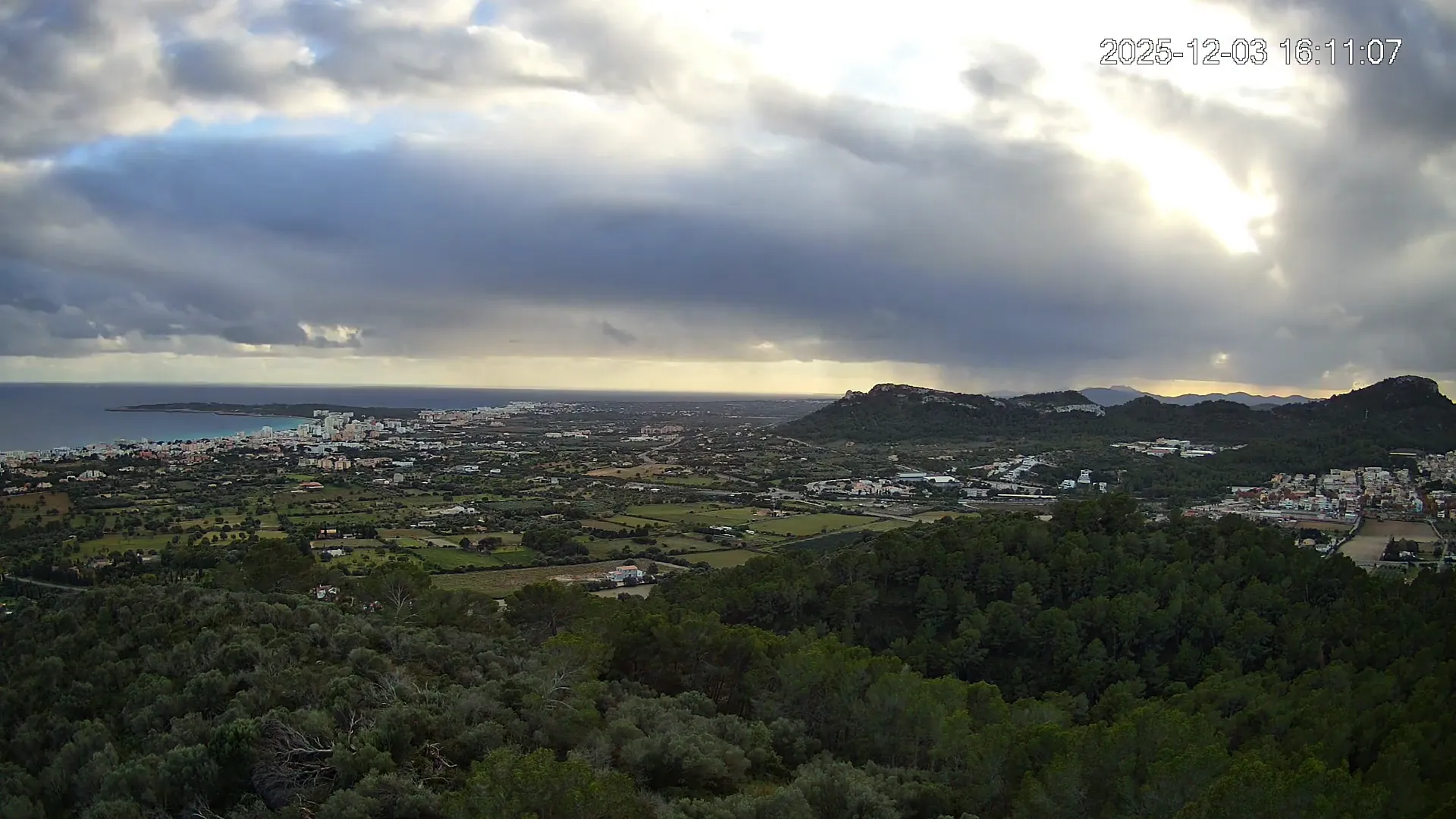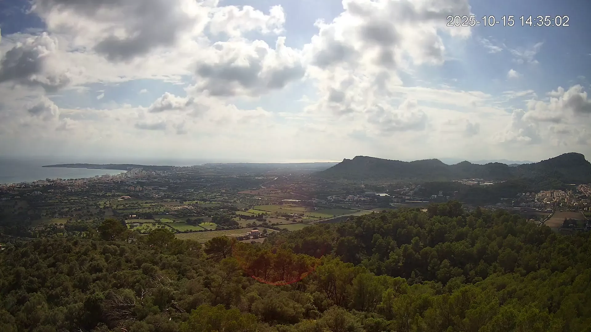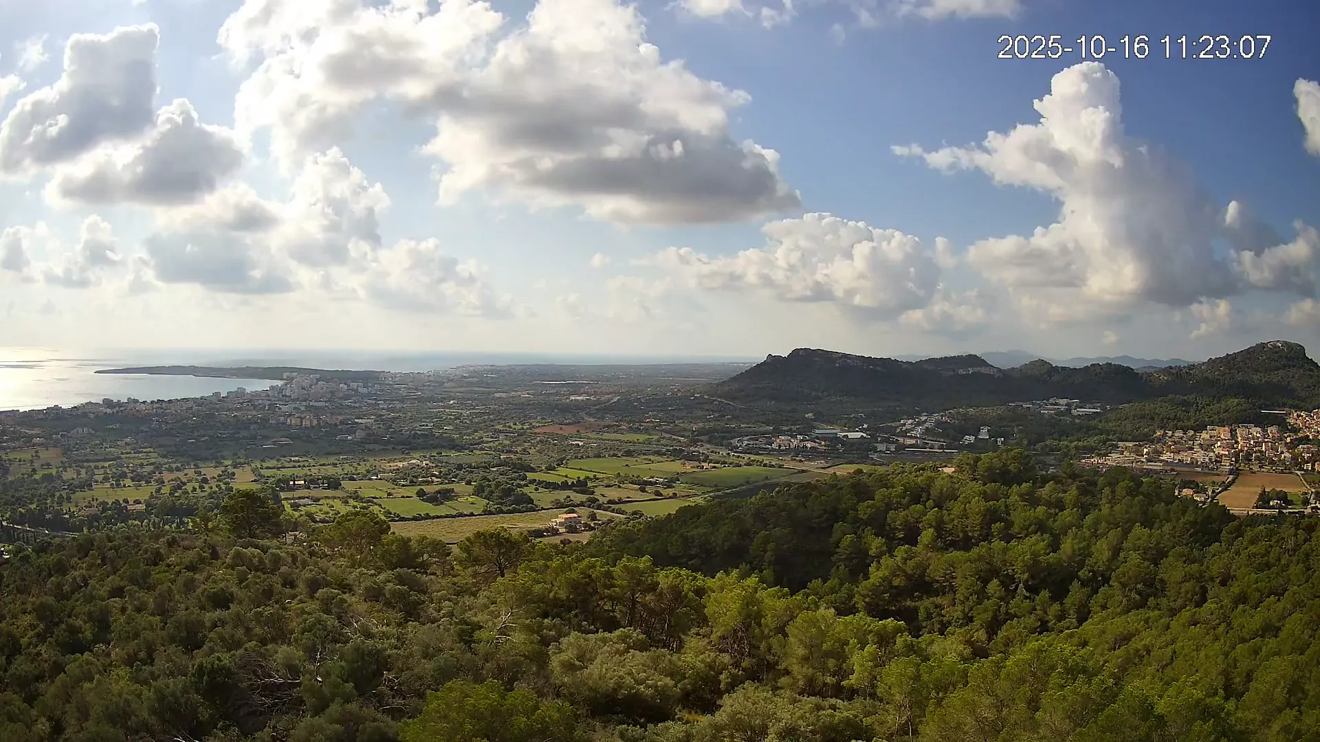 Desde lo alto del Puig de Son Corb, esta cámara se orienta hacia la bahía de Cala Millor, ofreciendo una panorámica espectacular de la costa del Llevant mallorquín. En primer plano, la silueta del Puig de na Penyal destaca con fuerza, mientras al fondo se abre el azul del mar y la línea urbana de Cala Millor. Una imagen que combina mar, montaña y vida mediterránea.