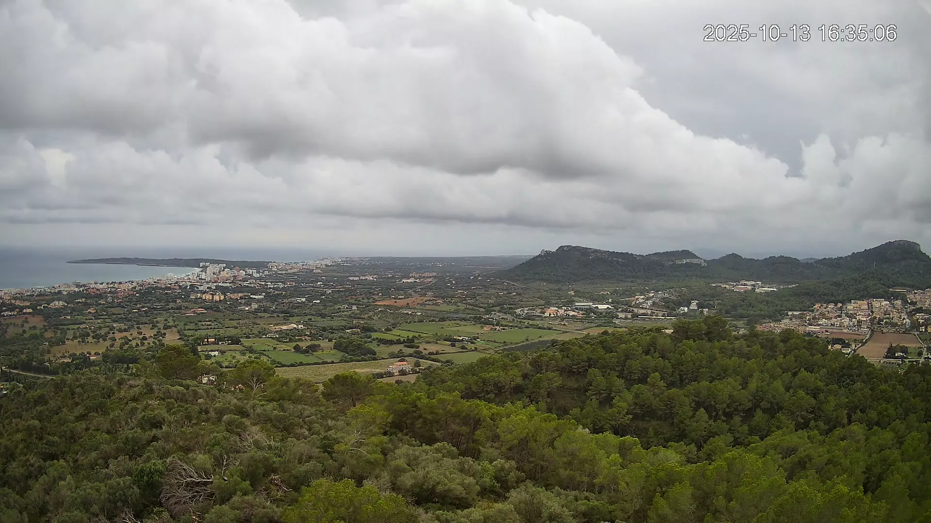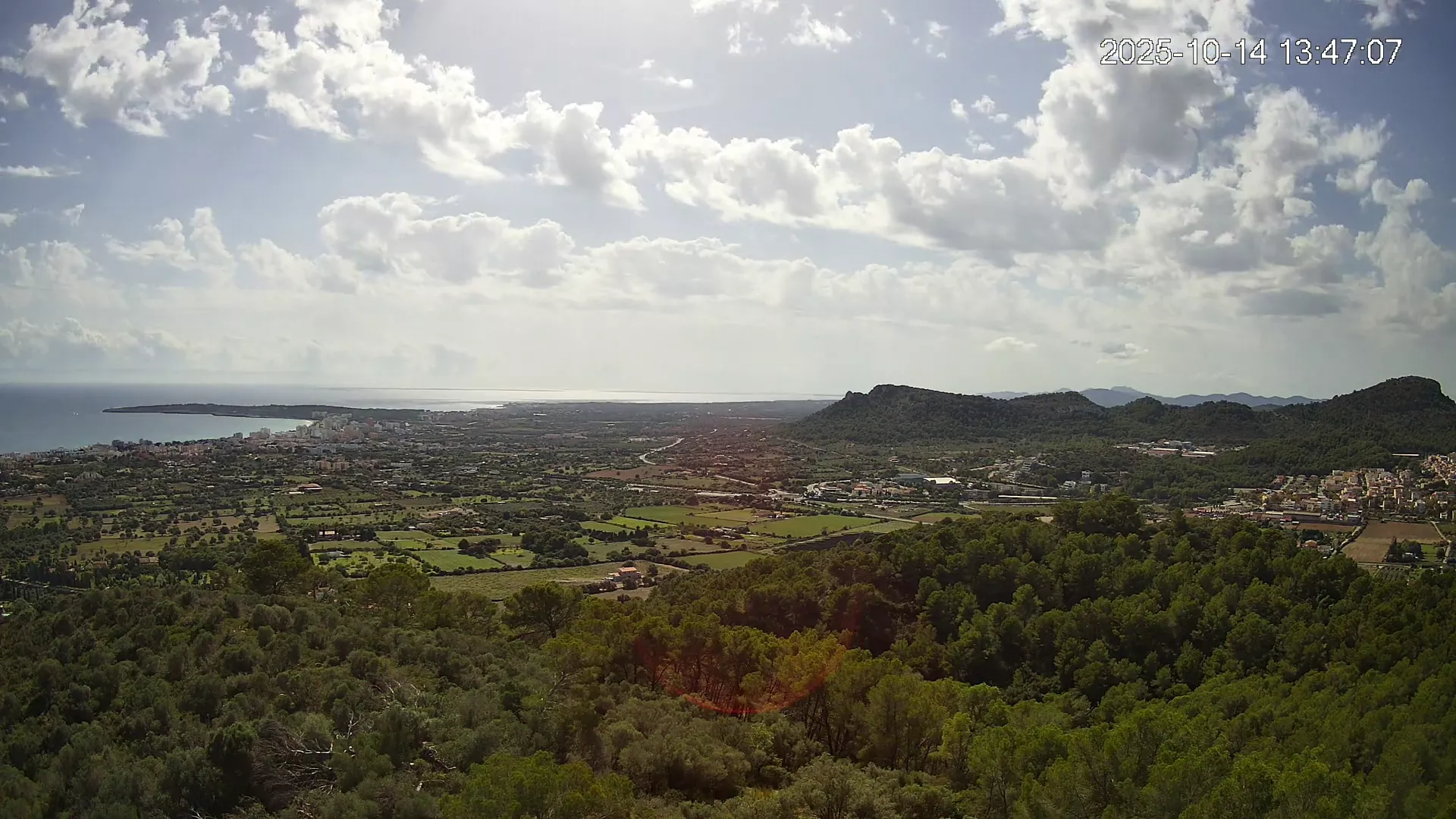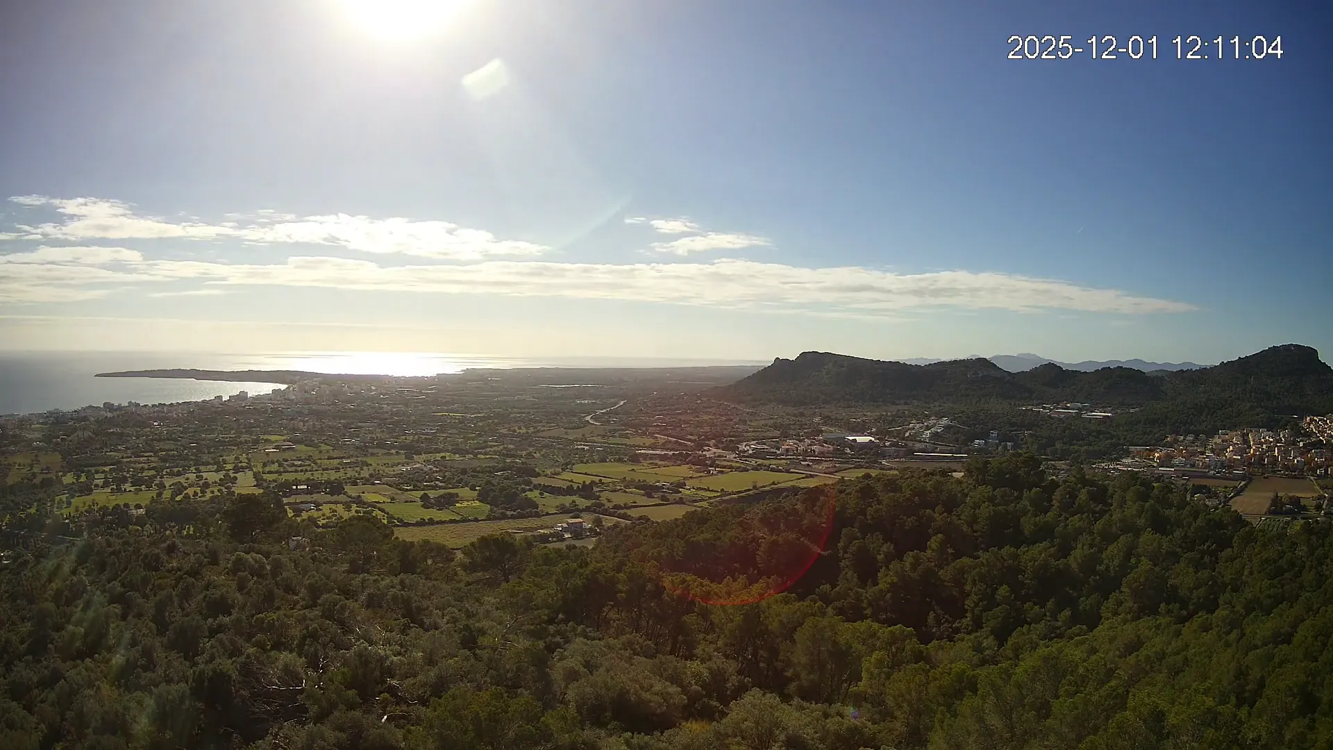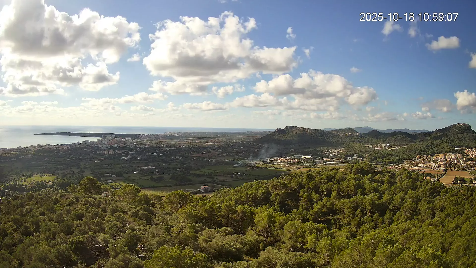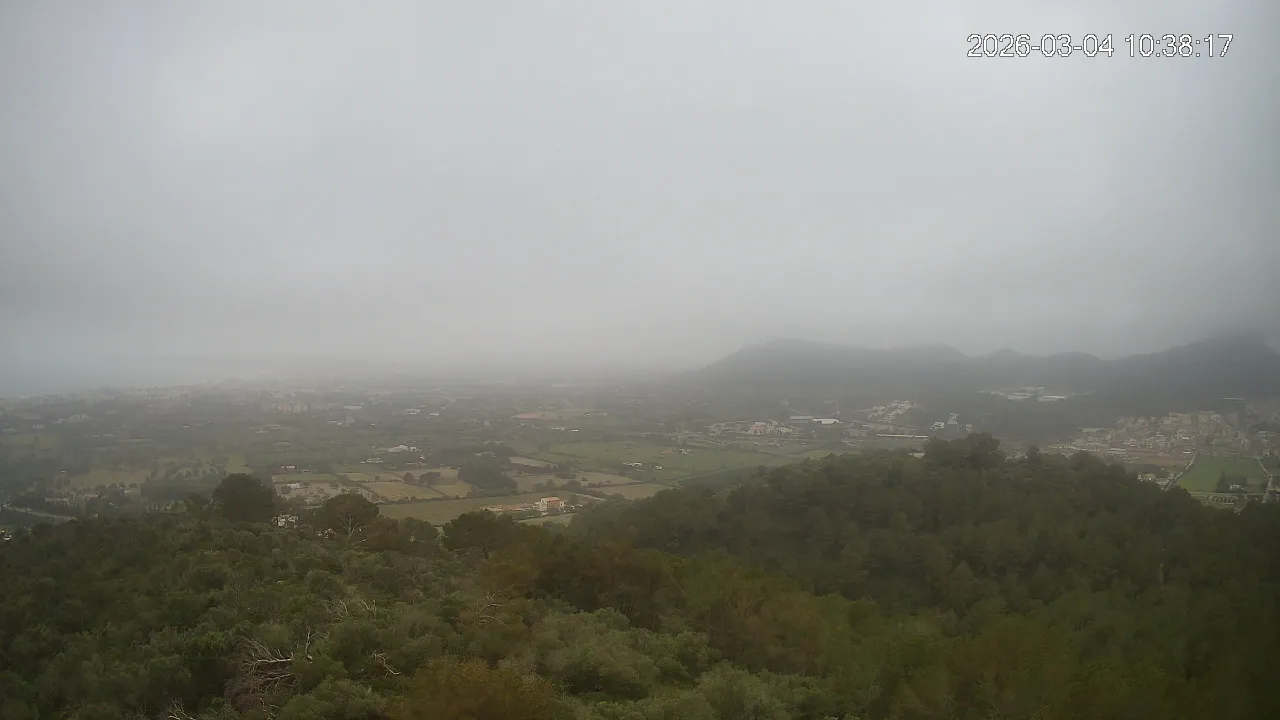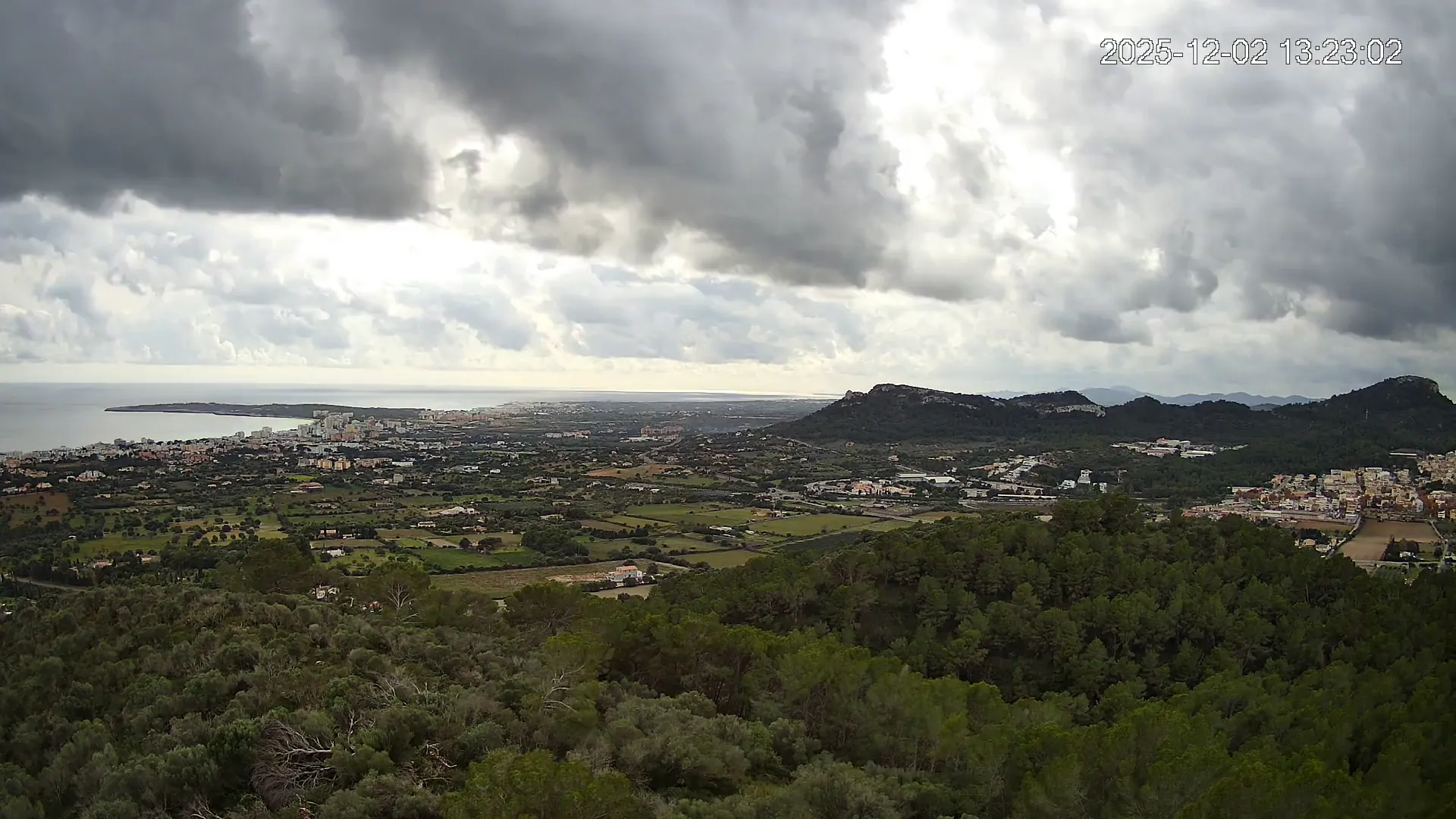 Desde lo alto del Puig de Son Corb, esta cámara se orienta hacia la bahía de Cala Millor, ofreciendo una panorámica espectacular de la costa del Llevant mallorquín. En primer plano, la silueta del Puig de na Penyal destaca con fuerza, mientras al fondo se abre el azul del mar y la línea urbana de Cala Millor. Una imagen que combina mar, montaña y vida mediterránea.