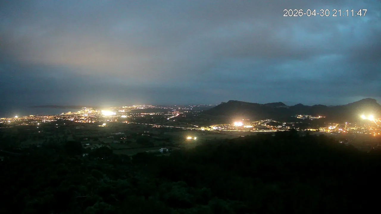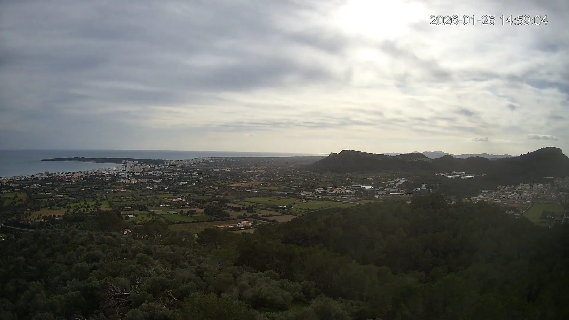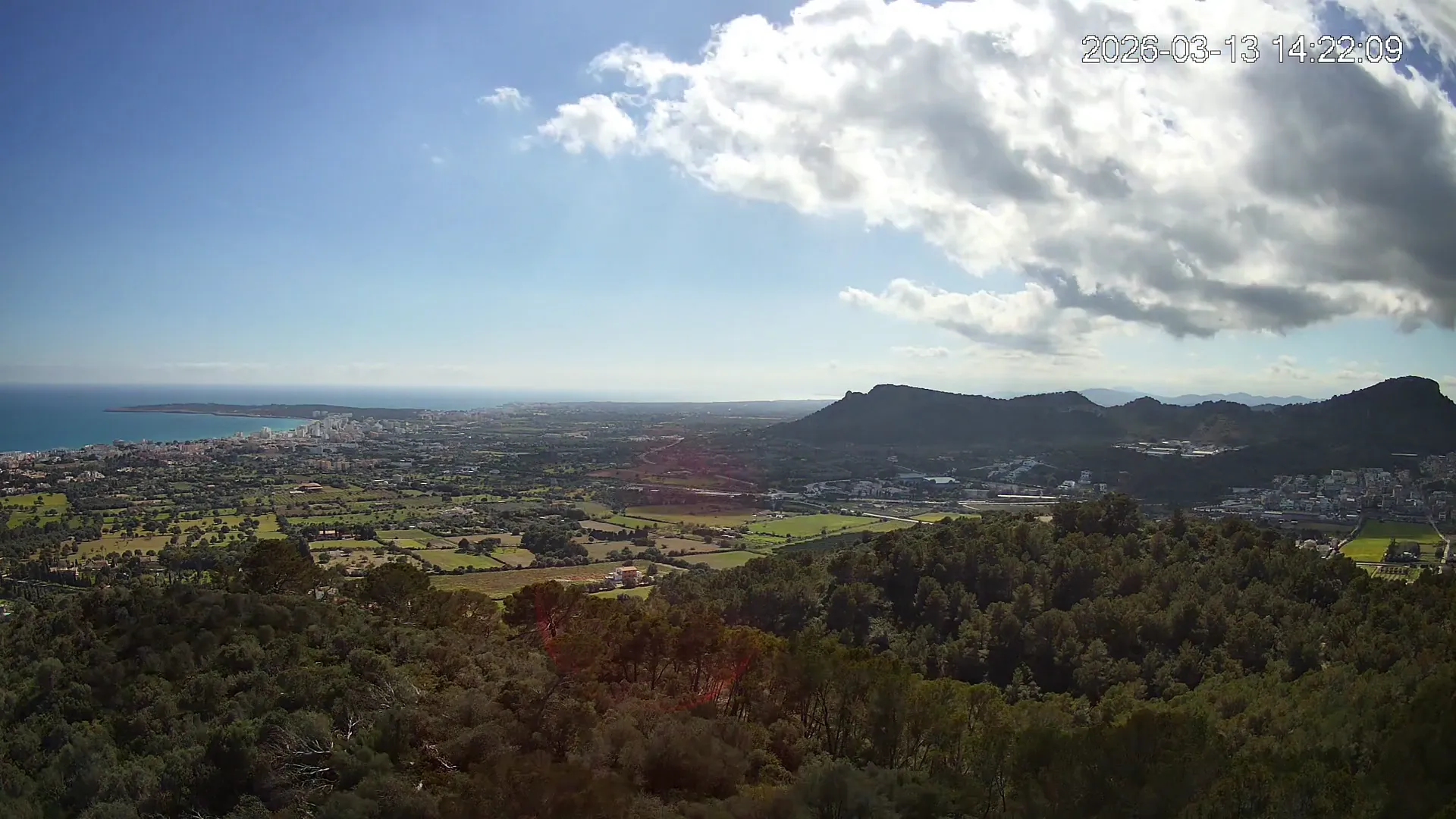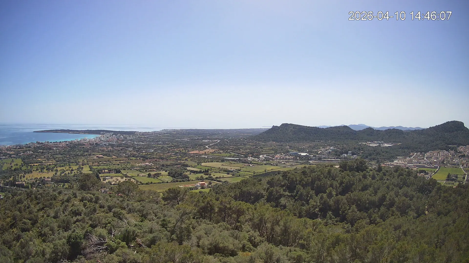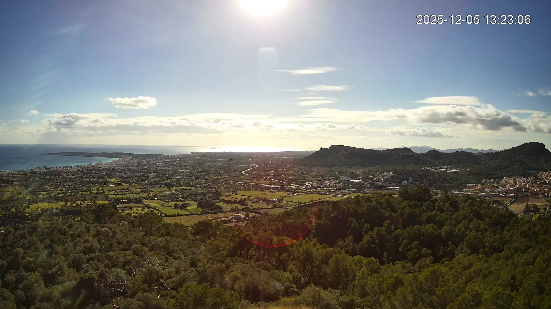 Desde lo alto del Puig de Son Corb, esta cámara se orienta hacia la bahía de Cala Millor, ofreciendo una panorámica espectacular de la costa del Llevant mallorquín. En primer plano, la silueta del Puig de na Penyal destaca con fuerza, mientras al fondo se abre el azul del mar y la línea urbana de Cala Millor. Una imagen que combina mar, montaña y vida mediterránea.