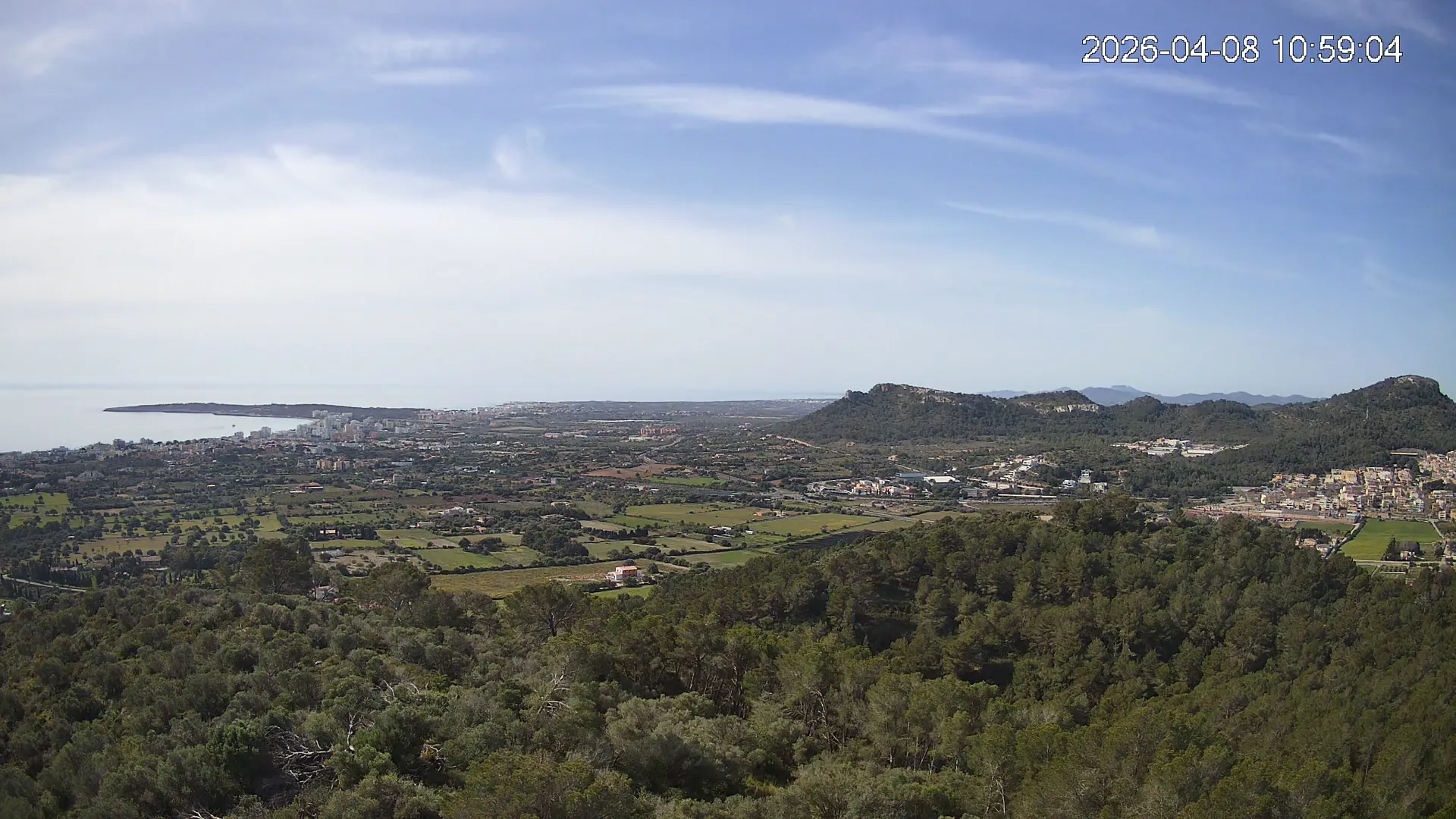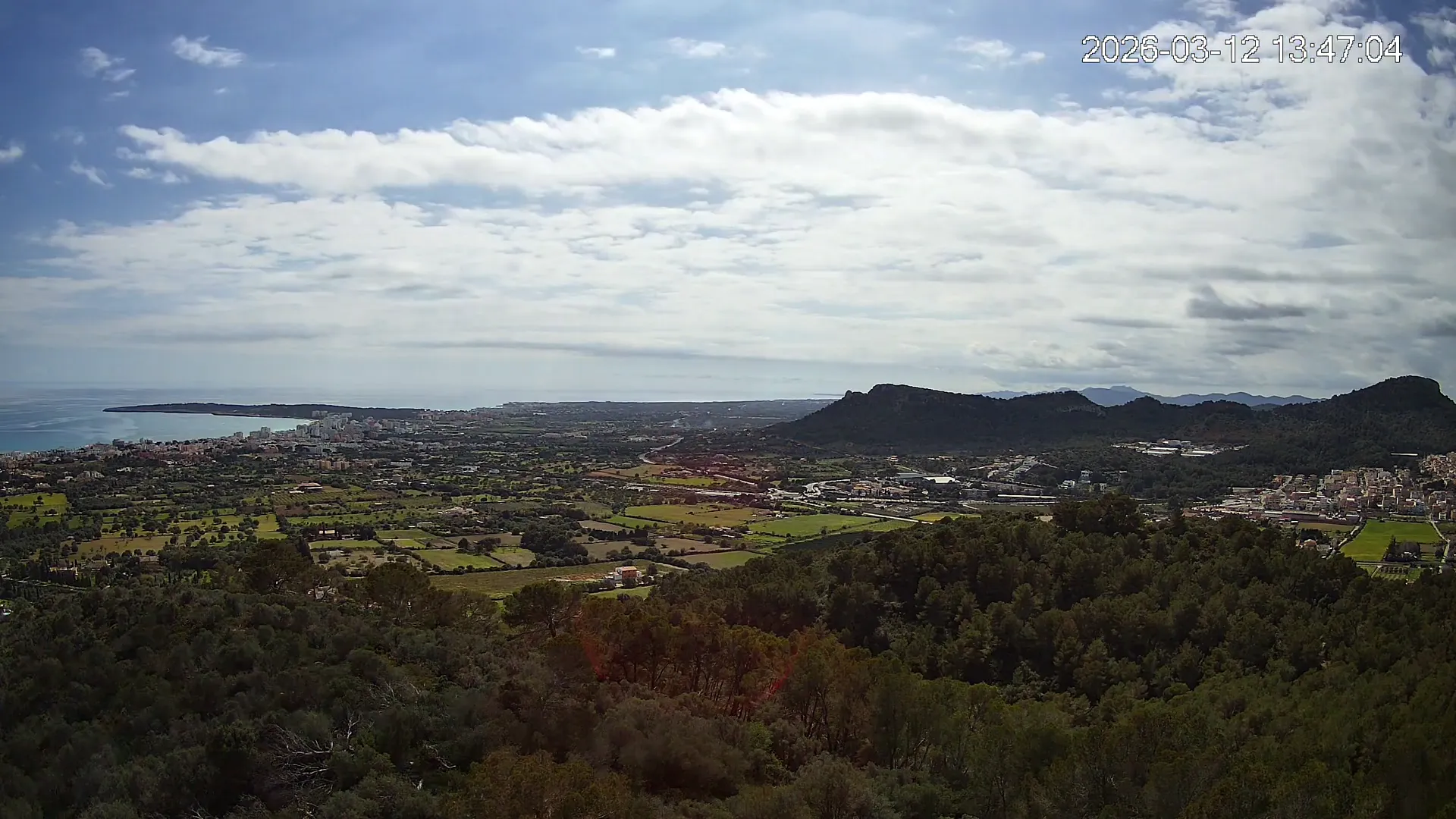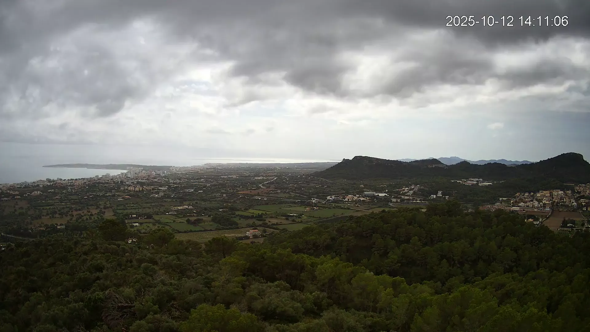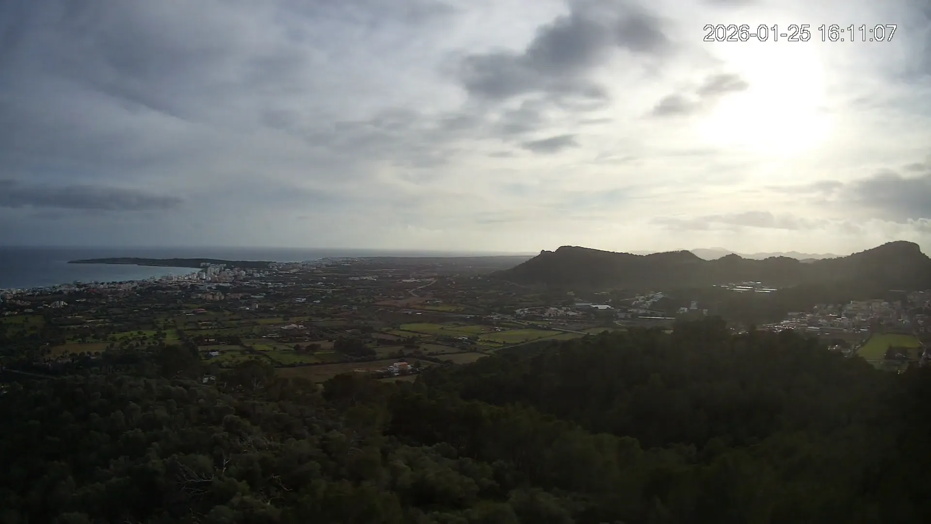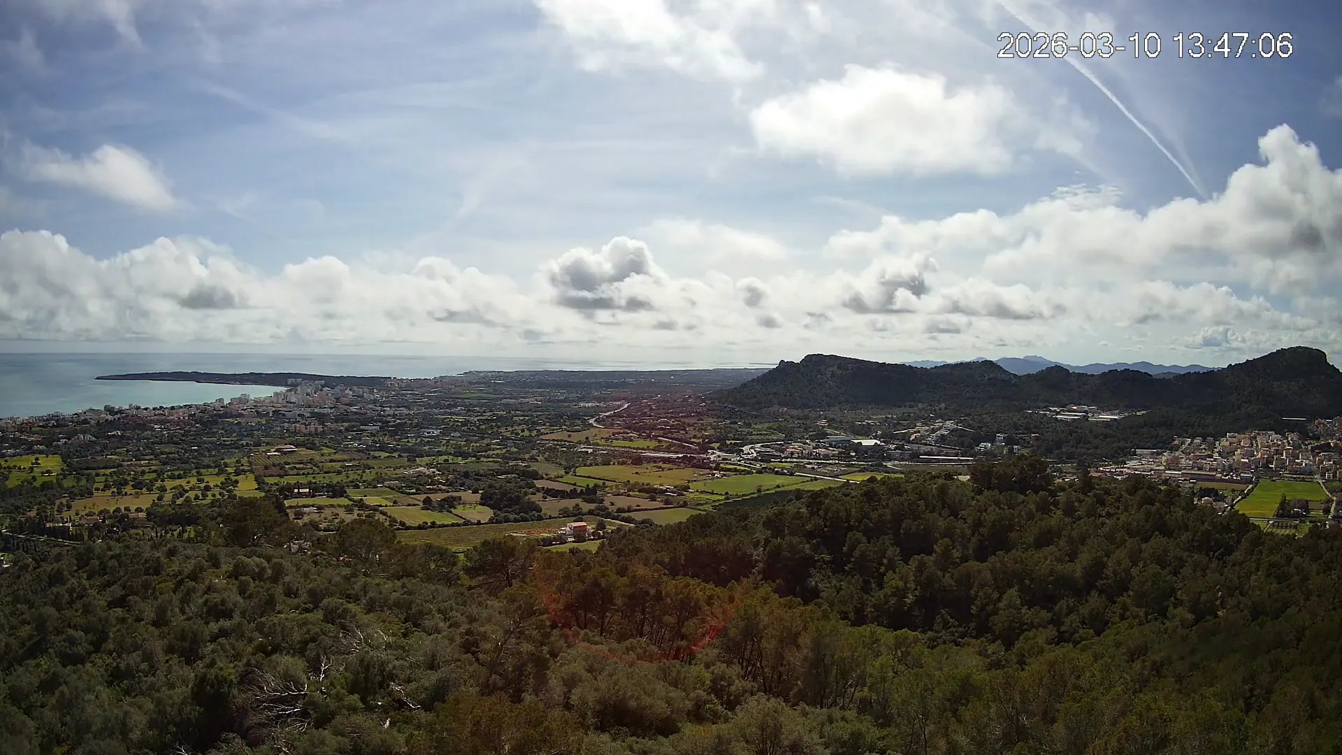 Desde lo alto del Puig de Son Corb, esta cámara se orienta hacia la bahía de Cala Millor, ofreciendo una panorámica espectacular de la costa del Llevant mallorquín. En primer plano, la silueta del Puig de na Penyal destaca con fuerza, mientras al fondo se abre el azul del mar y la línea urbana de Cala Millor. Una imagen que combina mar, montaña y vida mediterránea.