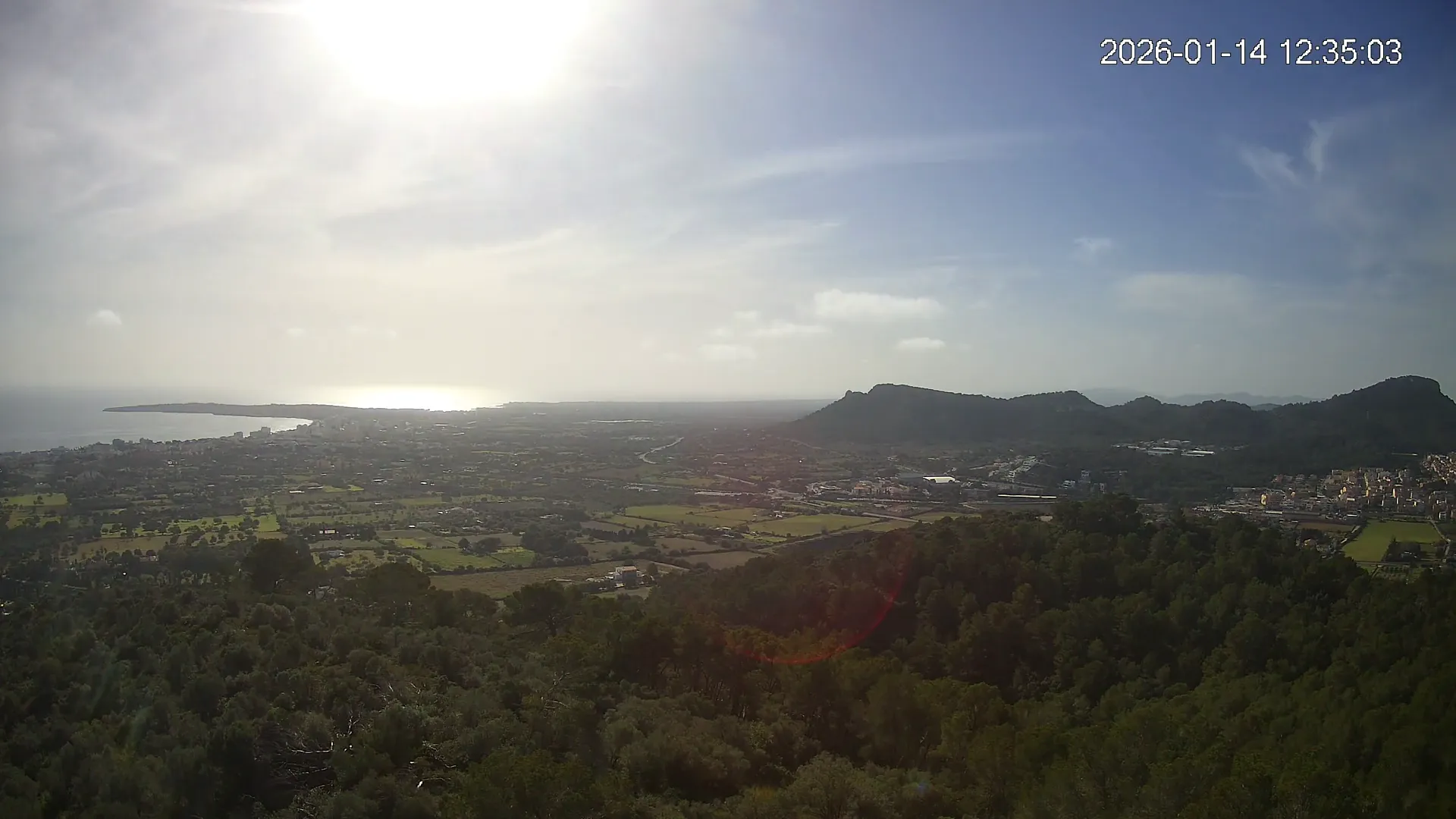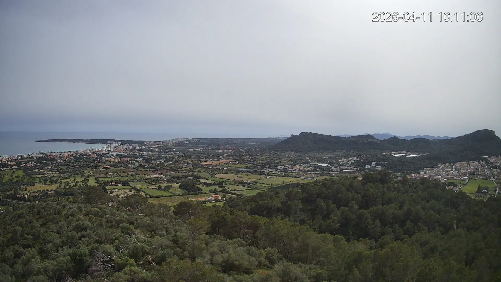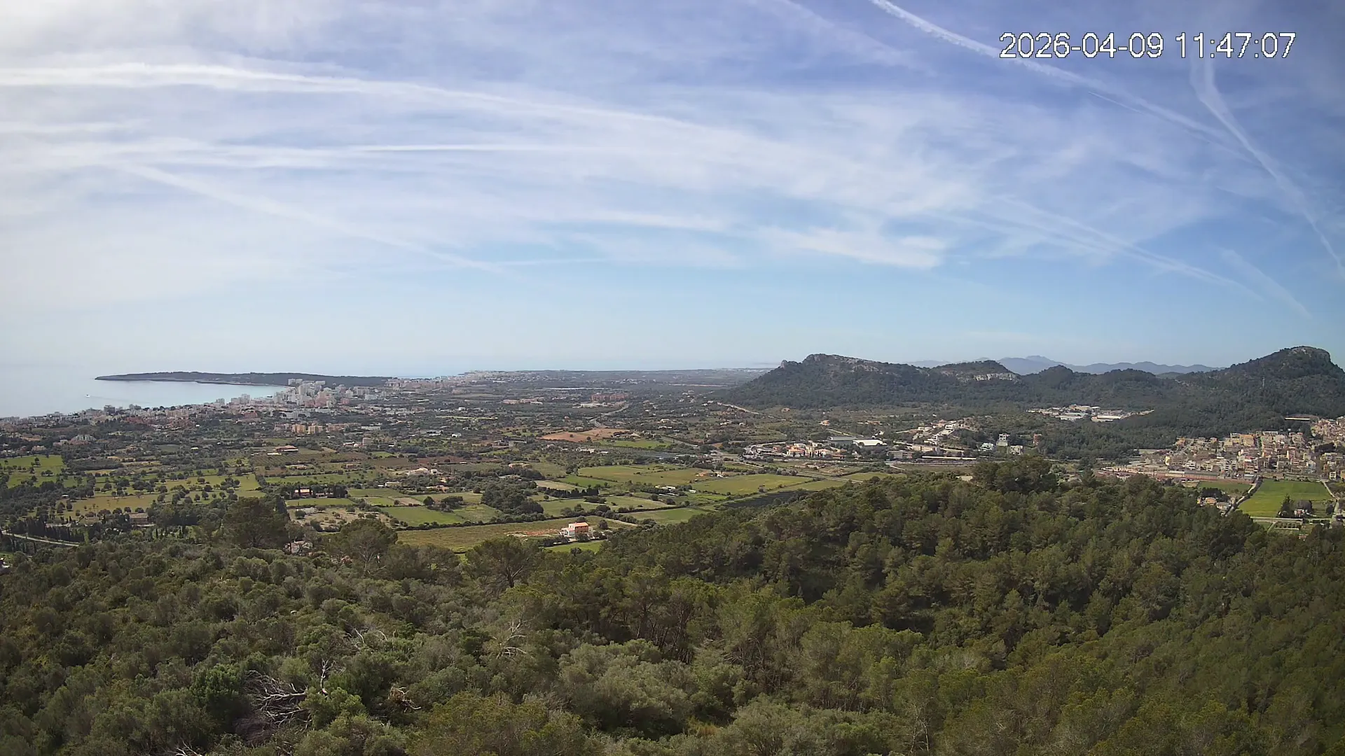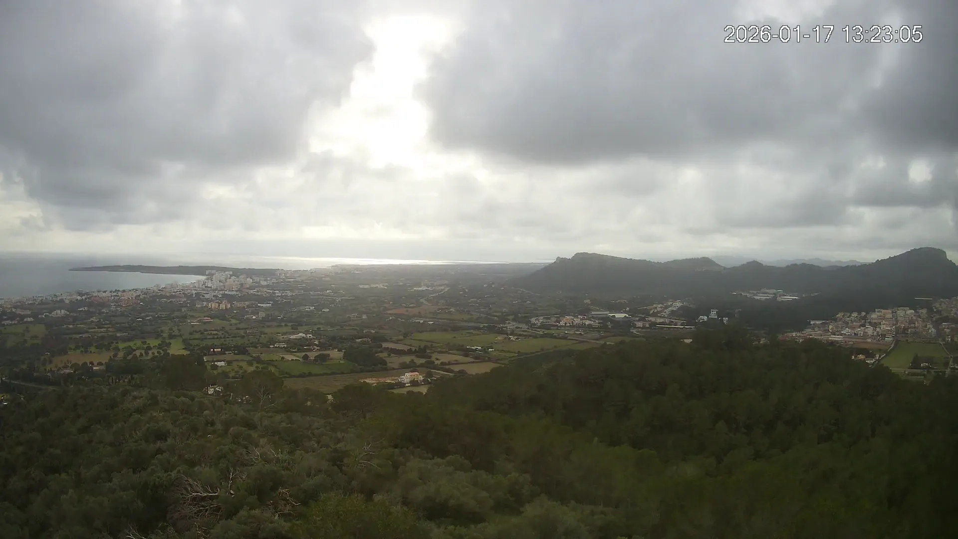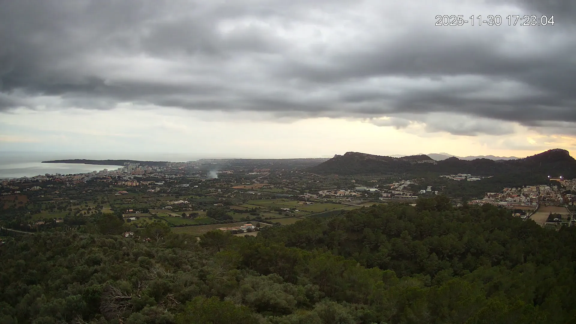 Desde lo alto del Puig de Son Corb, esta cámara se orienta hacia la bahía de Cala Millor, ofreciendo una panorámica espectacular de la costa del Llevant mallorquín. En primer plano, la silueta del Puig de na Penyal destaca con fuerza, mientras al fondo se abre el azul del mar y la línea urbana de Cala Millor. Una imagen que combina mar, montaña y vida mediterránea.