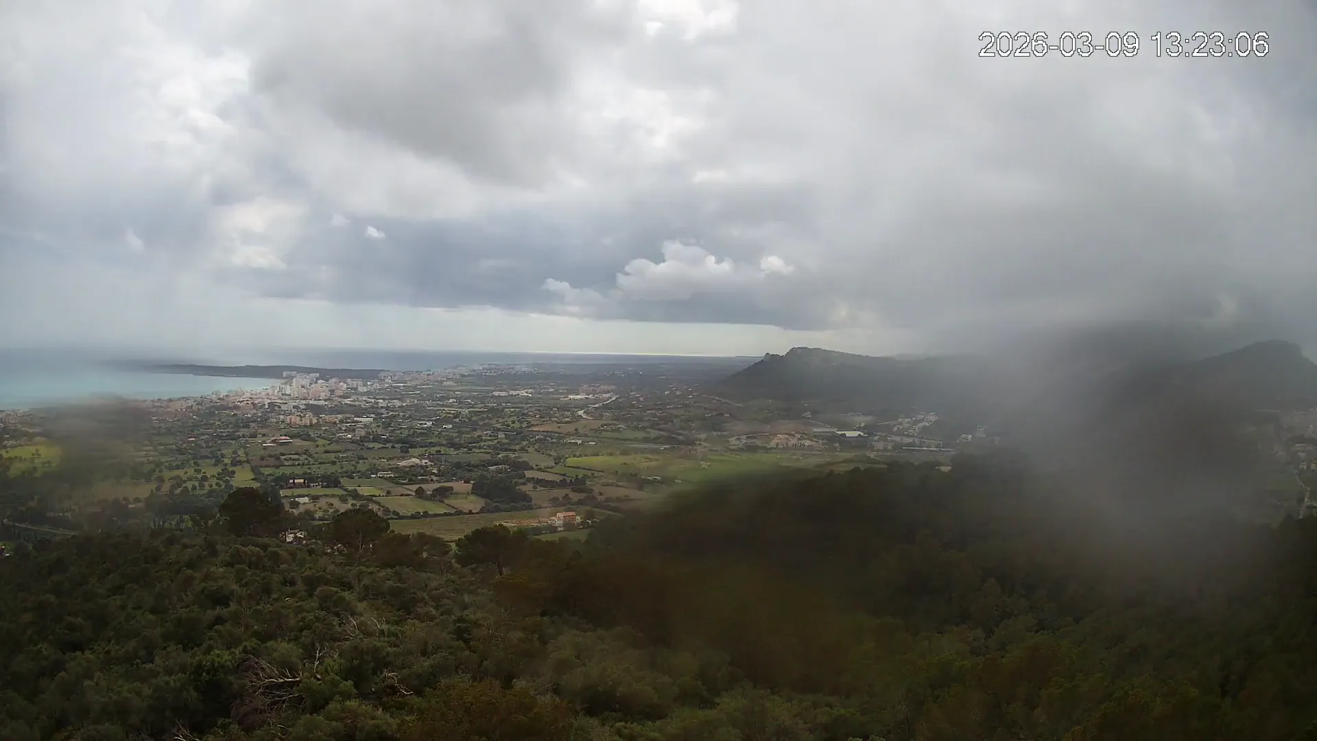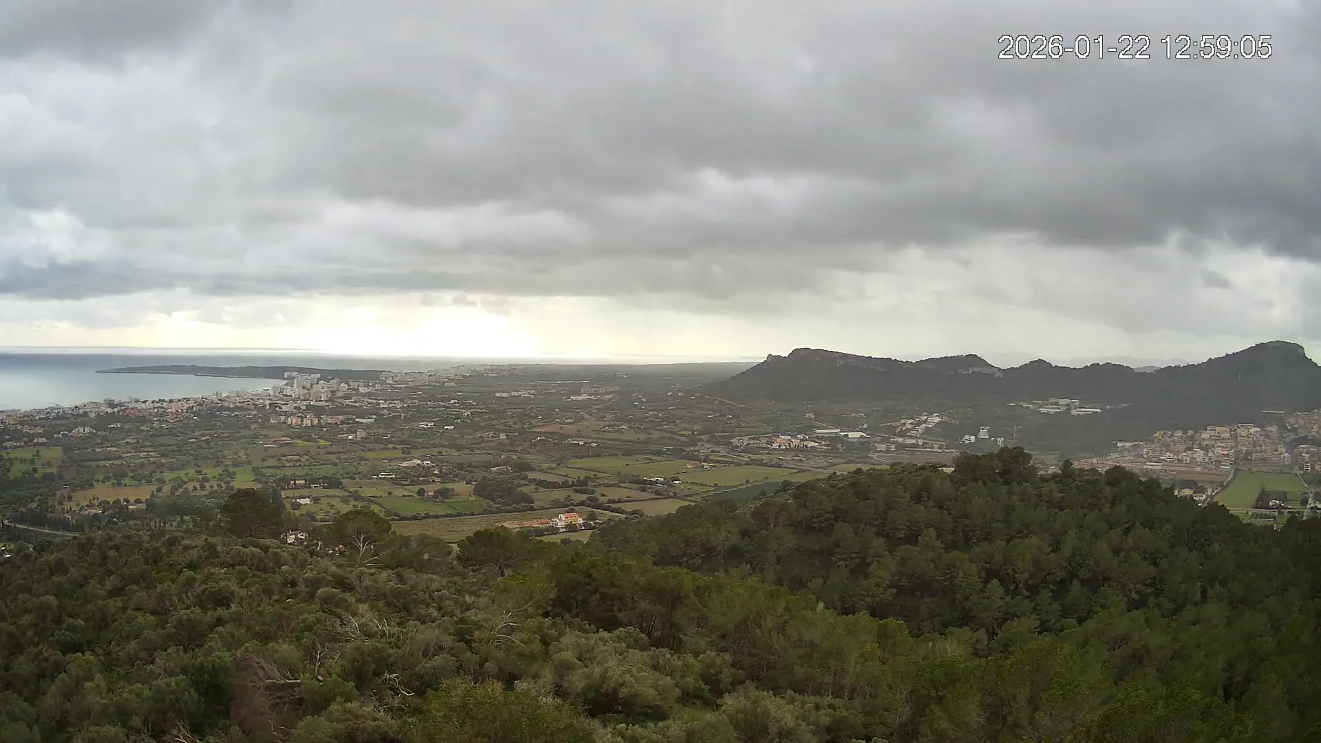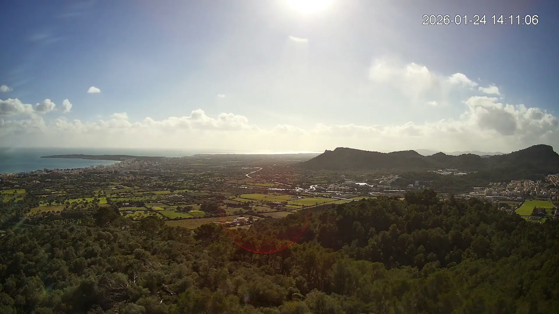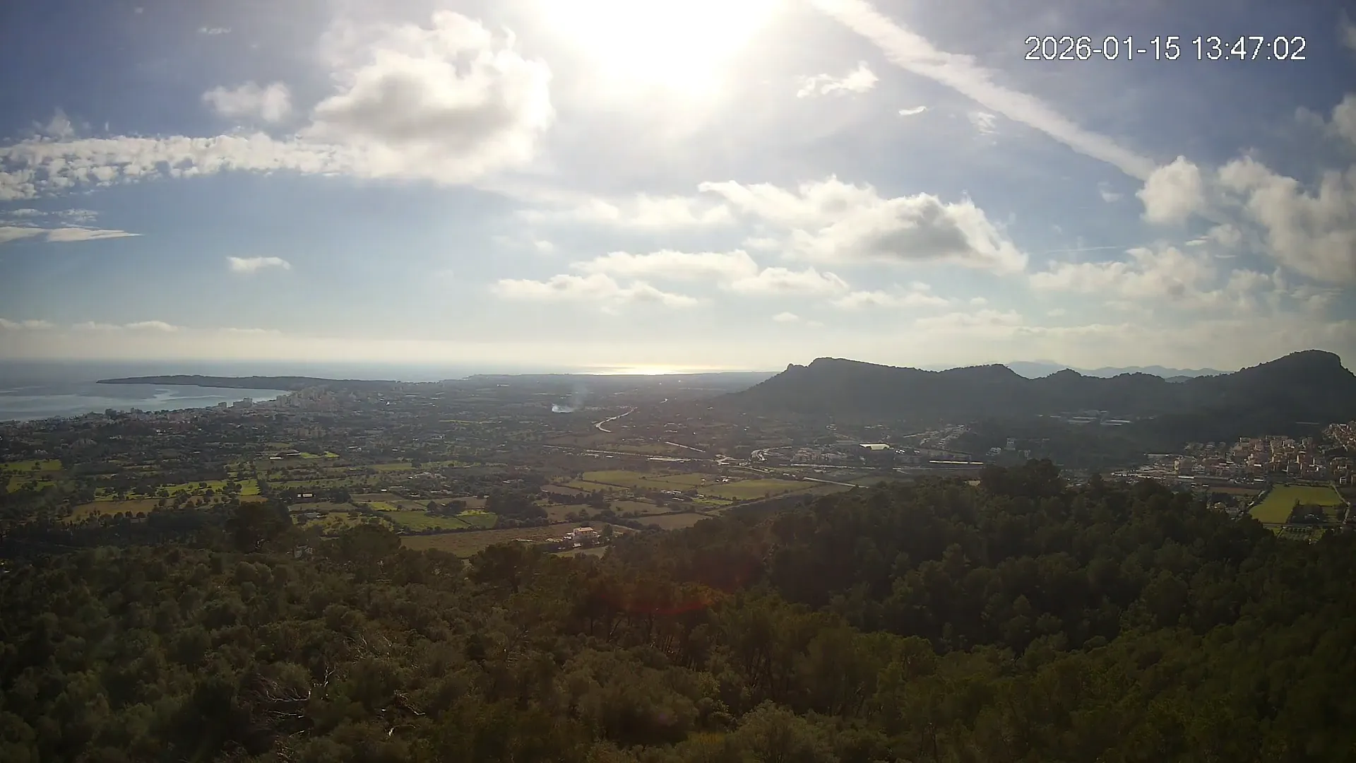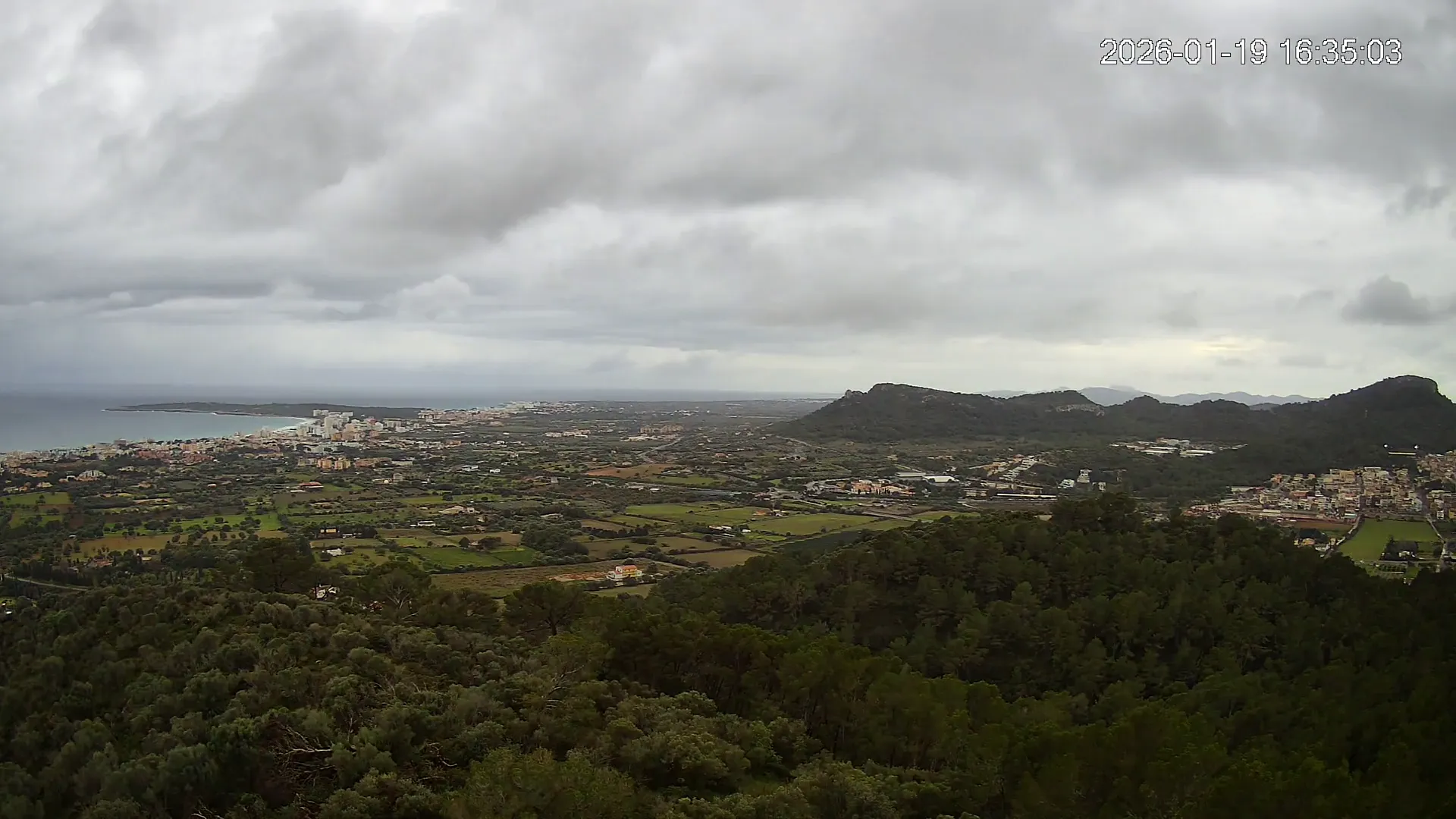 Desde lo alto del Puig de Son Corb, esta cámara se orienta hacia la bahía de Cala Millor, ofreciendo una panorámica espectacular de la costa del Llevant mallorquín. En primer plano, la silueta del Puig de na Penyal destaca con fuerza, mientras al fondo se abre el azul del mar y la línea urbana de Cala Millor. Una imagen que combina mar, montaña y vida mediterránea.