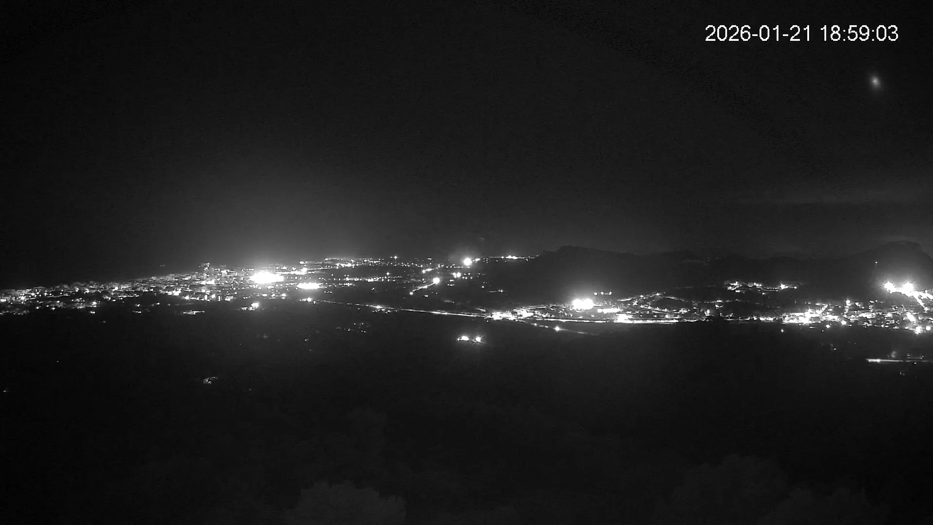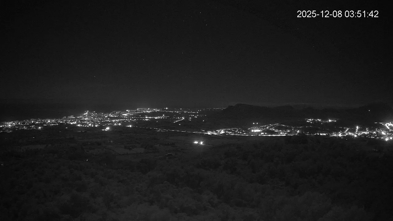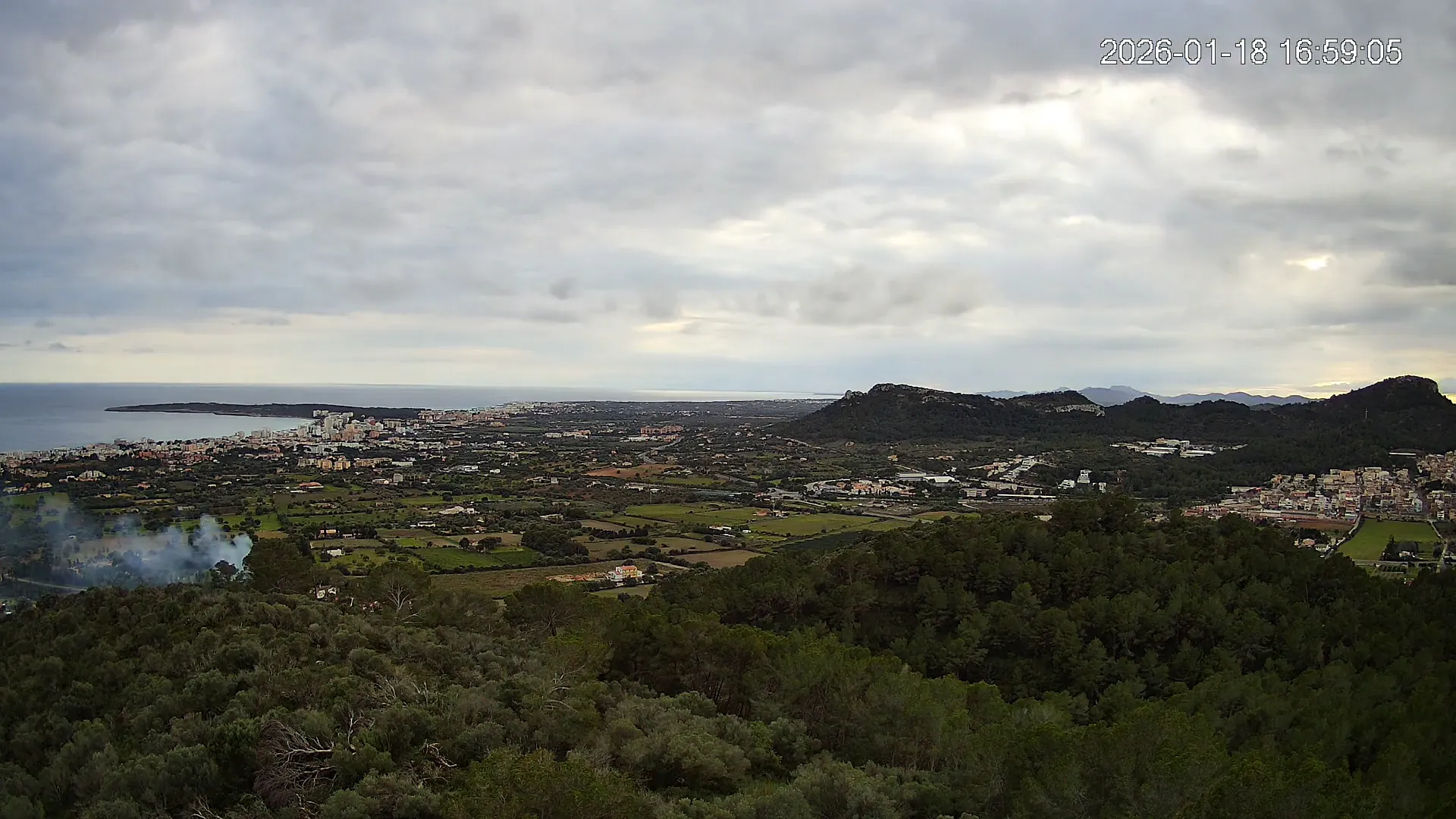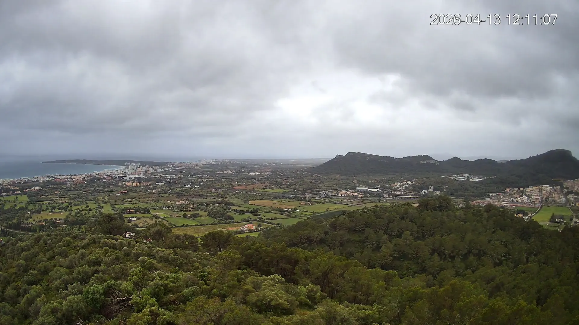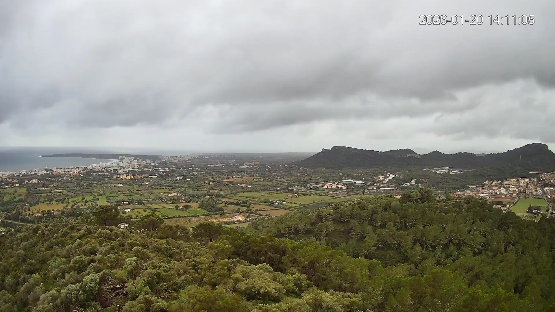 Desde lo alto del Puig de Son Corb, esta cámara se orienta hacia la bahía de Cala Millor, ofreciendo una panorámica espectacular de la costa del Llevant mallorquín. En primer plano, la silueta del Puig de na Penyal destaca con fuerza, mientras al fondo se abre el azul del mar y la línea urbana de Cala Millor. Una imagen que combina mar, montaña y vida mediterránea.