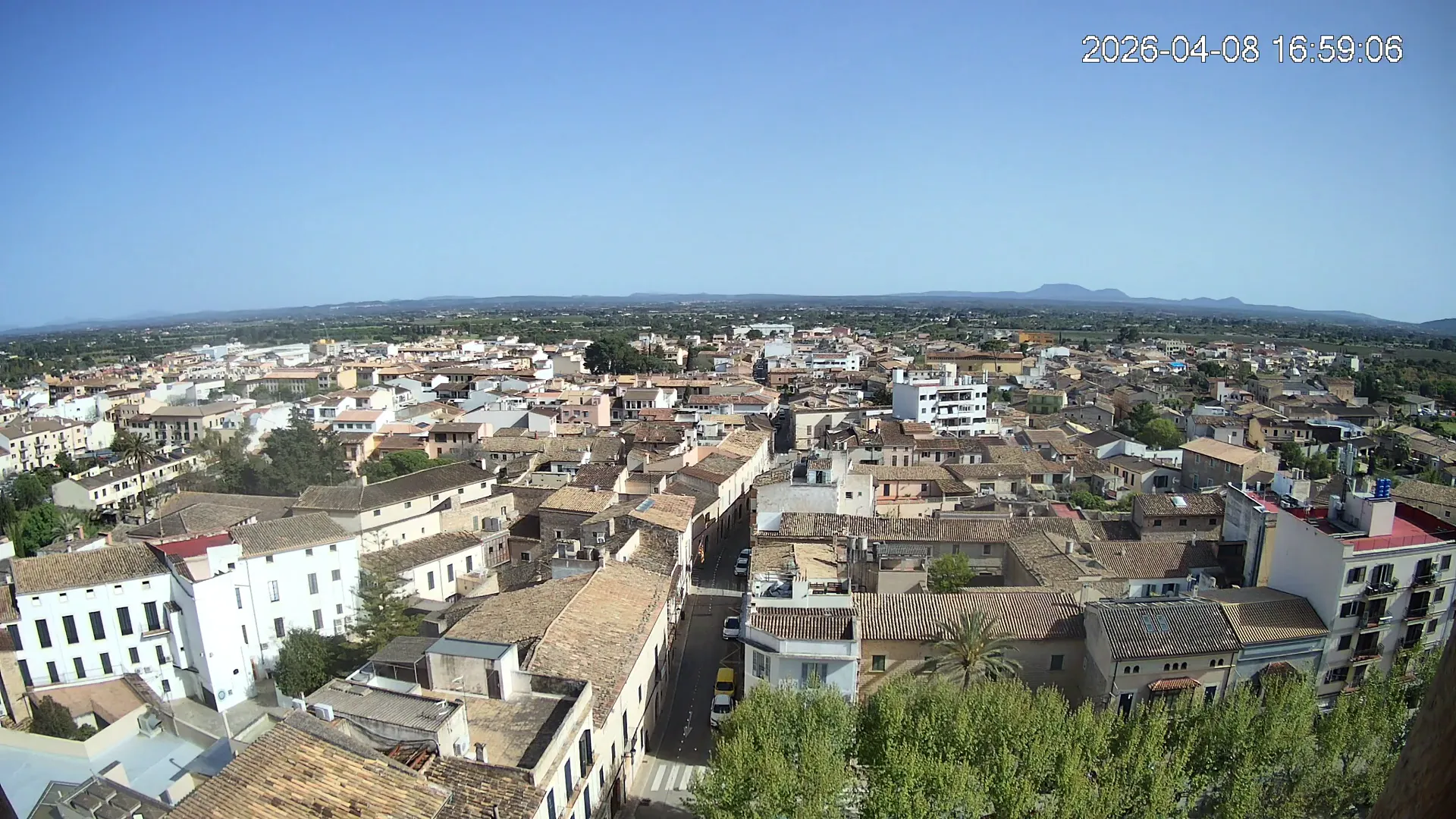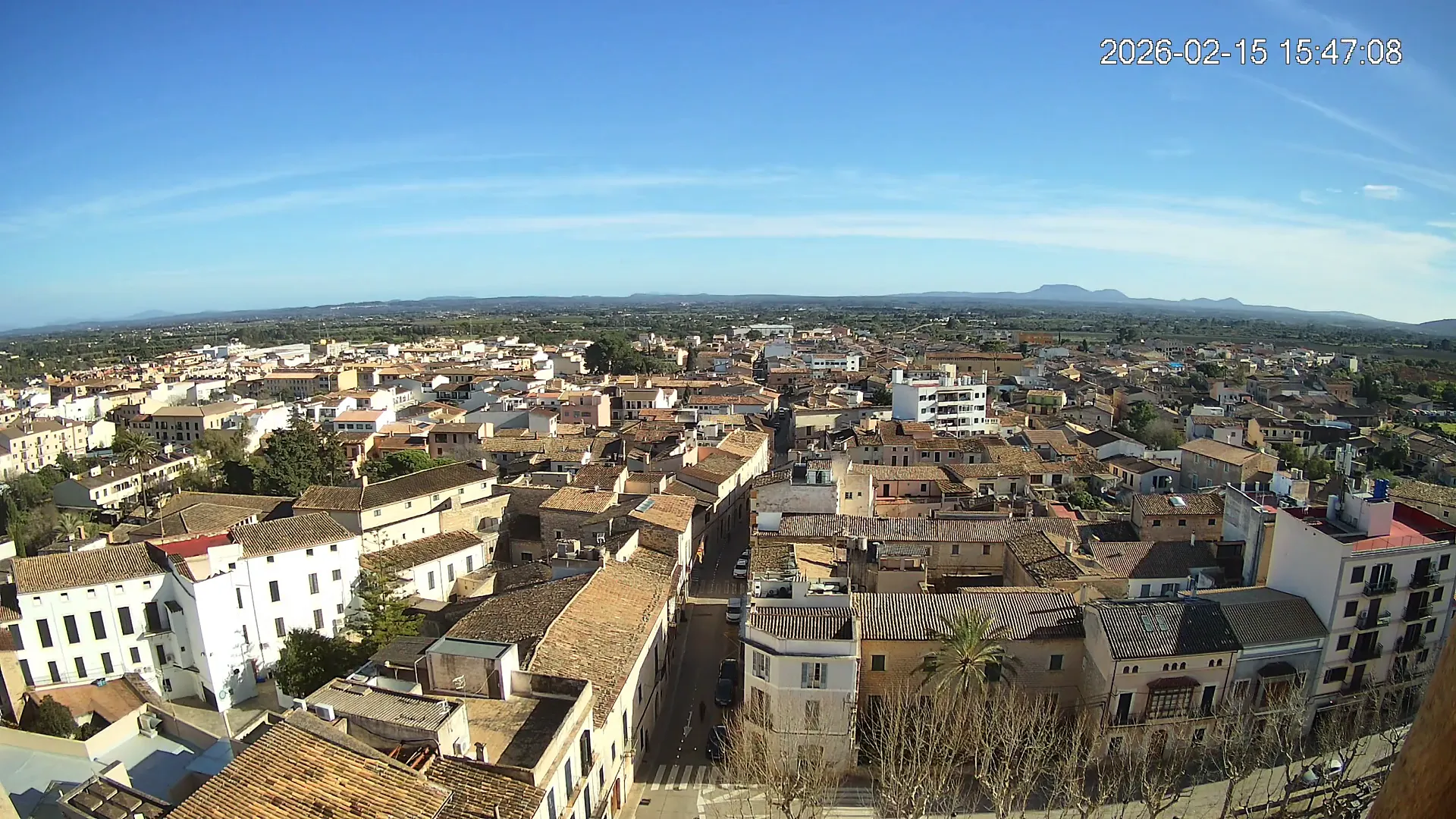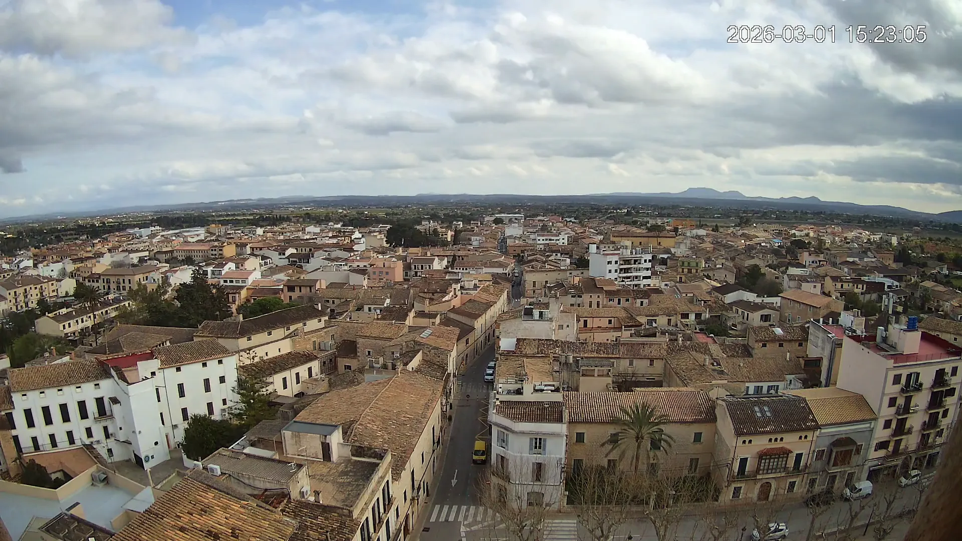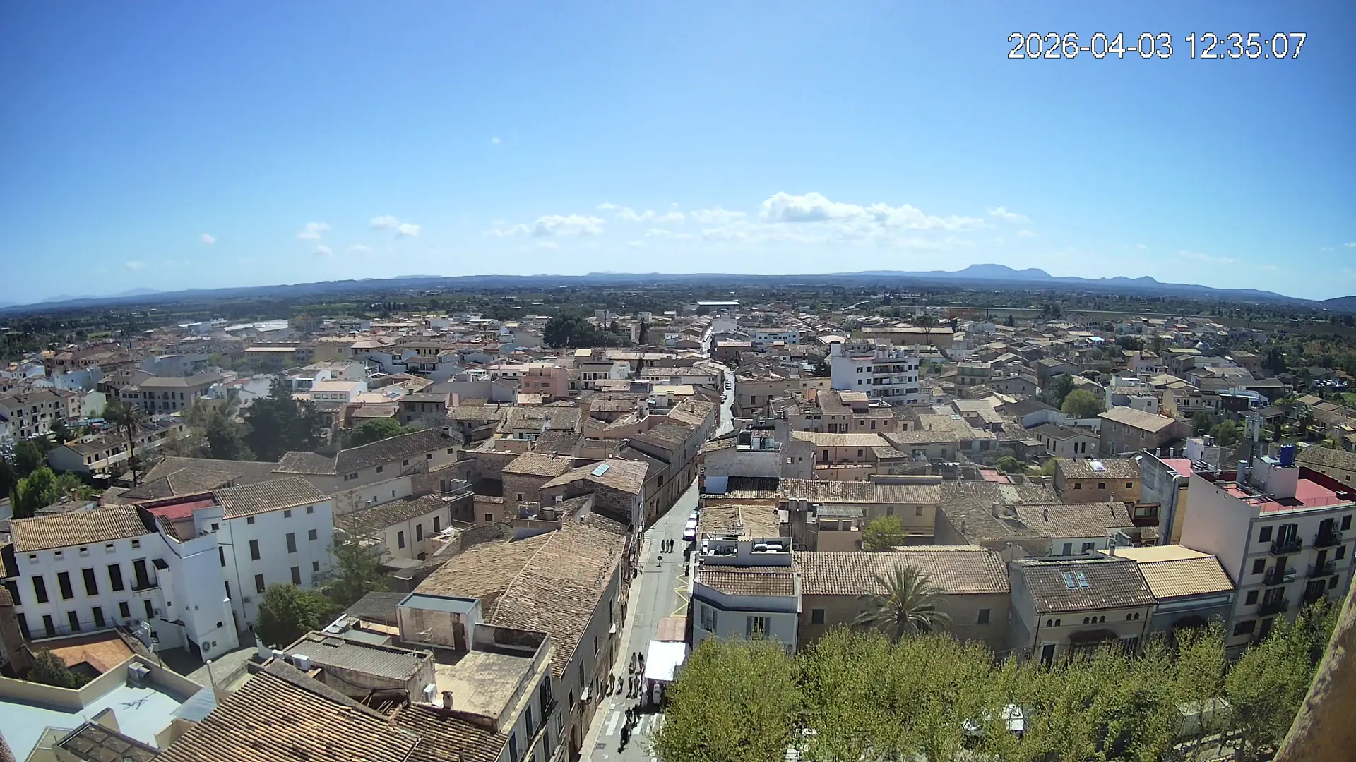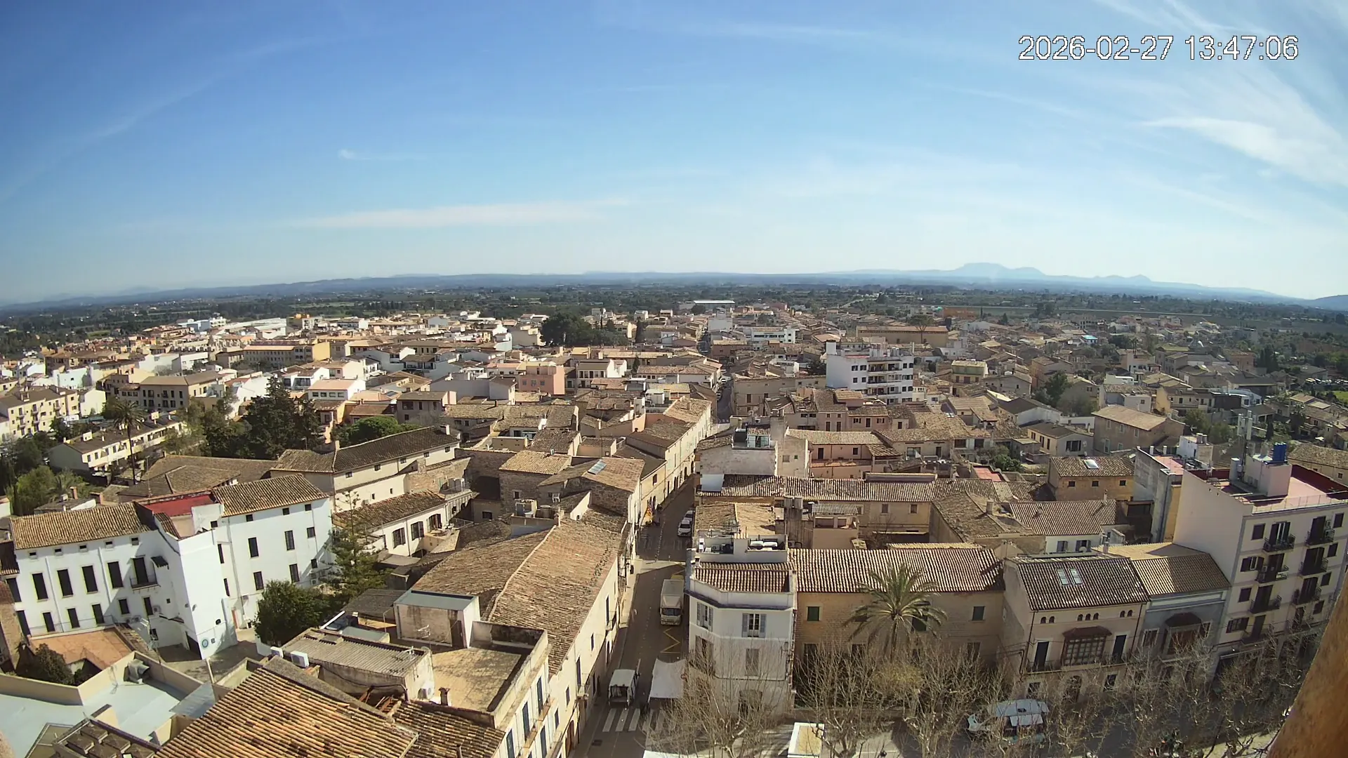 Desde lo alto del campanario de Binissalem, se ofrece una vista elevada del pueblo, donde predominan los tejados de teja árabe que se extienden entre calles estrechas, rodeados por el paisaje agrícola del Pla de Mallorca. Esta perspectiva refleja la esencia de Binissalem, un pueblo con profunda tradición vinícola y carácter auténtico mallorquín.
