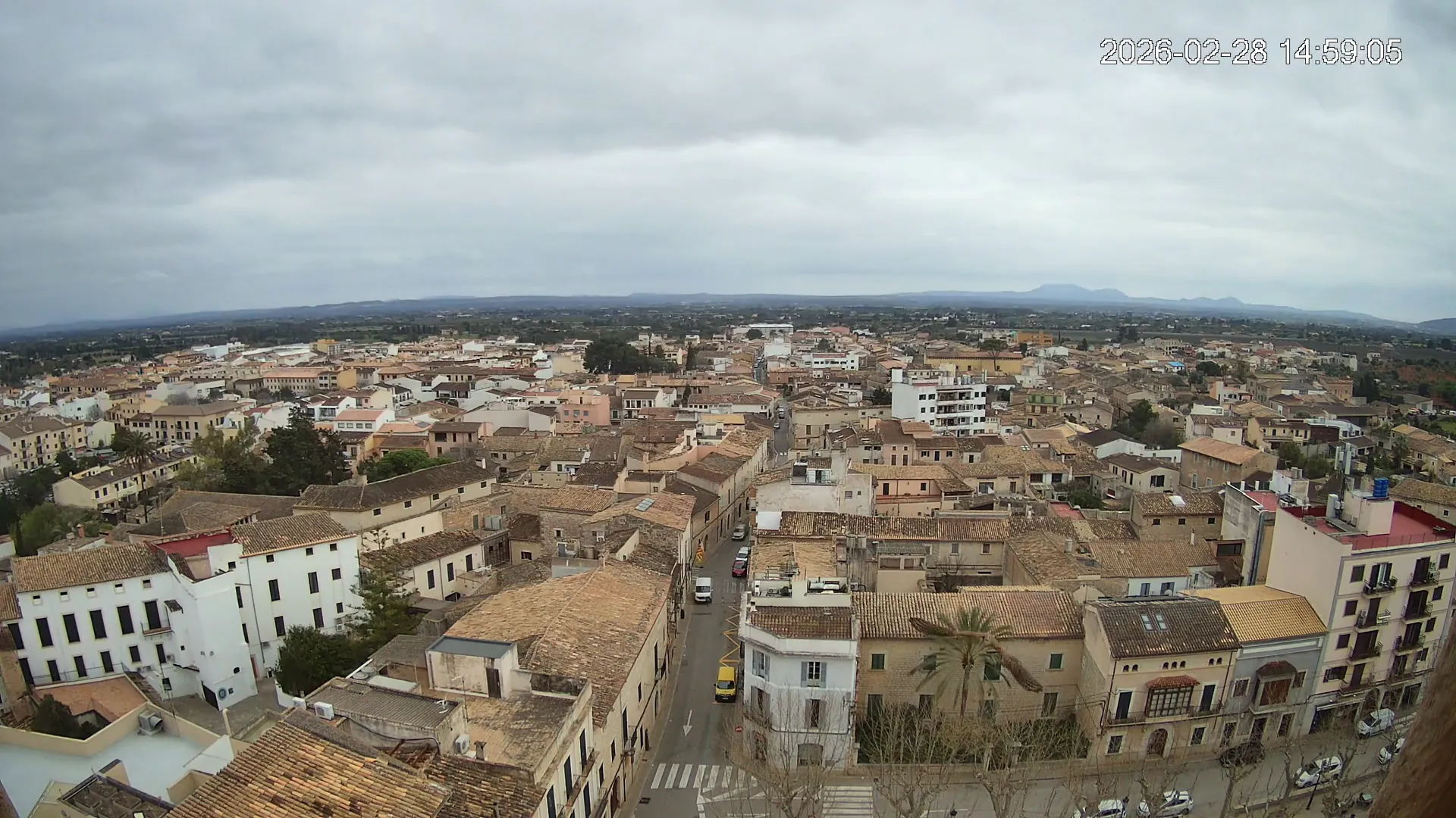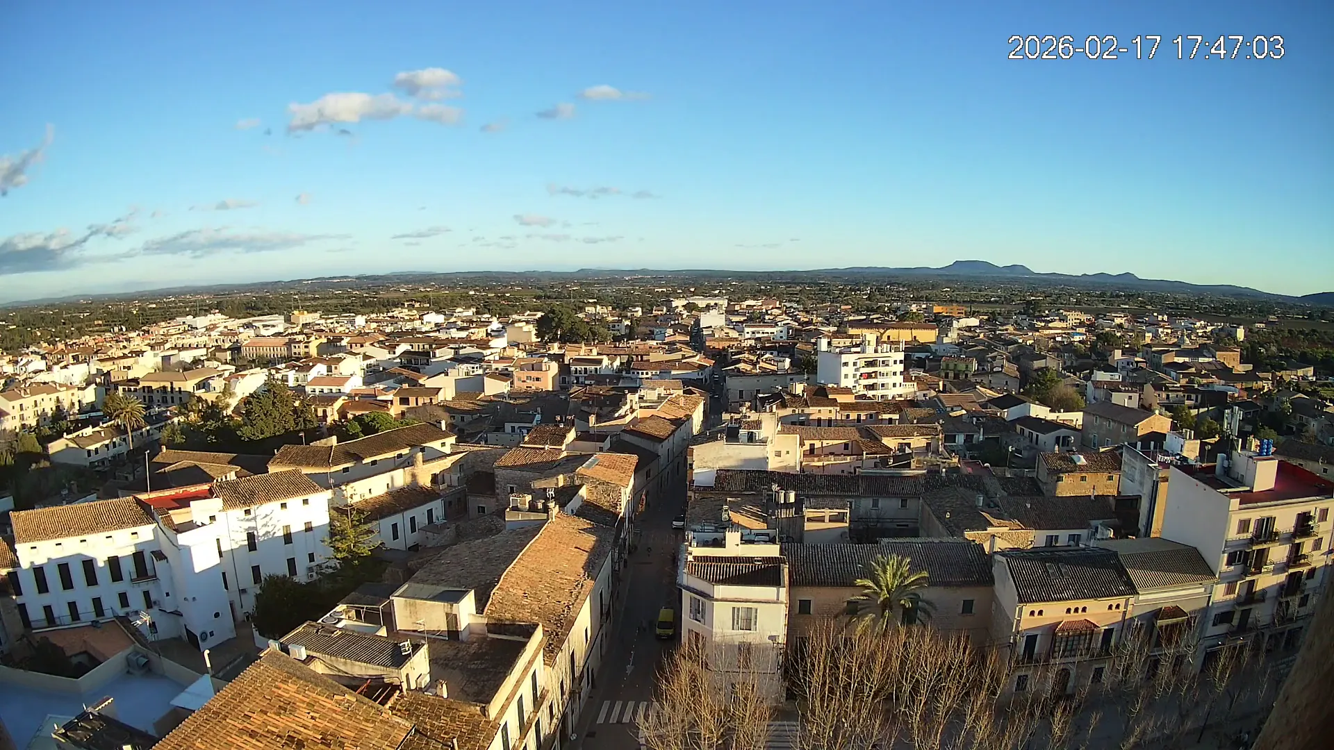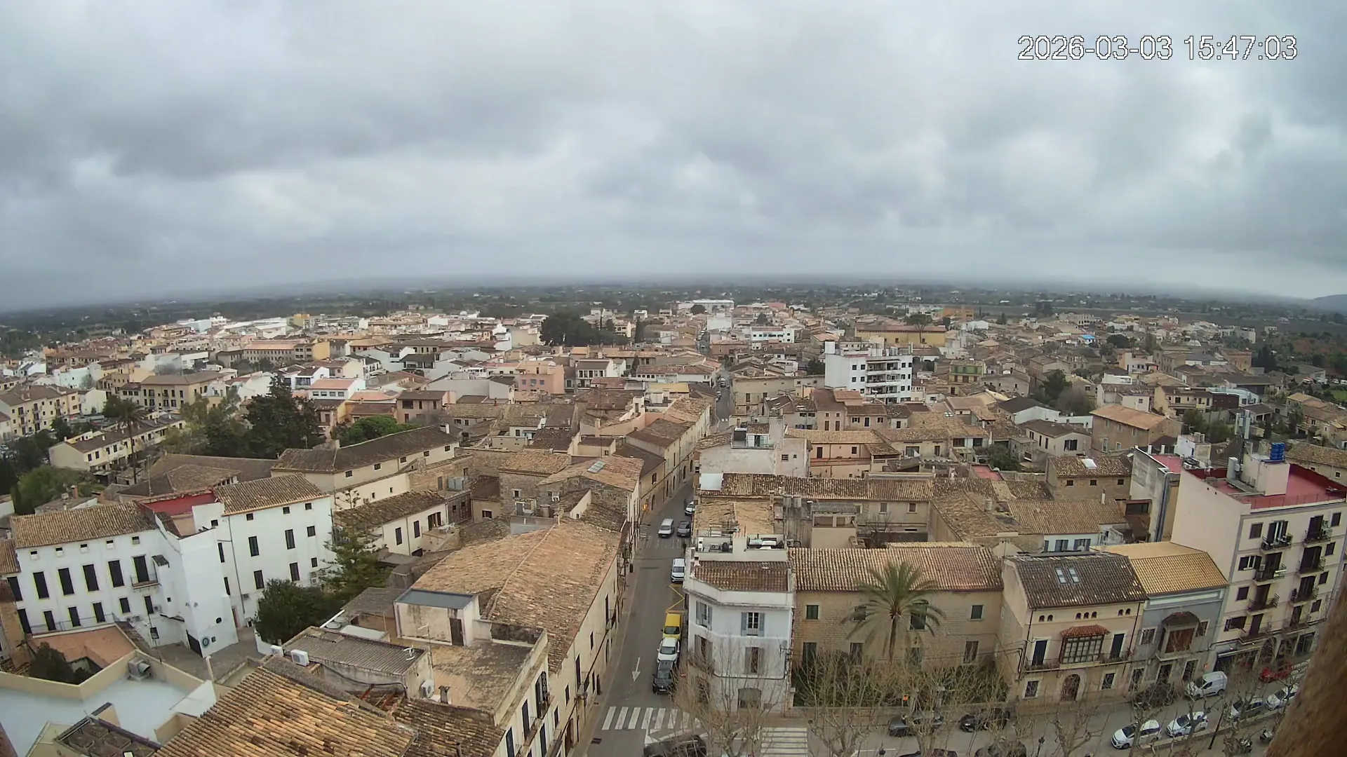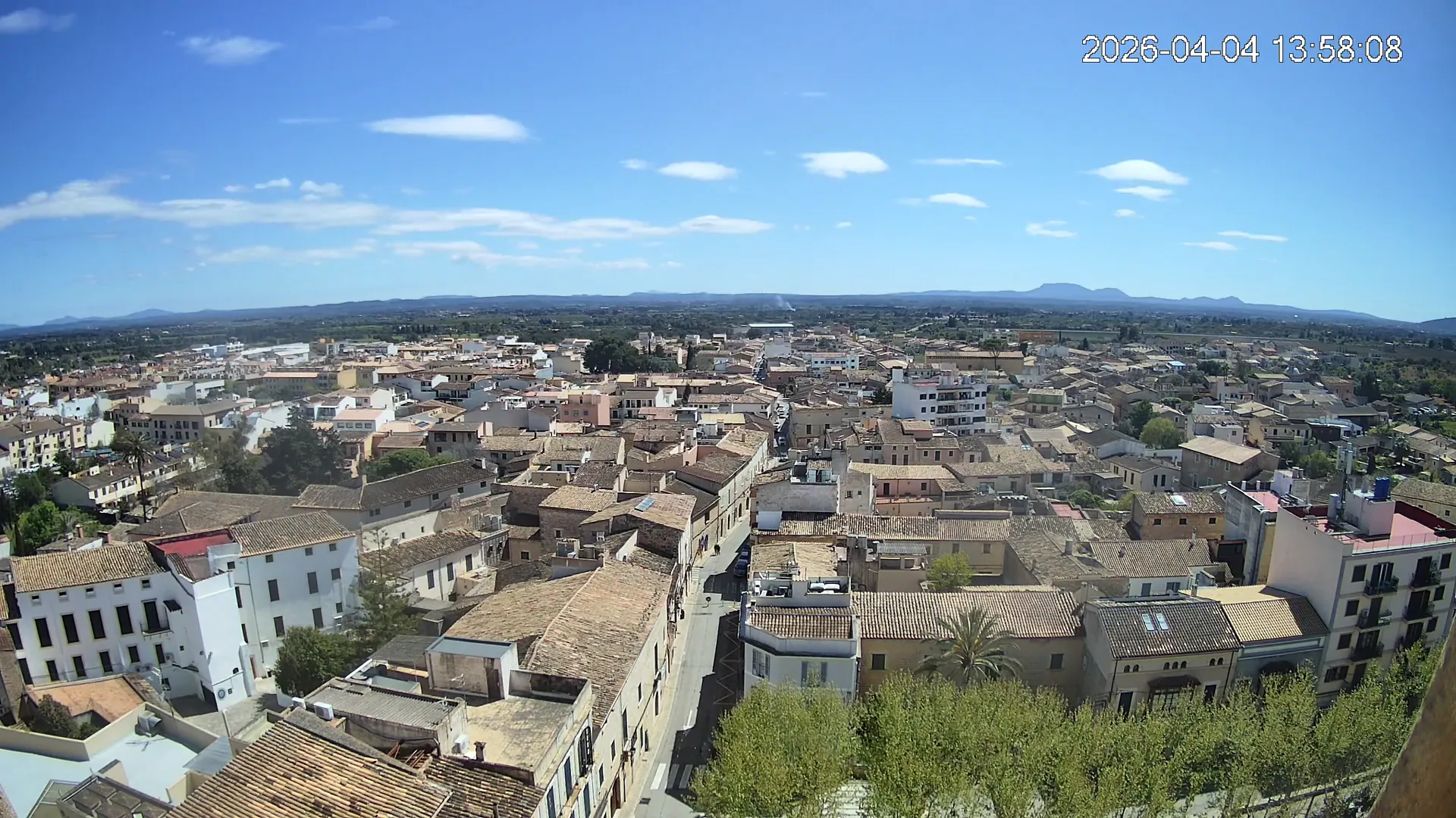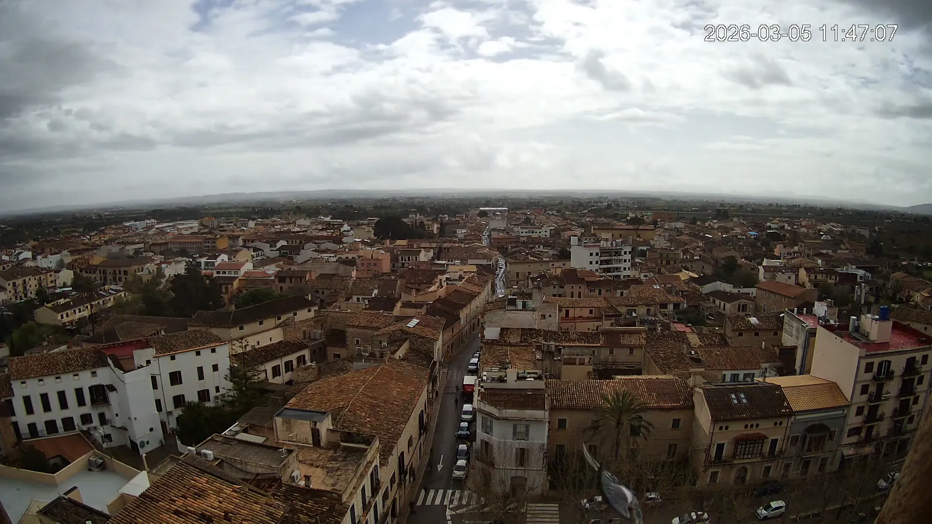 Desde lo alto del campanario de Binissalem, se ofrece una vista elevada del pueblo, donde predominan los tejados de teja árabe que se extienden entre calles estrechas, rodeados por el paisaje agrícola del Pla de Mallorca. Esta perspectiva refleja la esencia de Binissalem, un pueblo con profunda tradición vinícola y carácter auténtico mallorquín.