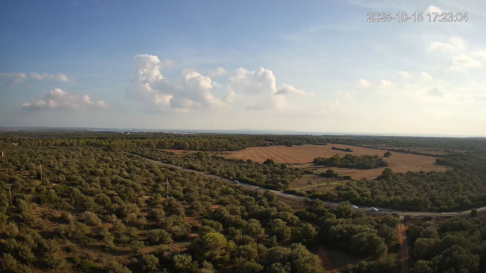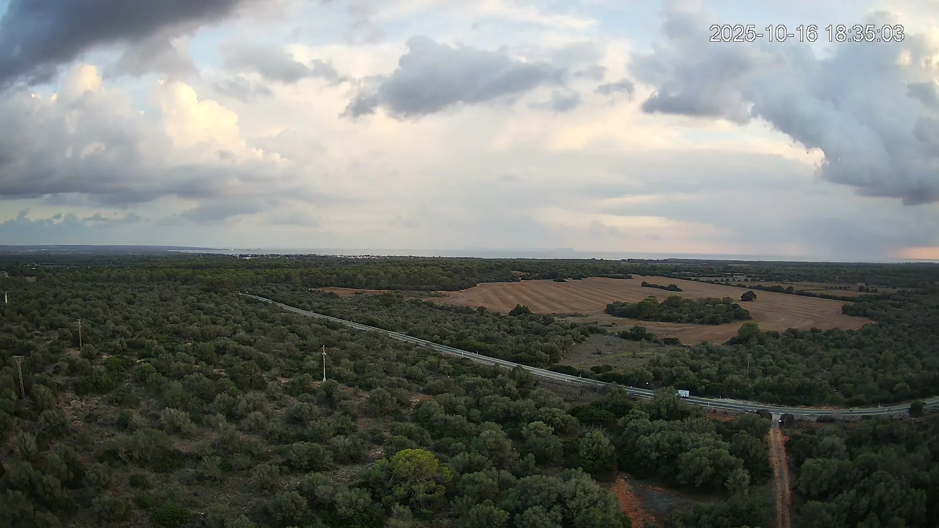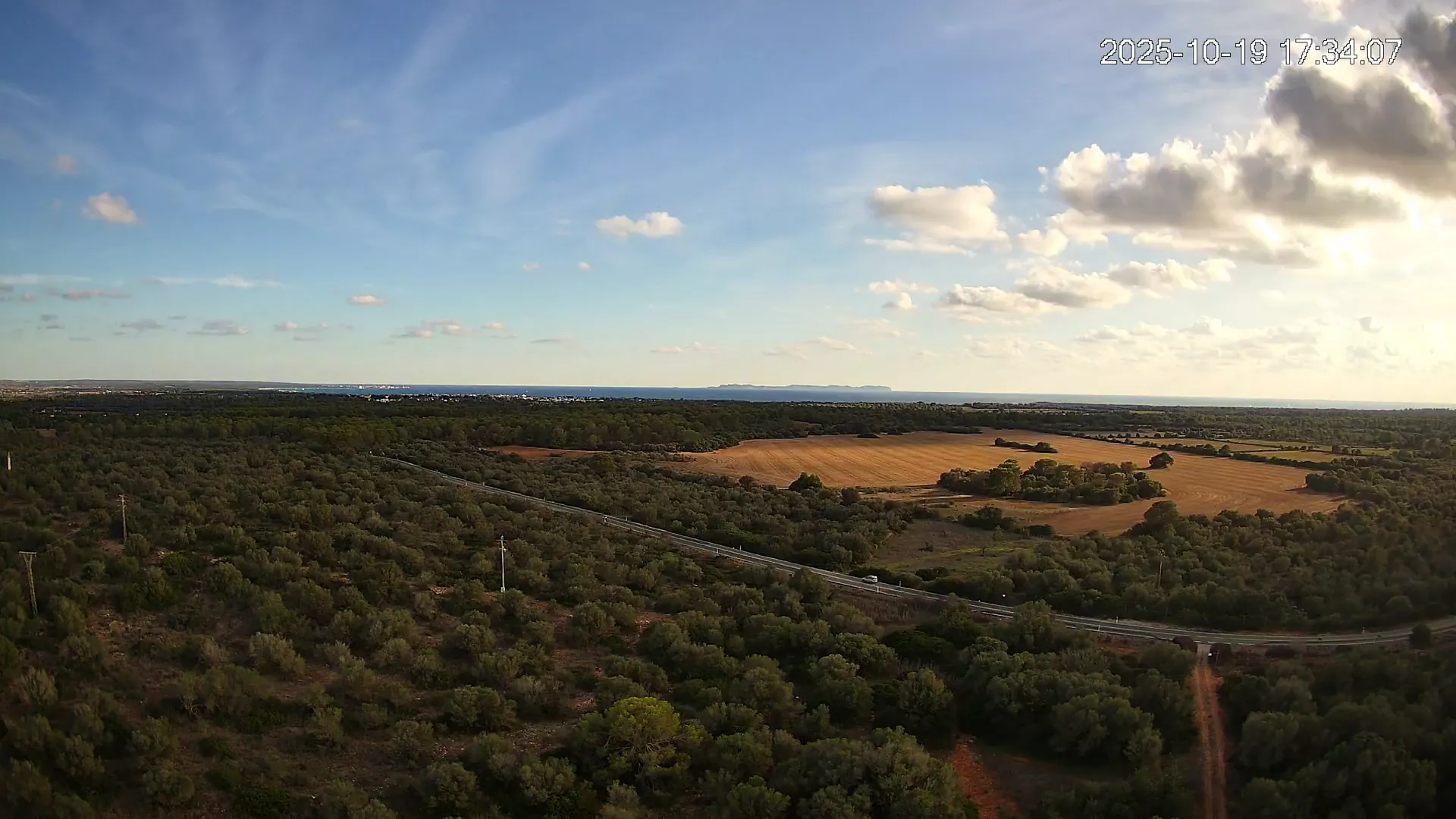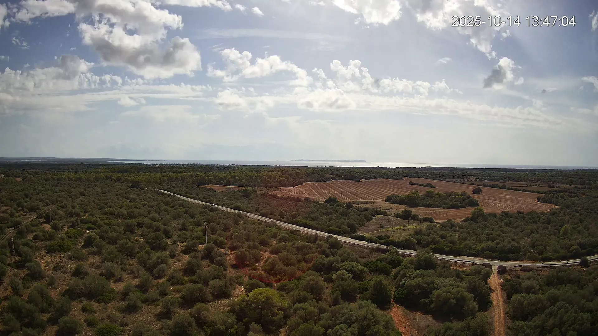Esta cámara, ubicada en Es Llobets, dentro del término municipal de Llucmajor, ofrece una vista privilegiada hacia el sur de Mallorca. En el horizonte se puede ver la silueta de Cabrera, la emblemática isla y parque nacional, destacando sobre el mar y completando un paisaje sereno donde el entorno rural se funde con la belleza natural del Mediterráneo.