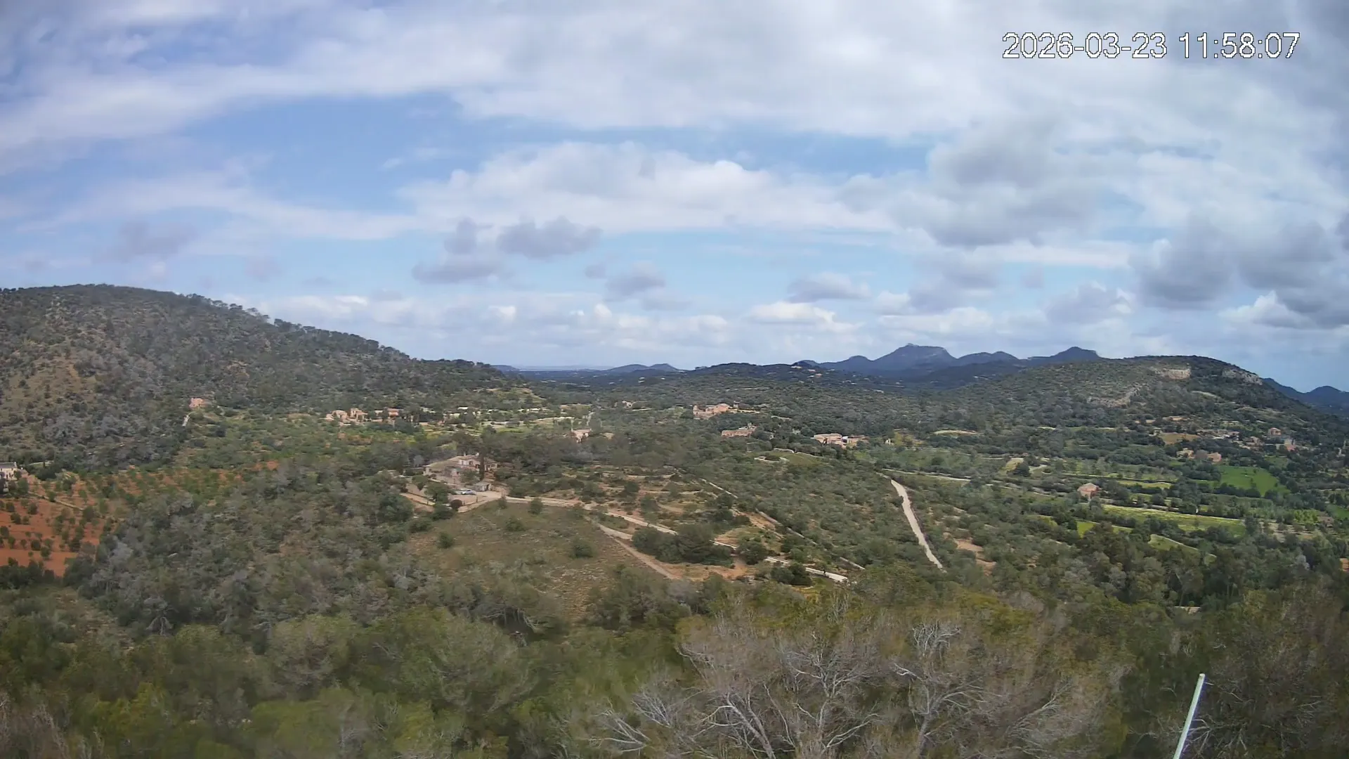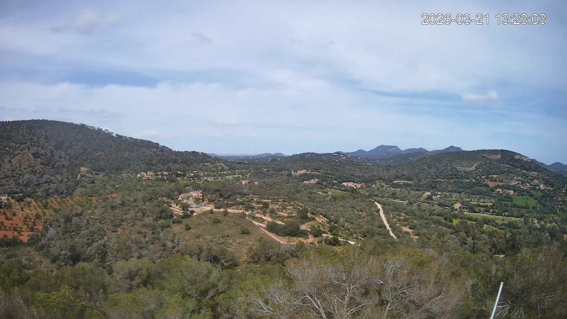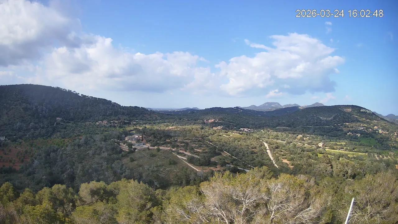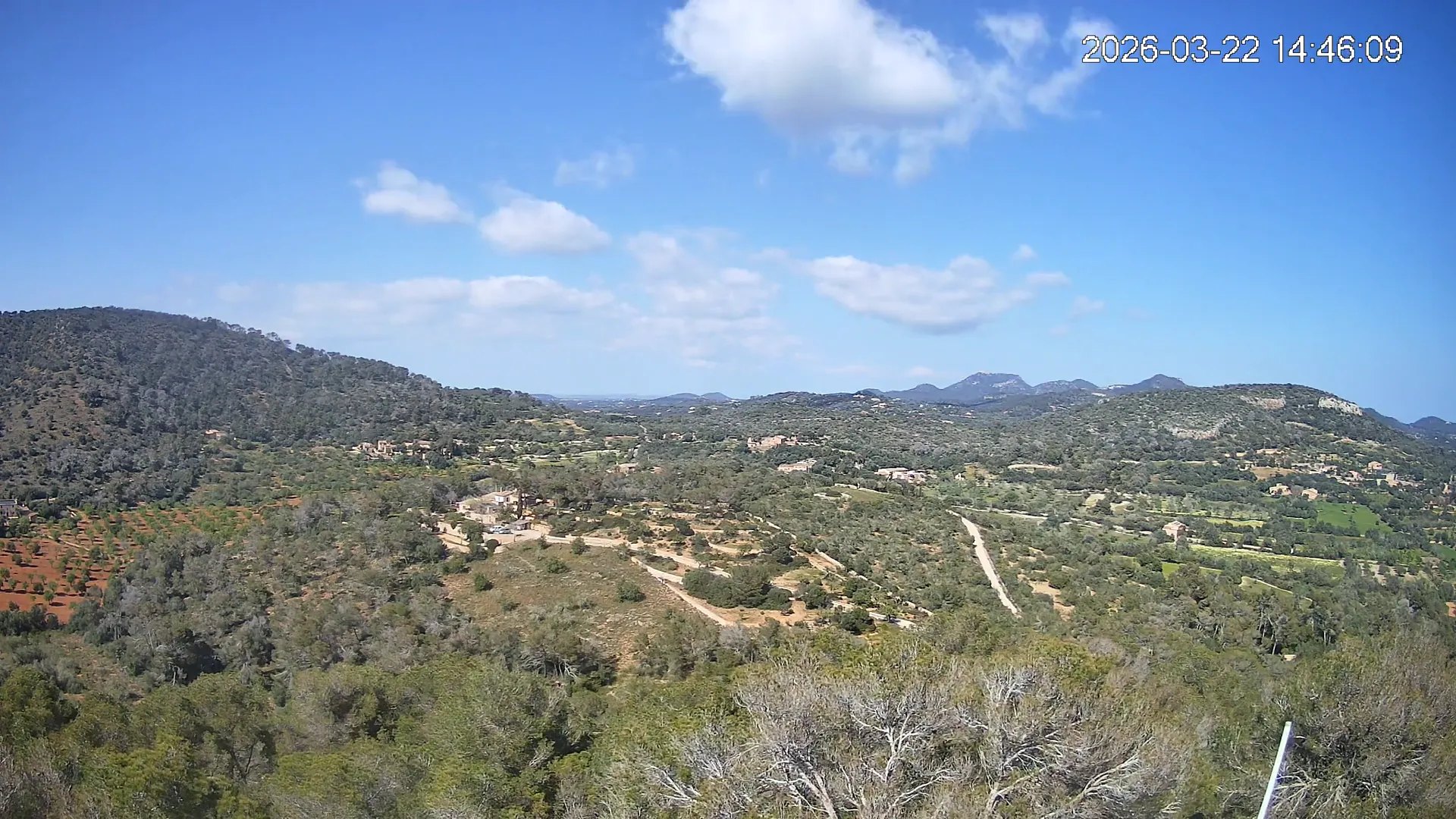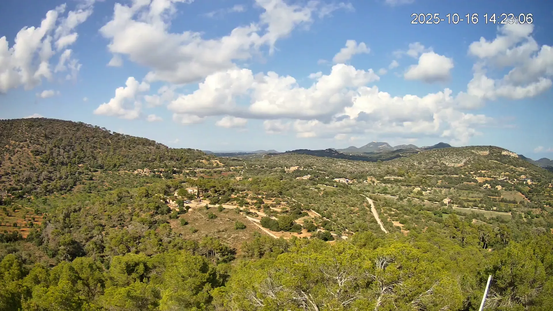 Desde la cima del Puig de Consolació, esta cámara ofrece una vista privilegiada del sureste de Mallorca. En el horizonte destacan dos de los santuarios más emblemáticos de la isla: Sant Salvador y Santueri, ambos coronando sus respectivas montañas. En los días claros, al fondo, se perfila la Serra de Llevant, completando una panorámica que une espiritualidad, paisaje y profundidad geográfica.