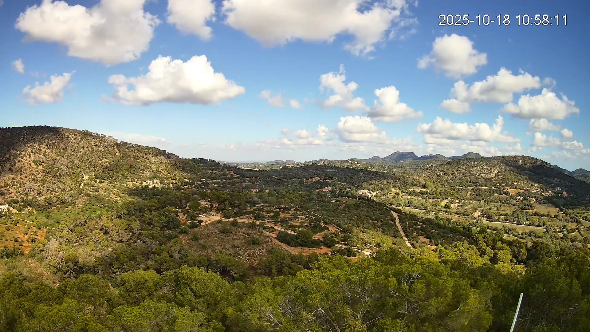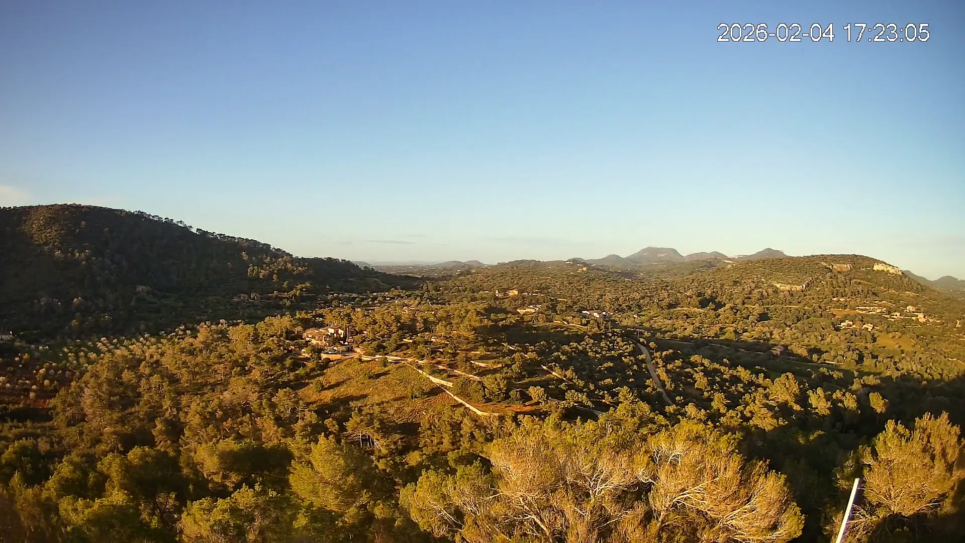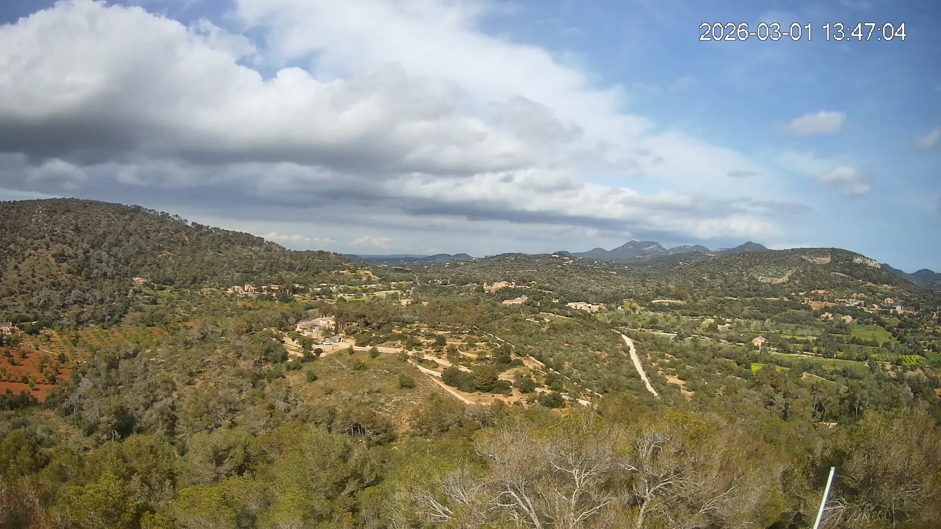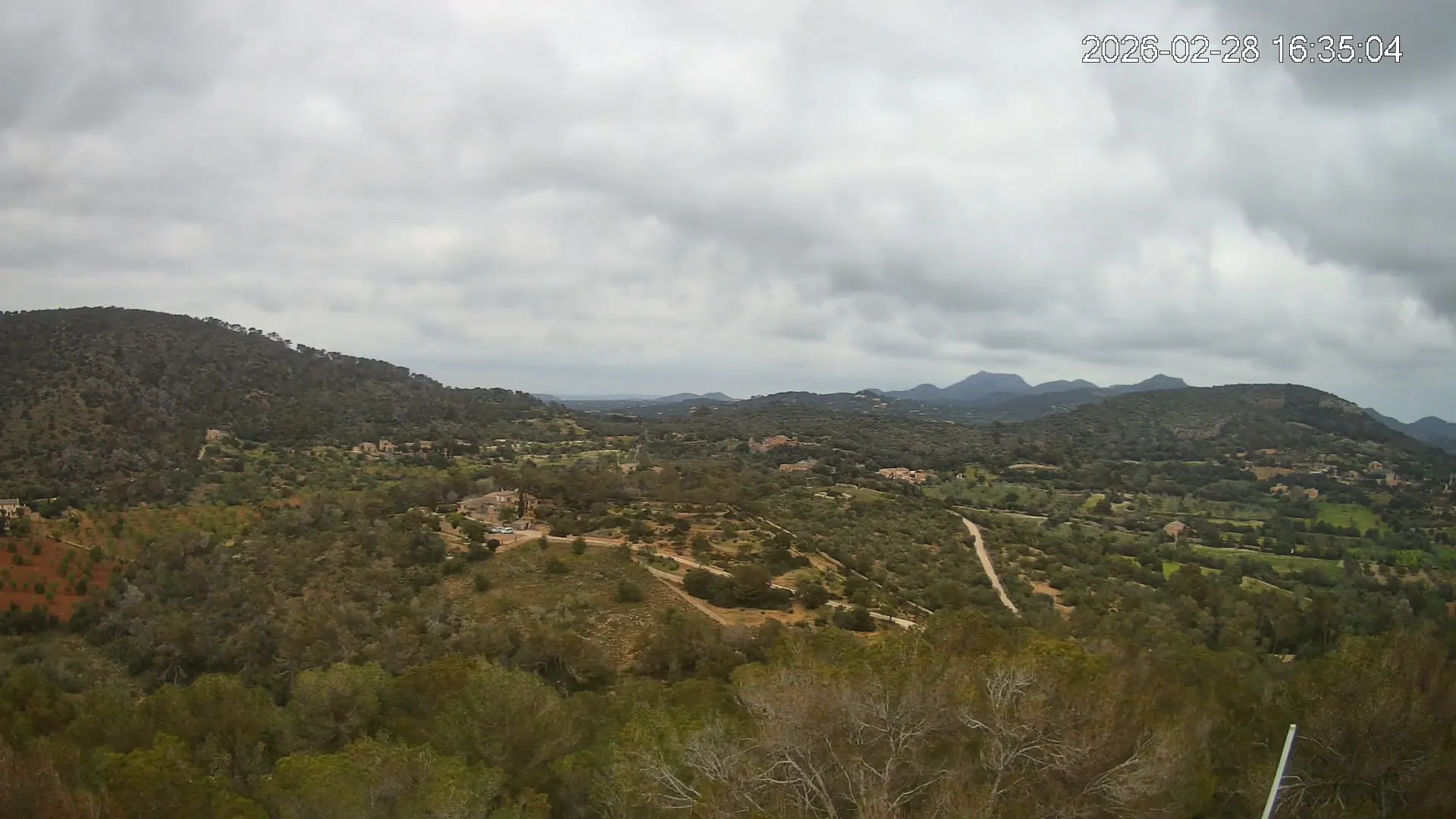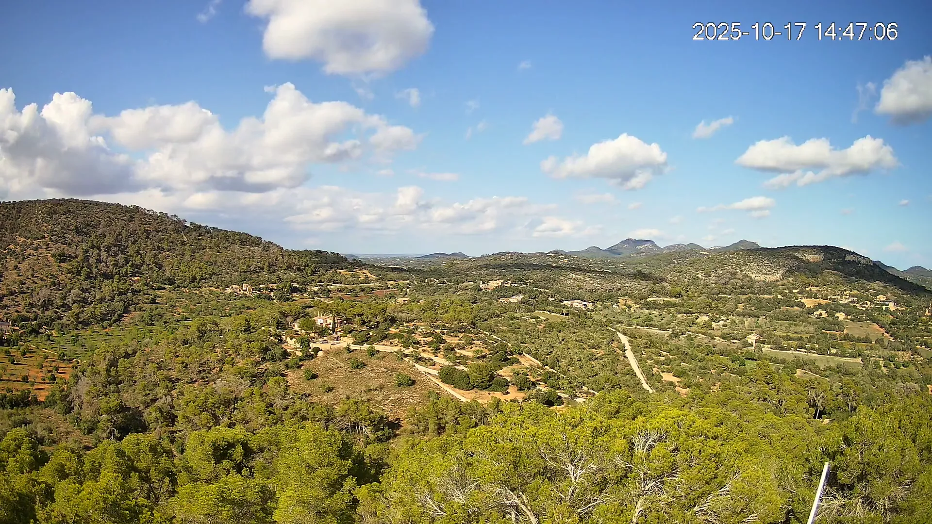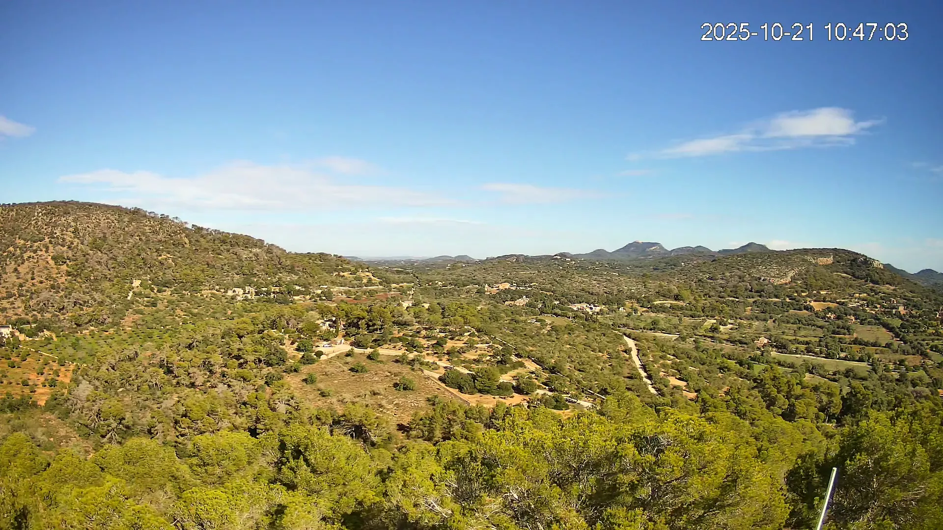 Desde la cima del Puig de Consolació, esta cámara ofrece una vista privilegiada del sureste de Mallorca. En el horizonte destacan dos de los santuarios más emblemáticos de la isla: Sant Salvador y Santueri, ambos coronando sus respectivas montañas. En los días claros, al fondo, se perfila la Serra de Llevant, completando una panorámica que une espiritualidad, paisaje y profundidad geográfica.