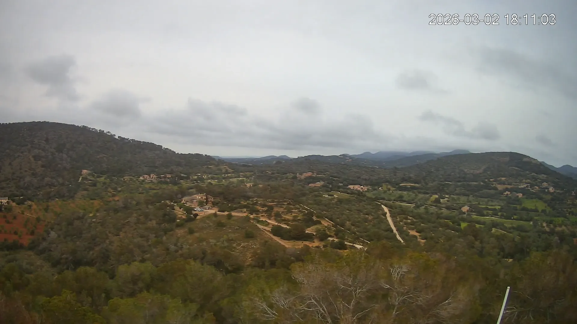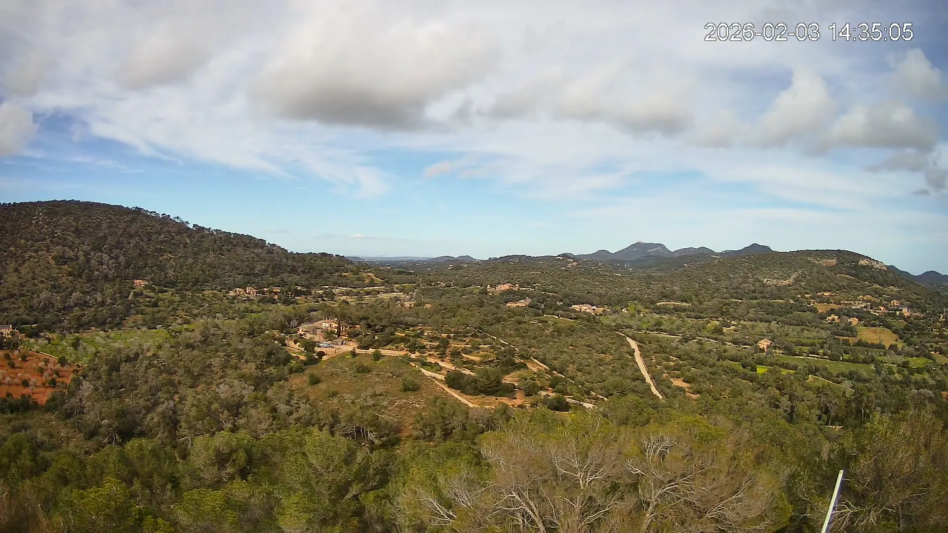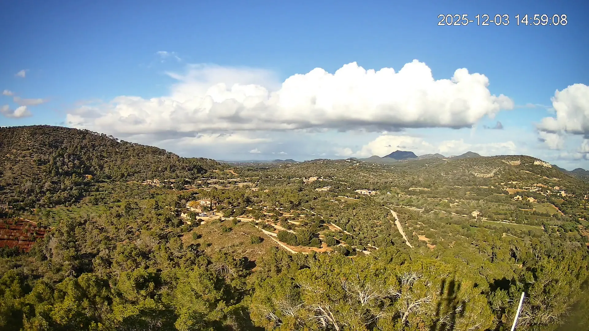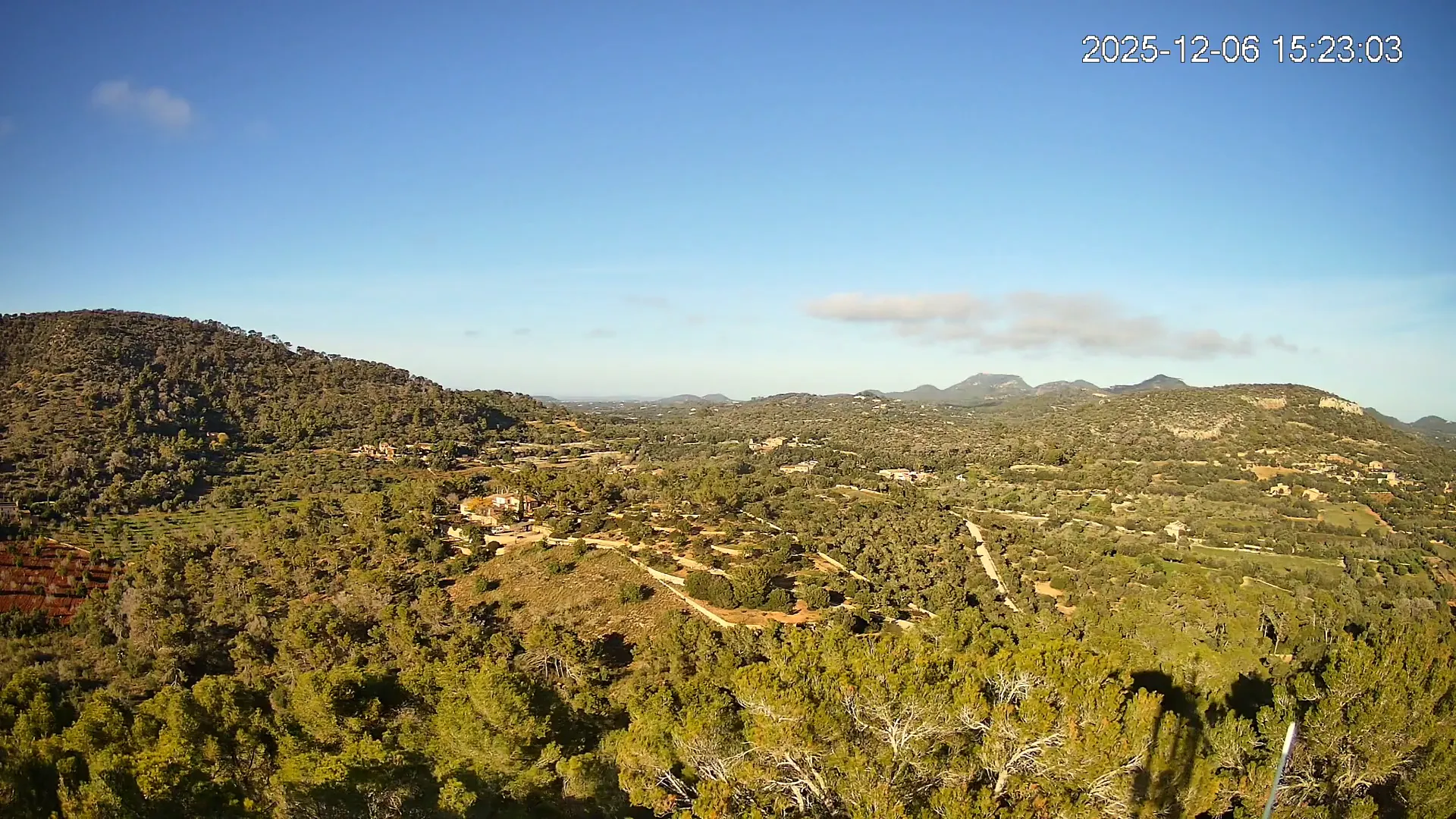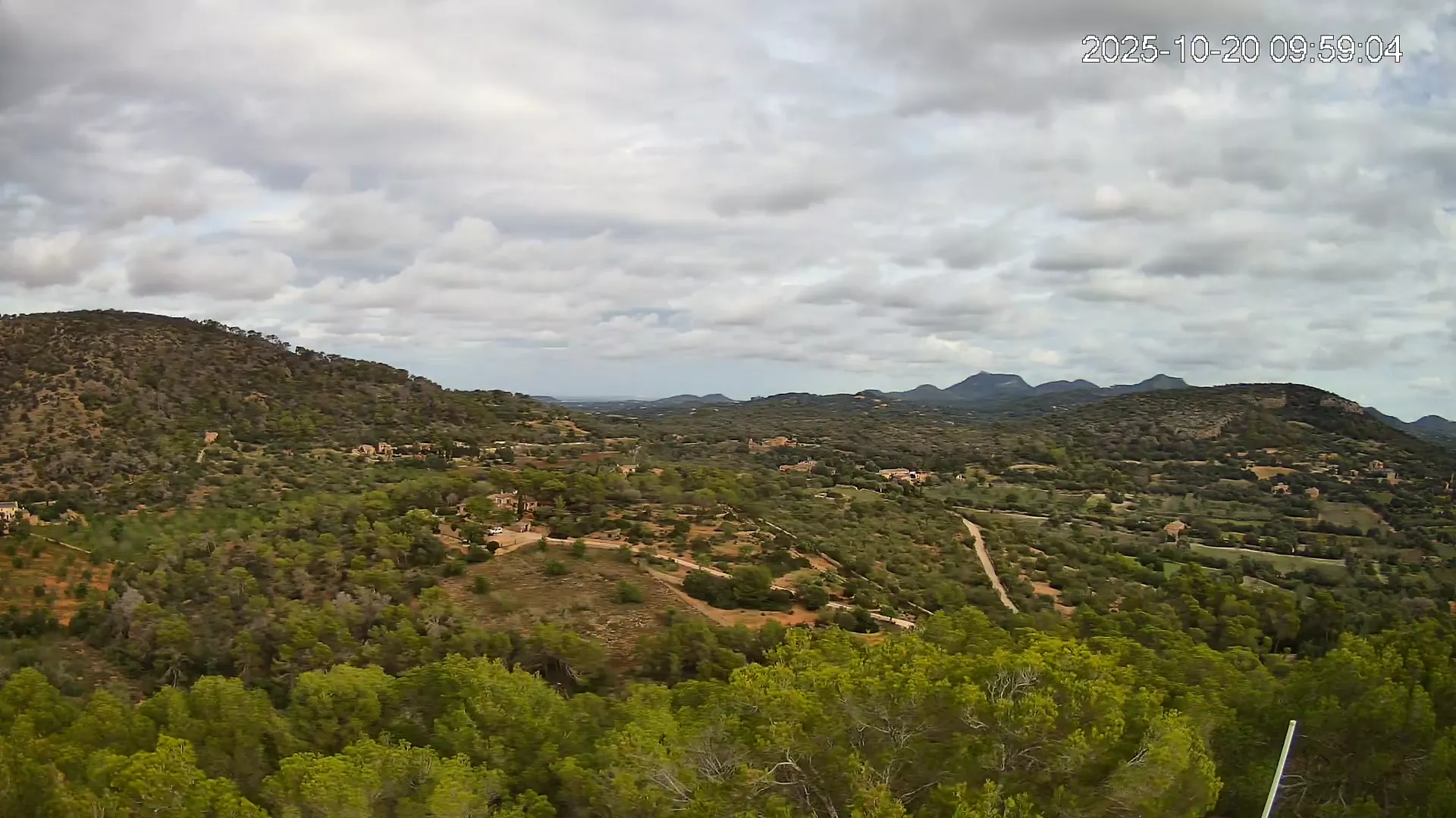 Desde la cima del Puig de Consolació, esta cámara ofrece una vista privilegiada del sureste de Mallorca. En el horizonte destacan dos de los santuarios más emblemáticos de la isla: Sant Salvador y Santueri, ambos coronando sus respectivas montañas. En los días claros, al fondo, se perfila la Serra de Llevant, completando una panorámica que une espiritualidad, paisaje y profundidad geográfica.