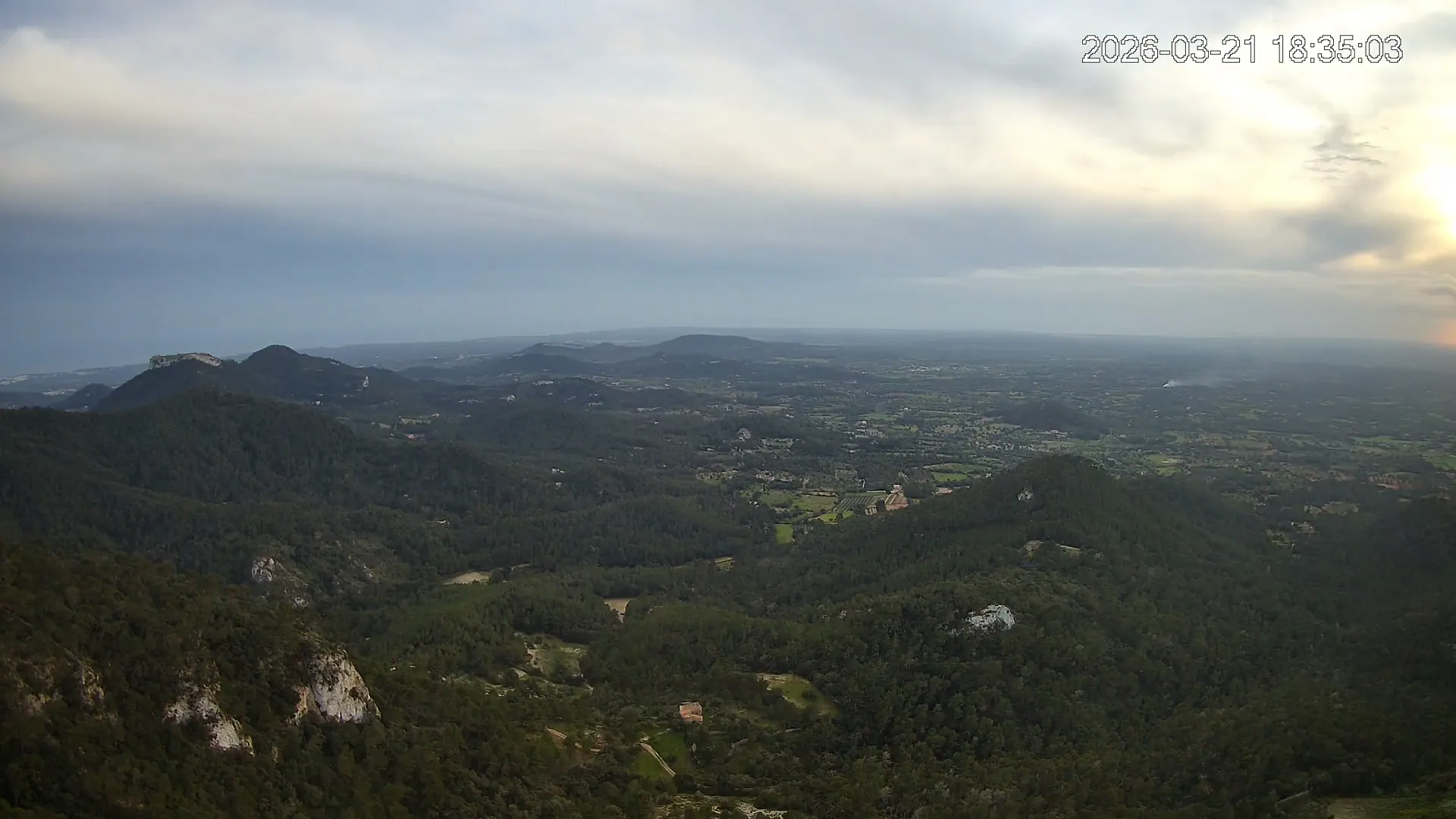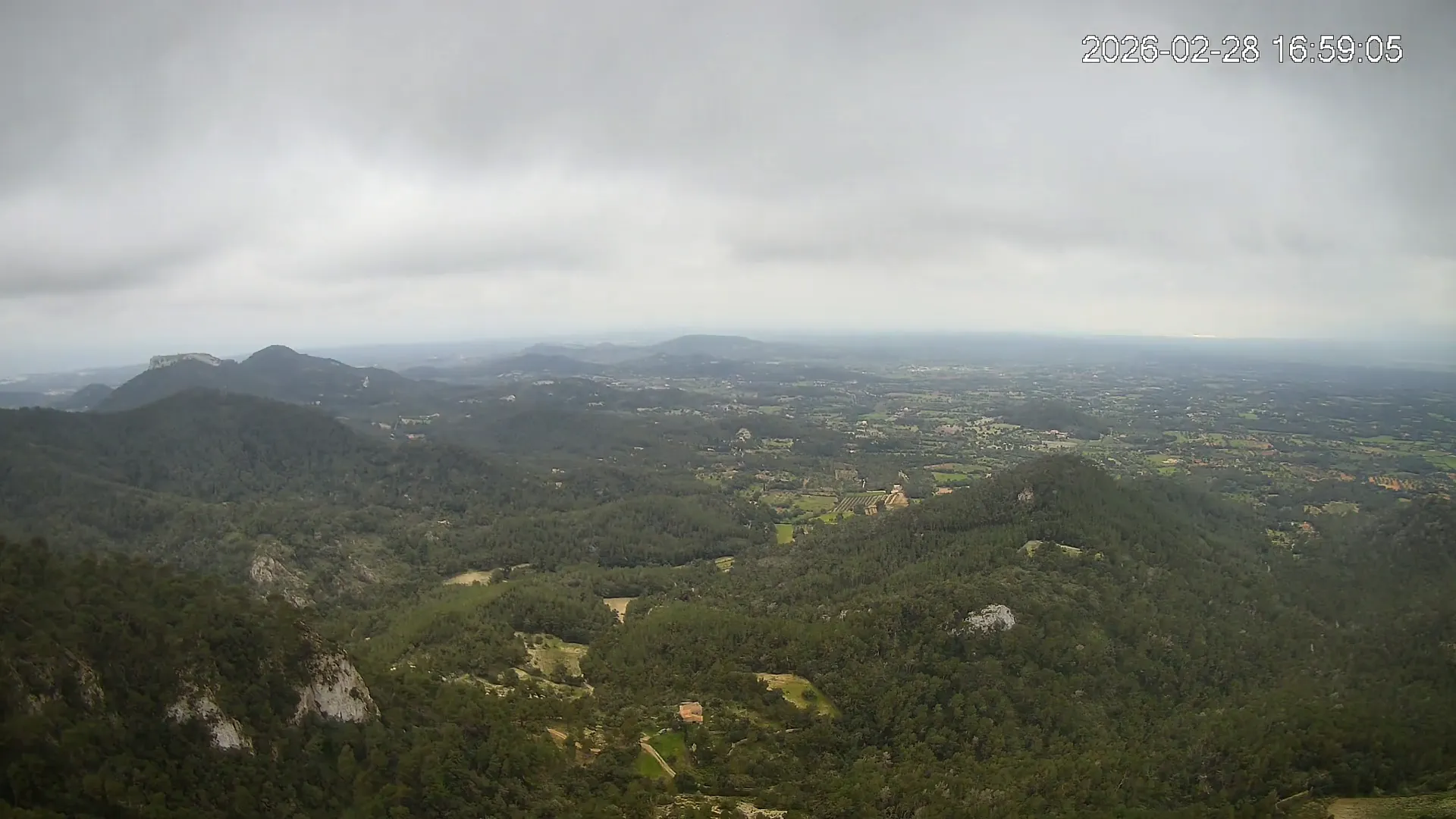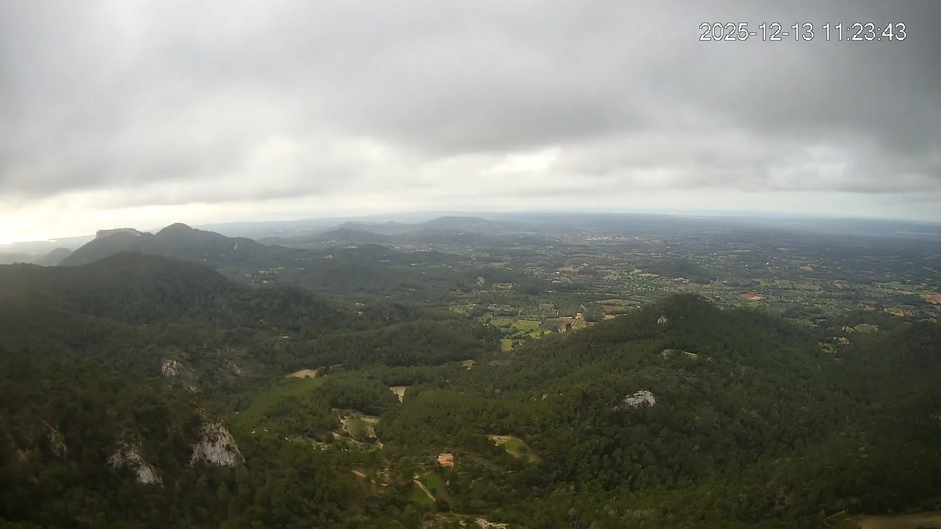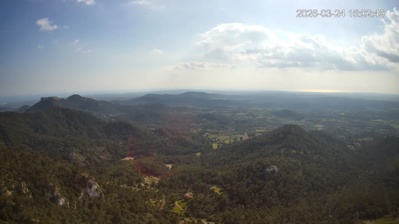 Desde lo alto del Puig de Sant Salvador, esta cámara ofrece una panorámica espectacular del sur de Mallorca. En primer plano destaca el imponente Castell de Santueri, encaramado sobre la roca, y junto a él, el Puig de s’Envestida completa el relieve montañoso. En los días despejados, el horizonte marino deja ver la silueta de Cabrera, añadiendo un toque insular a esta vista cargada de historia y belleza natural.