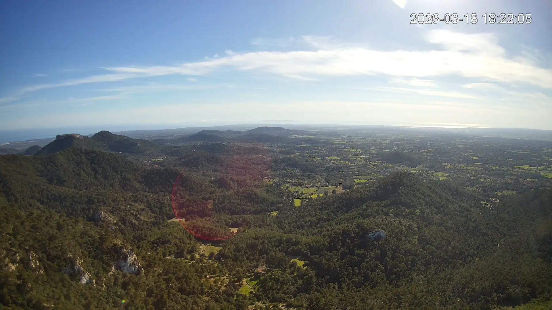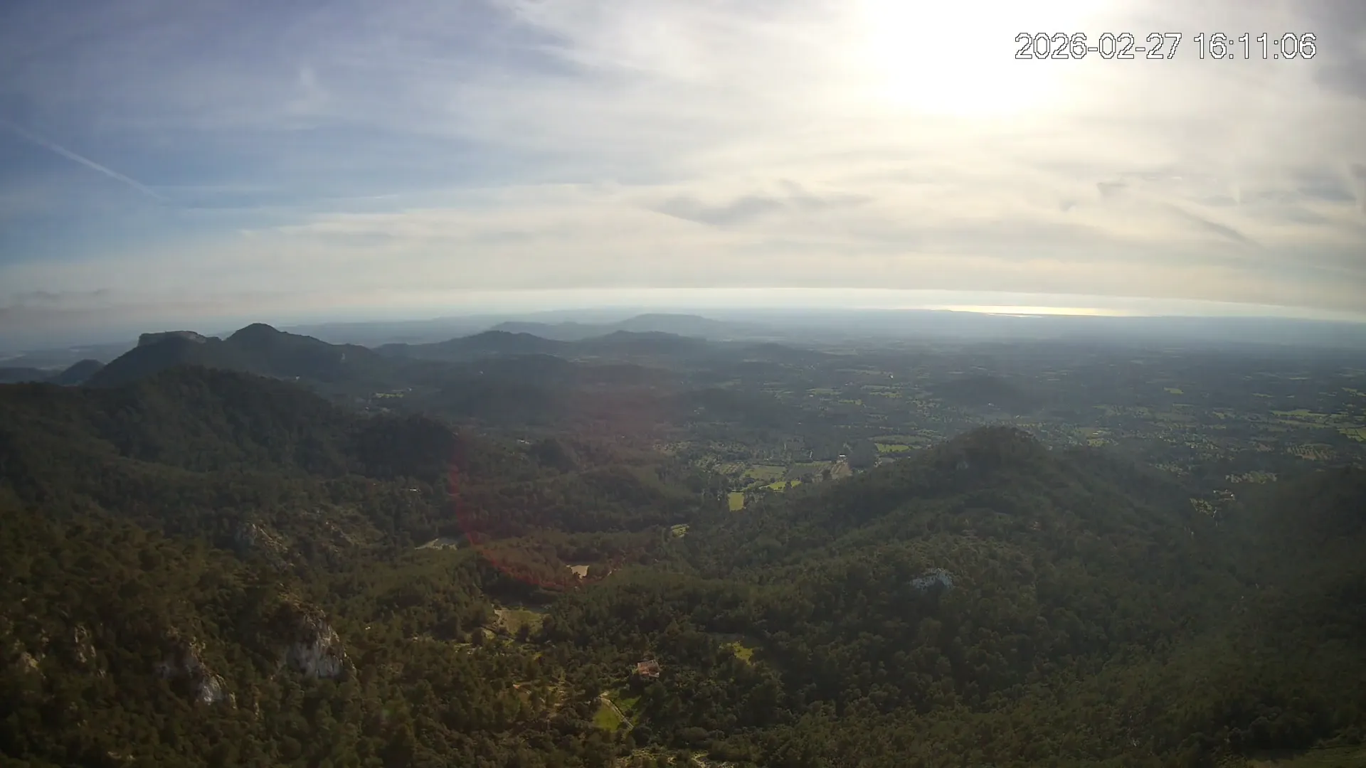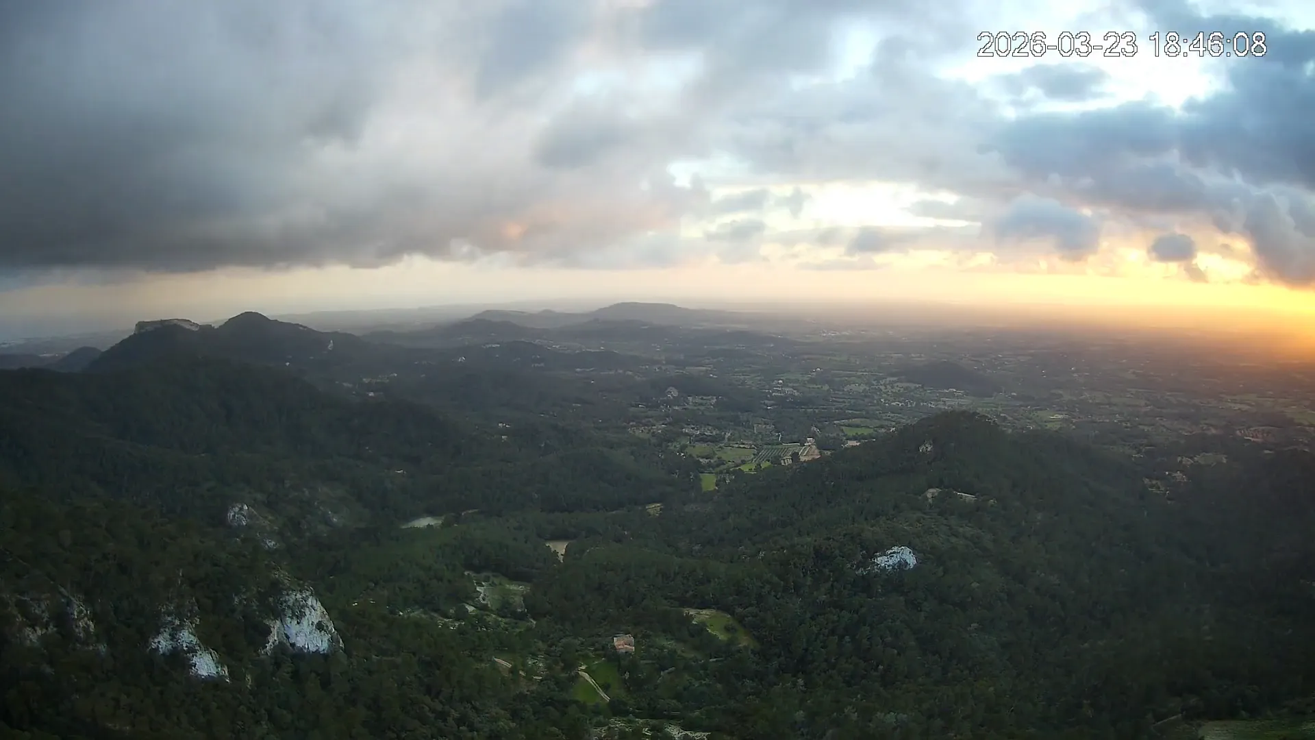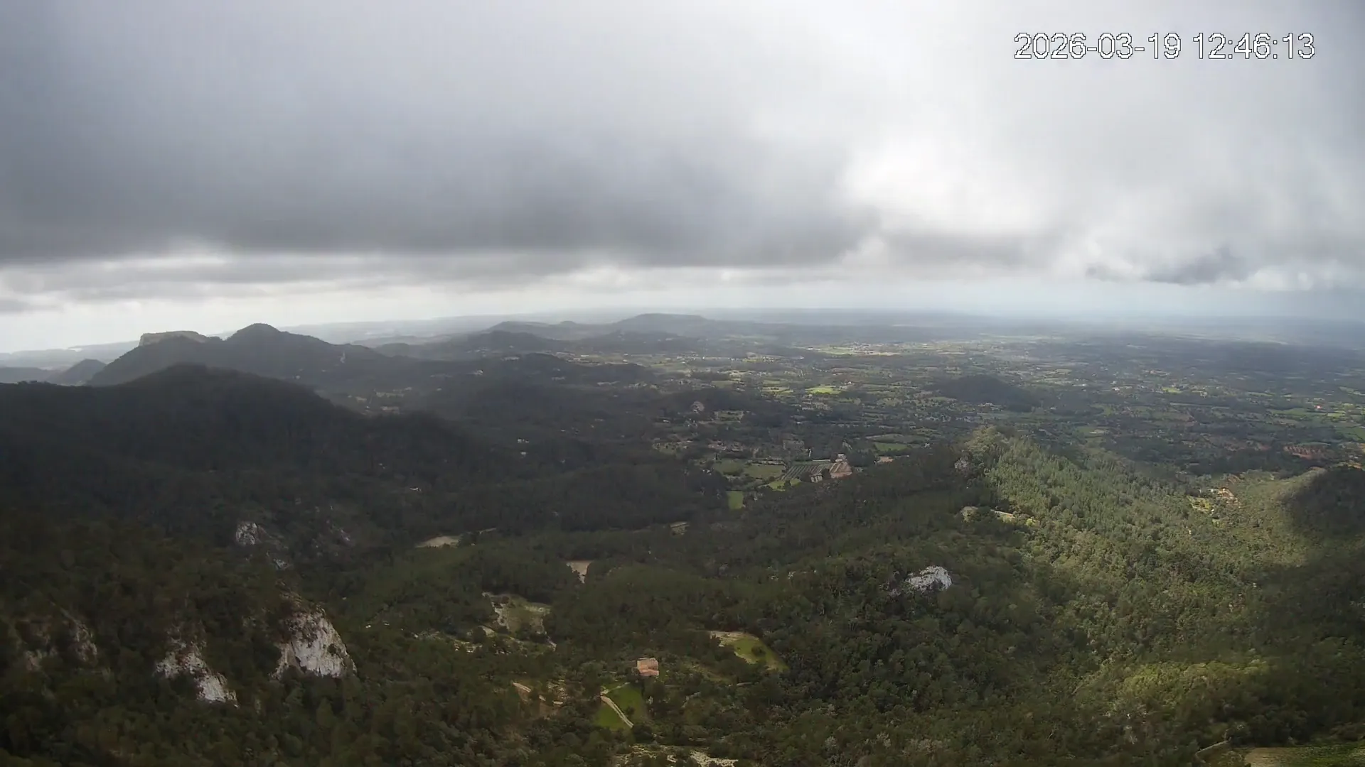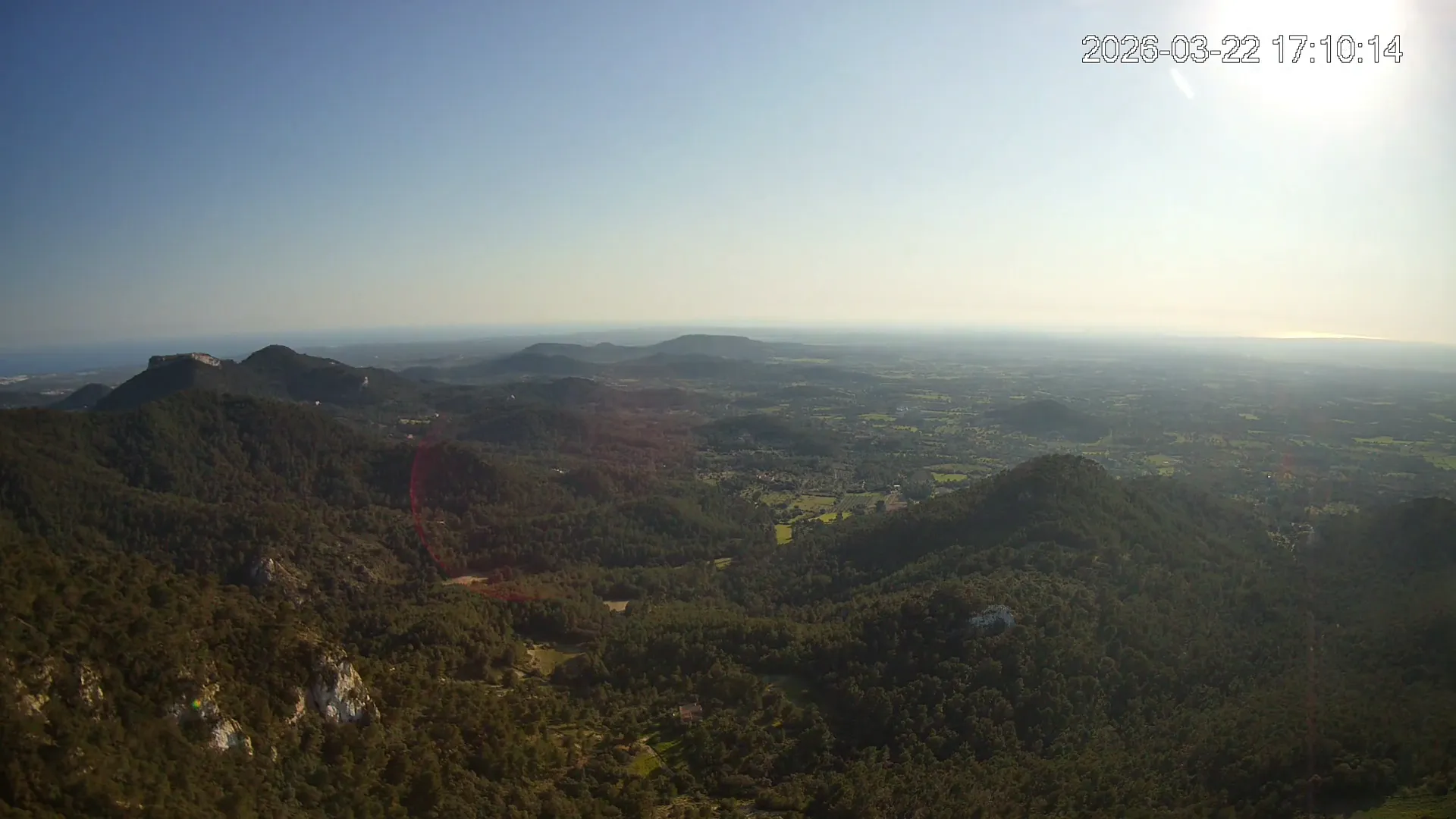 Desde lo alto del Puig de Sant Salvador, esta cámara ofrece una panorámica espectacular del sur de Mallorca. En primer plano destaca el imponente Castell de Santueri, encaramado sobre la roca, y junto a él, el Puig de s’Envestida completa el relieve montañoso. En los días despejados, el horizonte marino deja ver la silueta de Cabrera, añadiendo un toque insular a esta vista cargada de historia y belleza natural.