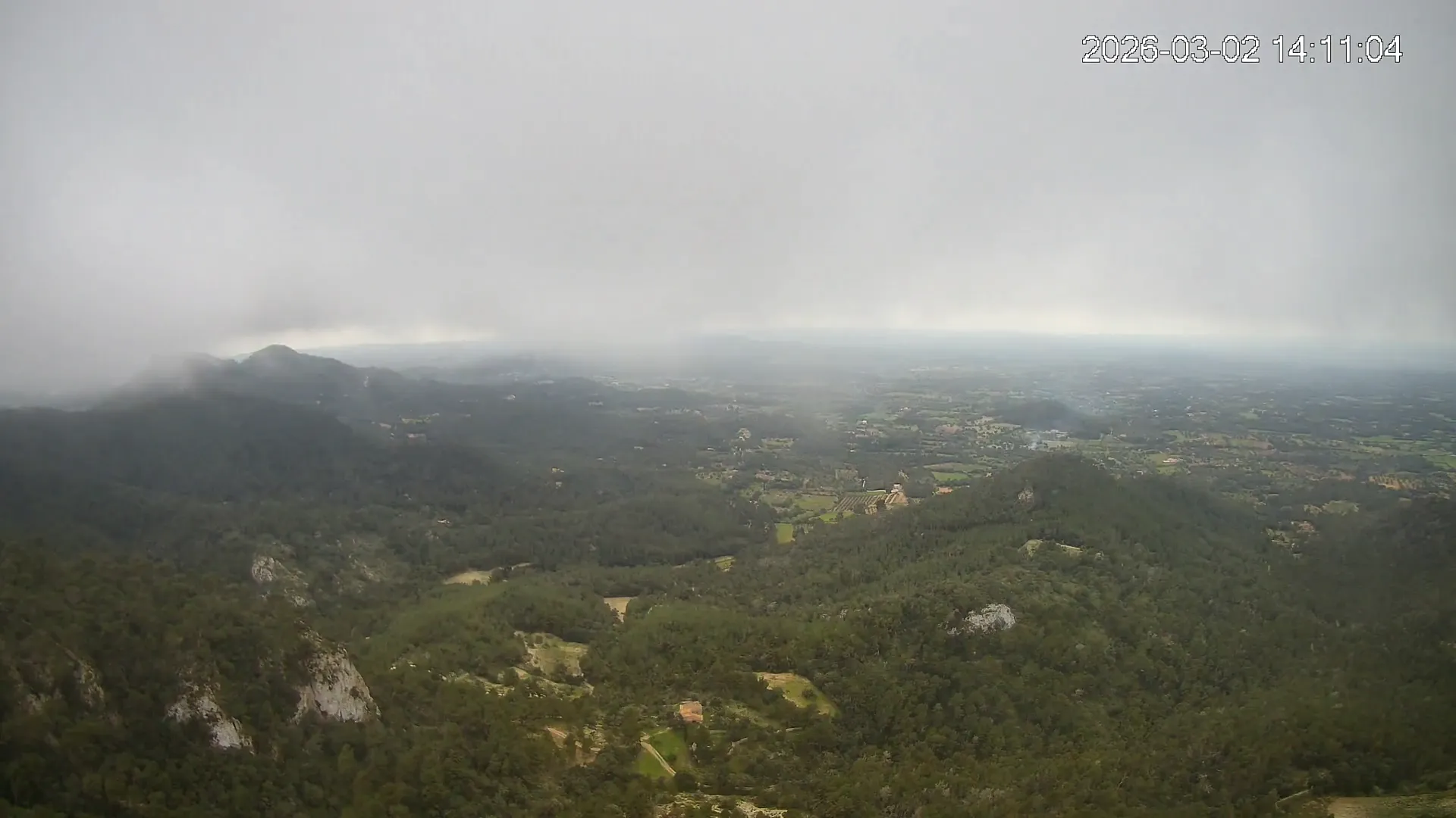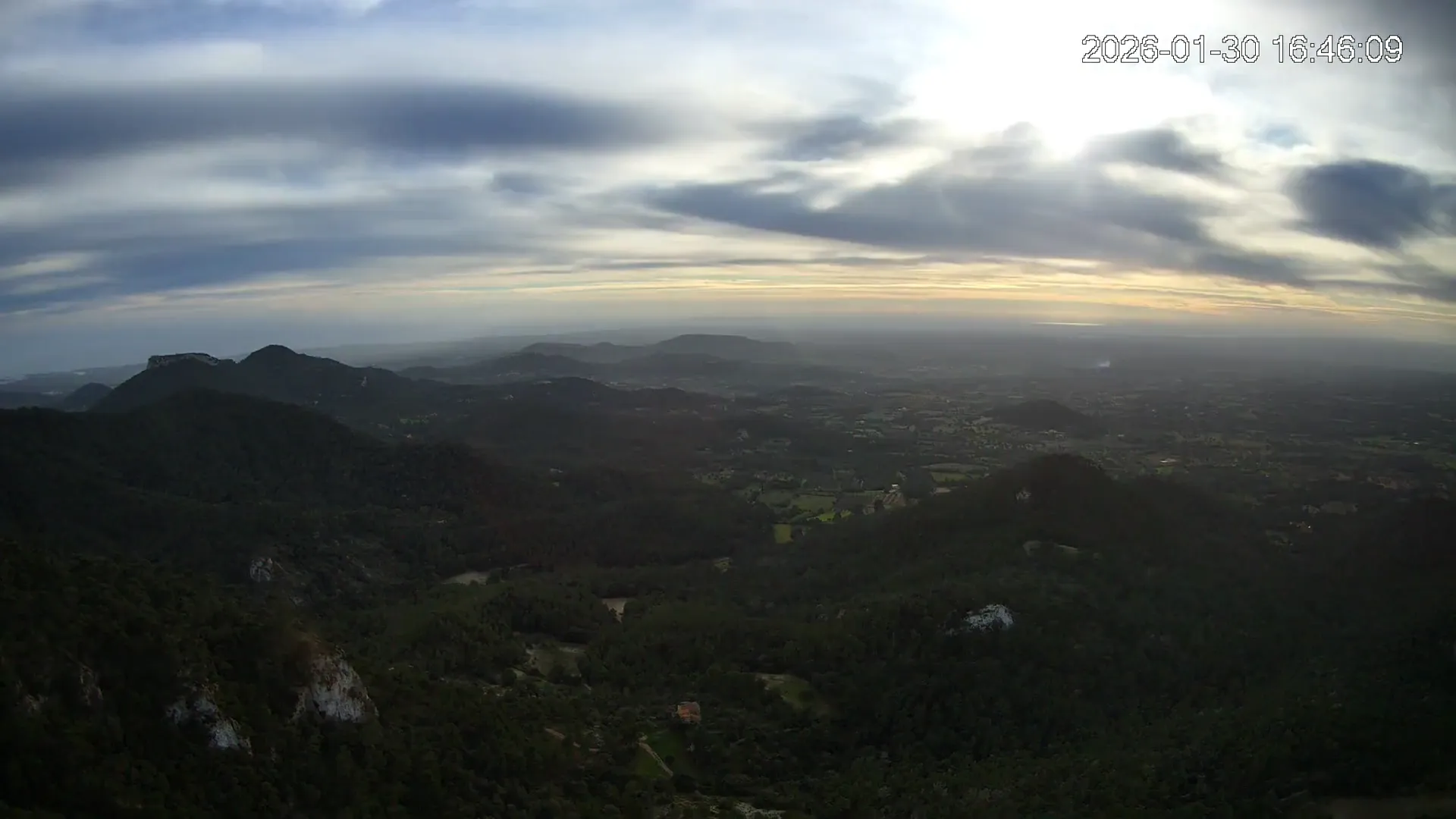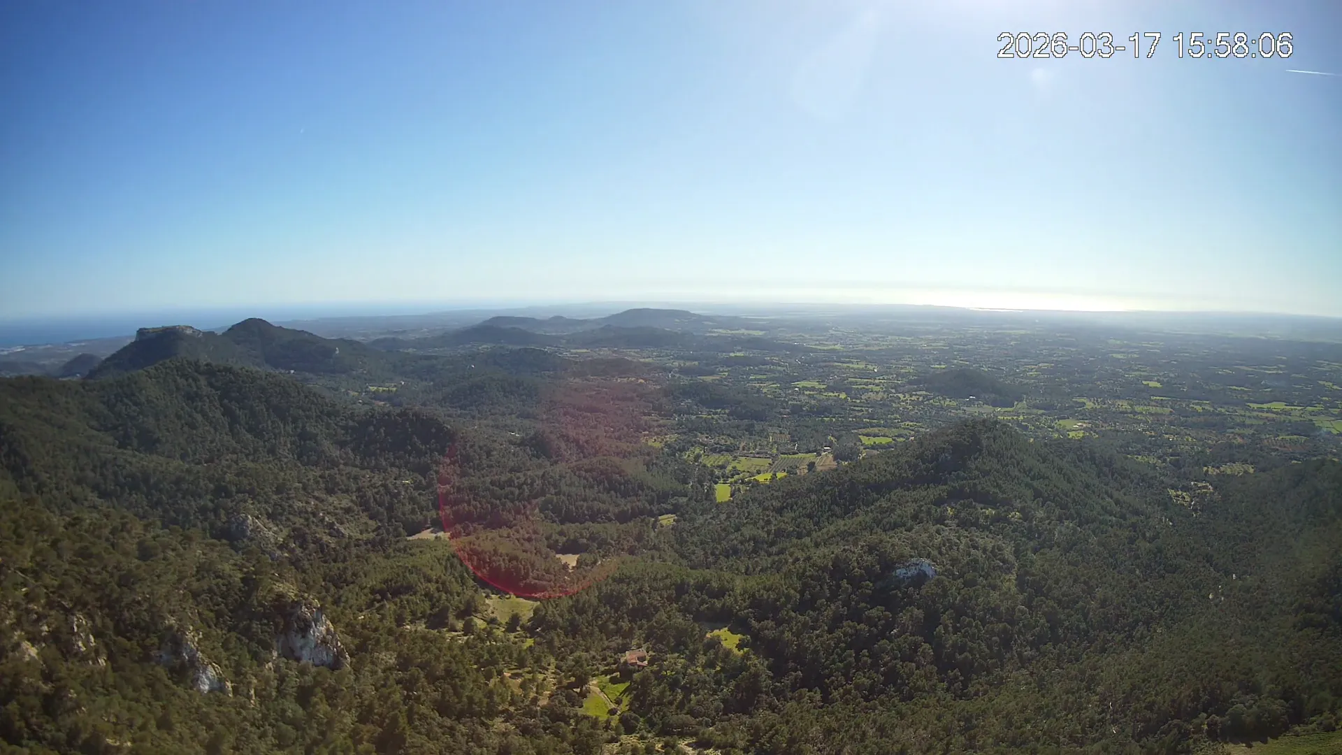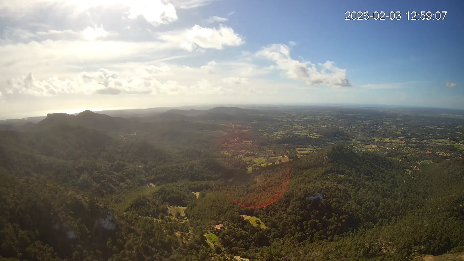 Desde lo alto del Puig de Sant Salvador, esta cámara ofrece una panorámica espectacular del sur de Mallorca. En primer plano destaca el imponente Castell de Santueri, encaramado sobre la roca, y junto a él, el Puig de s’Envestida completa el relieve montañoso. En los días despejados, el horizonte marino deja ver la silueta de Cabrera, añadiendo un toque insular a esta vista cargada de historia y belleza natural.