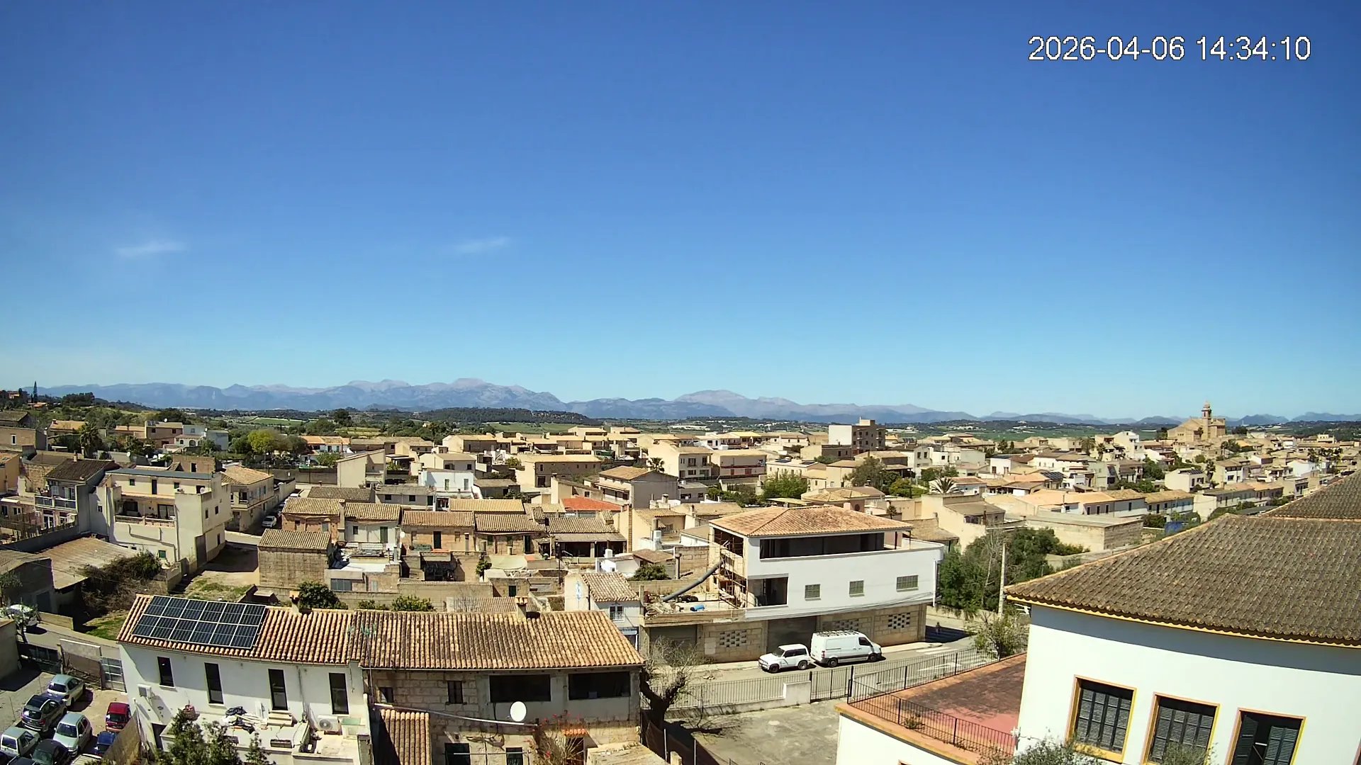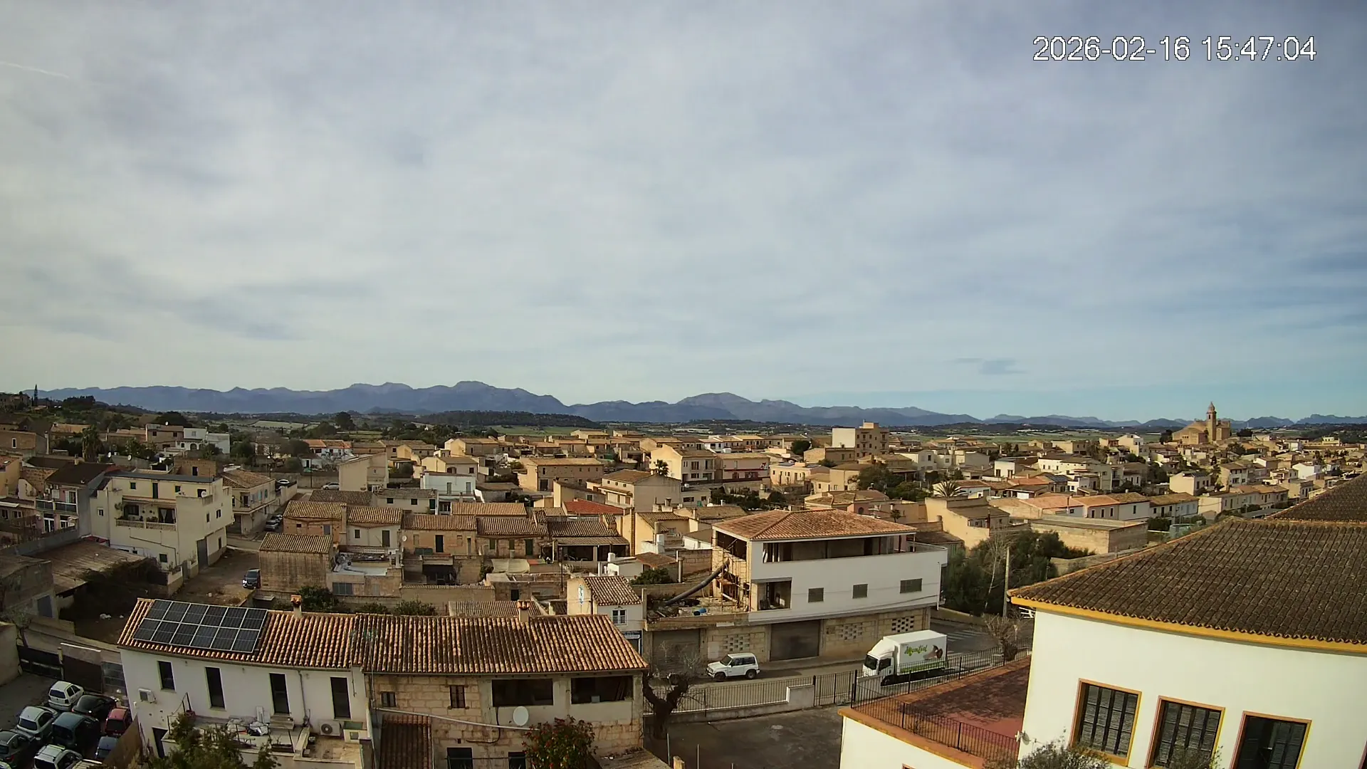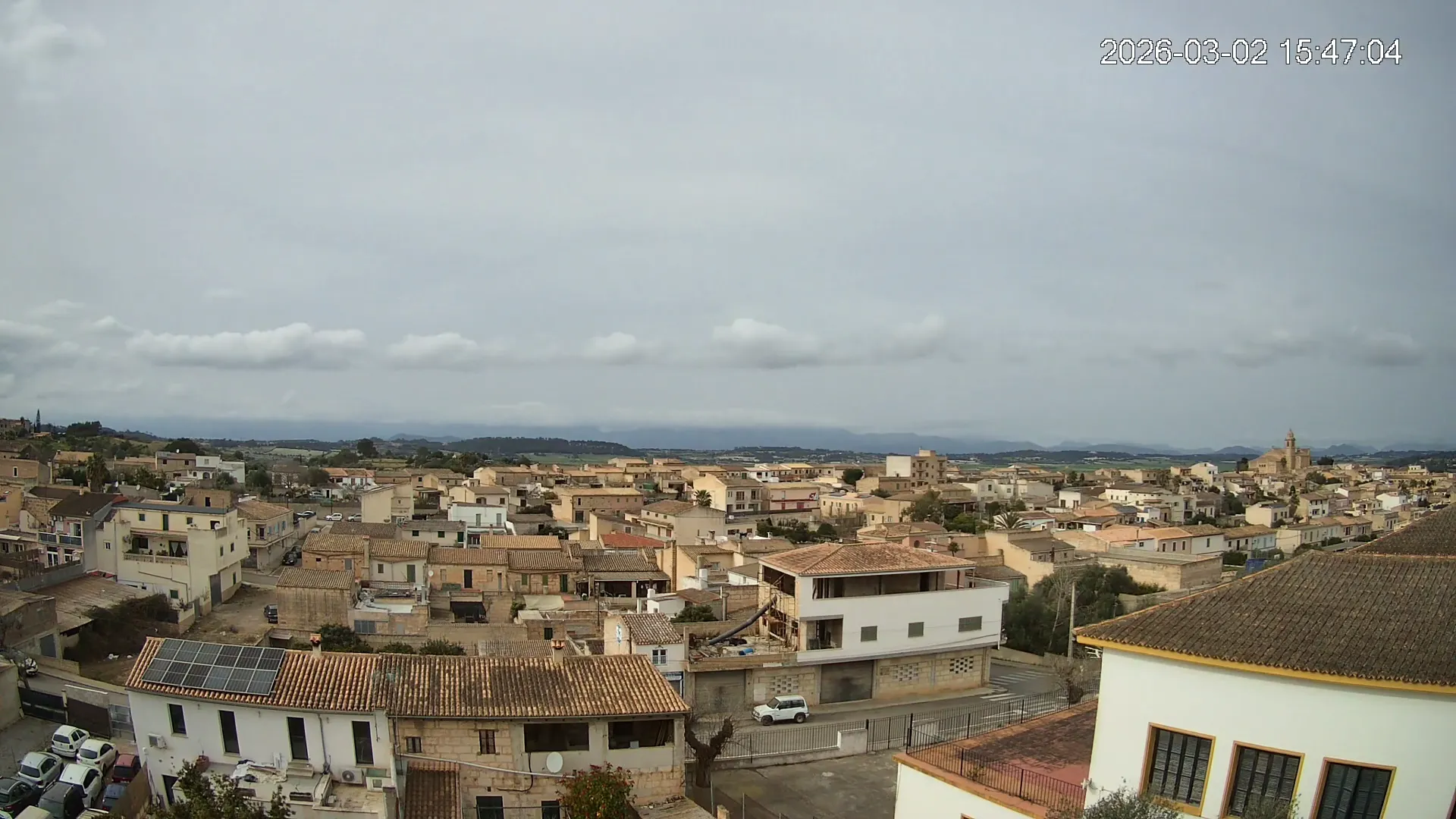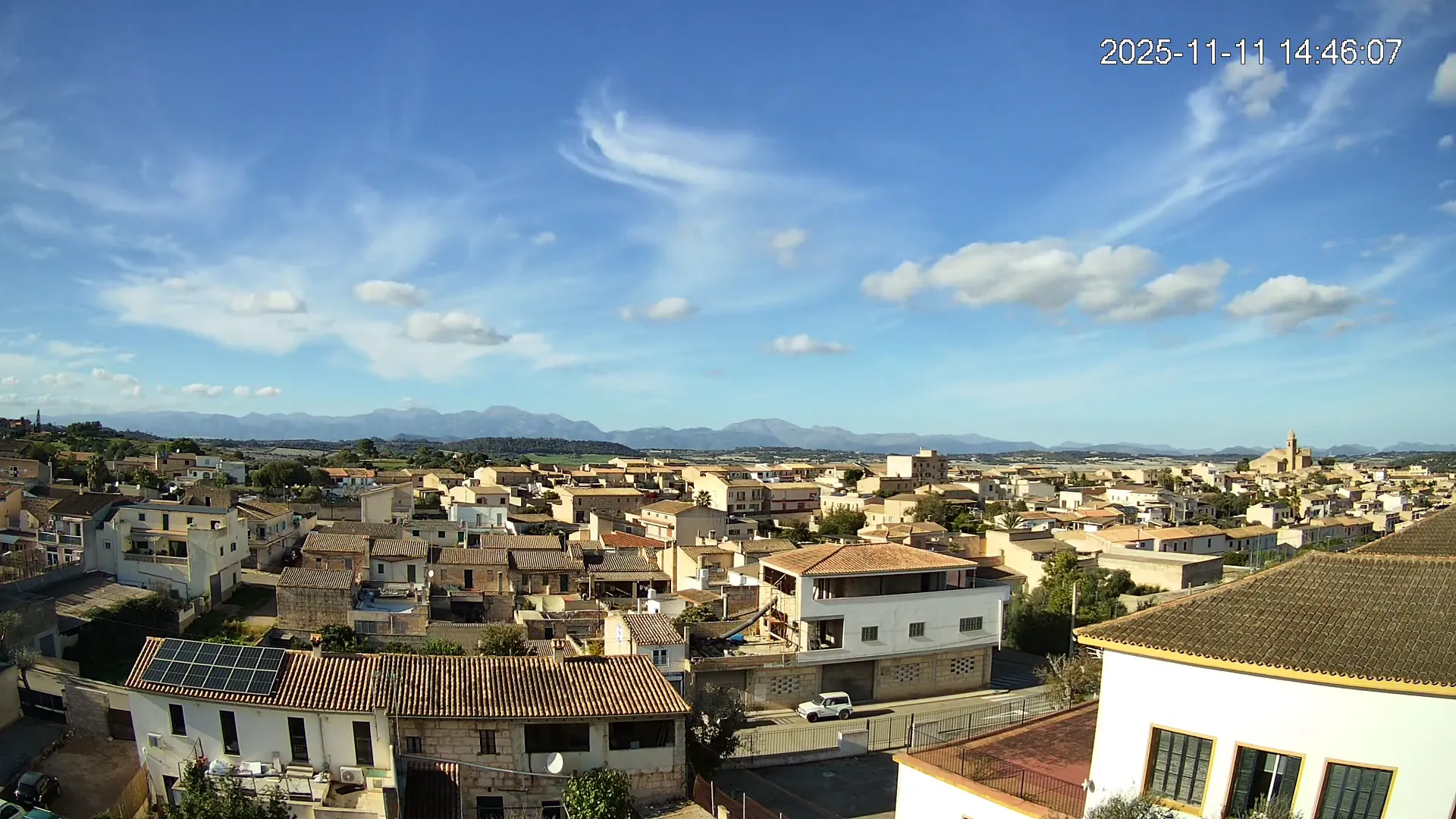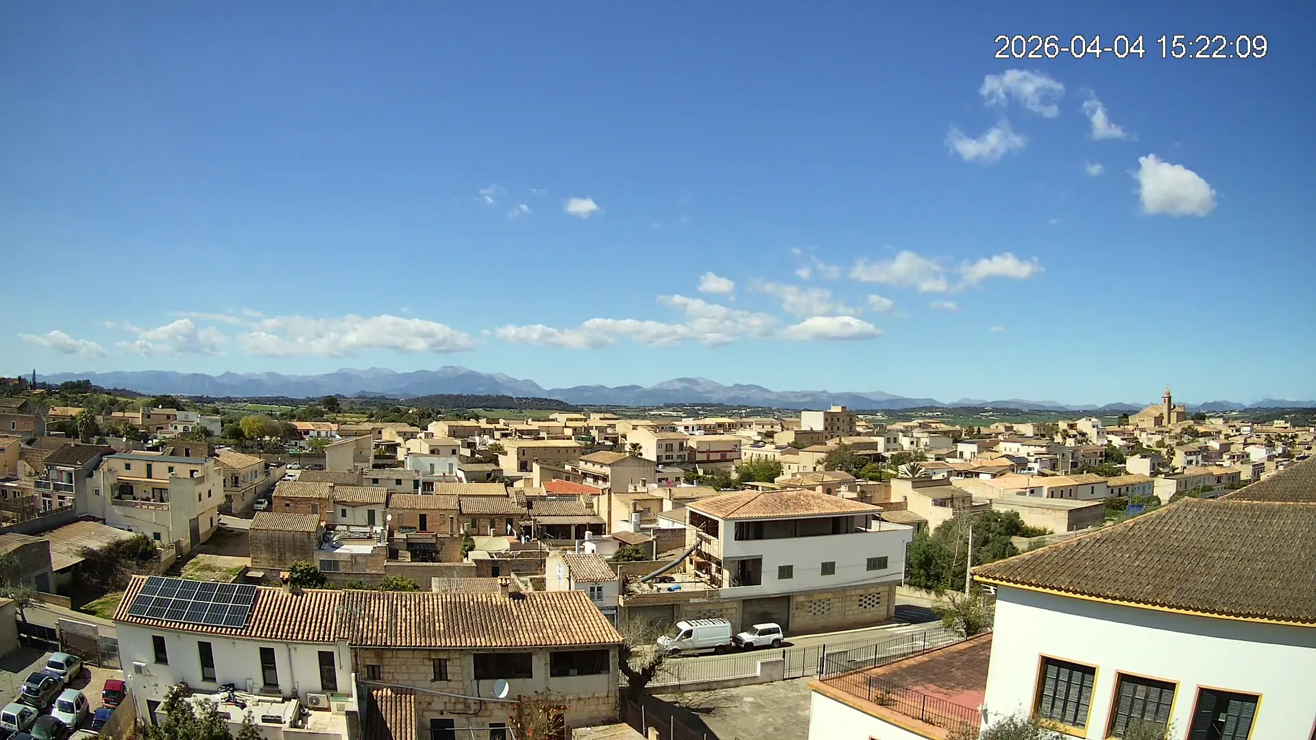 Ubicada en el núcleo de Maria de la Salut, esta cámara ofrece una vista centrada en el entramado urbano del pueblo, con sus tejados de teja árabe, calles tranquilas y construcciones tradicionales. Al fondo, domina el paisaje la Serra de Tramuntana, que se eleva imponente sobre el horizonte y añade un contraste montañoso a esta imagen típica del interior de Mallorca.