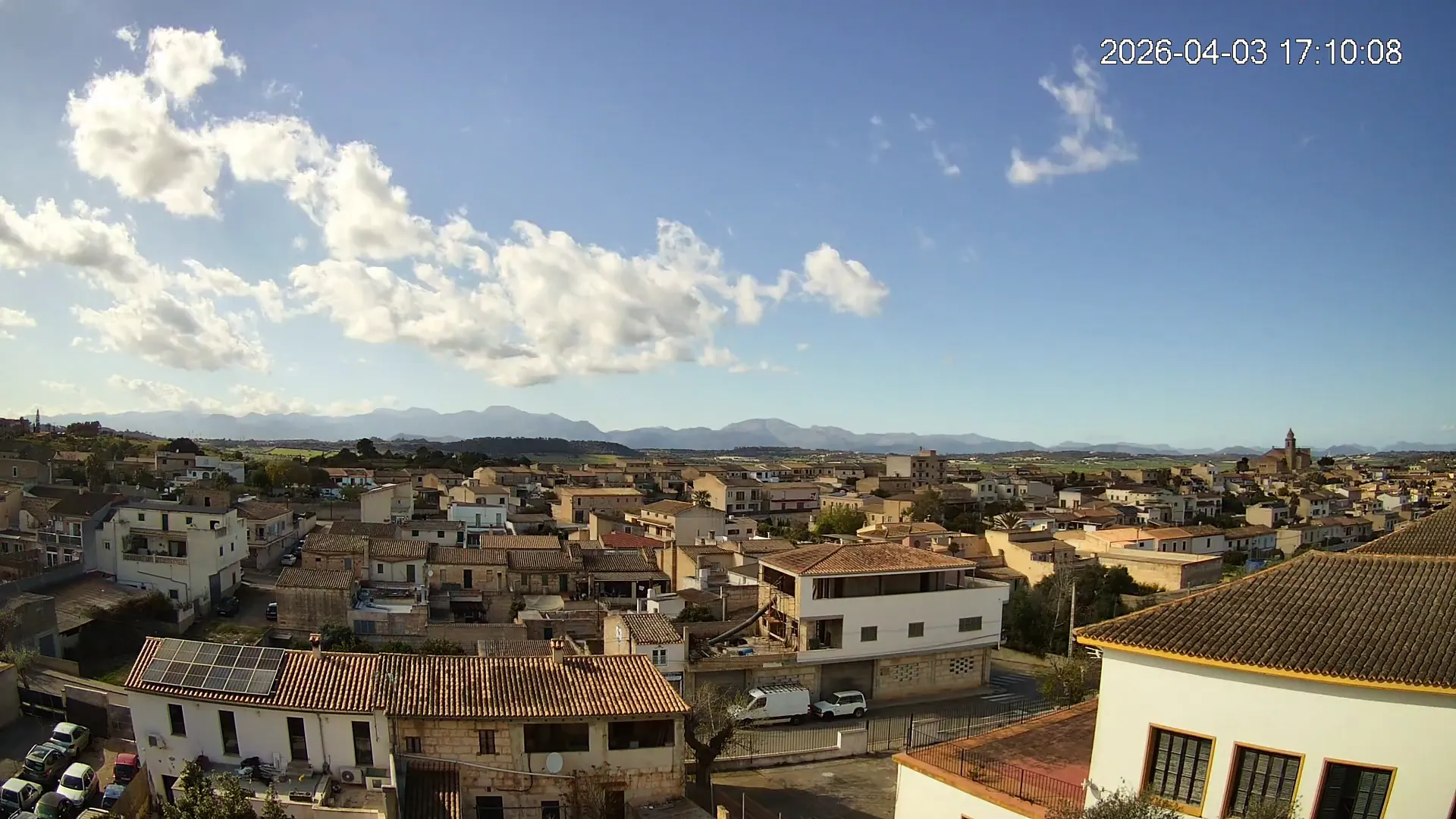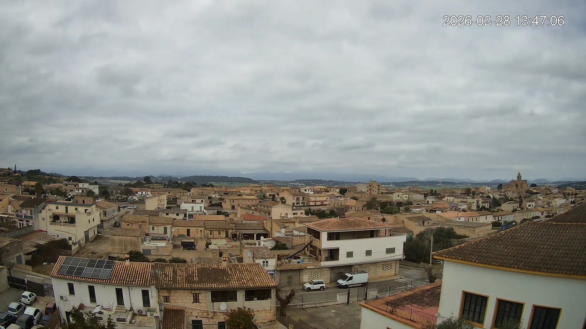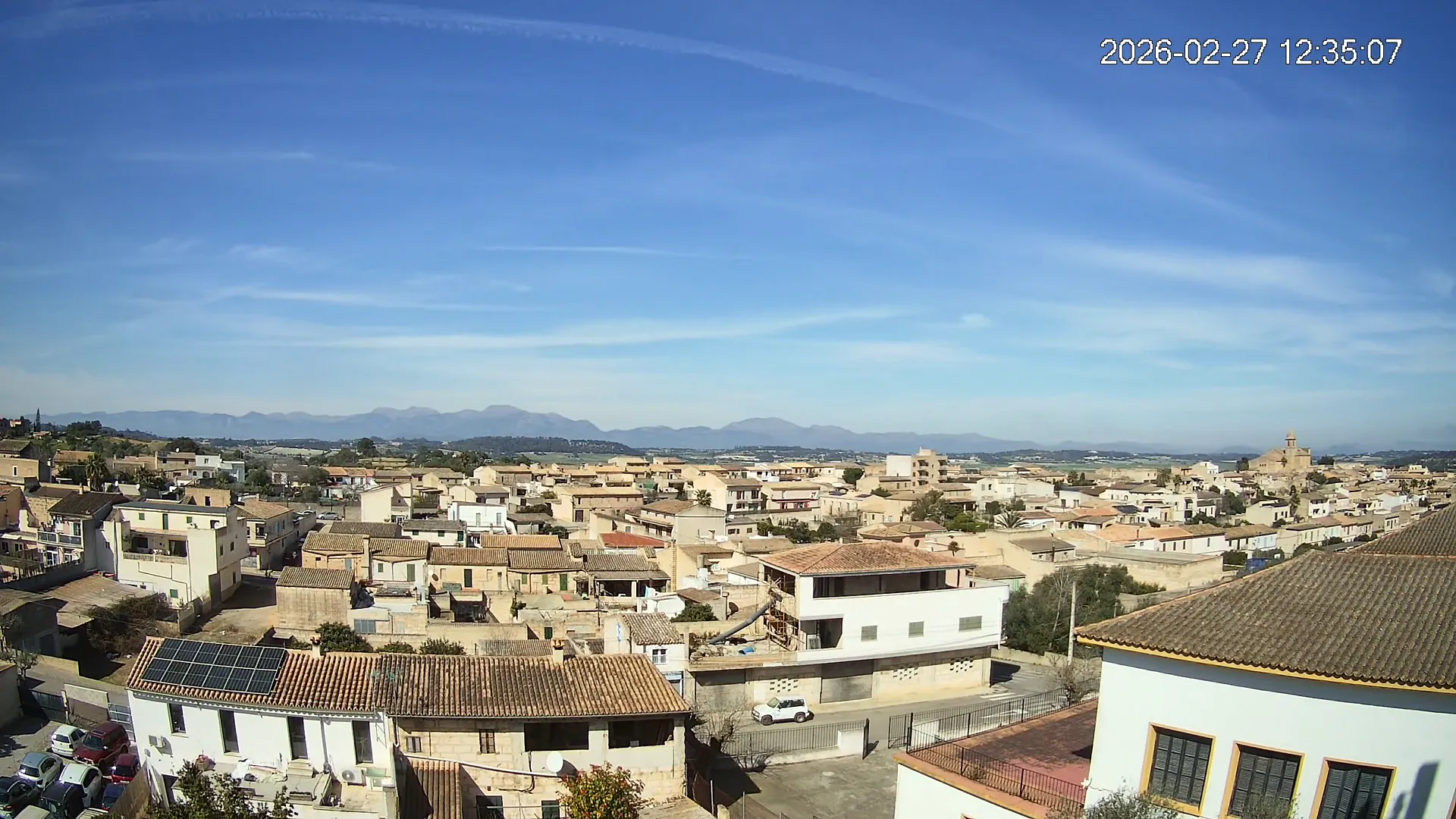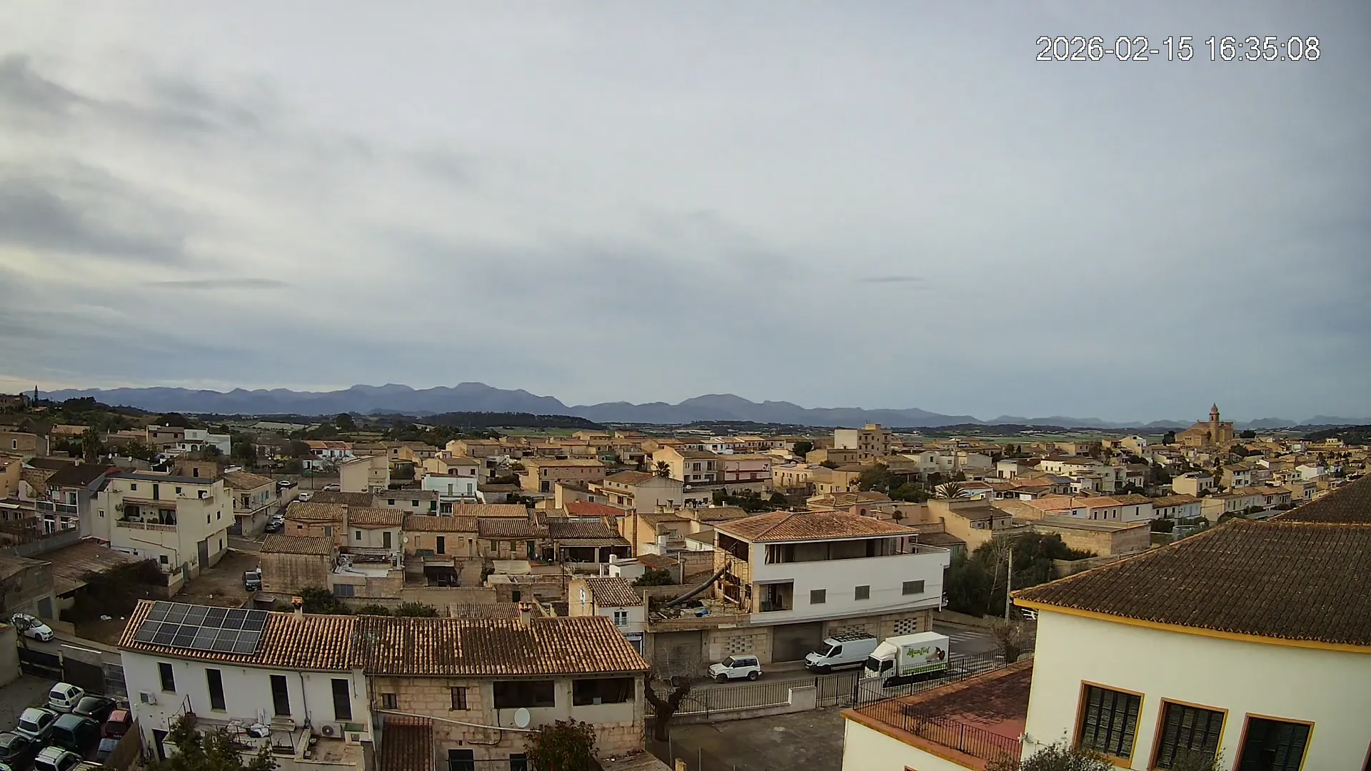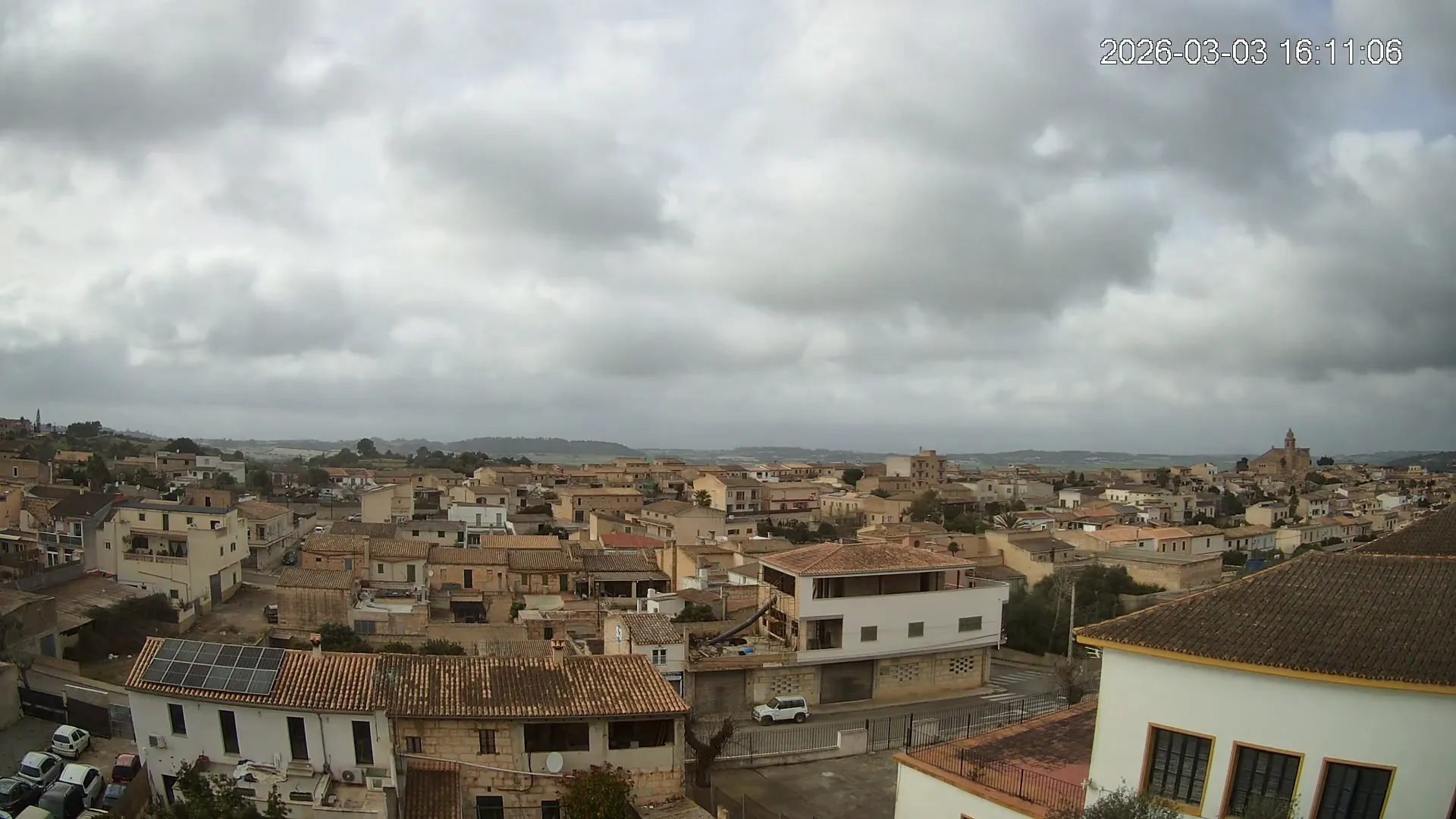 Ubicada en el núcleo de Maria de la Salut, esta cámara ofrece una vista centrada en el entramado urbano del pueblo, con sus tejados de teja árabe, calles tranquilas y construcciones tradicionales. Al fondo, domina el paisaje la Serra de Tramuntana, que se eleva imponente sobre el horizonte y añade un contraste montañoso a esta imagen típica del interior de Mallorca.