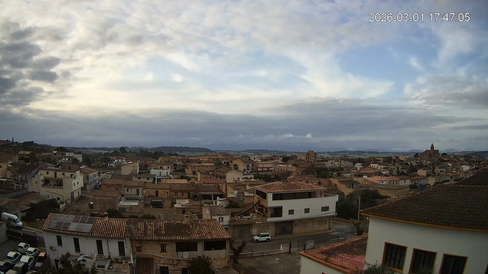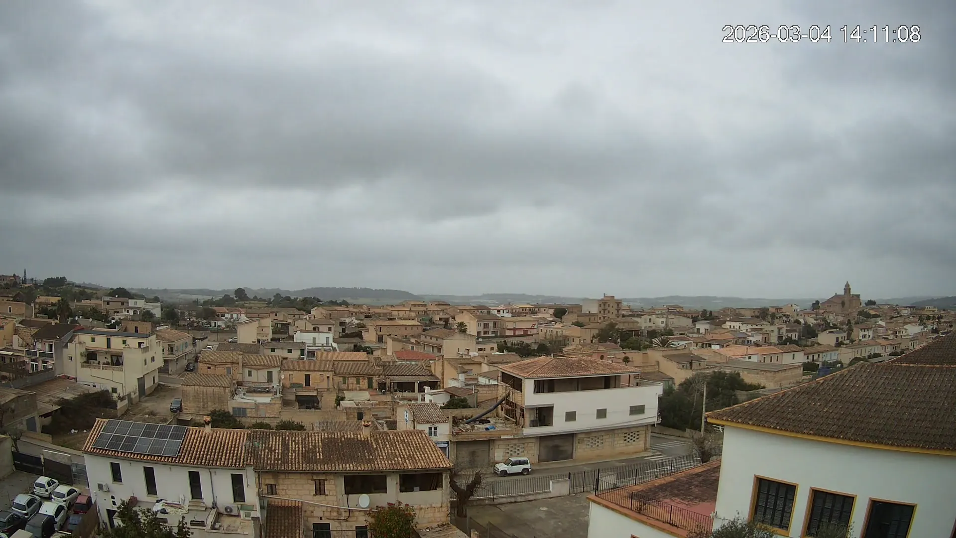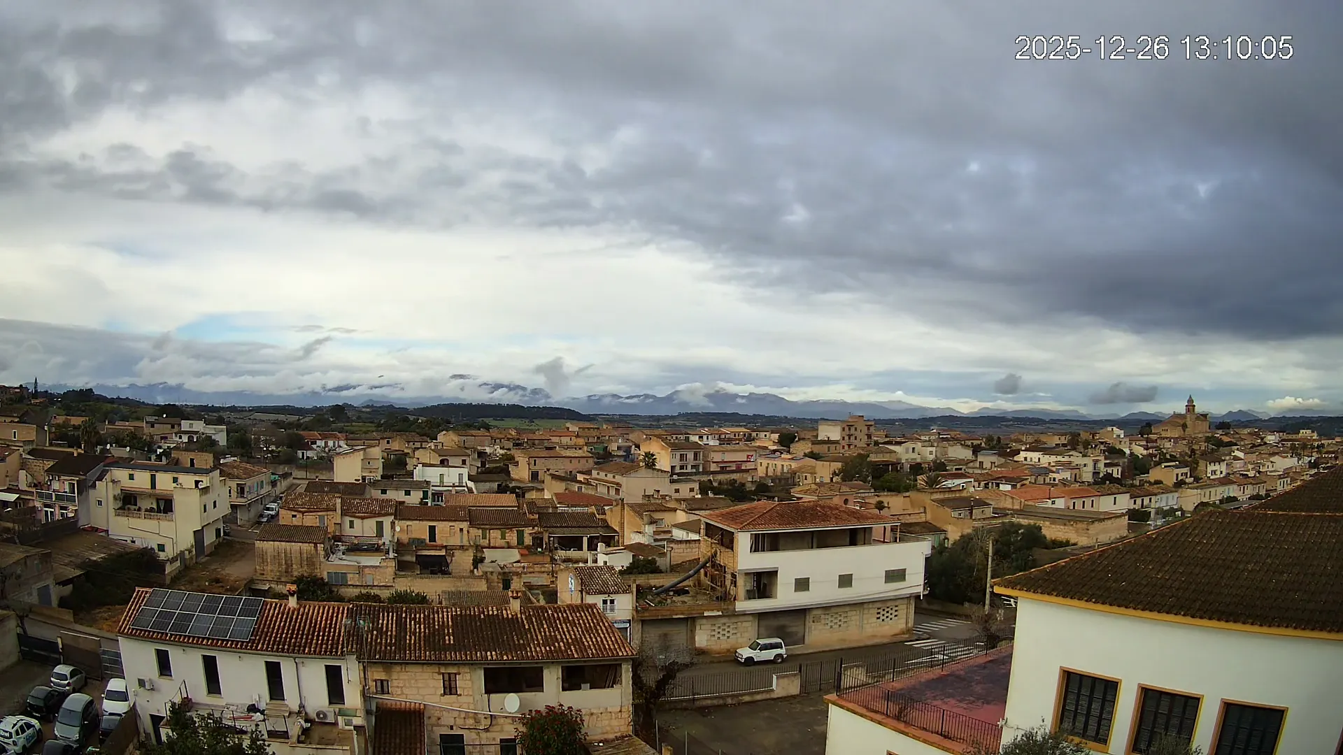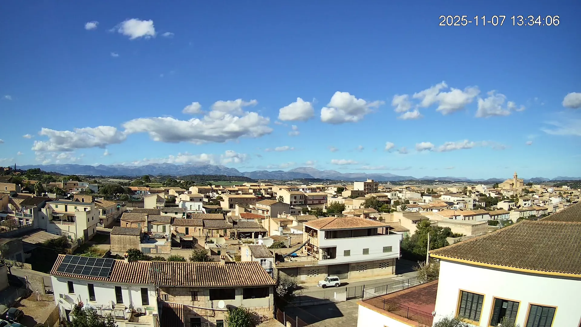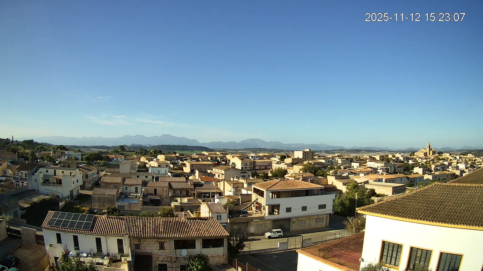 Ubicada en el núcleo de Maria de la Salut, esta cámara ofrece una vista centrada en el entramado urbano del pueblo, con sus tejados de teja árabe, calles tranquilas y construcciones tradicionales. Al fondo, domina el paisaje la Serra de Tramuntana, que se eleva imponente sobre el horizonte y añade un contraste montañoso a esta imagen típica del interior de Mallorca.