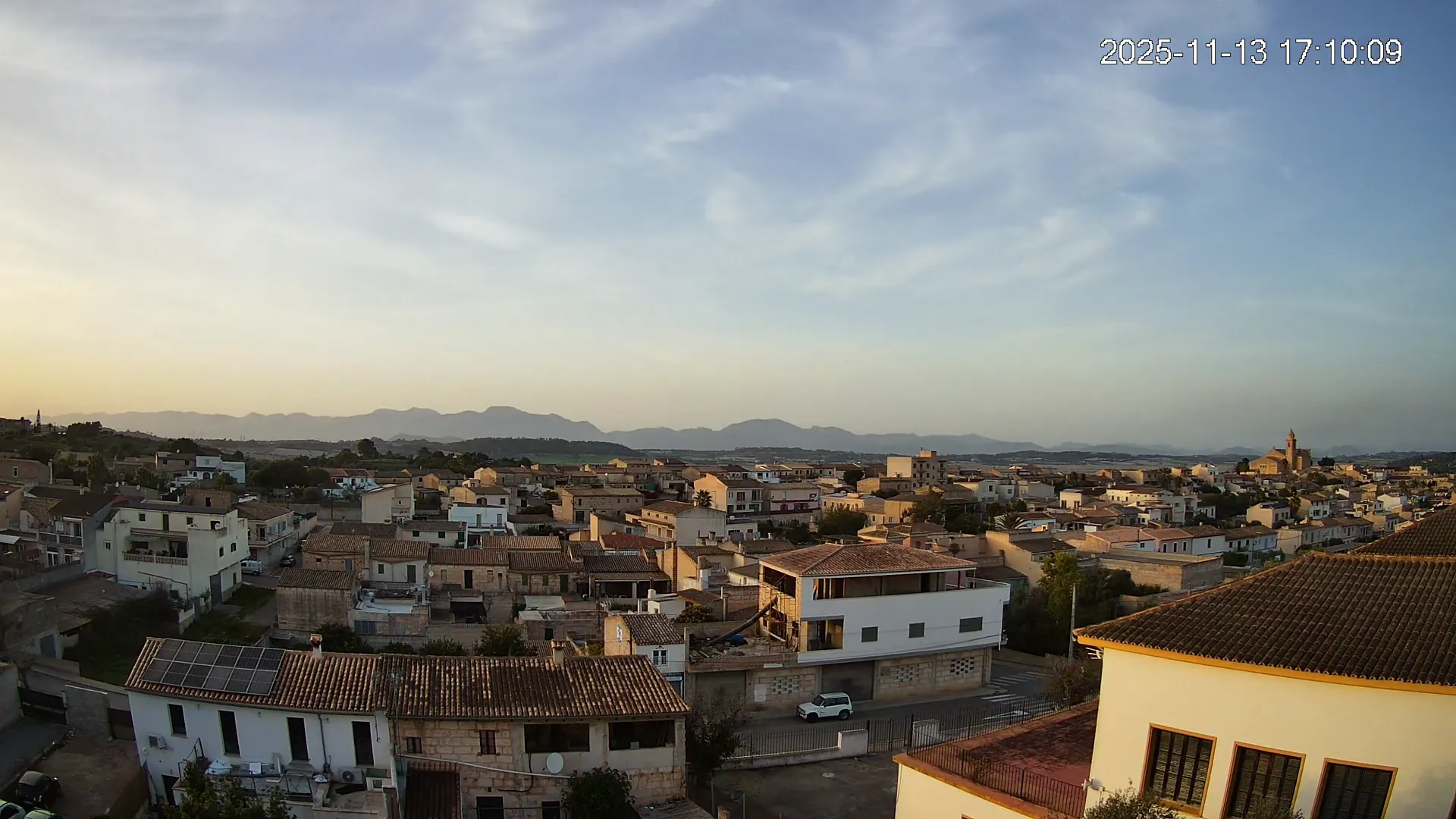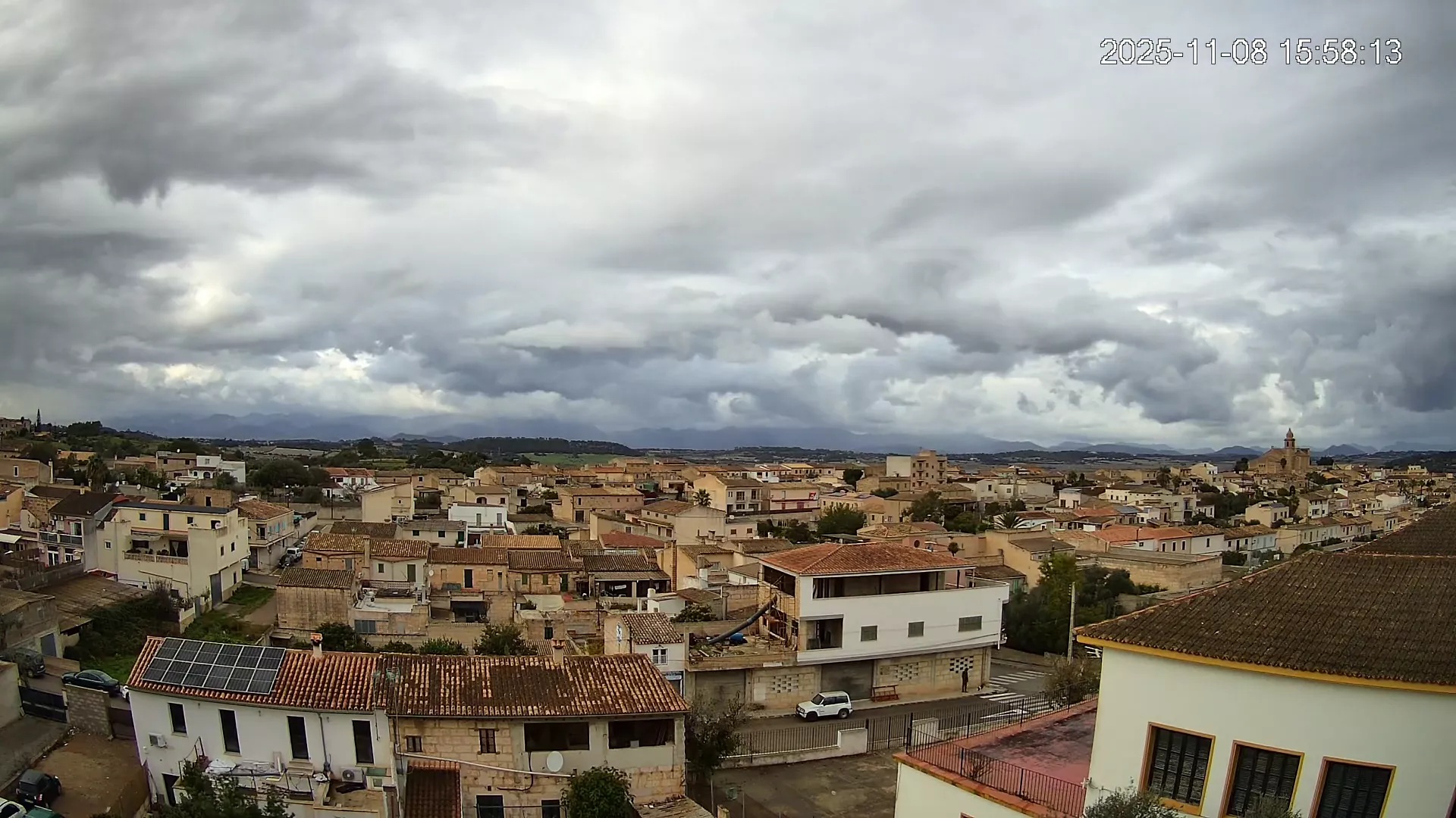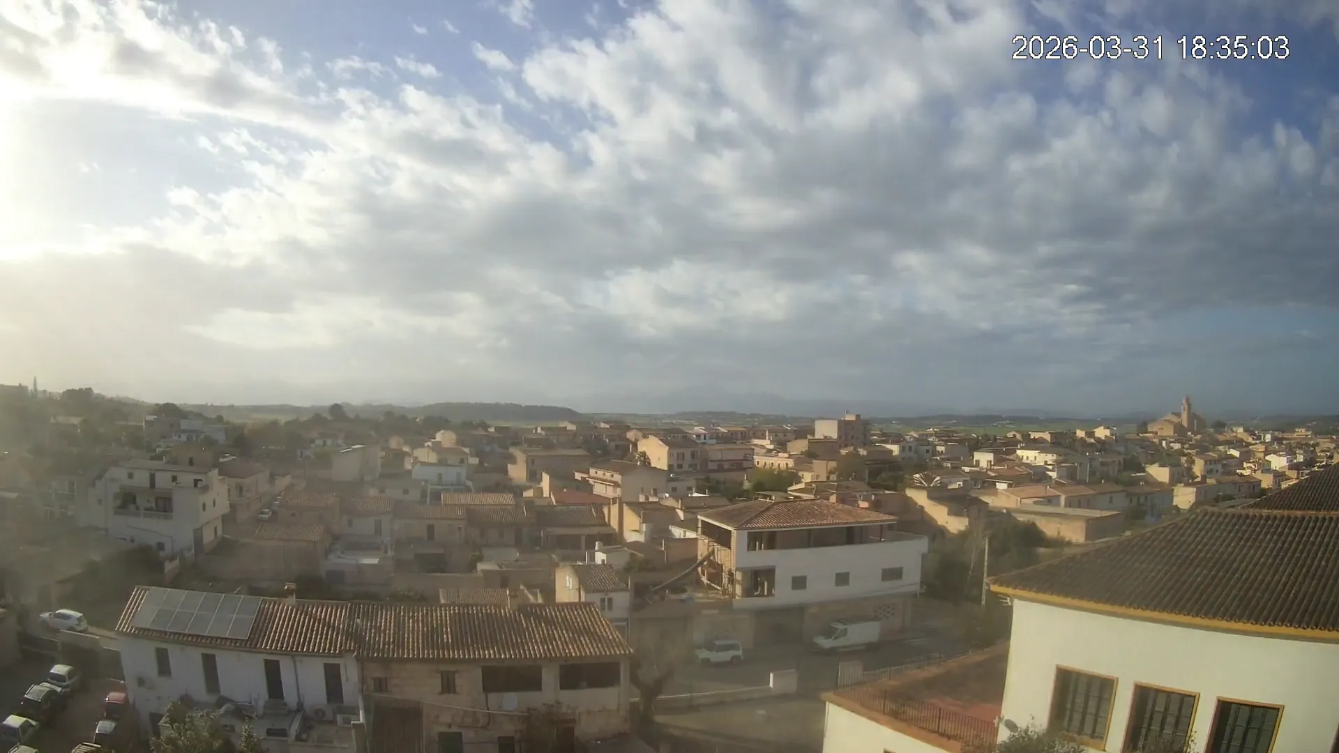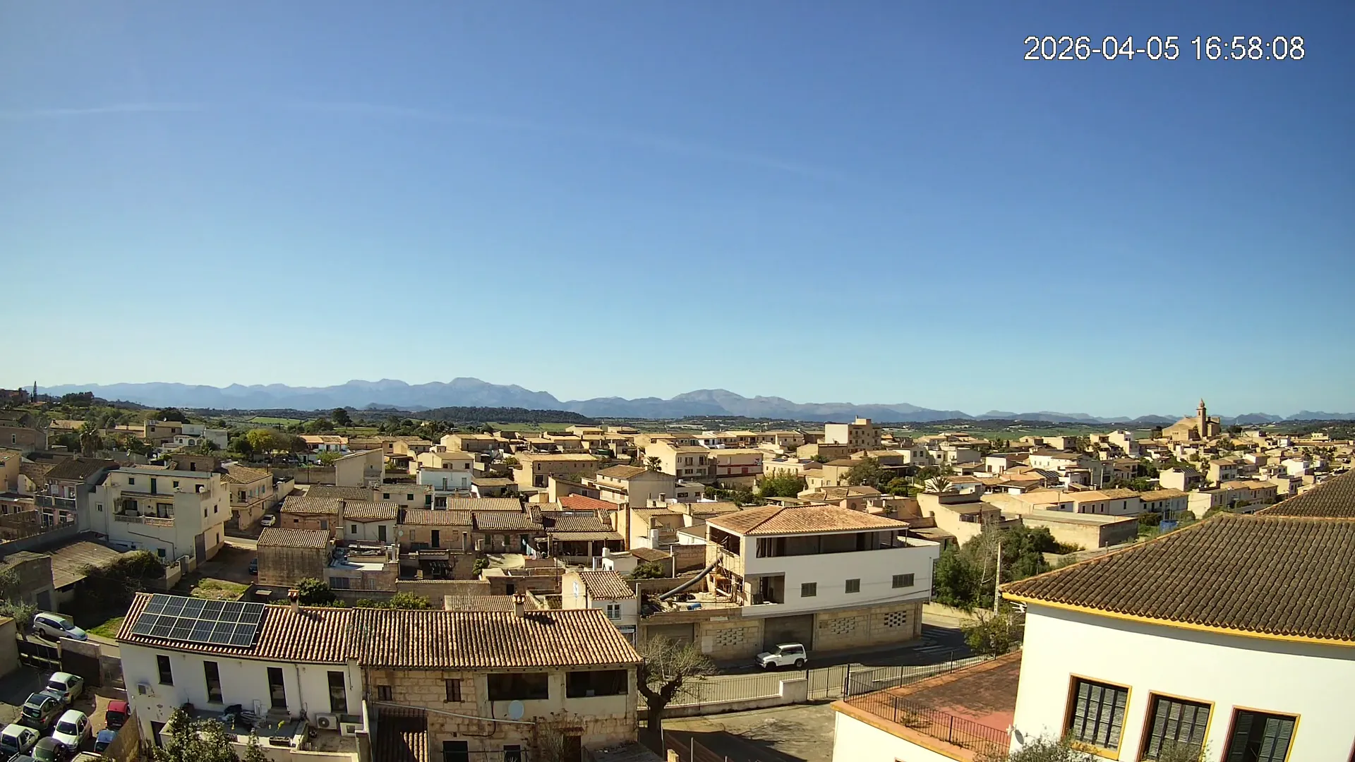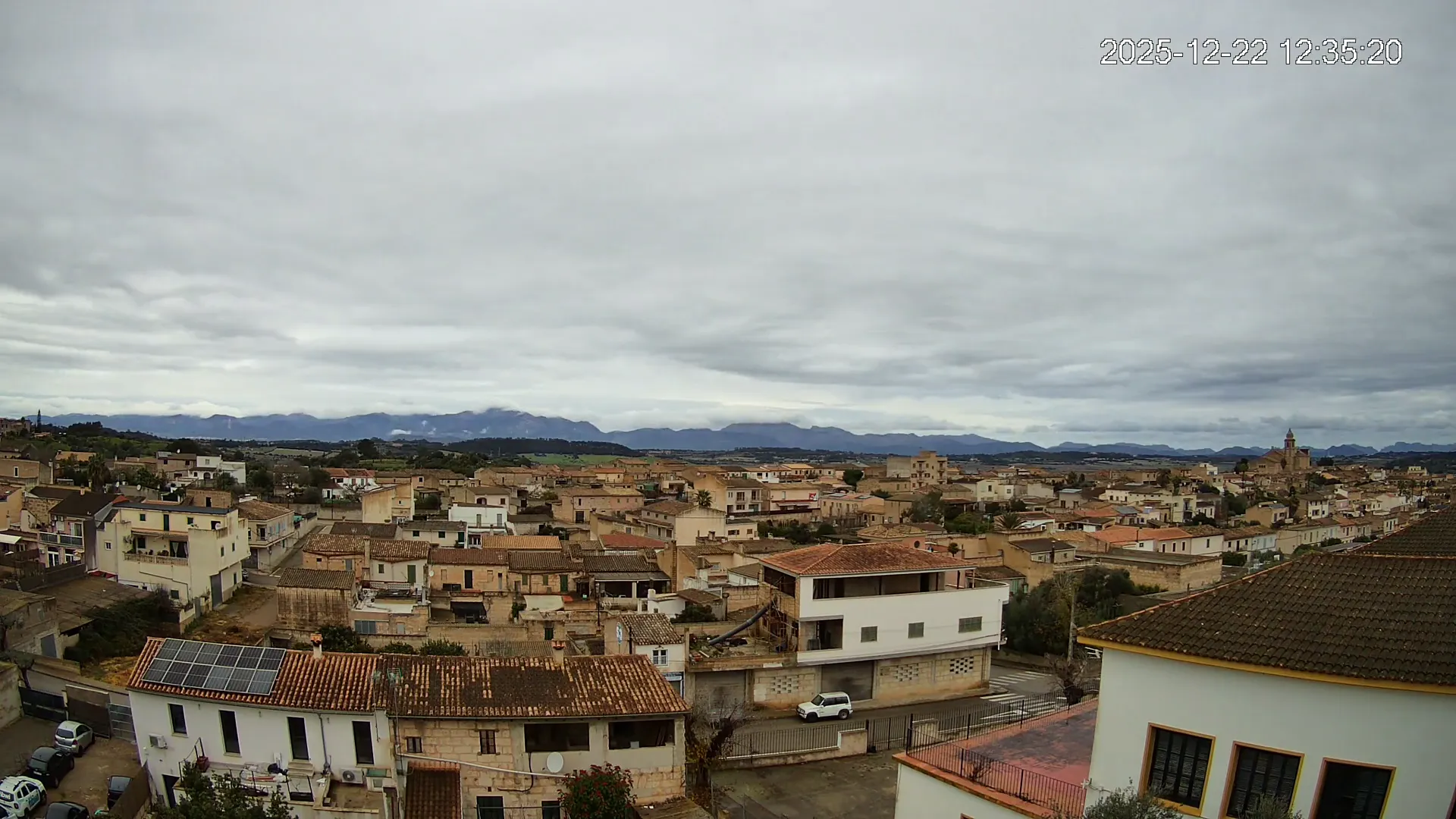 Ubicada en el núcleo de Maria de la Salut, esta cámara ofrece una vista centrada en el entramado urbano del pueblo, con sus tejados de teja árabe, calles tranquilas y construcciones tradicionales. Al fondo, domina el paisaje la Serra de Tramuntana, que se eleva imponente sobre el horizonte y añade un contraste montañoso a esta imagen típica del interior de Mallorca.
