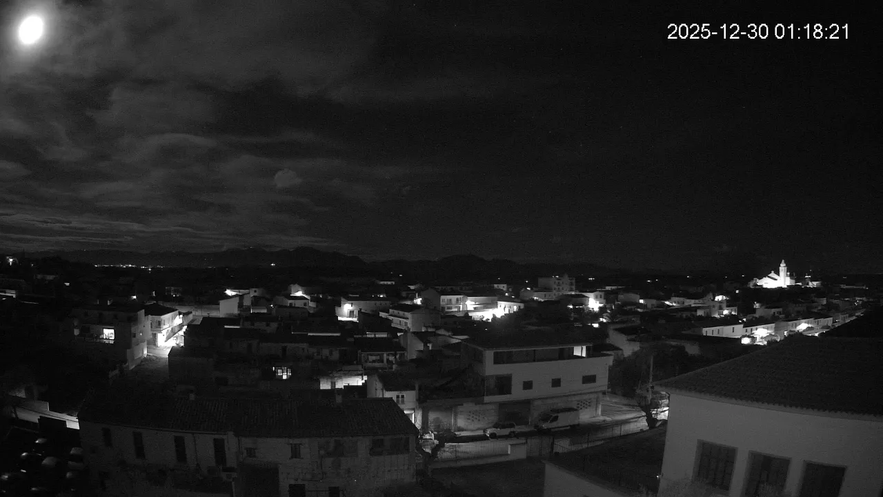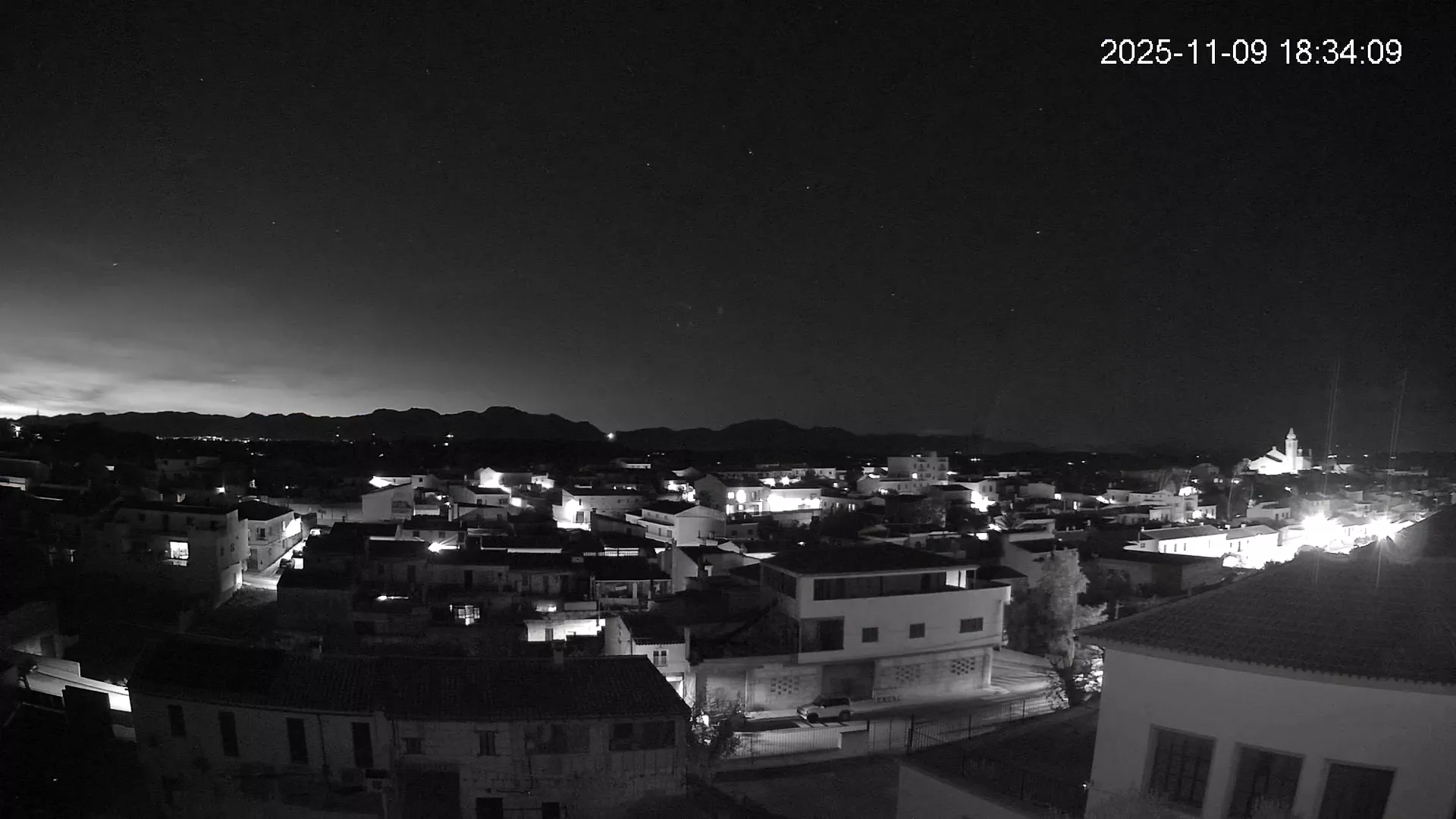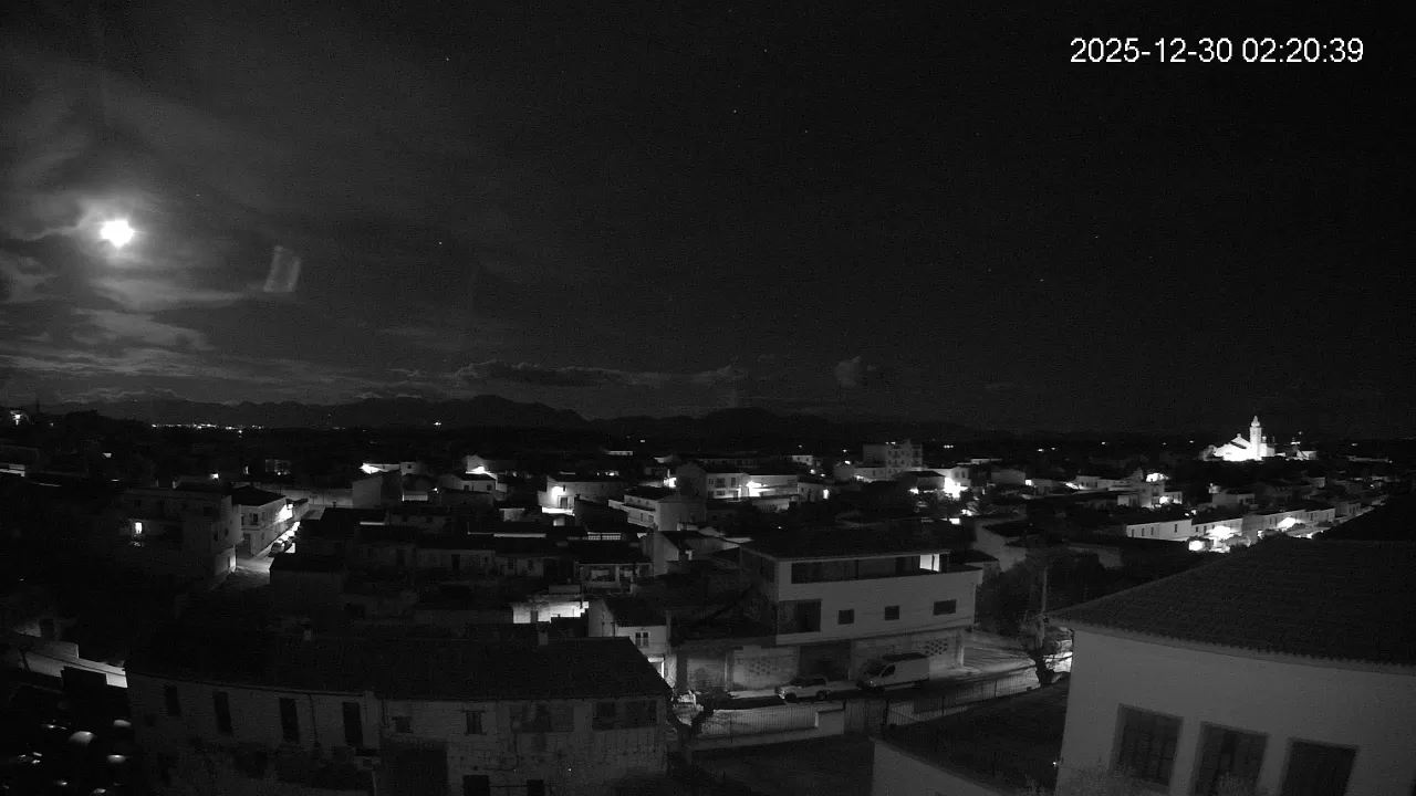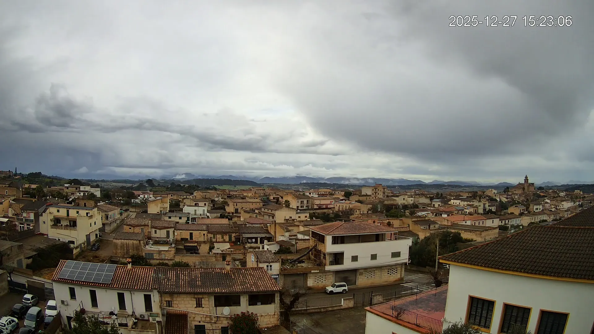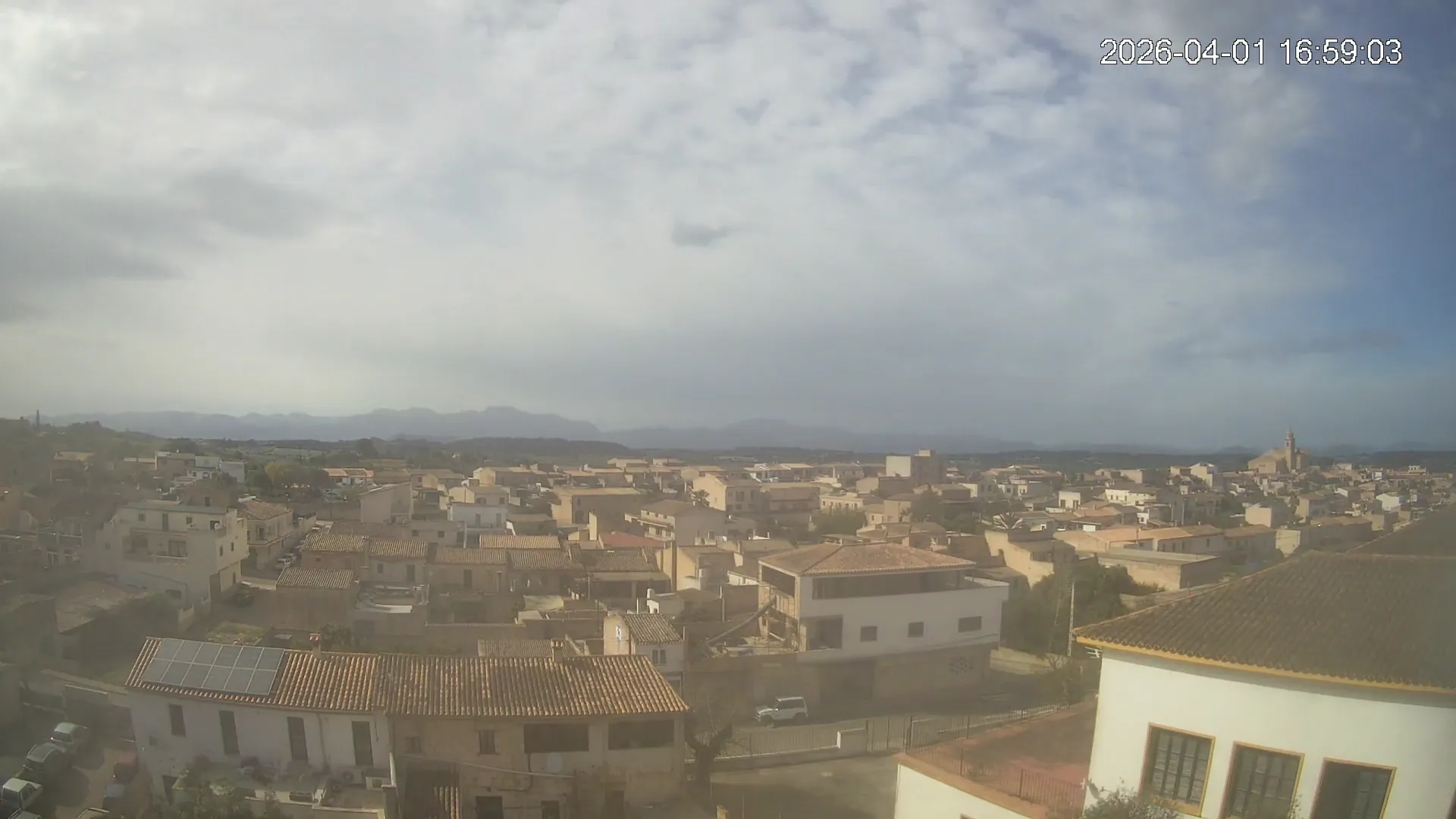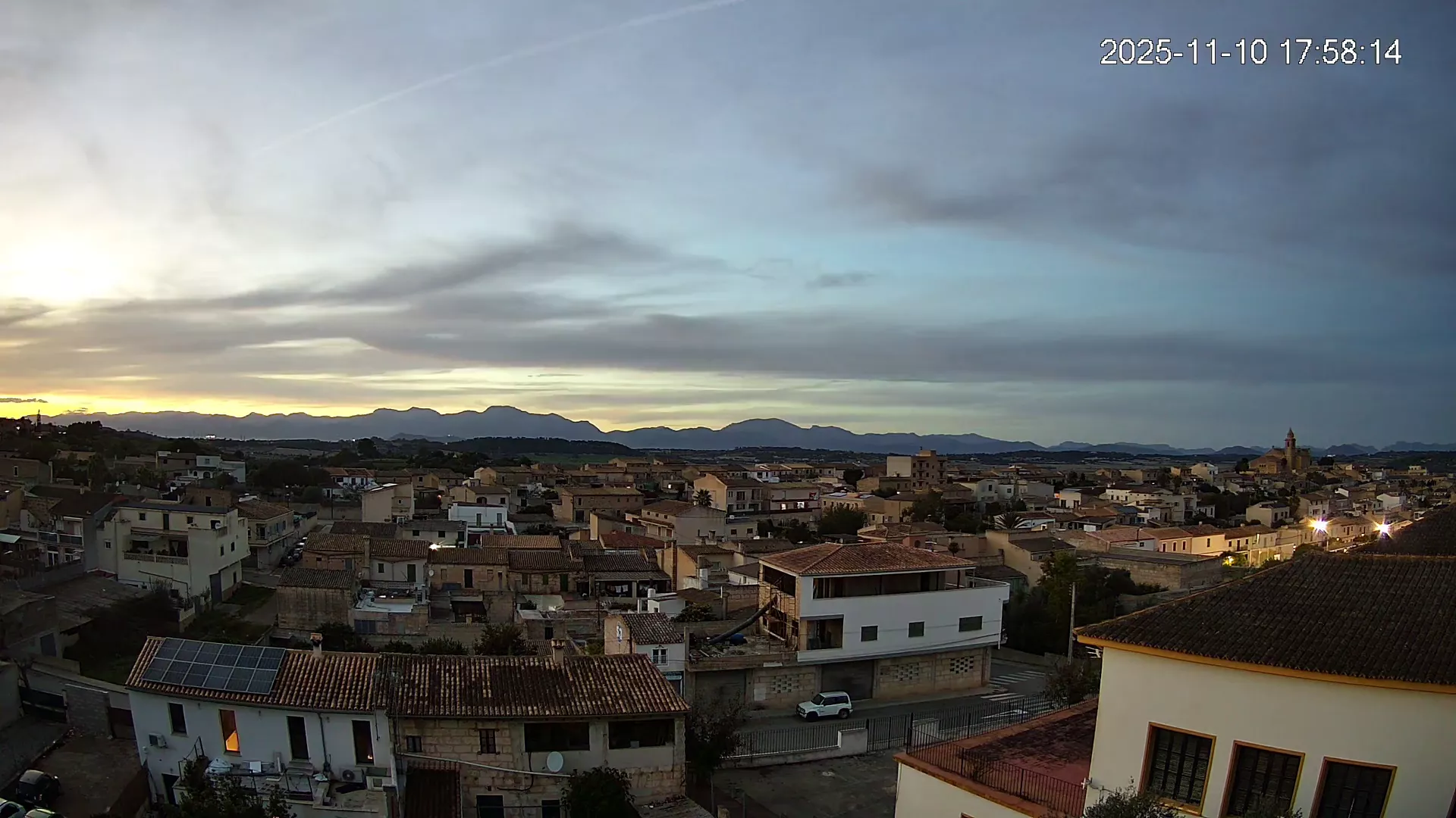 Ubicada en el núcleo de Maria de la Salut, esta cámara ofrece una vista centrada en el entramado urbano del pueblo, con sus tejados de teja árabe, calles tranquilas y construcciones tradicionales. Al fondo, domina el paisaje la Serra de Tramuntana, que se eleva imponente sobre el horizonte y añade un contraste montañoso a esta imagen típica del interior de Mallorca.