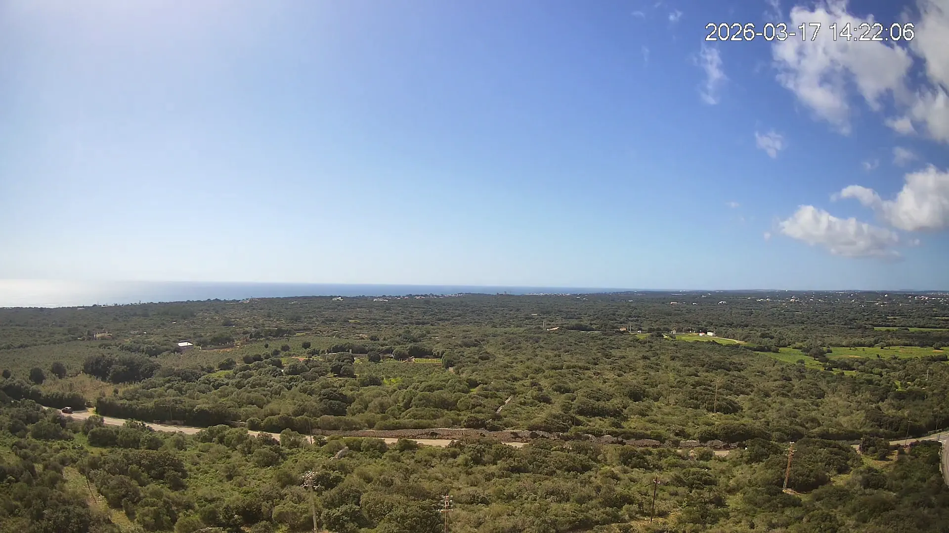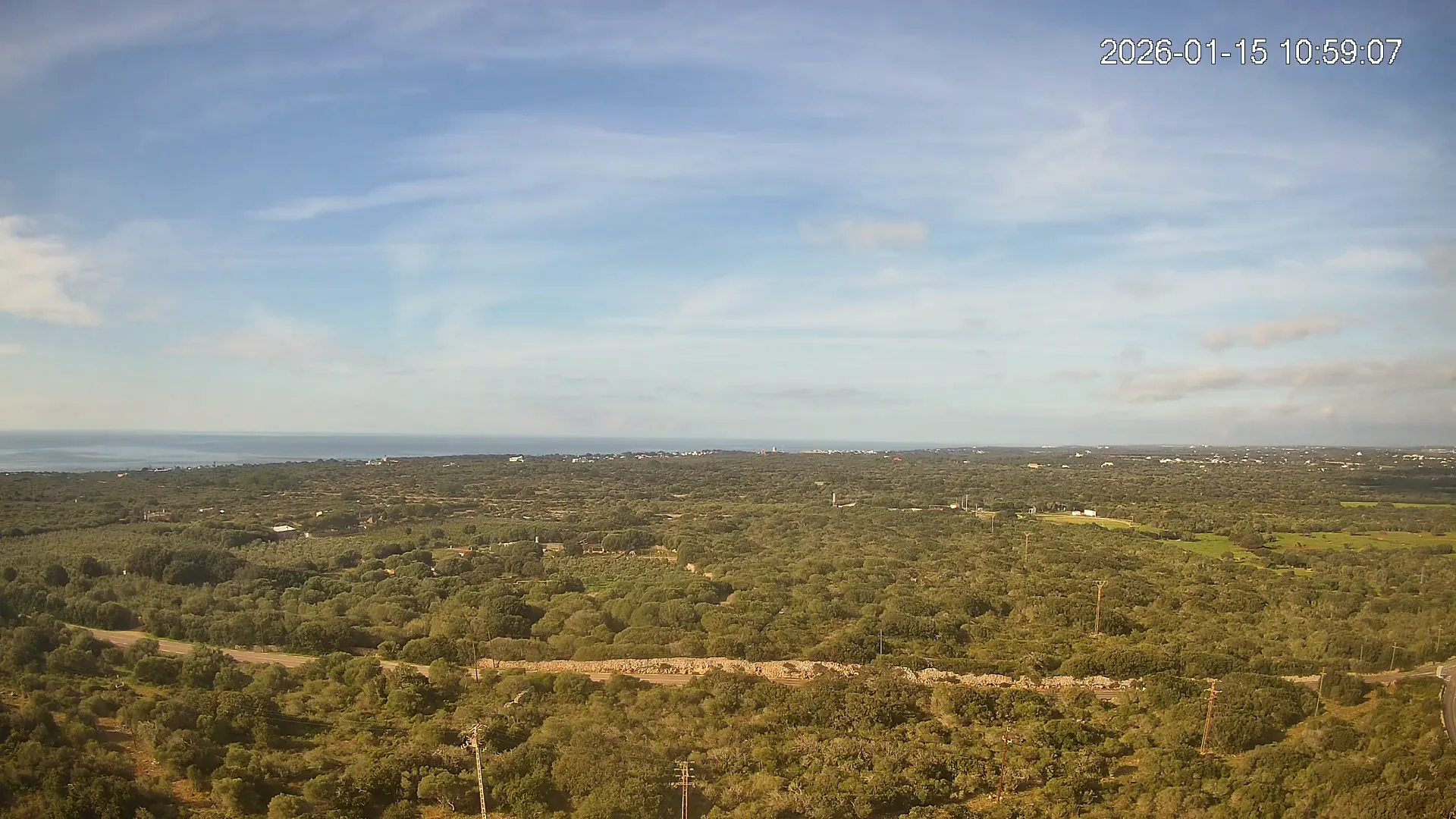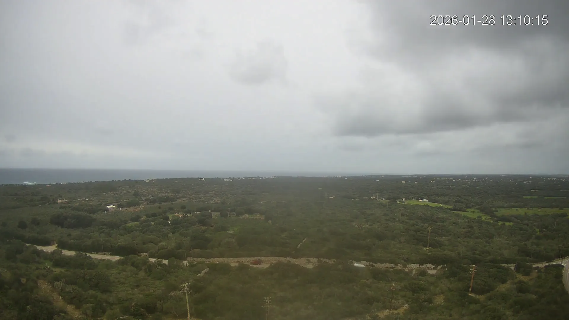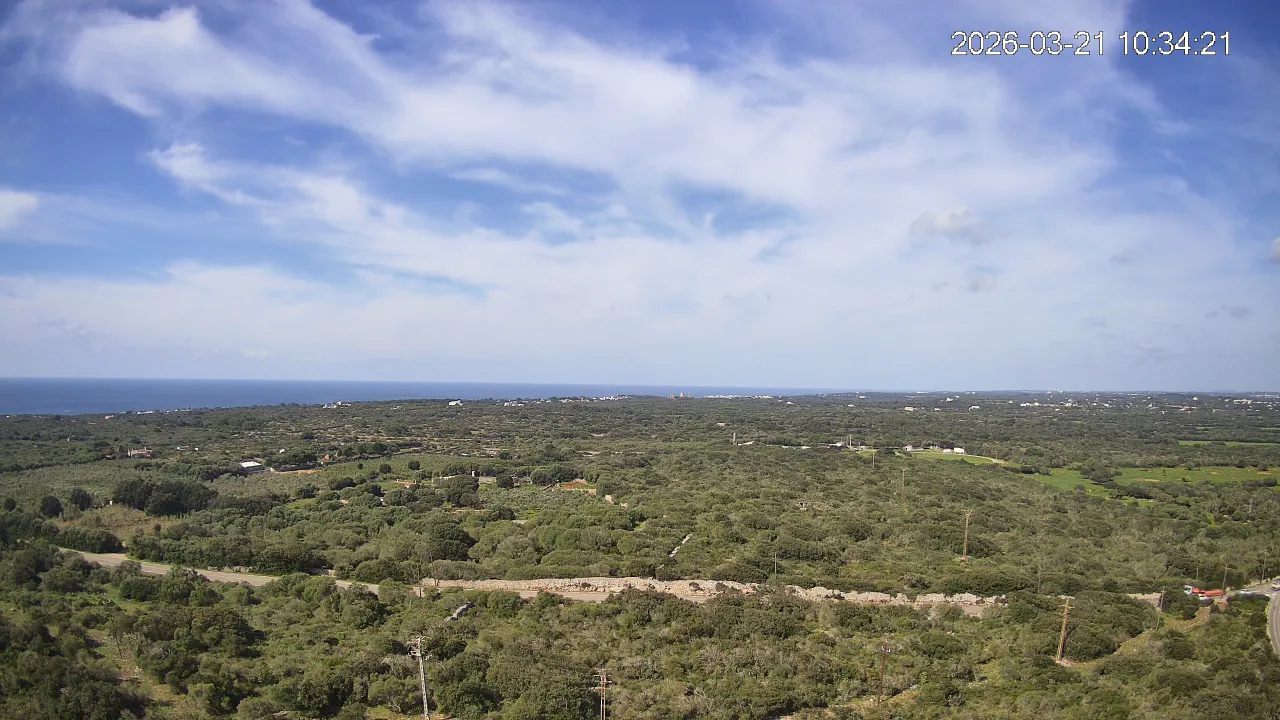 Desde Biniancolla, esta cámara se orienta hacia el interior, ofreciendo una vista abierta del Pla de Binibèquer, una zona tranquila del sur de Menorca. El paisaje combina construcciones bajas, caminos rurales y el horizonte despejado que caracteriza esta parte de la isla, donde la calma y la luz mediterránea dibujan una escena de serenidad y amplitud.