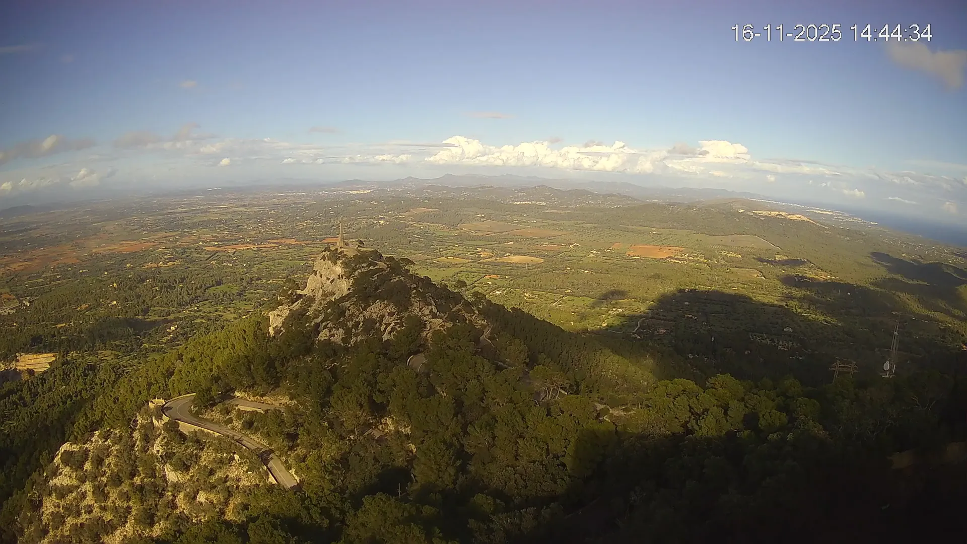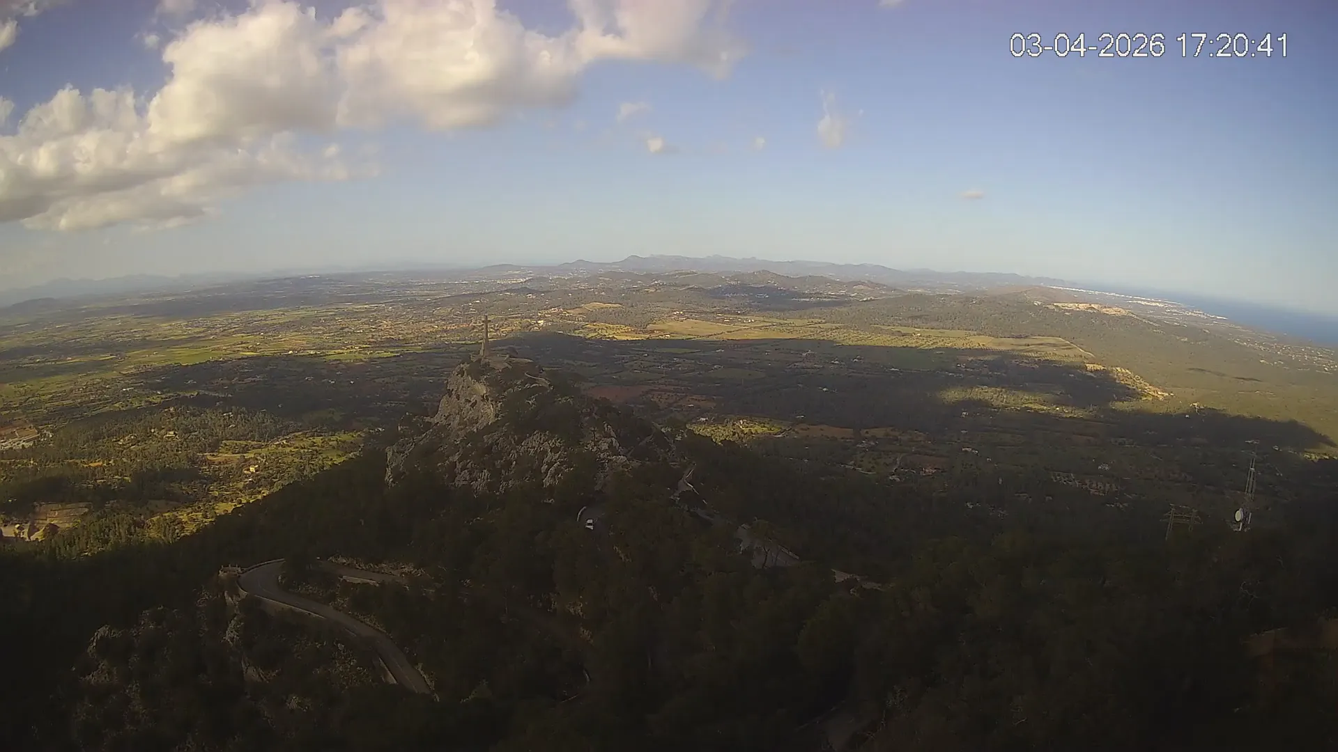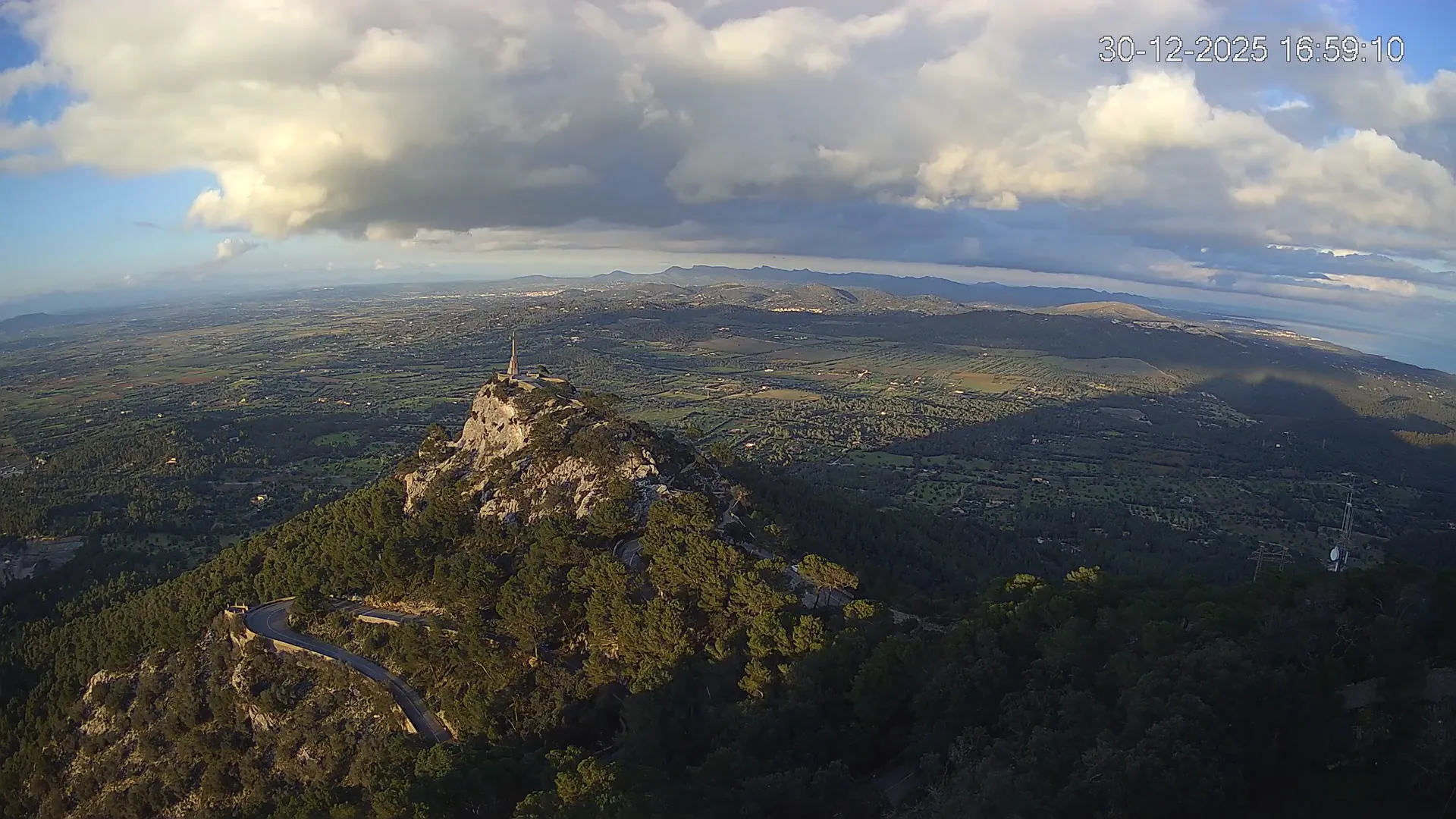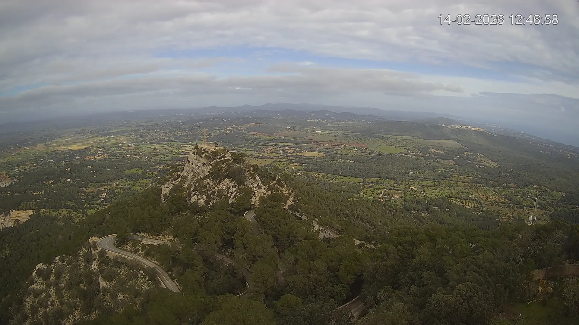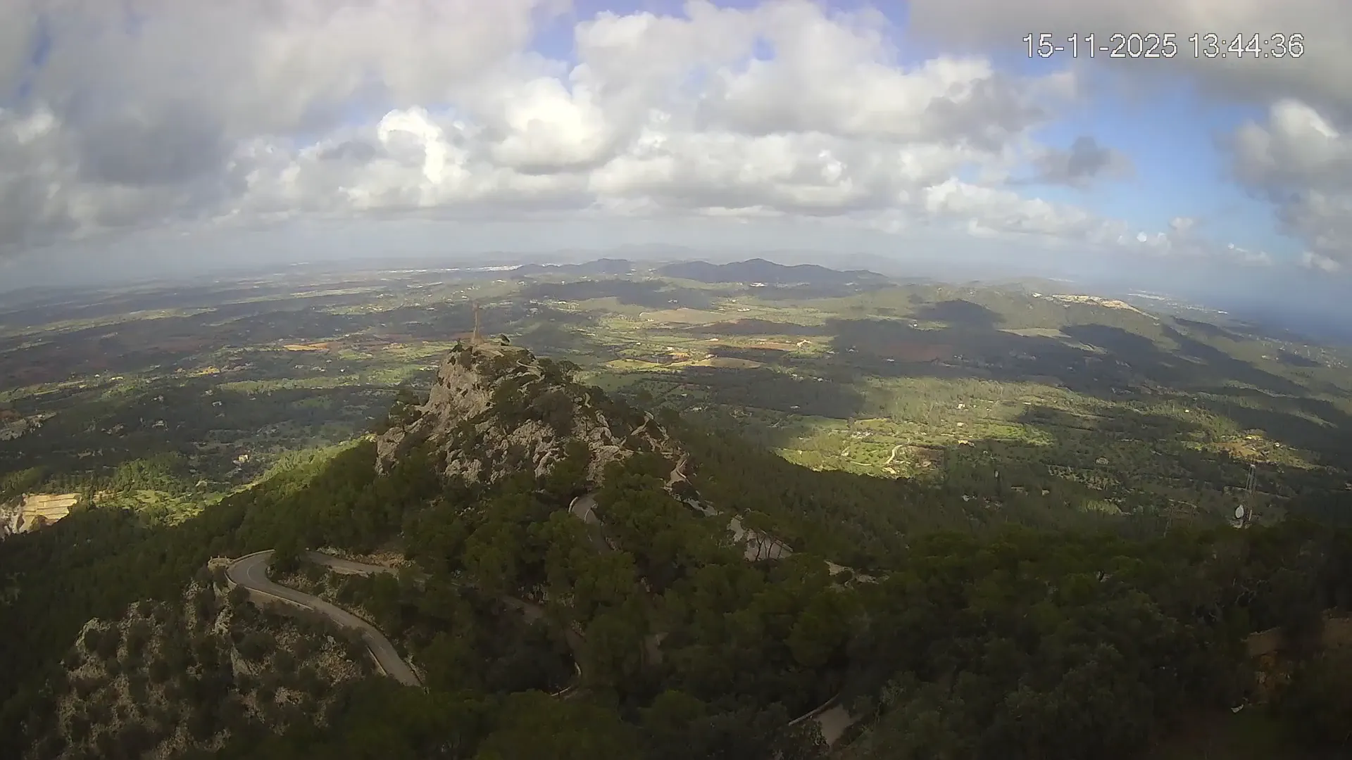 Desde la cima del Puig de Sant Salvador, esta cámara ubicada en el histórico Santuario de Sant Salvador ofrece una vista en tiempo real de uno de los puntos más elevados del sureste de Mallorca. La panorámica abarca el paisaje rural del Pla de Mallorca, colinas cubiertas de vegetación y, en días despejados, vistas que alcanzan la costa y el horizonte. Accede a los timelapses de los últimos 7 días y observa cómo cambian la luz y el clima a lo largo del día. Desde amaneceres iluminando los campos hasta atardeceres tiñendo el horizonte, descubre la transformación del entorno así como tú quieras. Visiona es perfecta para excursionistas, fotógrafos o quienes buscan disfrutar de una vista privilegiada de Mallorca desde las alturas.