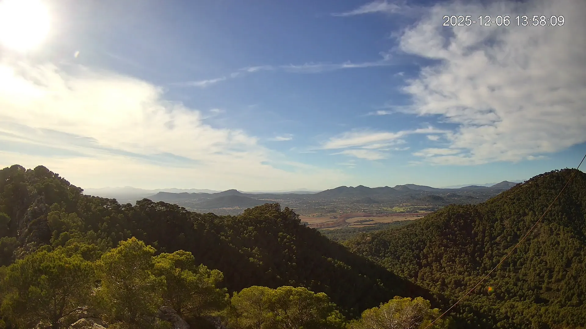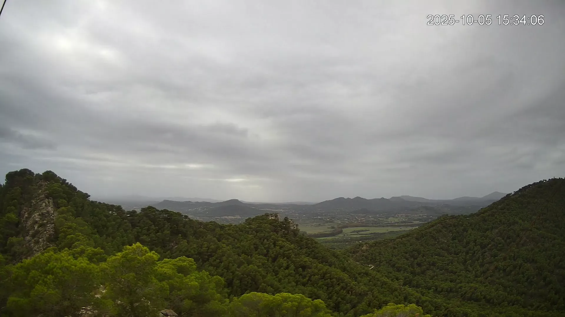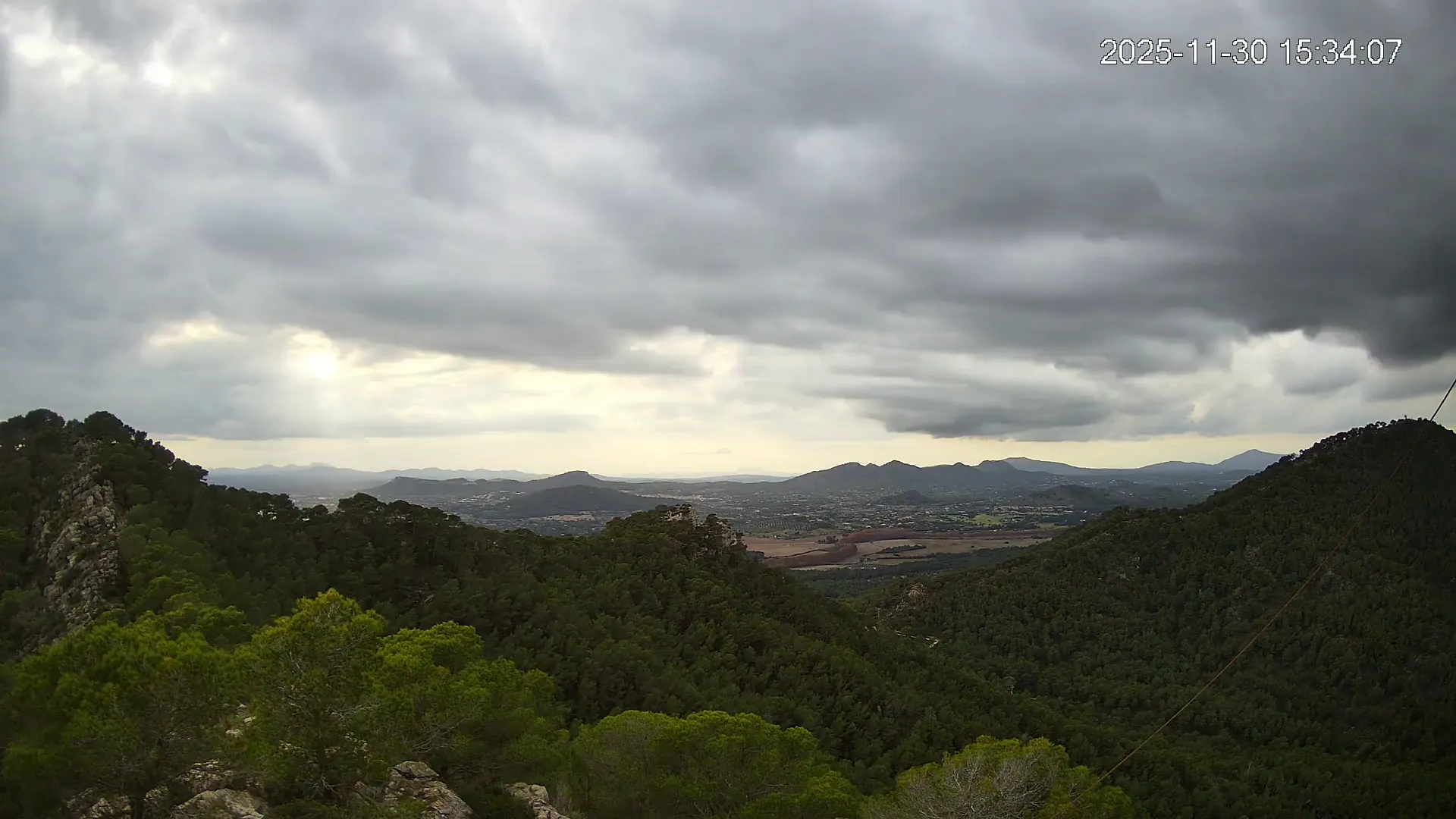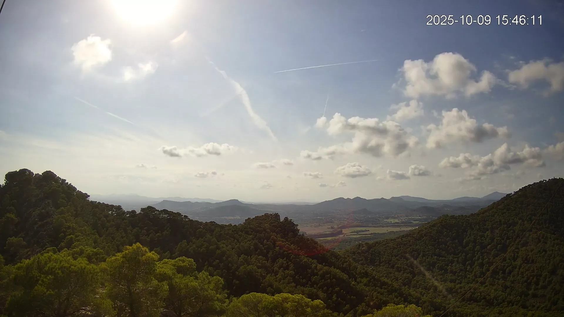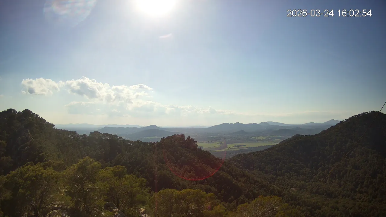 Desde el Puig Negre, en la zona de Canyamel, esta cámara ofrece una vista elevada hacia el interior de Mallorca, abarcando un amplio paisaje del Llevant mallorquín. Al fondo se distinguen los pueblos de Son Servera y Sant Llorenç des Cardassar, entre colinas suaves y campos cultivados. Una panorámica que muestra la transición entre la costa y el interior rural de la isla.