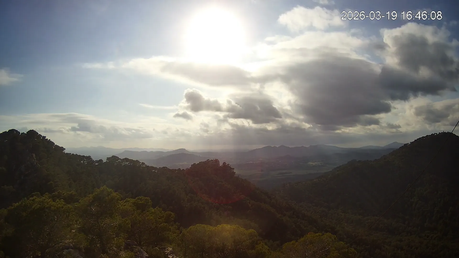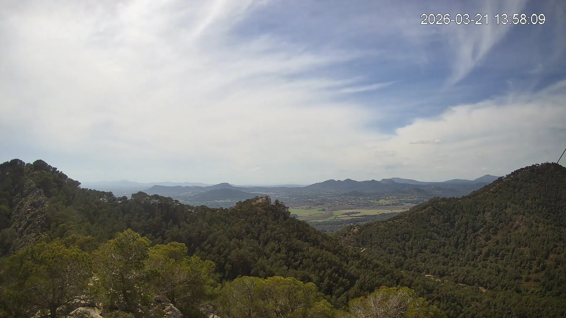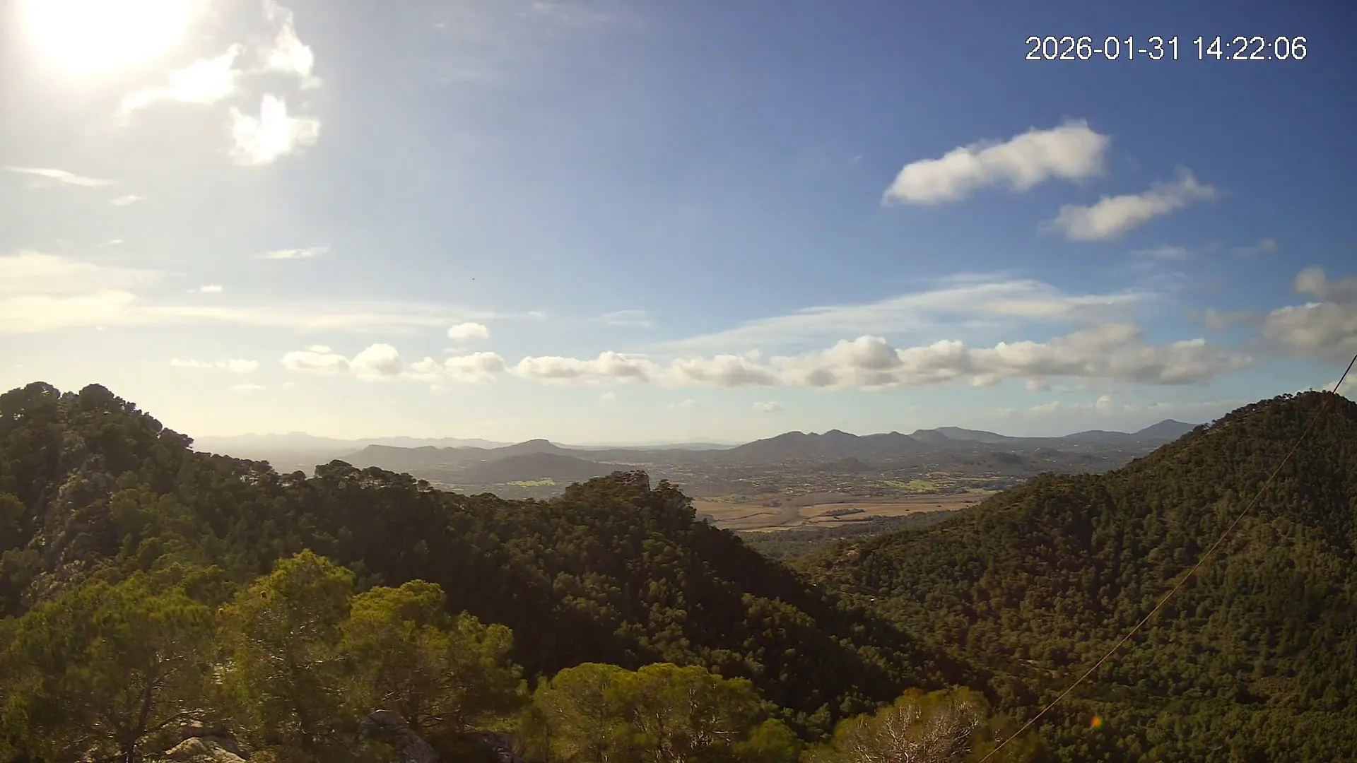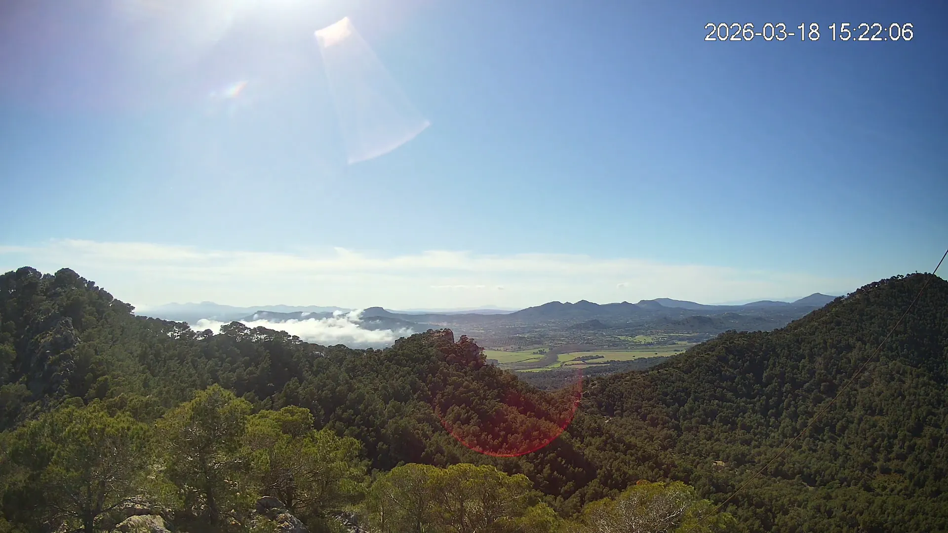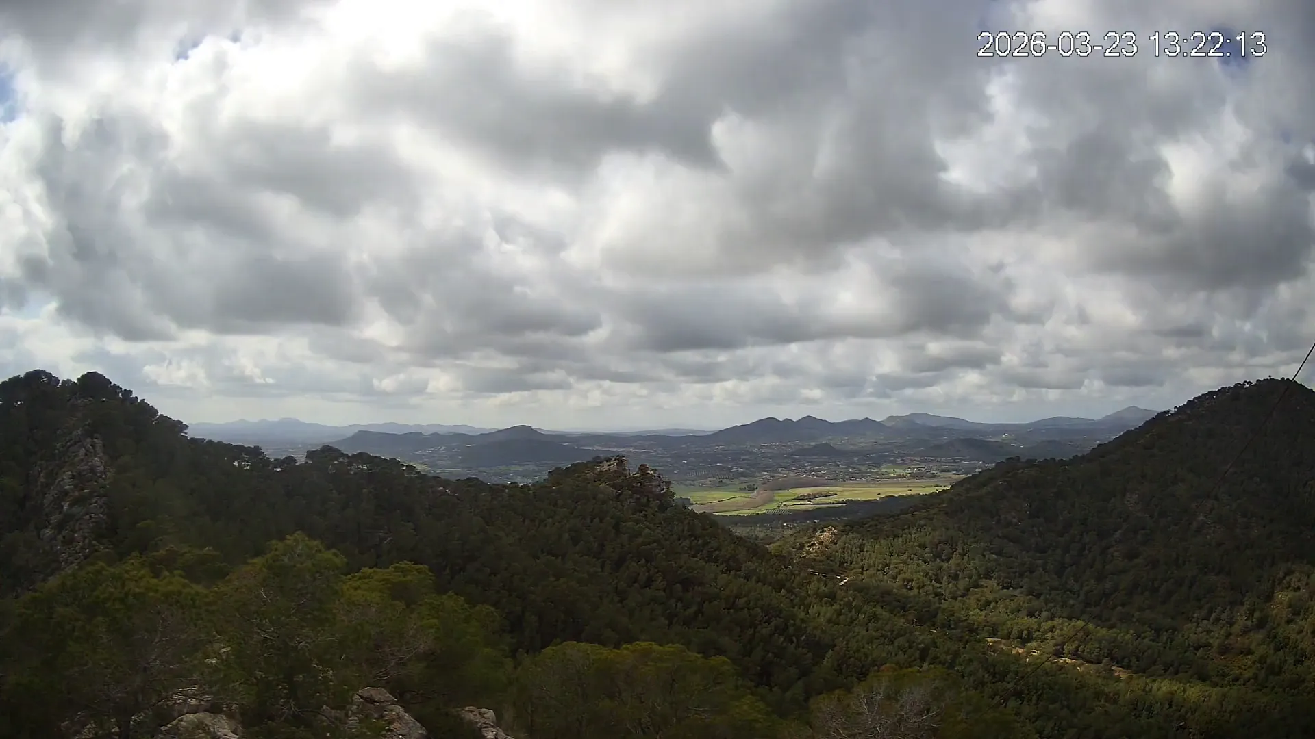 Desde el Puig Negre, en la zona de Canyamel, esta cámara ofrece una vista elevada hacia el interior de Mallorca, abarcando un amplio paisaje del Llevant mallorquín. Al fondo se distinguen los pueblos de Son Servera y Sant Llorenç des Cardassar, entre colinas suaves y campos cultivados. Una panorámica que muestra la transición entre la costa y el interior rural de la isla.