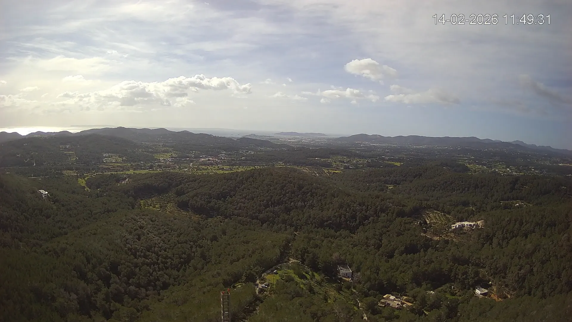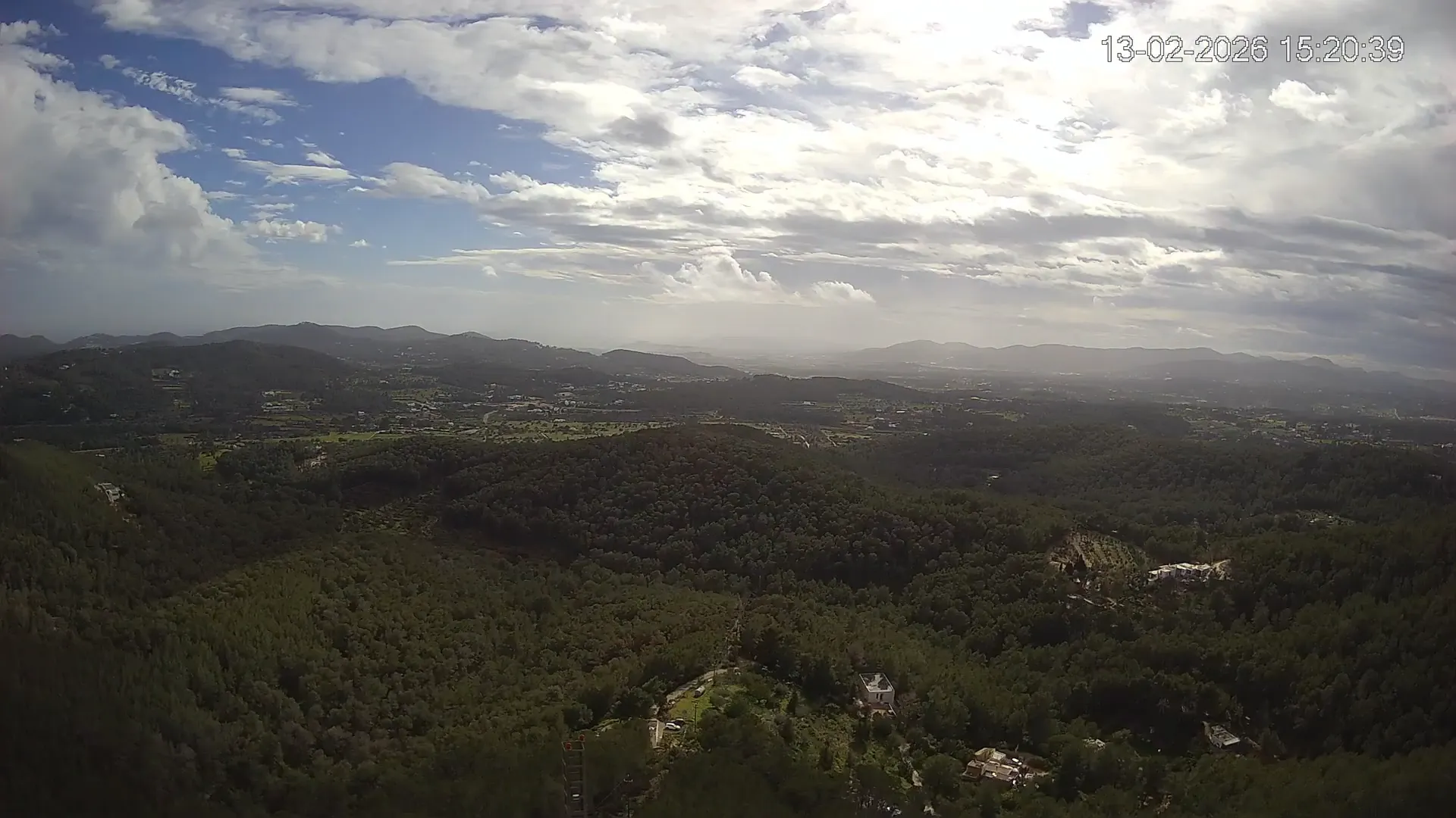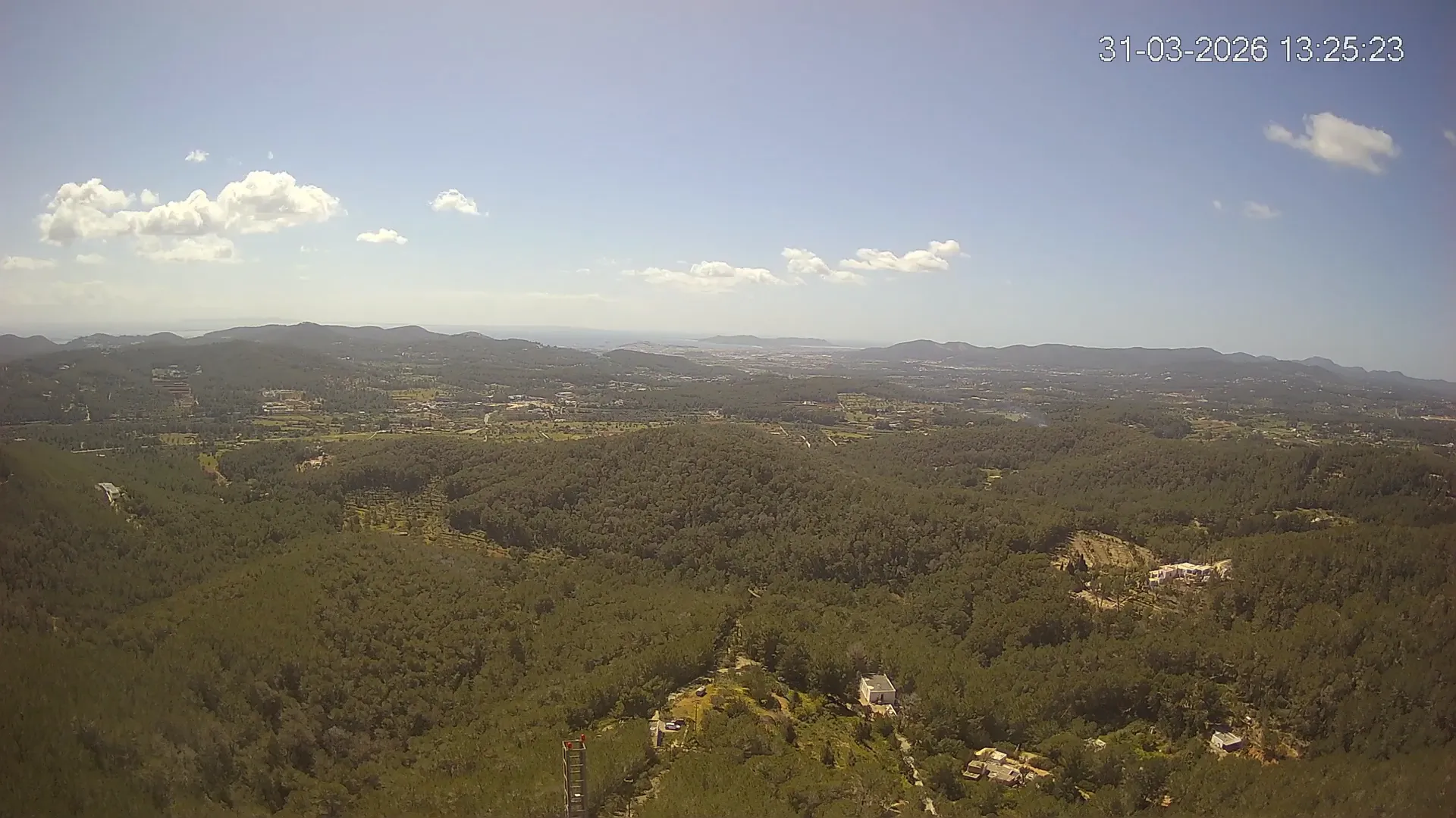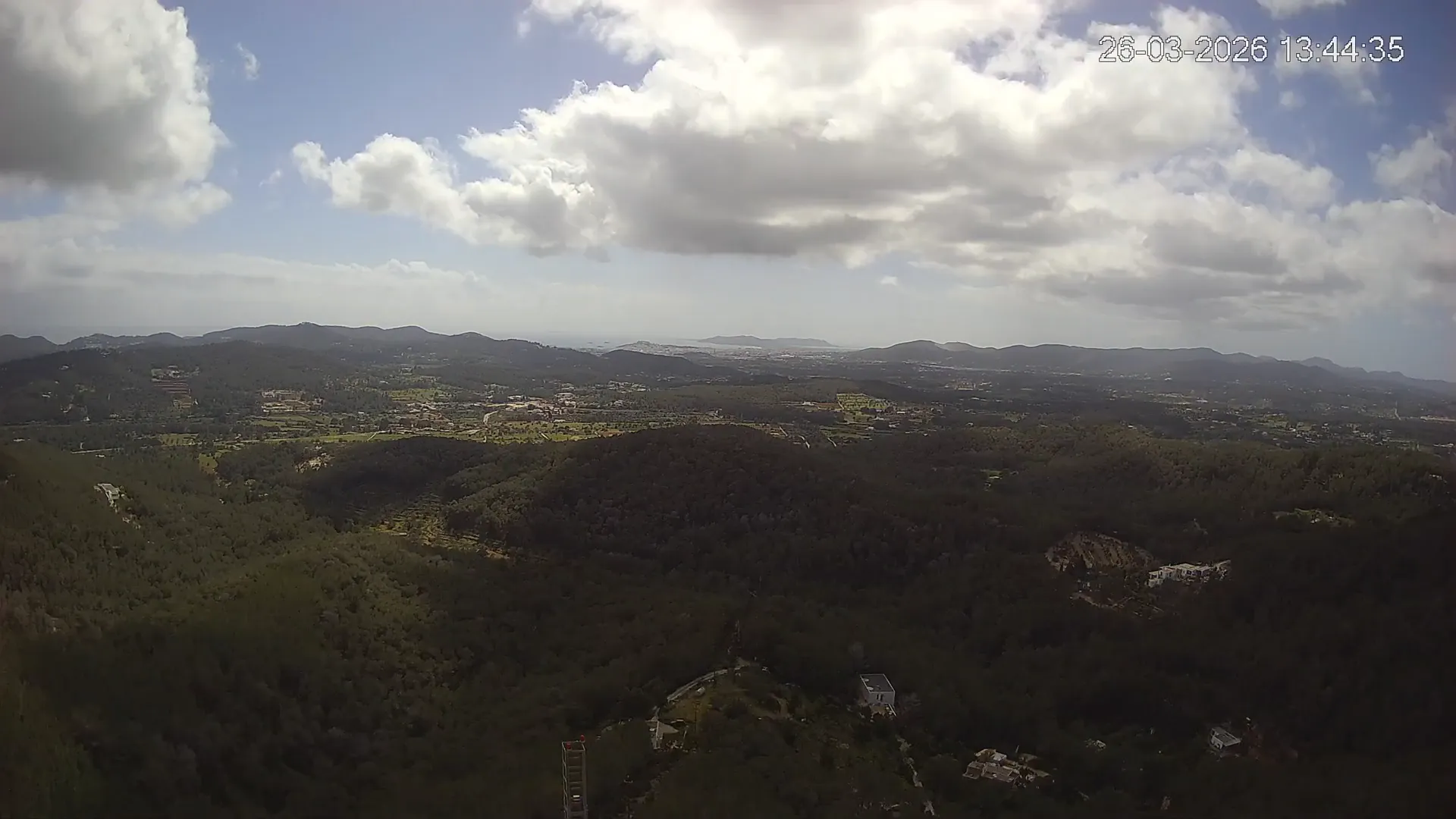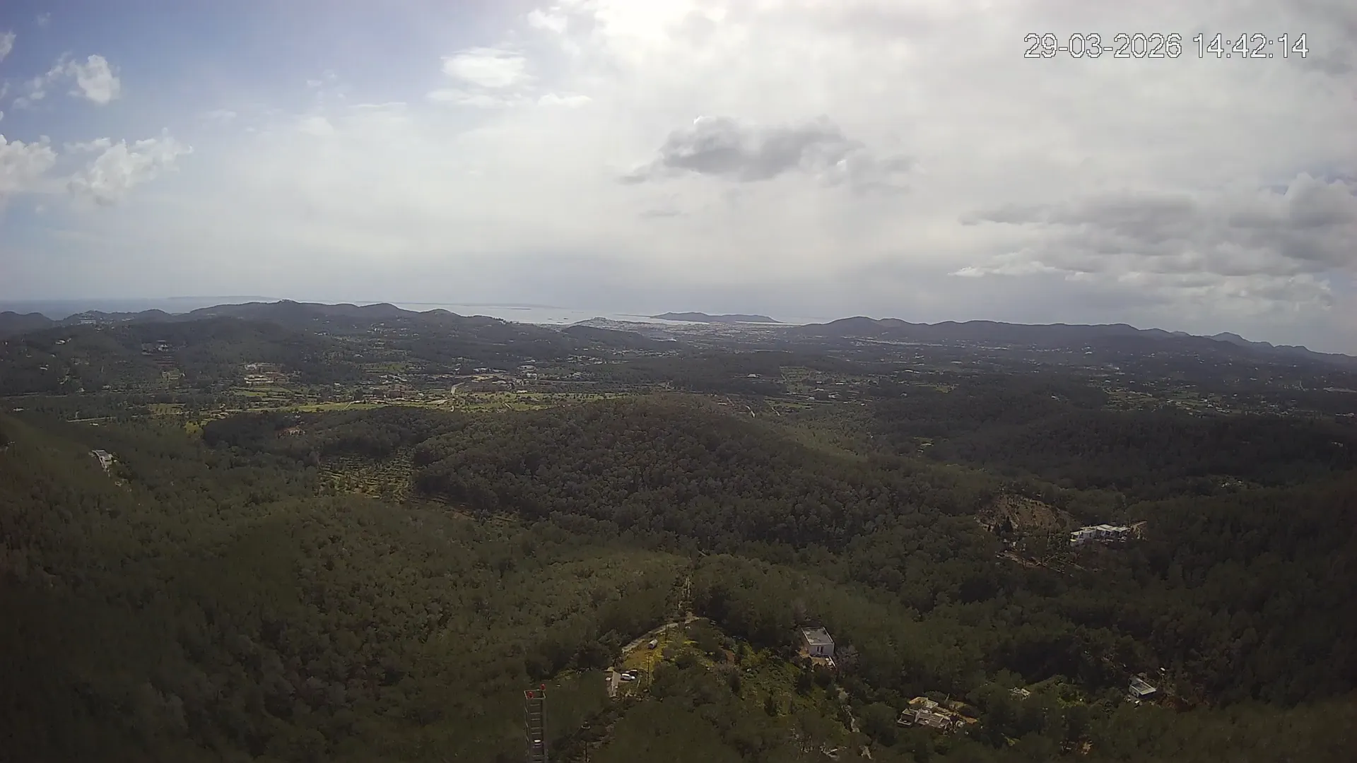 Desde esta cámara situada en Sant Llorenç, Ibiza, puedes observar en directo una panorámica del paisaje rural y montañoso del interior de la isla. La imagen abarca extensas áreas de vegetación mediterránea, campos y colinas, mostrando la belleza natural de esta zona menos urbanizada de Ibiza. Visiona te ofrece una emisión continua para que puedas consultar en cualquier momento las condiciones meteorológicas y la visibilidad en la zona. Es una herramienta útil para residentes, excursionistas y amantes de la naturaleza que desean conocer el estado del tiempo en el interior de Ibiza.