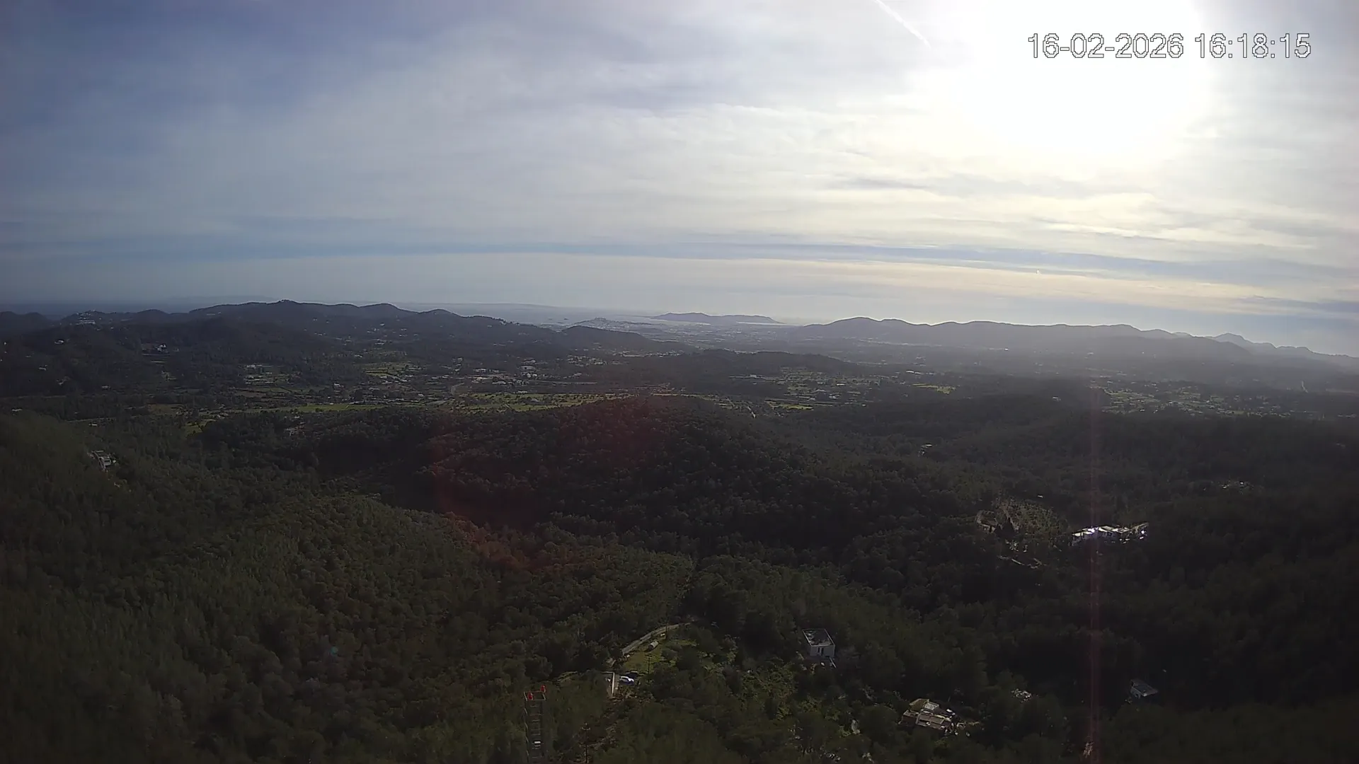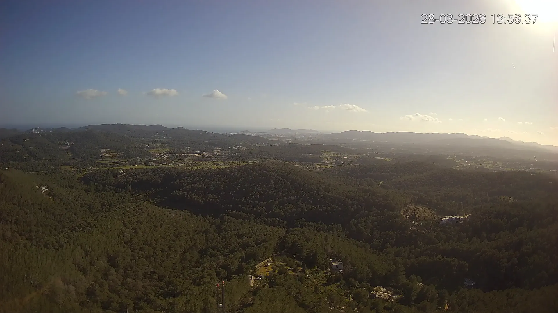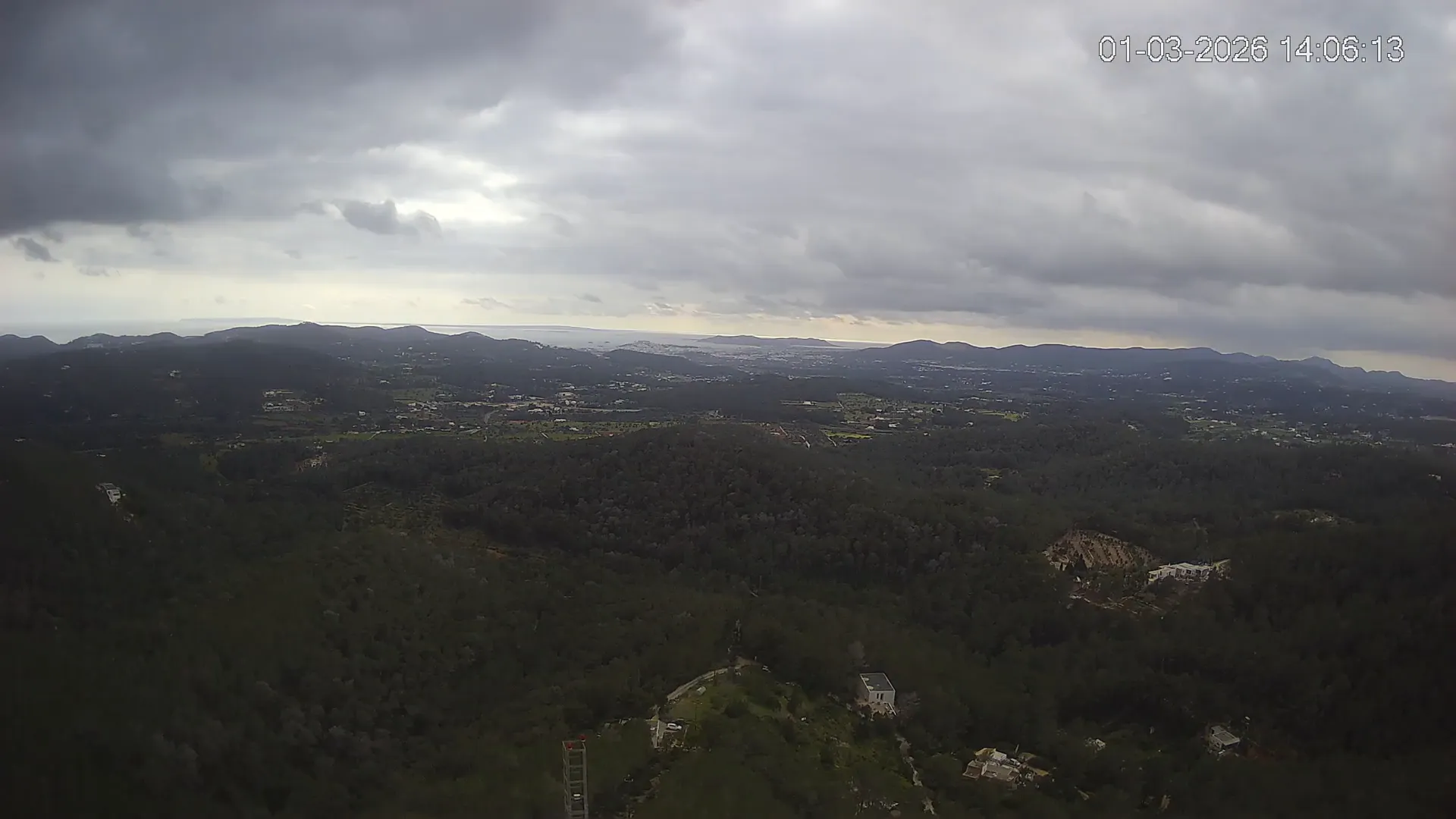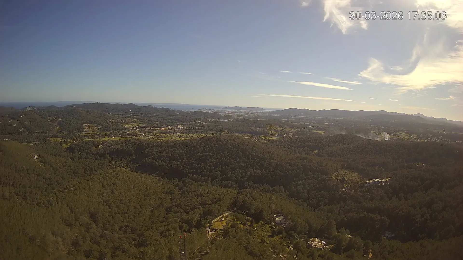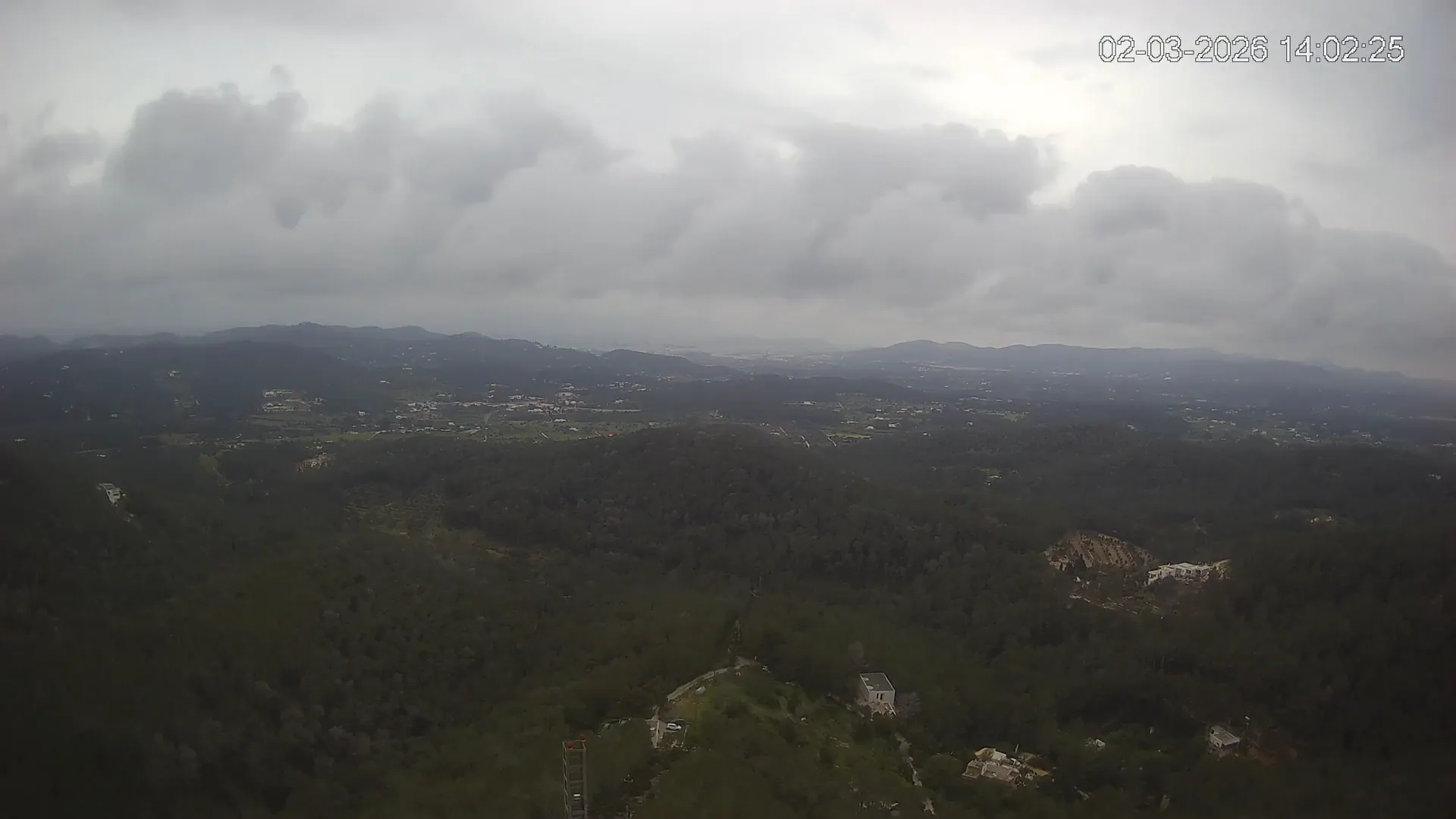 Desde esta cámara situada en Sant Llorenç, Ibiza, puedes observar en directo una panorámica del paisaje rural y montañoso del interior de la isla. La imagen abarca extensas áreas de vegetación mediterránea, campos y colinas, mostrando la belleza natural de esta zona menos urbanizada de Ibiza. Visiona te ofrece una emisión continua para que puedas consultar en cualquier momento las condiciones meteorológicas y la visibilidad en la zona. Es una herramienta útil para residentes, excursionistas y amantes de la naturaleza que desean conocer el estado del tiempo en el interior de Ibiza.