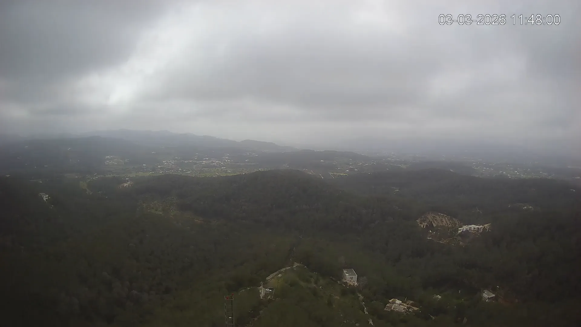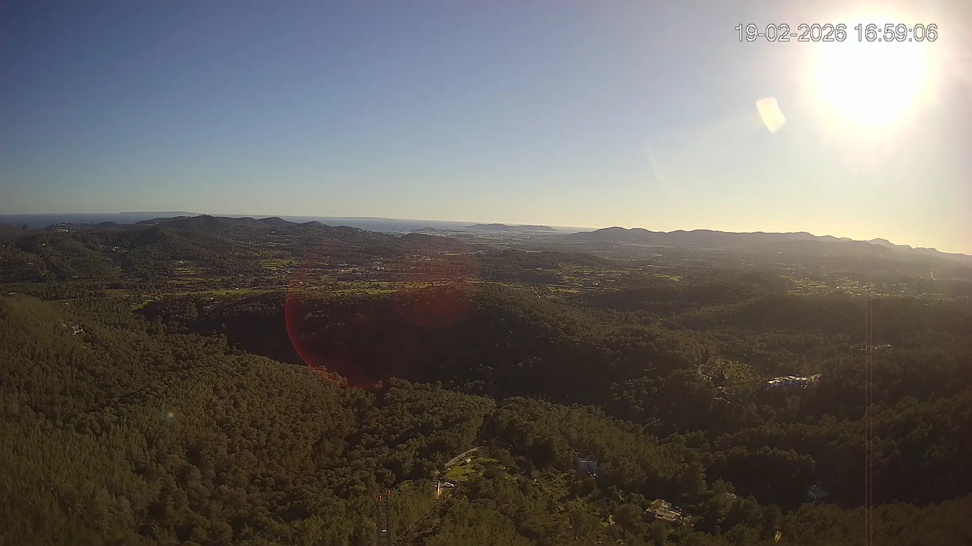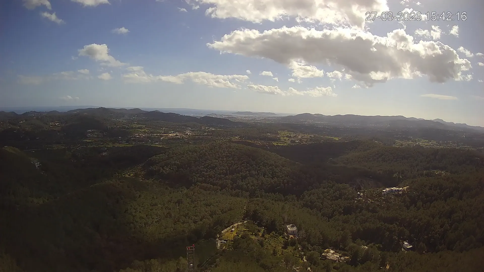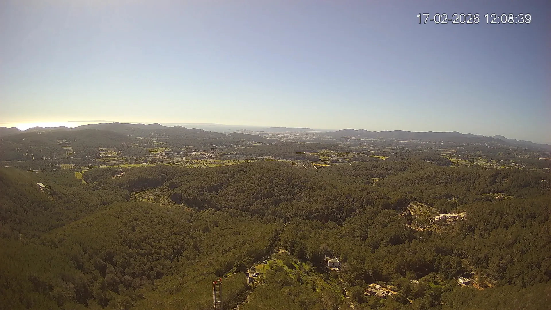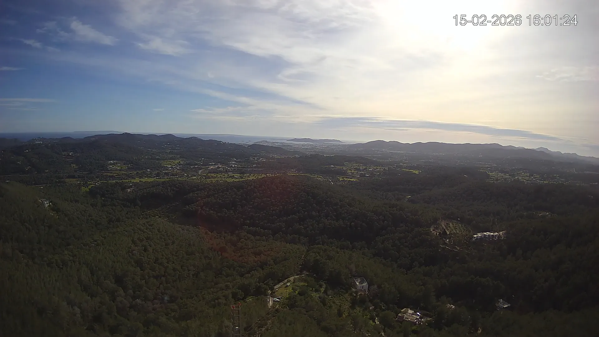 Desde esta cámara situada en Sant Llorenç, Ibiza, puedes observar en directo una panorámica del paisaje rural y montañoso del interior de la isla. La imagen abarca extensas áreas de vegetación mediterránea, campos y colinas, mostrando la belleza natural de esta zona menos urbanizada de Ibiza. Visiona te ofrece una emisión continua para que puedas consultar en cualquier momento las condiciones meteorológicas y la visibilidad en la zona. Es una herramienta útil para residentes, excursionistas y amantes de la naturaleza que desean conocer el estado del tiempo en el interior de Ibiza.
