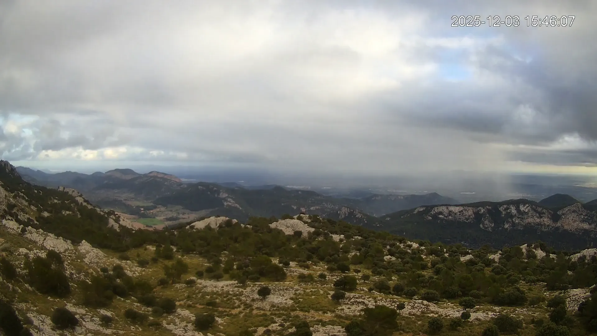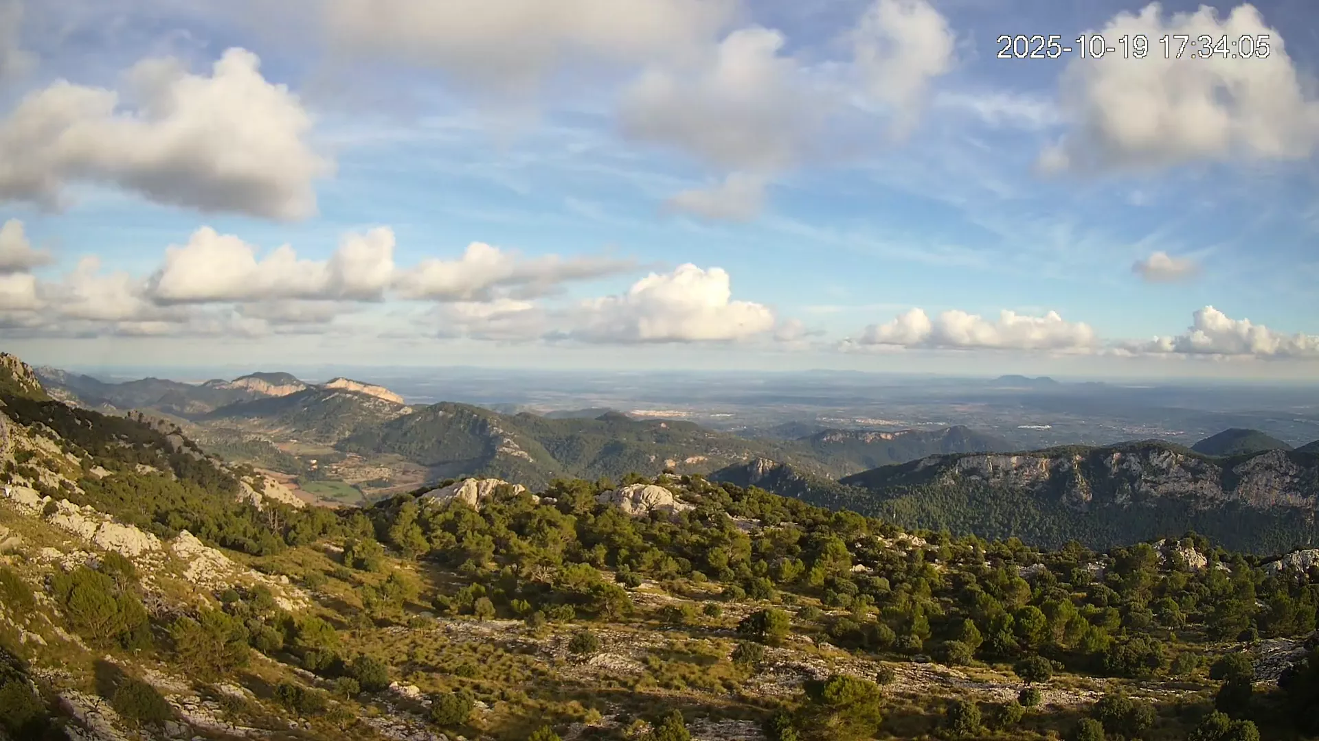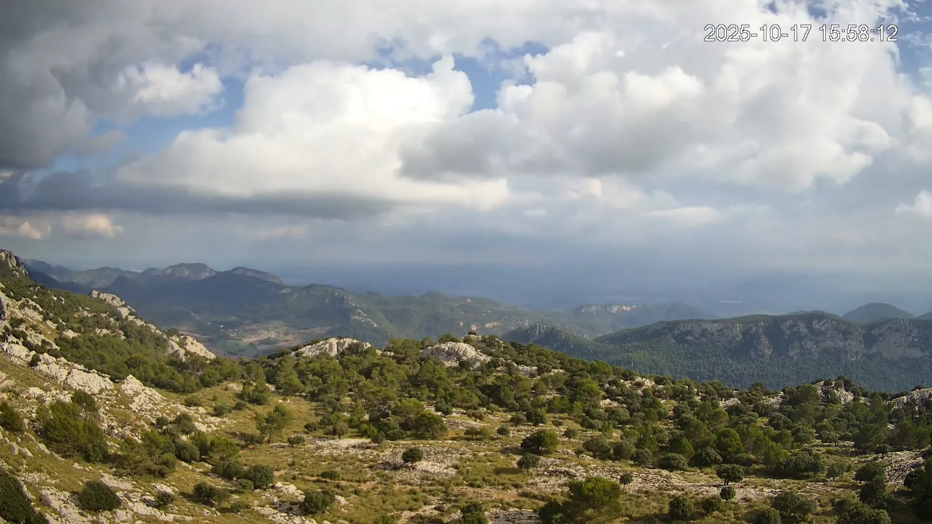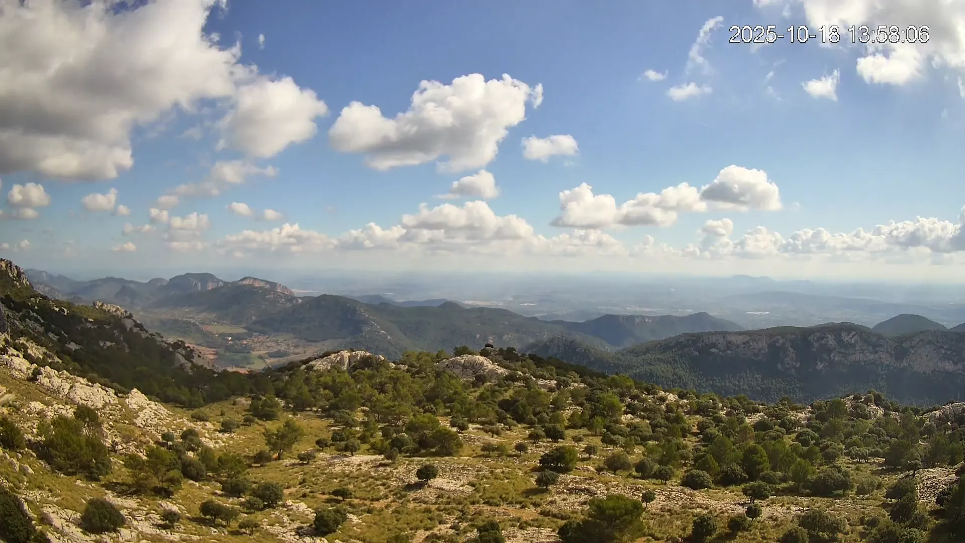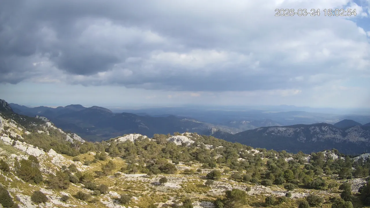 Desde una ubicación privilegiada en Alfabia, esta cámara apunta hacia el tranquilo valle que conduce al pueblo de Orient, rodeado de bosques y caminos serpenteantes. En una de las crestas se eleva el Castell d’Alaró, asomando entre peñascos como un vigía del pasado. El encuadre transmite una sensación de aislamiento y calma, en un entorno donde la montaña guarda siglos de historia y el paisaje invita a la contemplación.