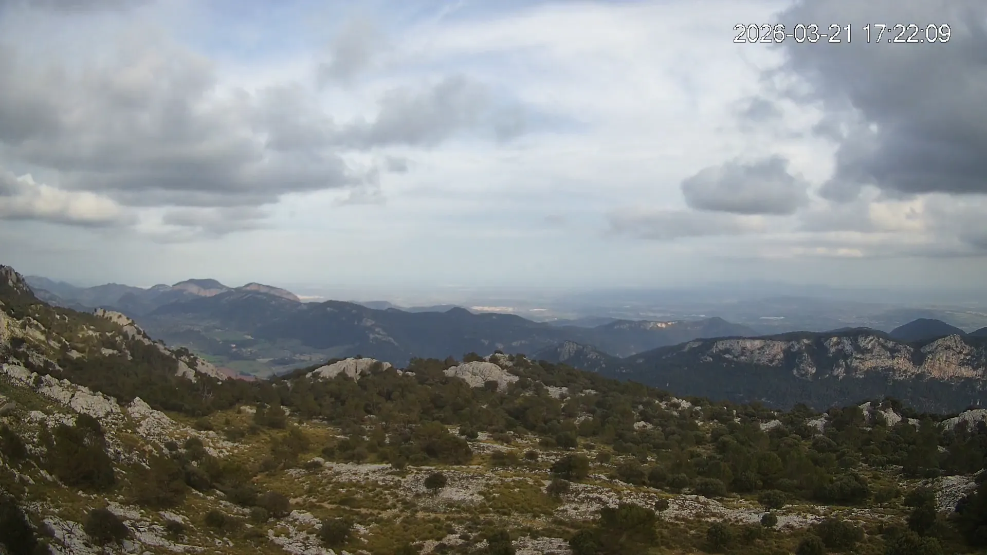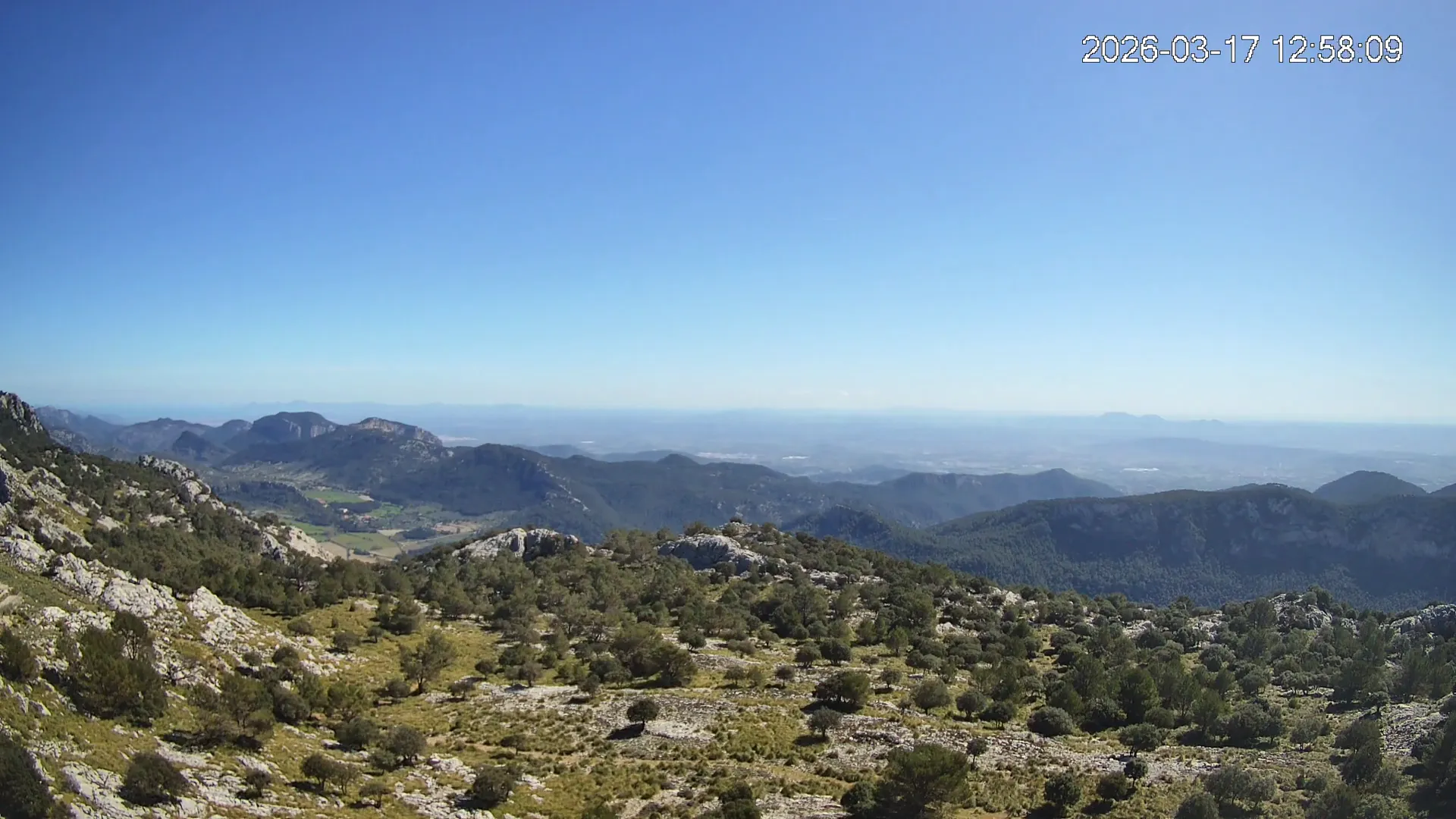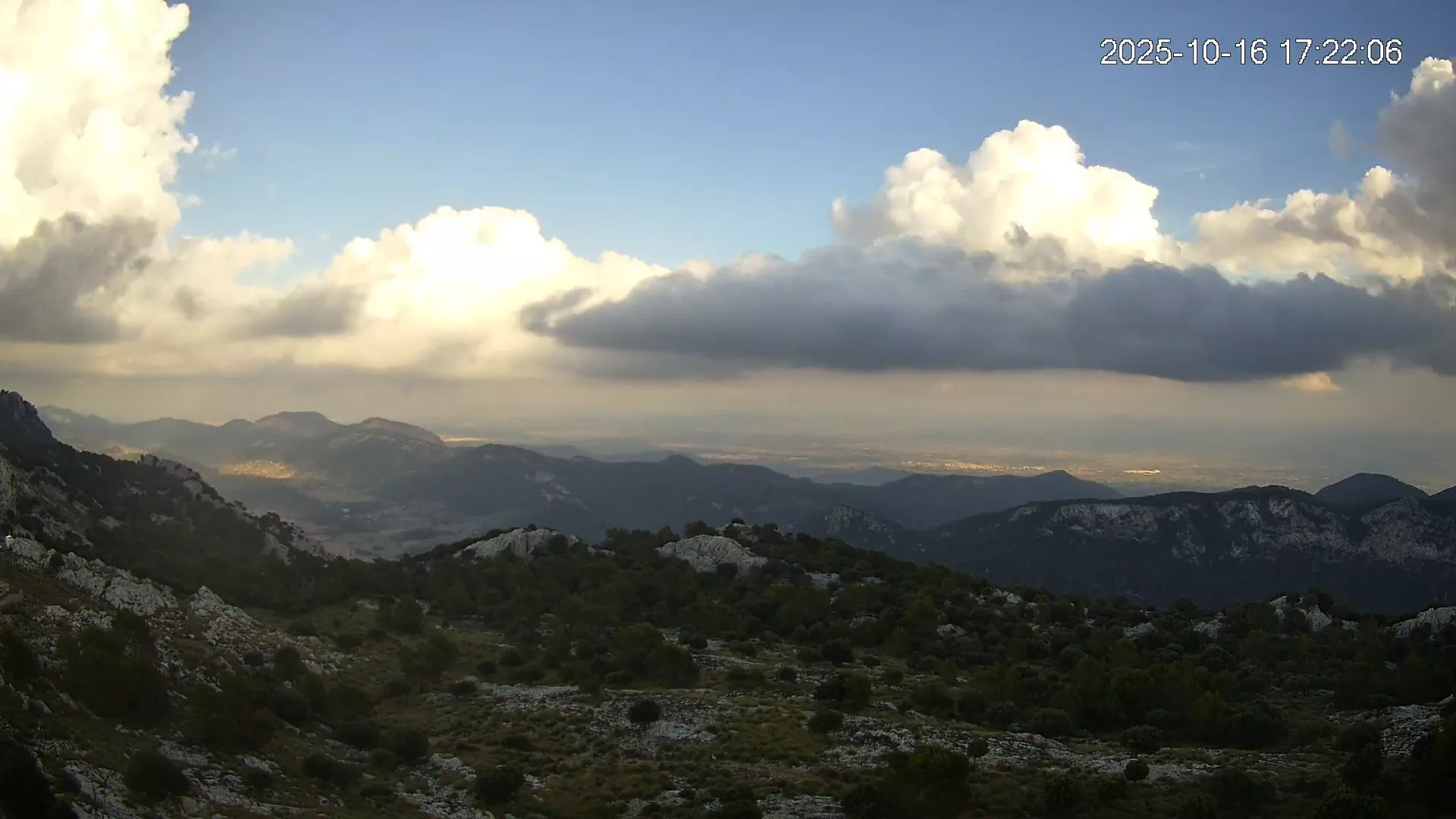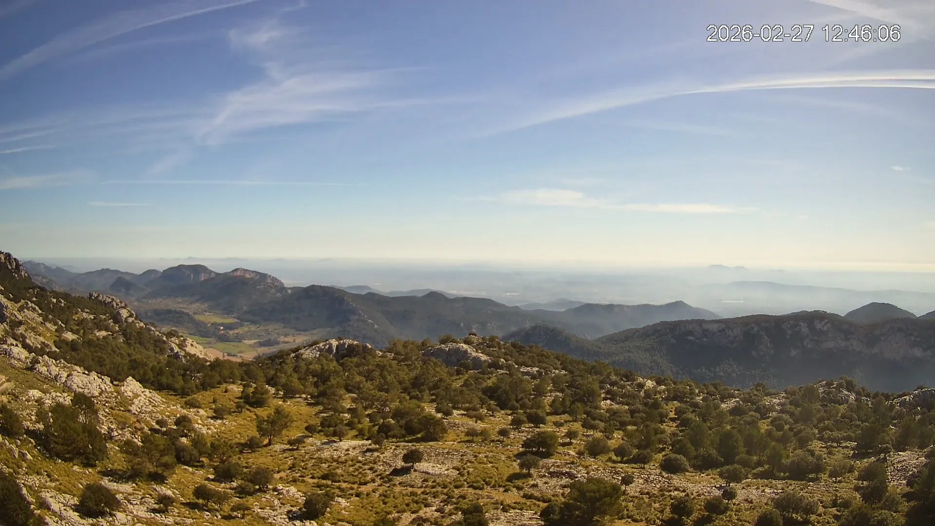 Desde una ubicación privilegiada en Alfabia, esta cámara apunta hacia el tranquilo valle que conduce al pueblo de Orient, rodeado de bosques y caminos serpenteantes. En una de las crestas se eleva el Castell d’Alaró, asomando entre peñascos como un vigía del pasado. El encuadre transmite una sensación de aislamiento y calma, en un entorno donde la montaña guarda siglos de historia y el paisaje invita a la contemplación.