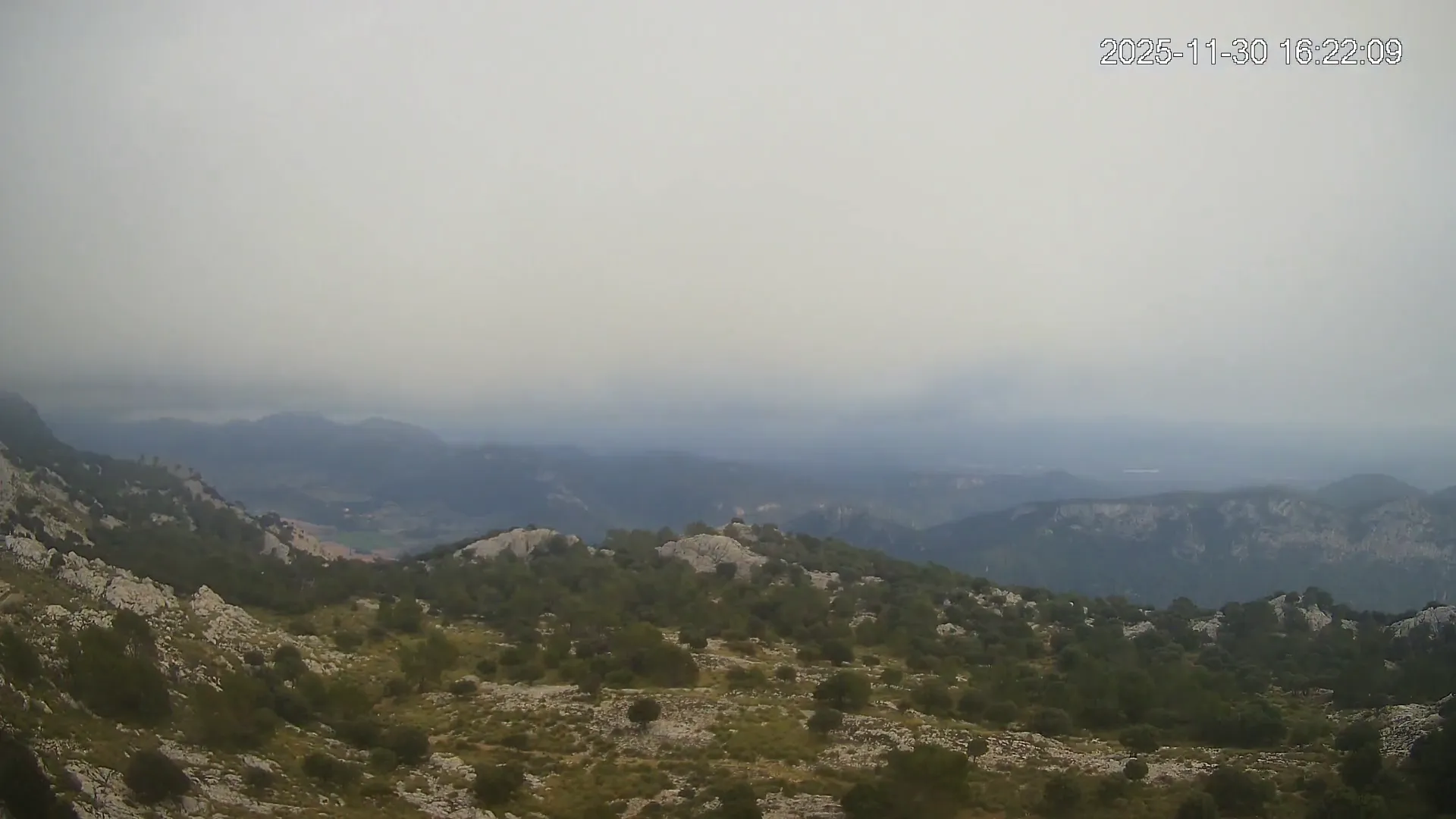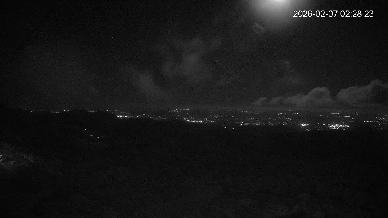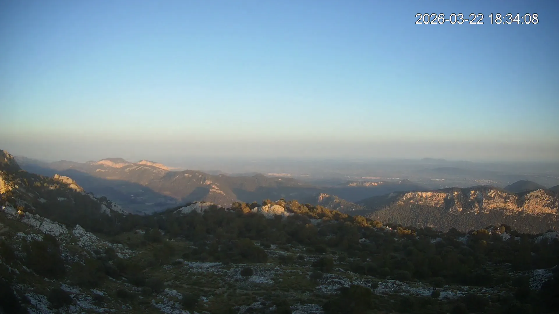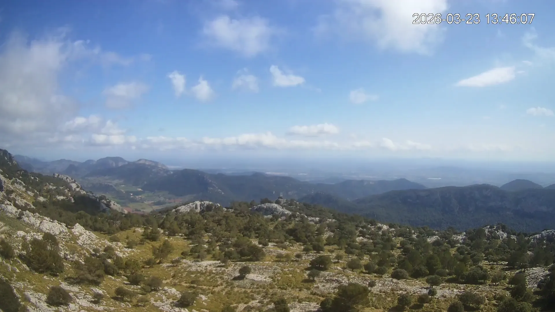 Desde una ubicación privilegiada en Alfabia, esta cámara apunta hacia el tranquilo valle que conduce al pueblo de Orient, rodeado de bosques y caminos serpenteantes. En una de las crestas se eleva el Castell d’Alaró, asomando entre peñascos como un vigía del pasado. El encuadre transmite una sensación de aislamiento y calma, en un entorno donde la montaña guarda siglos de historia y el paisaje invita a la contemplación.