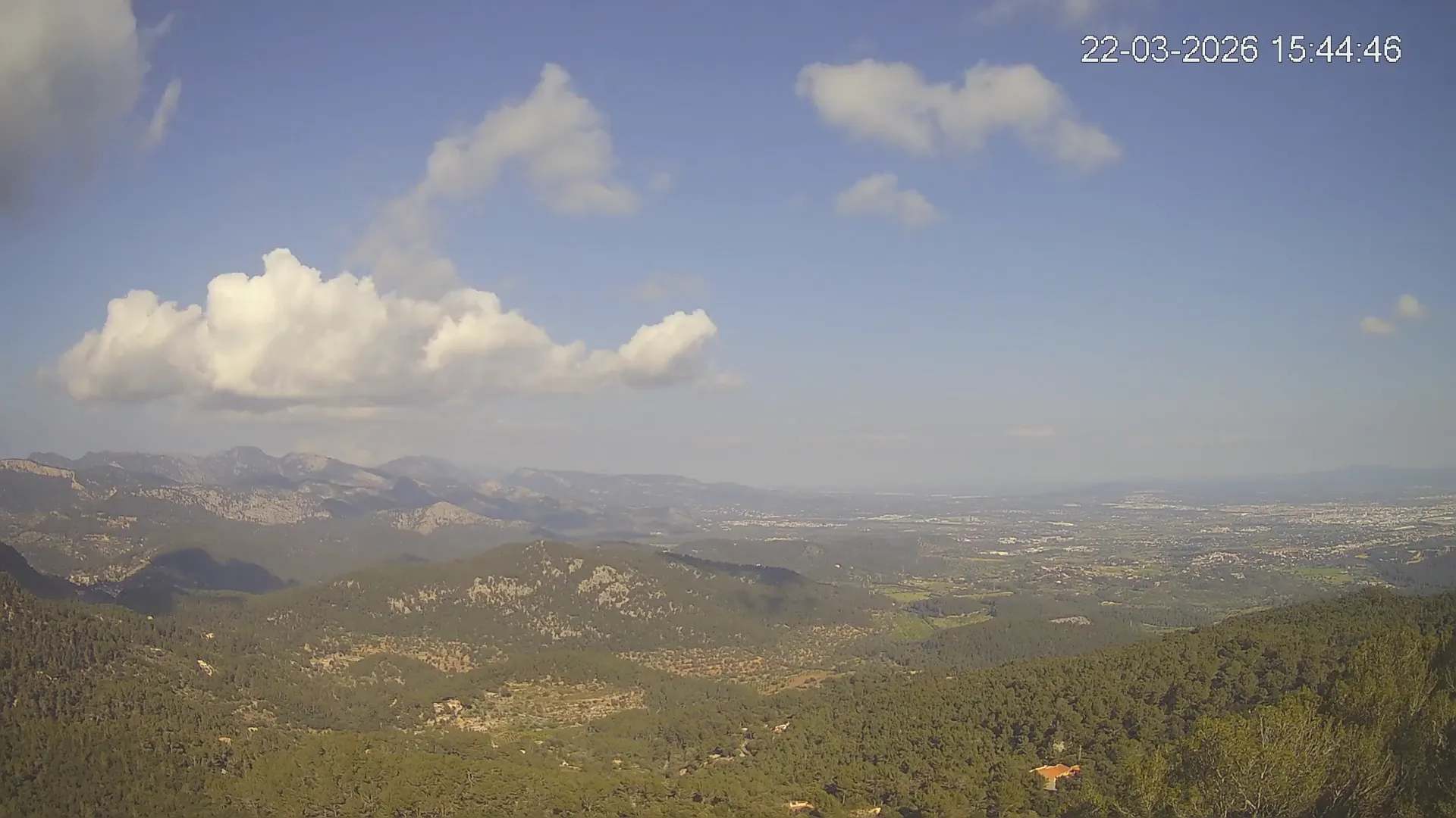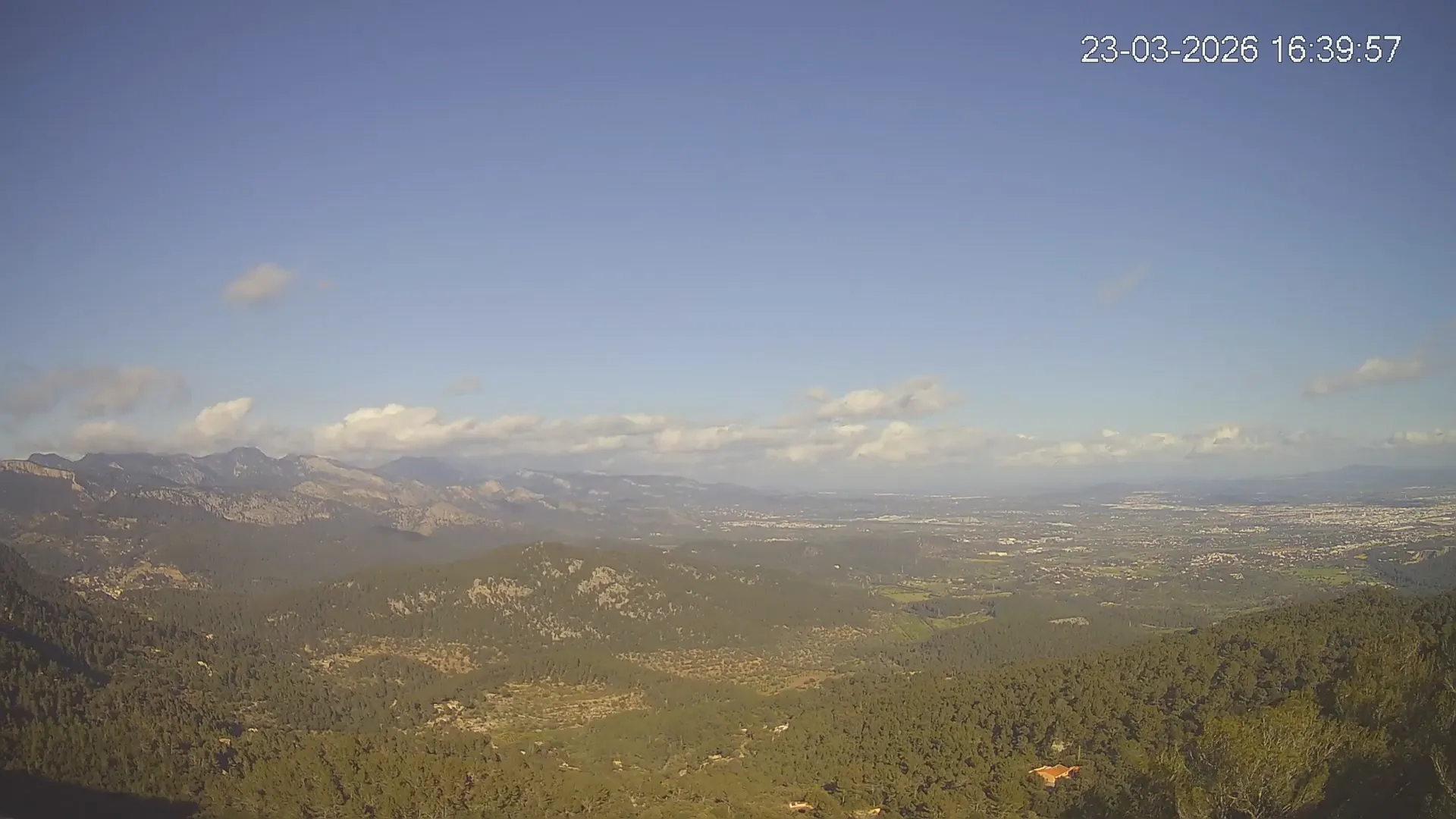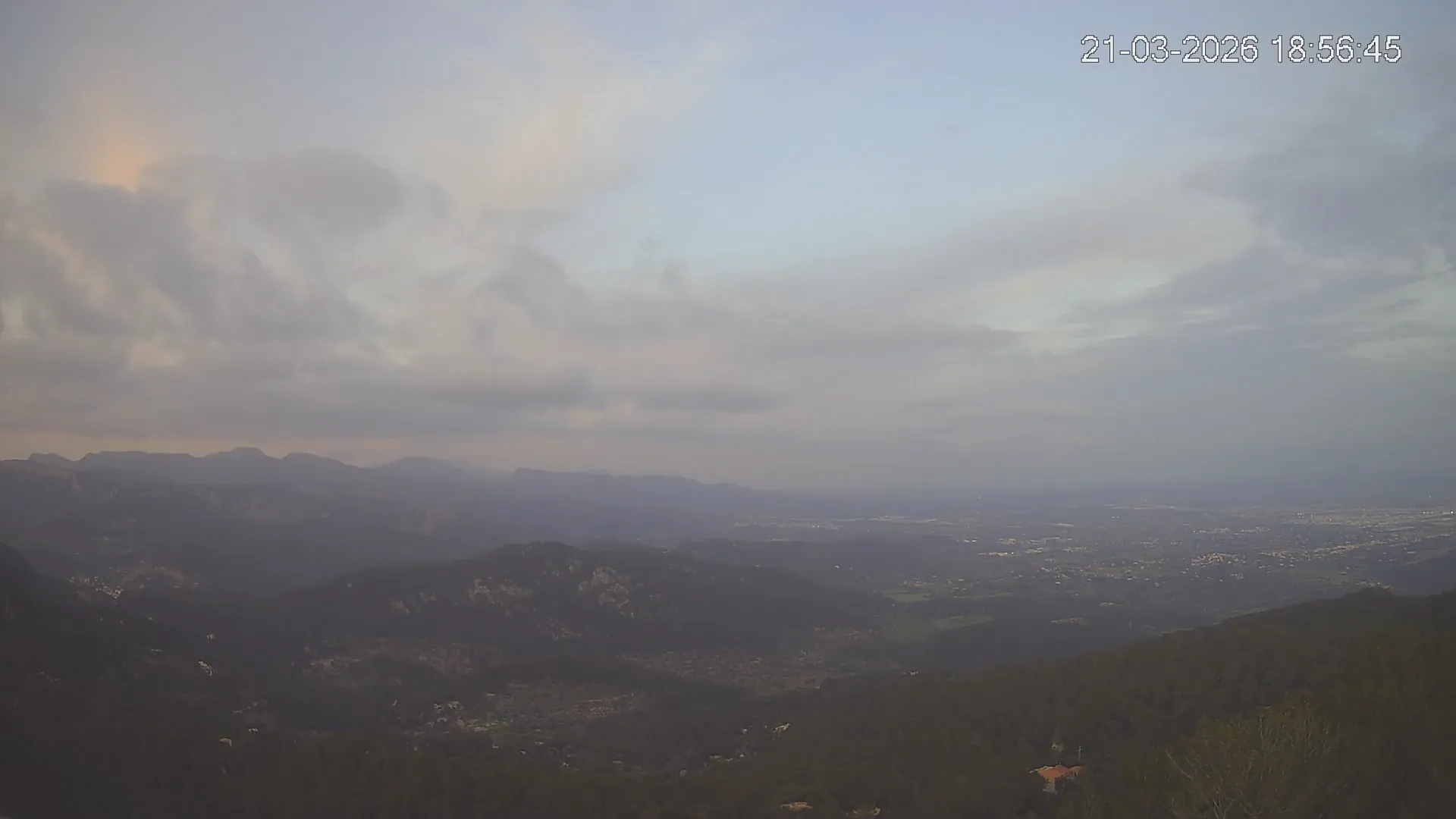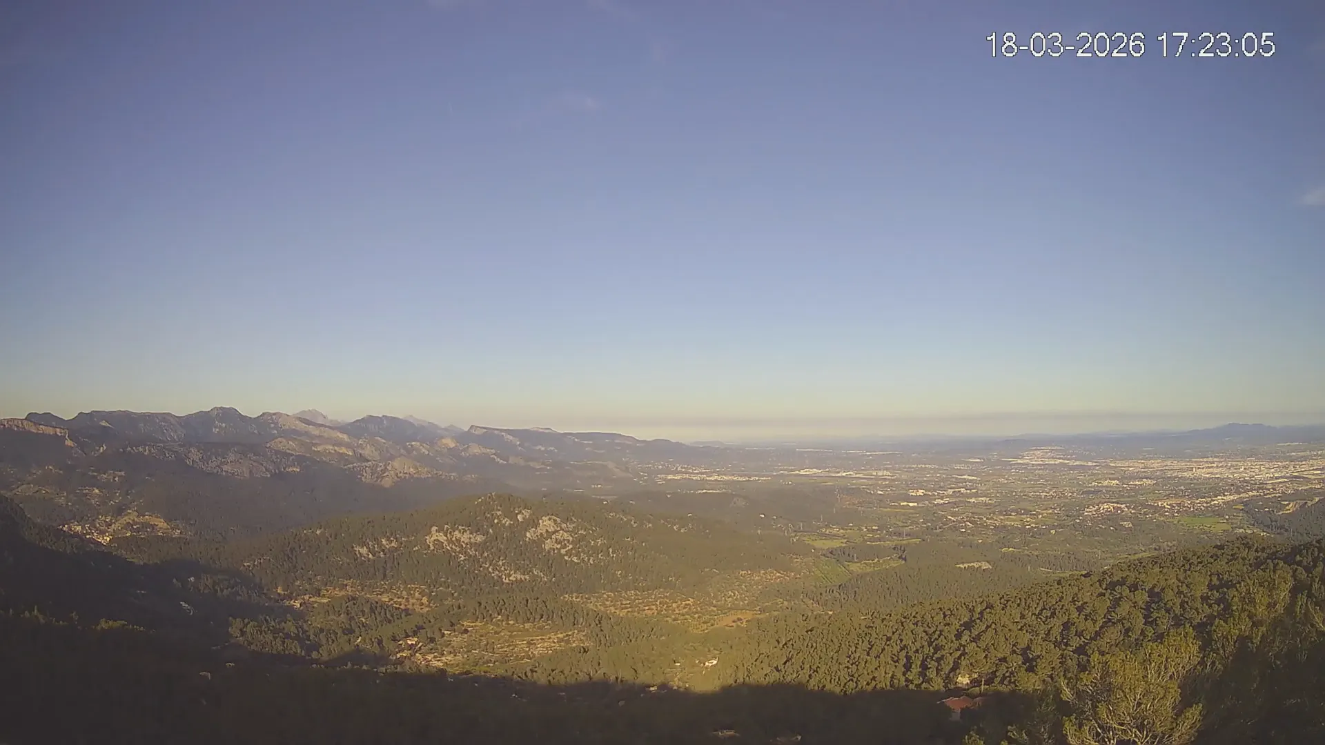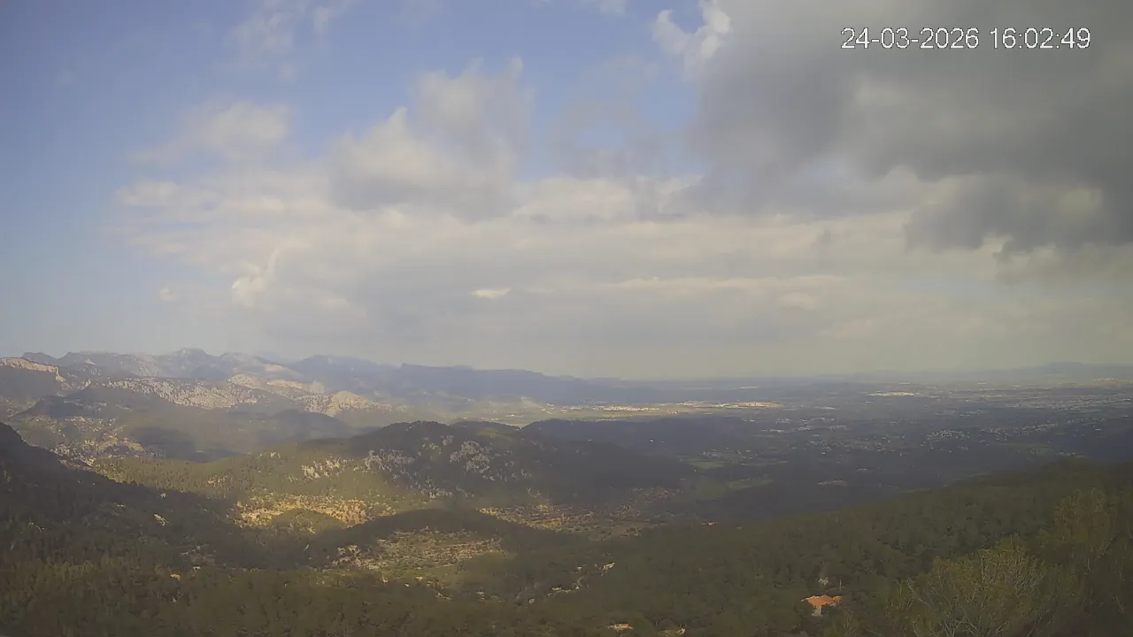 ¿Buscas una panorámica amplia del paisaje mallorquín? Esta cámara situada en el Mirador de Sobremunt ofrece una vista en tiempo real desde las alturas, capturando una mezcla de naturaleza y paisaje urbano. Desde aquí, puedes observar las colinas cubiertas de vegetación mediterránea en primer plano, mientras que al fondo se asoma la ciudad de Palma y, en días despejados, el mar en el horizonte. ¿Te interesa ver cómo ha cambiado el paisaje esta semana? Accede a los timelapses de los últimos 7 días y observa la evolución del clima, la luz recorriendo el paisaje y los colores del atardecer sobre la ciudad y el mar. Utilidad perfecta para senderistas, fotógrafos o quienes disfrutan de vistas panorámicas de Mallorca.