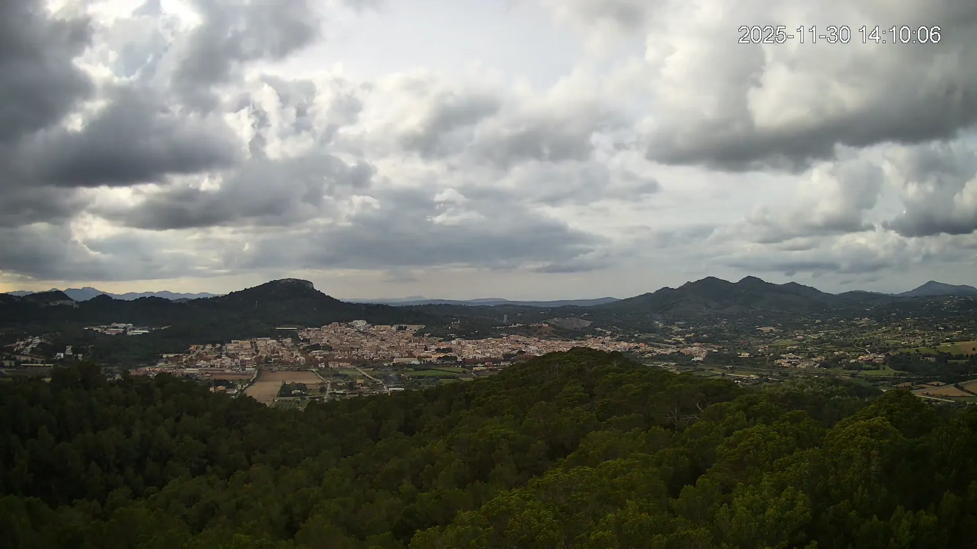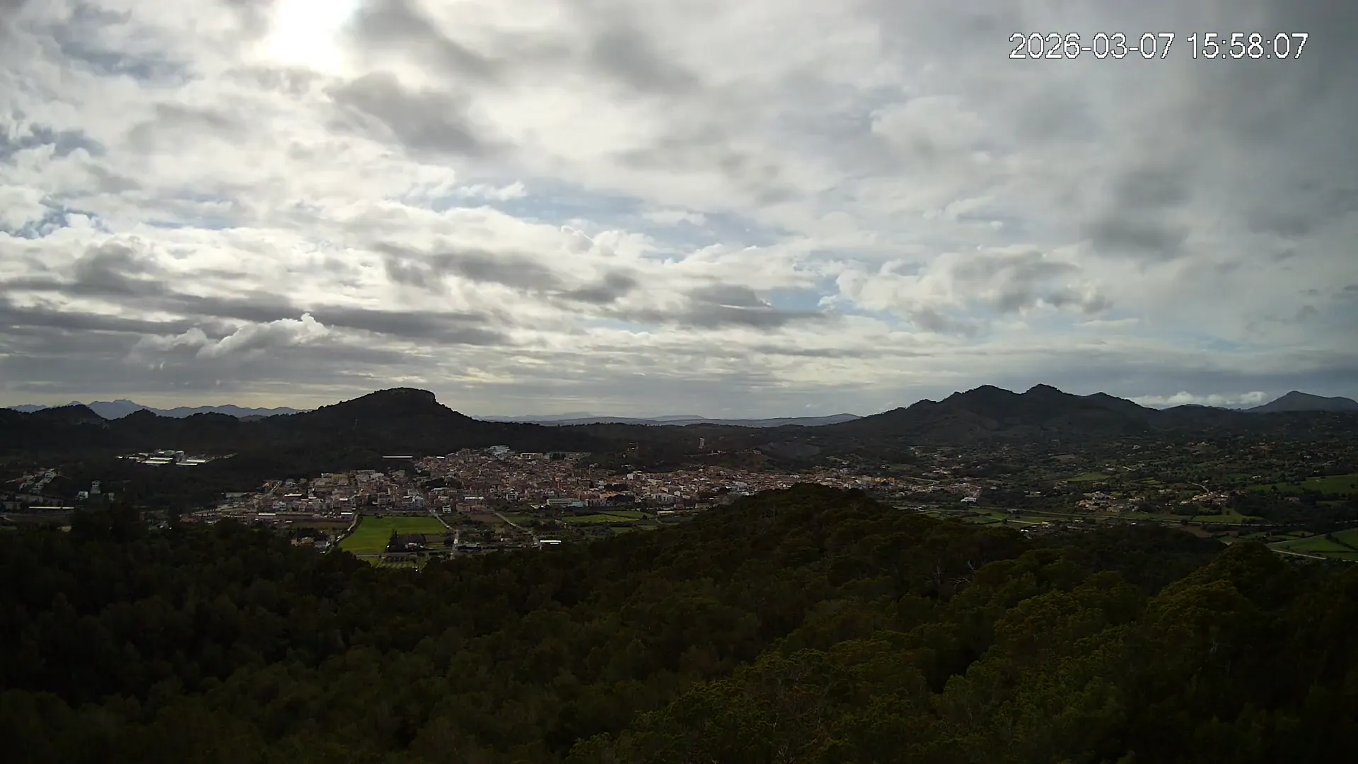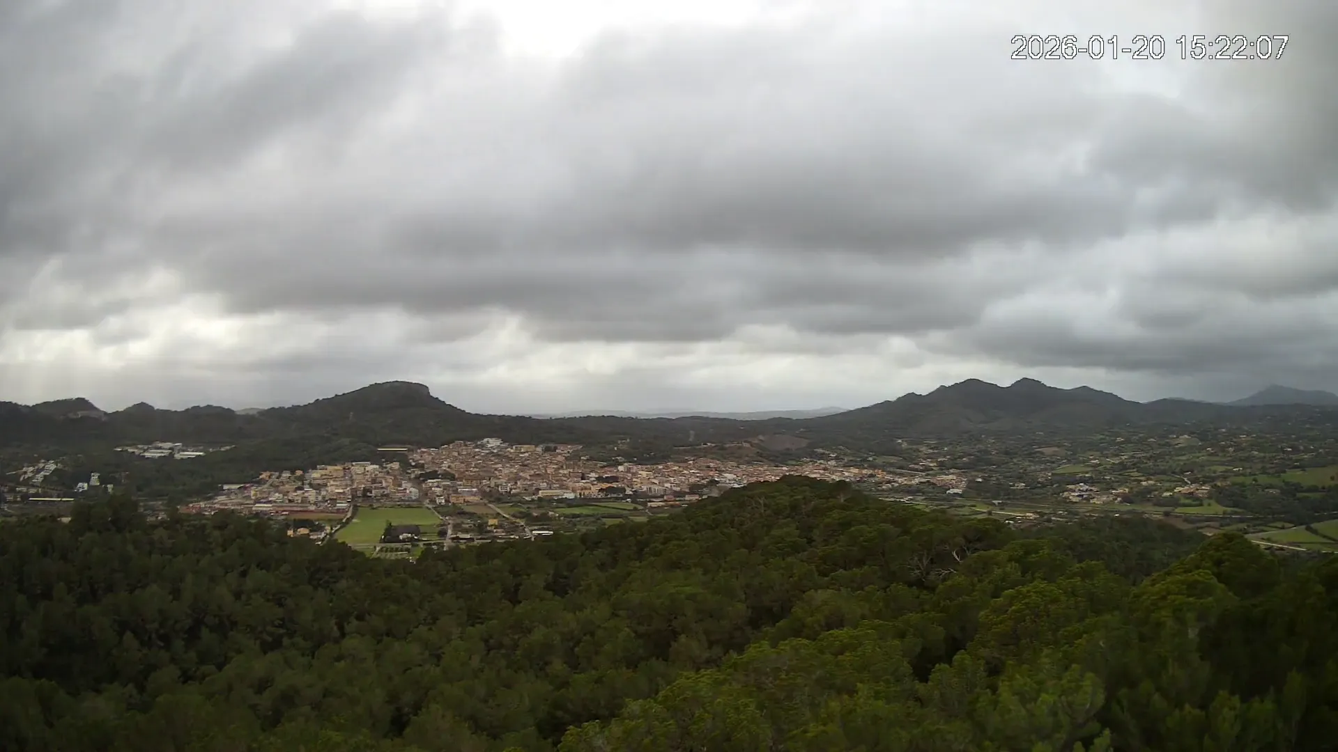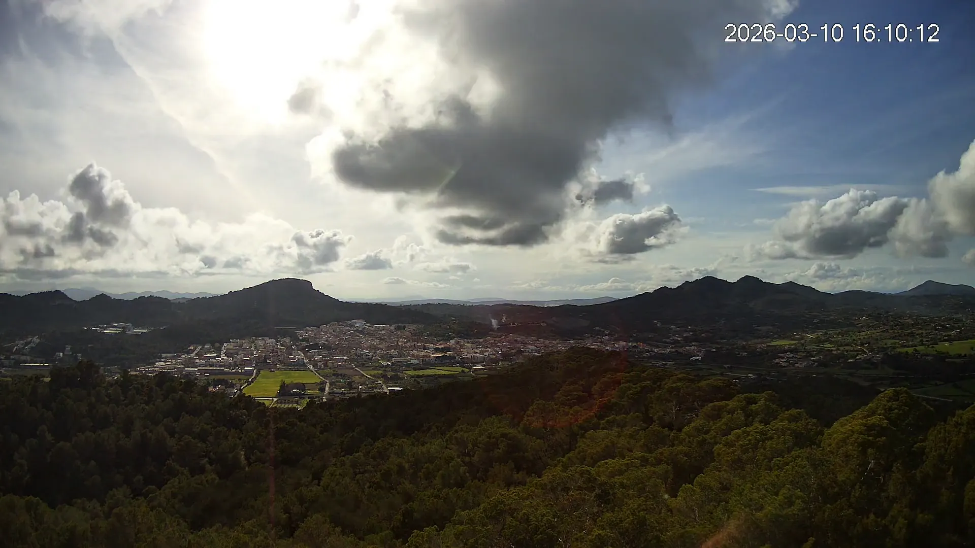 Desde el Puig de Son Corb, esta cámara ofrece una vista privilegiada del pueblo de Son Servera, con sus tejados y trazado urbano integrados en el paisaje del Llevant mallorquín. A la derecha destaca la muntanya de na Penyal, con su silueta inconfundible, que enmarca la escena y aporta carácter a esta panorámica donde naturaleza y vida local conviven en equilibrio.
