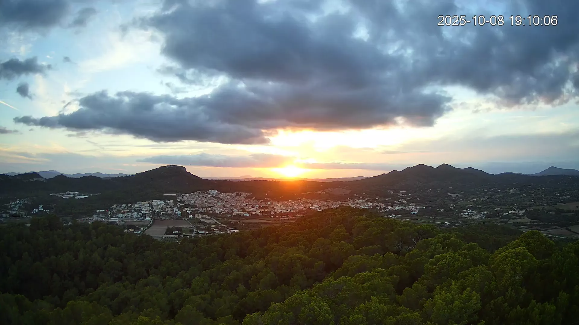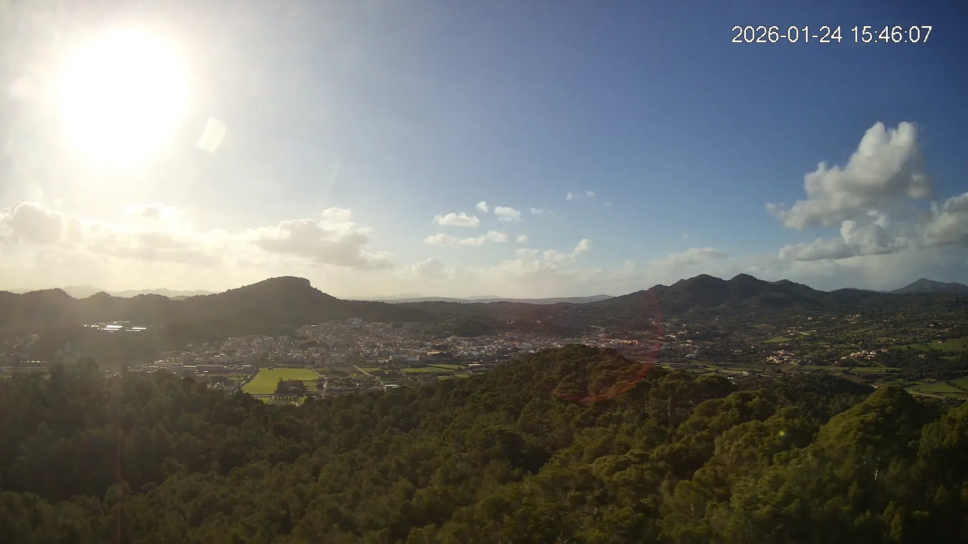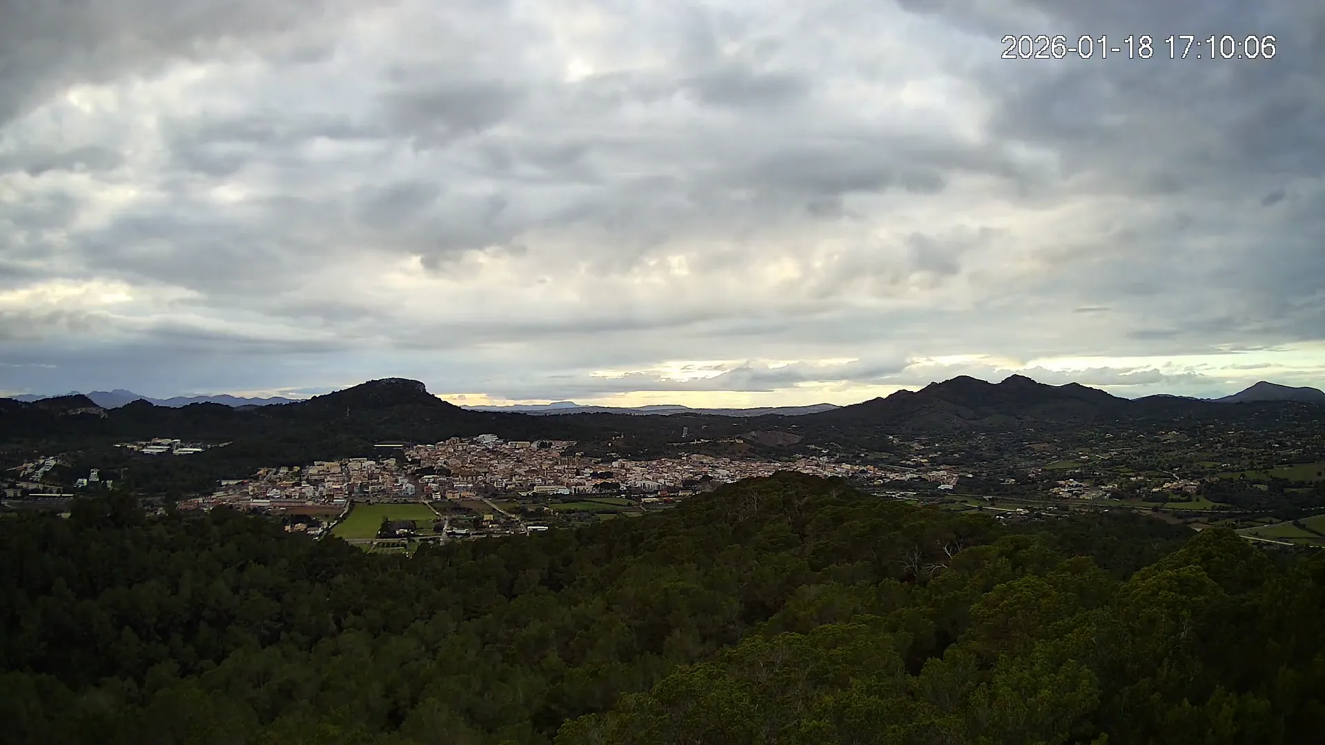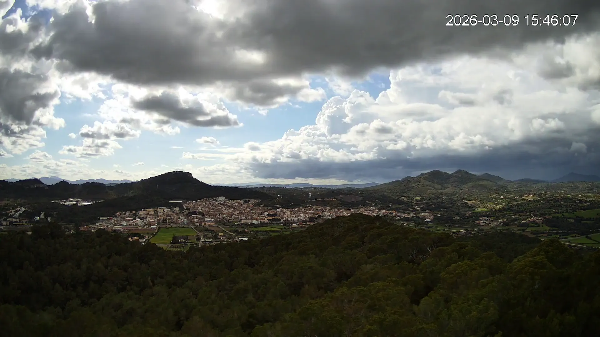 Desde el Puig de Son Corb, esta cámara ofrece una vista privilegiada del pueblo de Son Servera, con sus tejados y trazado urbano integrados en el paisaje del Llevant mallorquín. A la derecha destaca la muntanya de na Penyal, con su silueta inconfundible, que enmarca la escena y aporta carácter a esta panorámica donde naturaleza y vida local conviven en equilibrio.